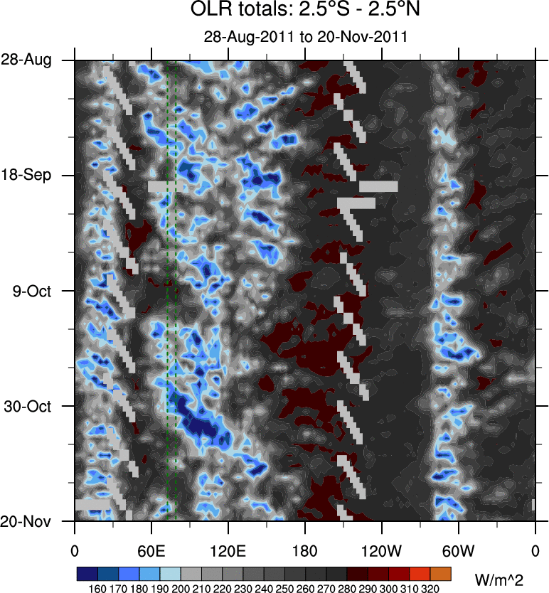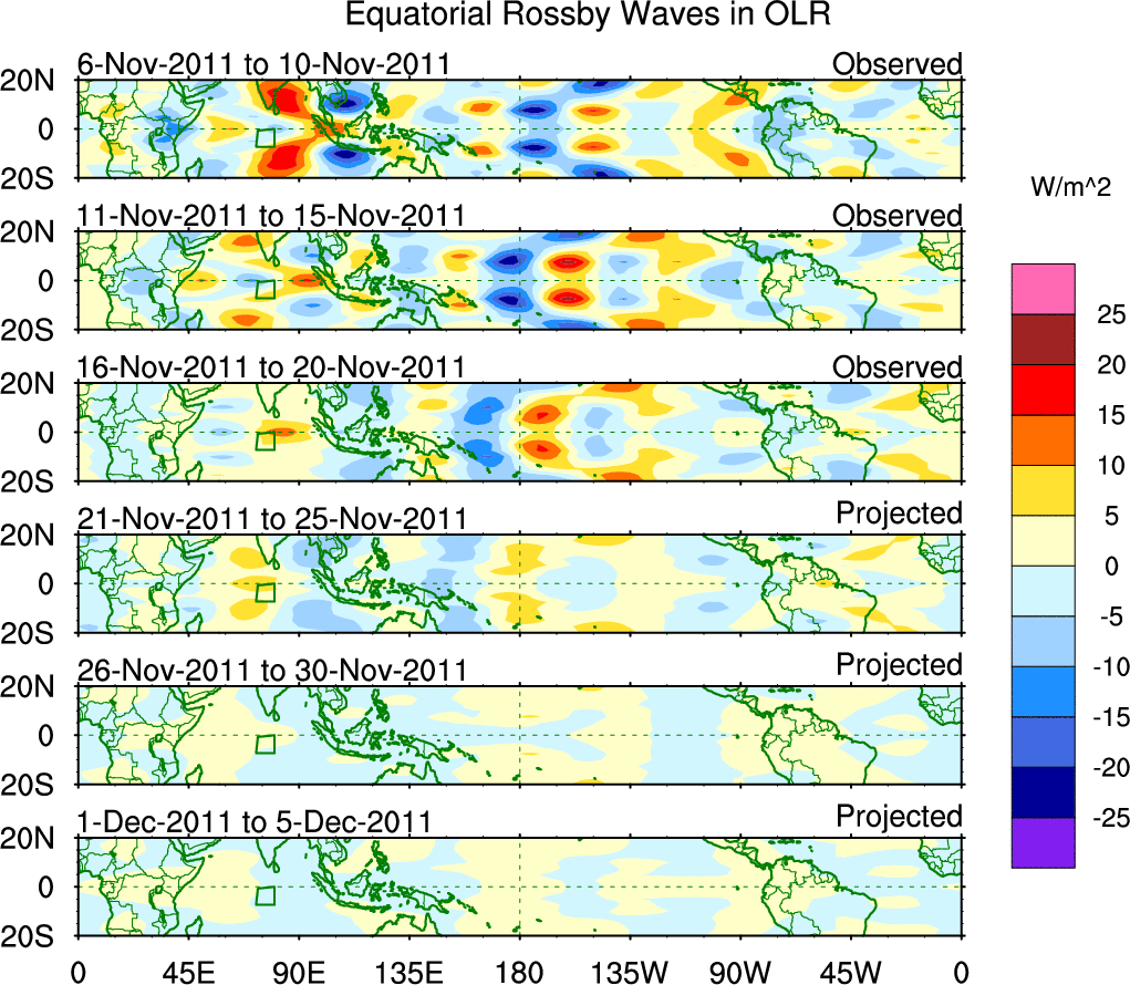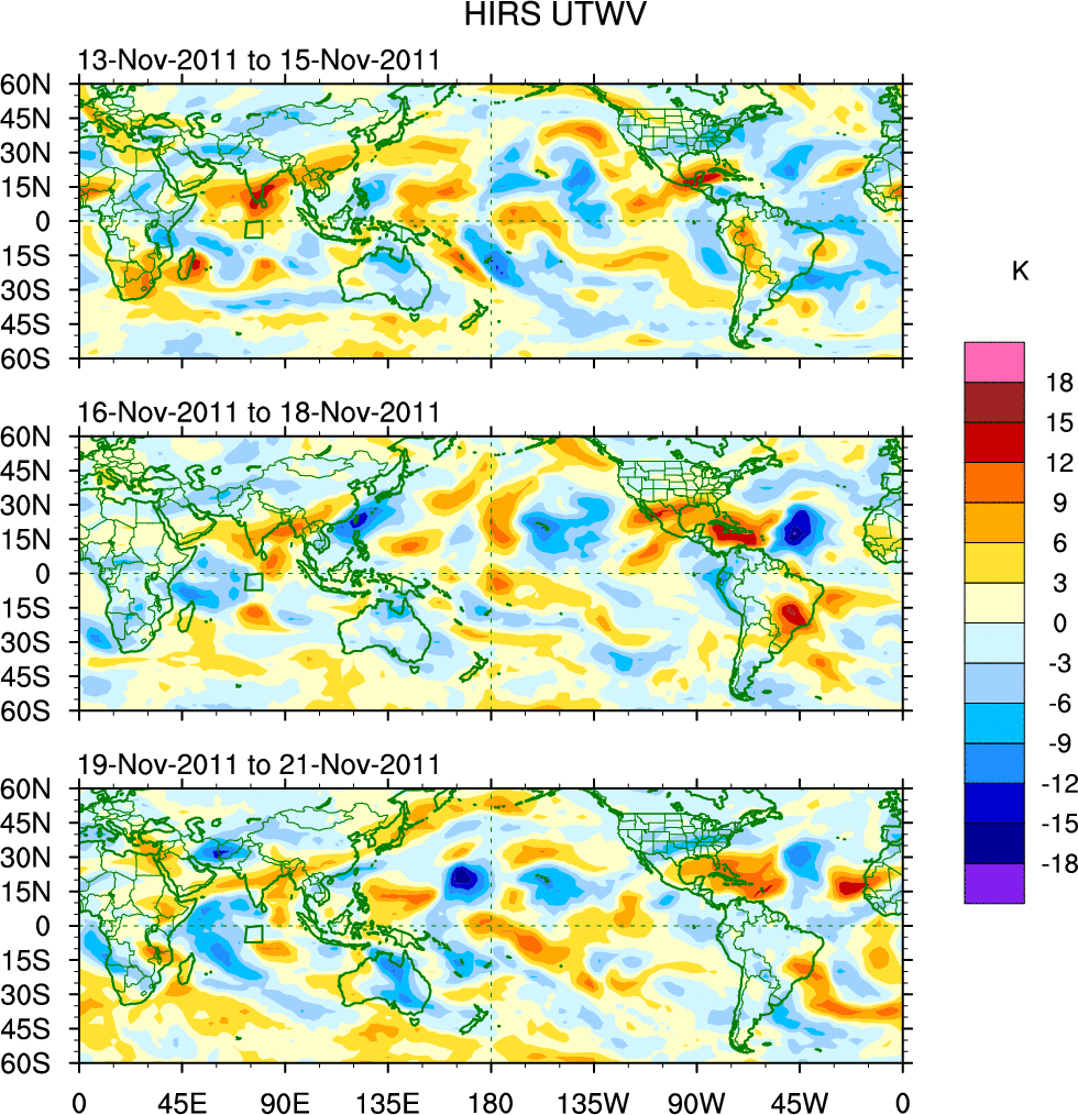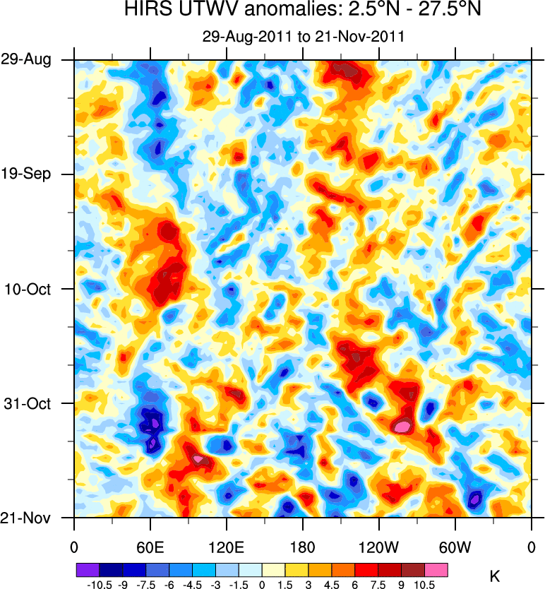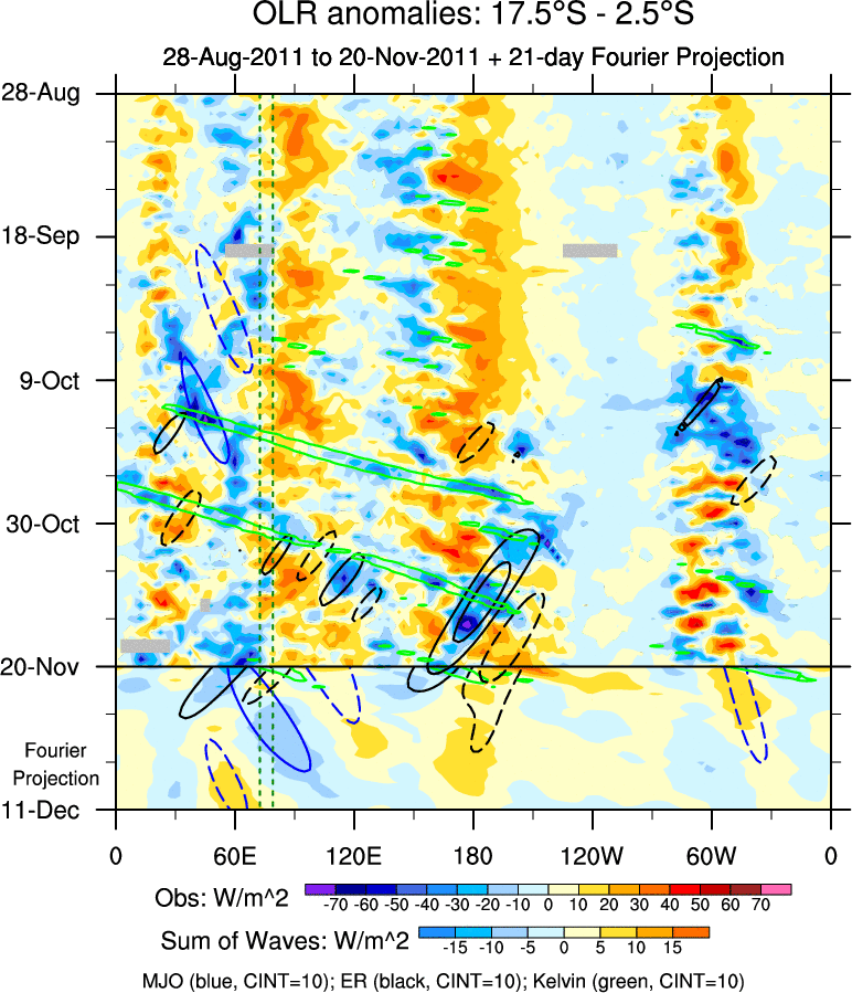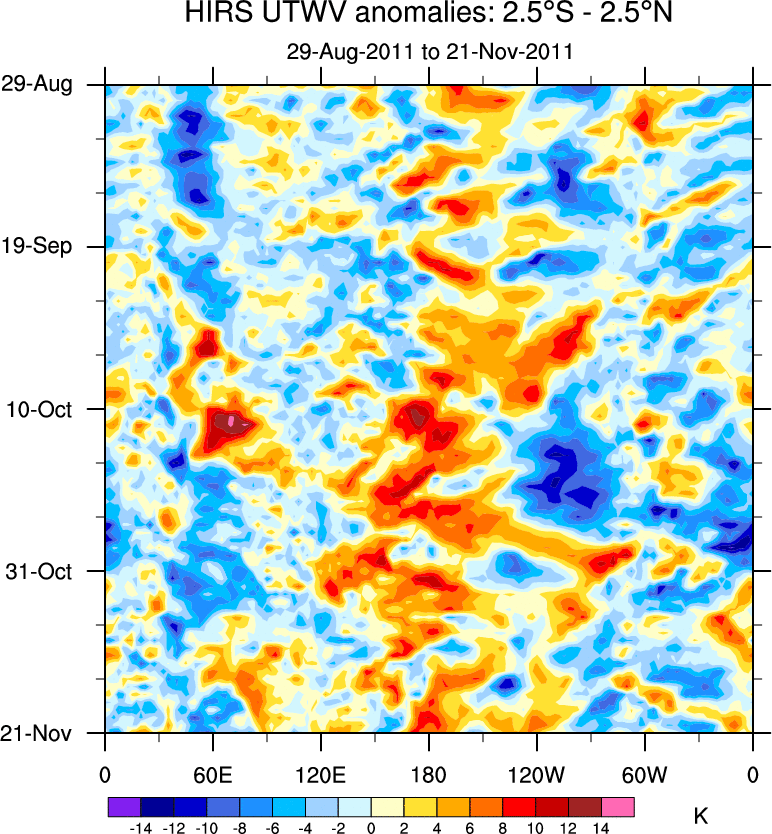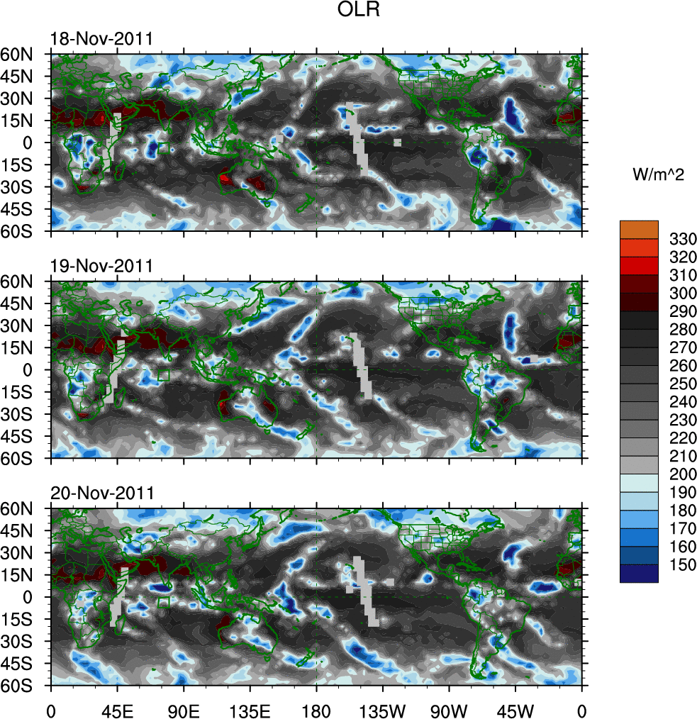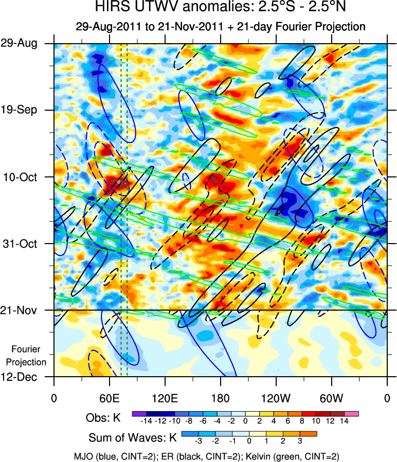 To identify tropical waves in near real-time, the OLR and UTWV data are filtered following Wheeler & Weickmann (2001 MWR). The daily anomalies are calculated using the first 3 harmonics of the seasonal cycle for 1979–2009. Missing values are then filled using linear interpolation in space and time. The most recent 365 days of anomalies are padded with 659 days of zeroes, and the result is filtered for each wave type.