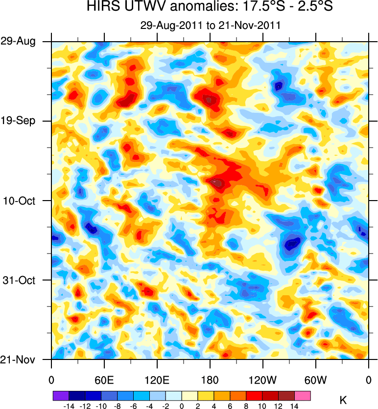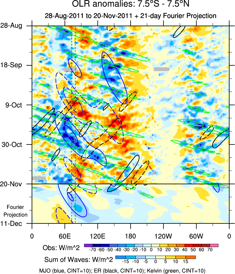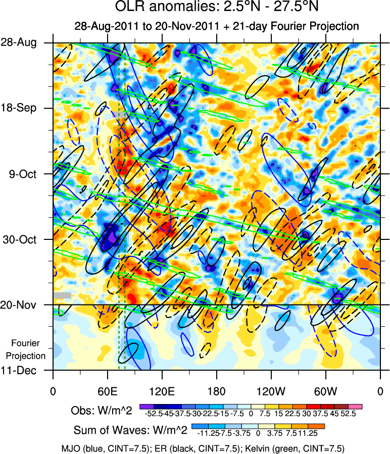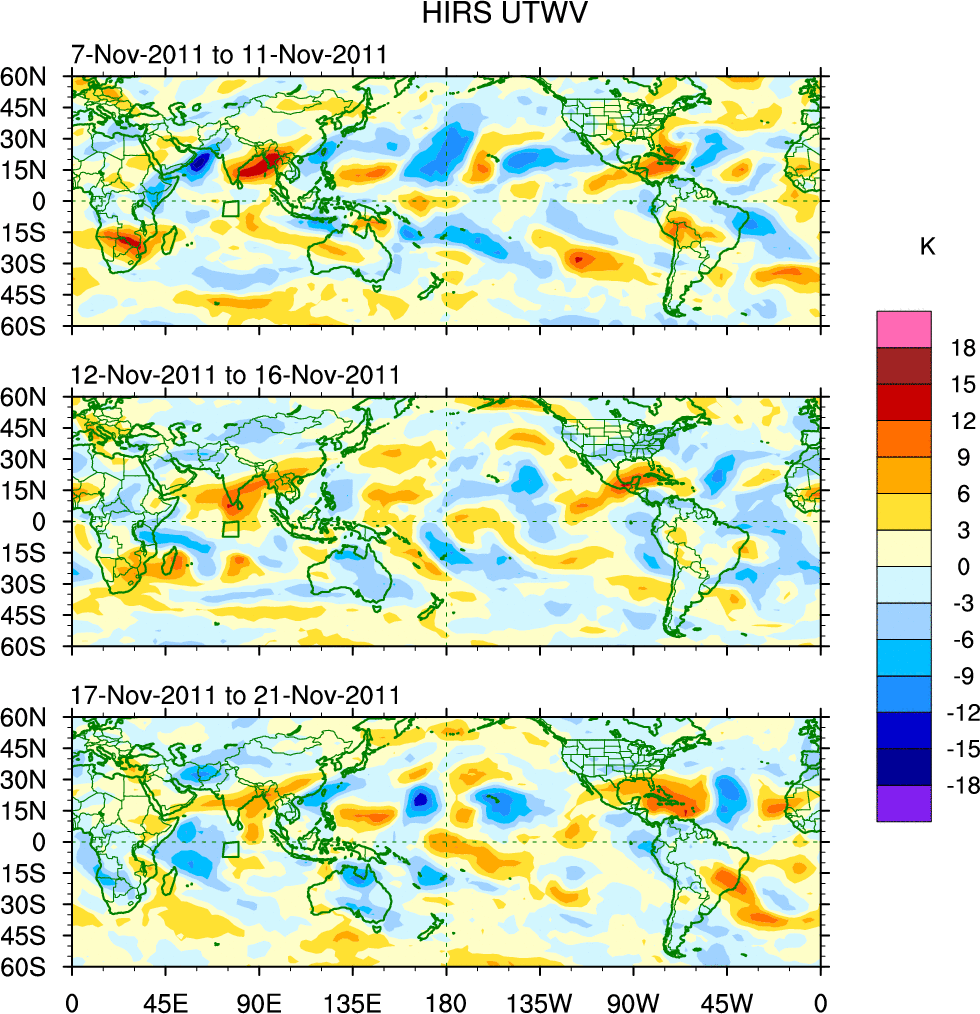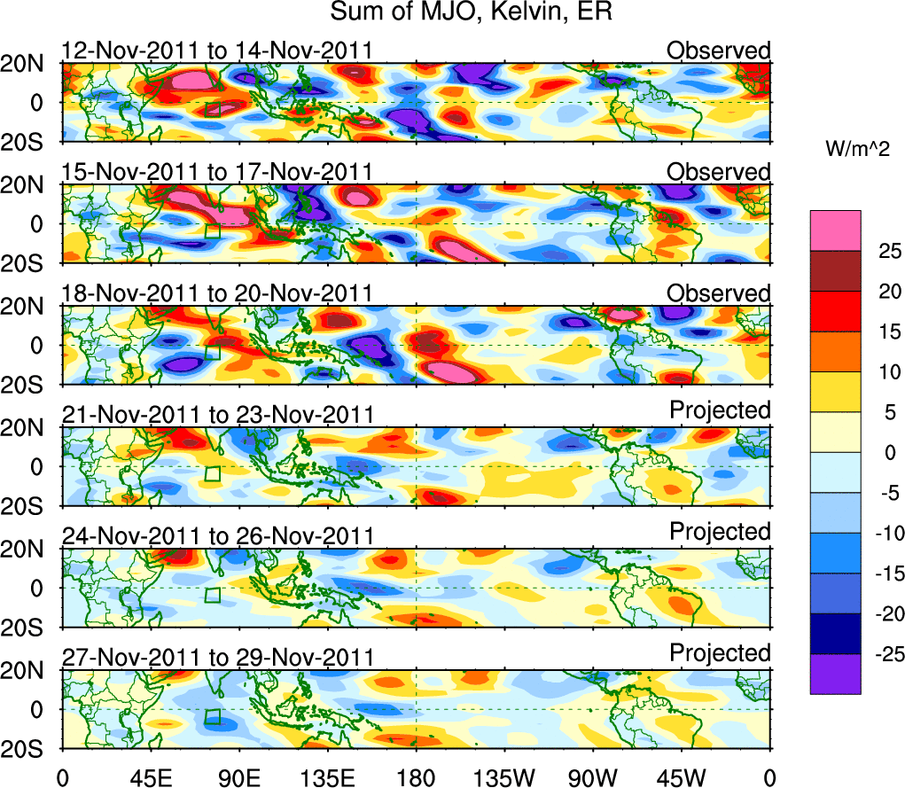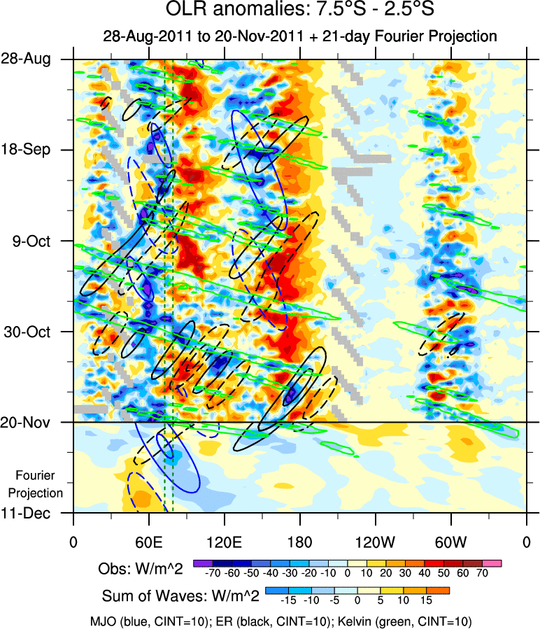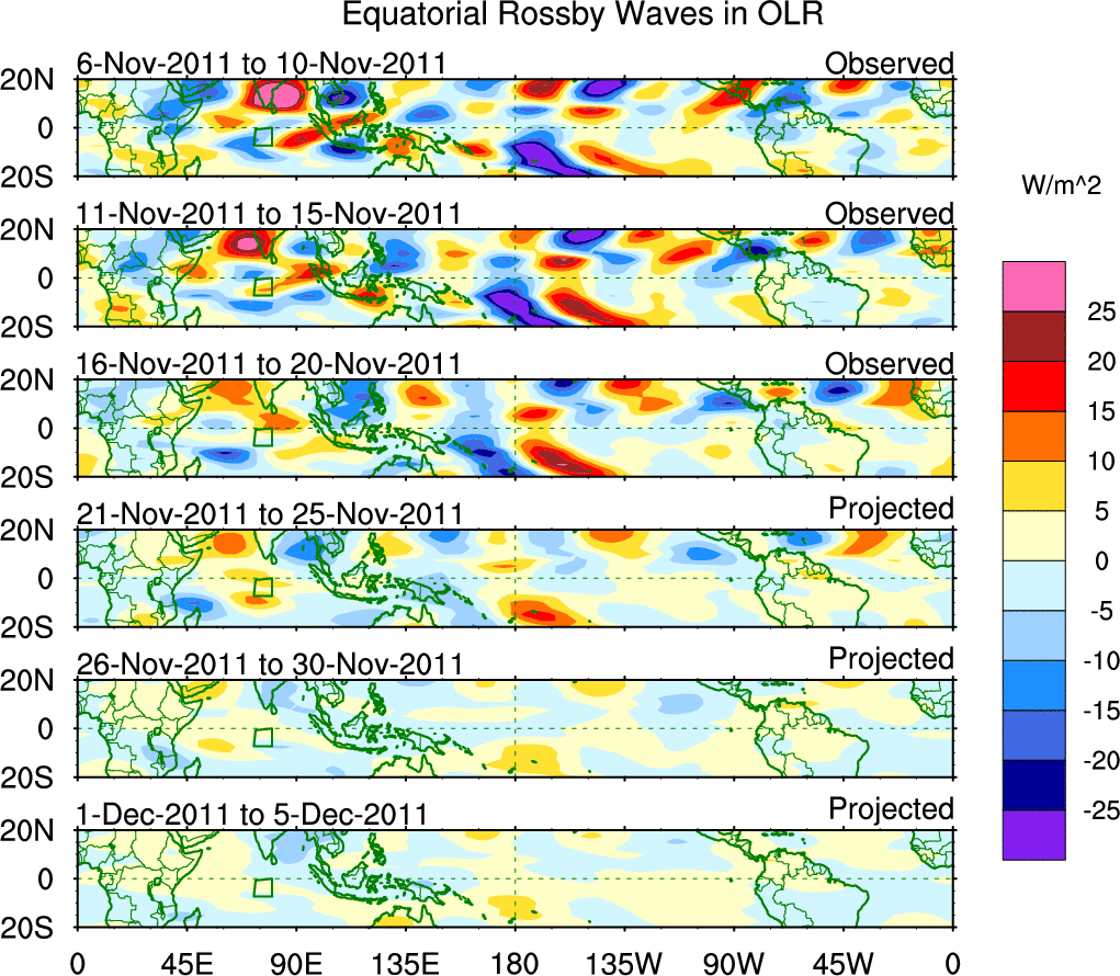 To identify tropical waves in near real-time, the OLR and UTWV data are filtered following Wheeler & Weickmann (2001 MWR). The daily anomalies are calculated using the first 3 harmonics of the seasonal cycle for 1979–2009. Missing values are then filled using linear interpolation in space and time. The most recent 365 days of anomalies are padded with 659 days of zeroes, and the result is filtered for each wave type.