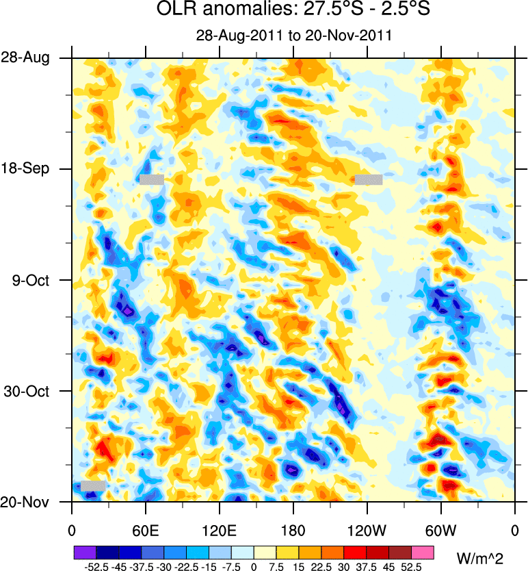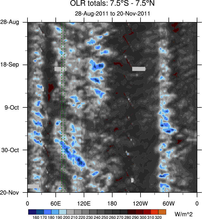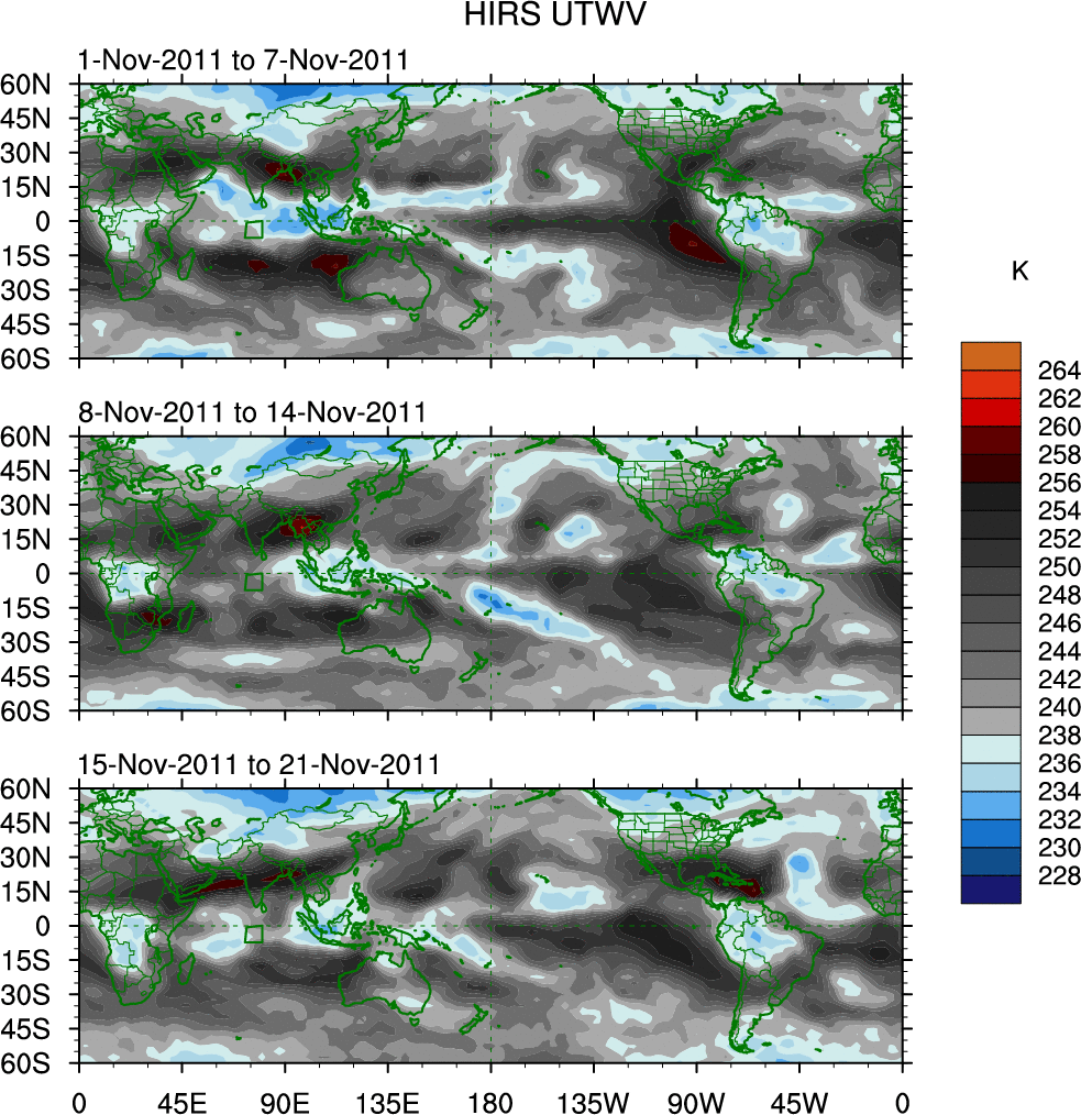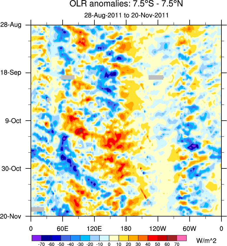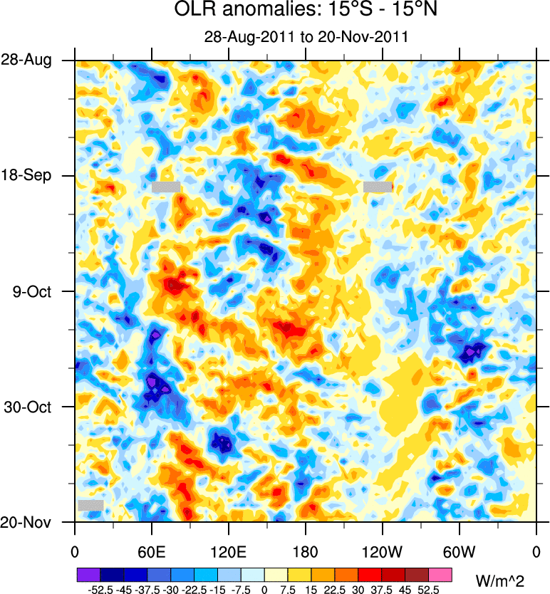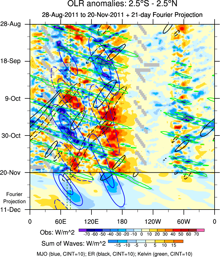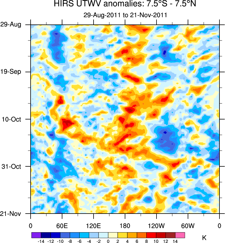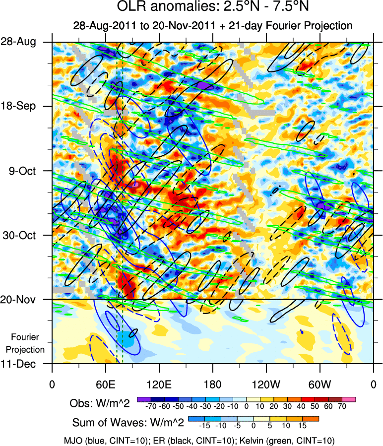 To identify tropical waves in near real-time, the OLR and UTWV data are filtered following Wheeler & Weickmann (2001 MWR). The daily anomalies are calculated using the first 3 harmonics of the seasonal cycle for 1979–2009. Missing values are then filled using linear interpolation in space and time. The most recent 365 days of anomalies are padded with 659 days of zeroes, and the result is filtered for each wave type.