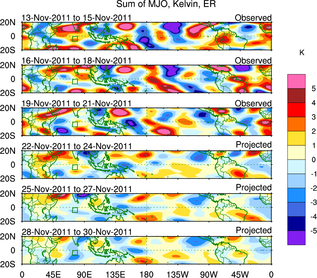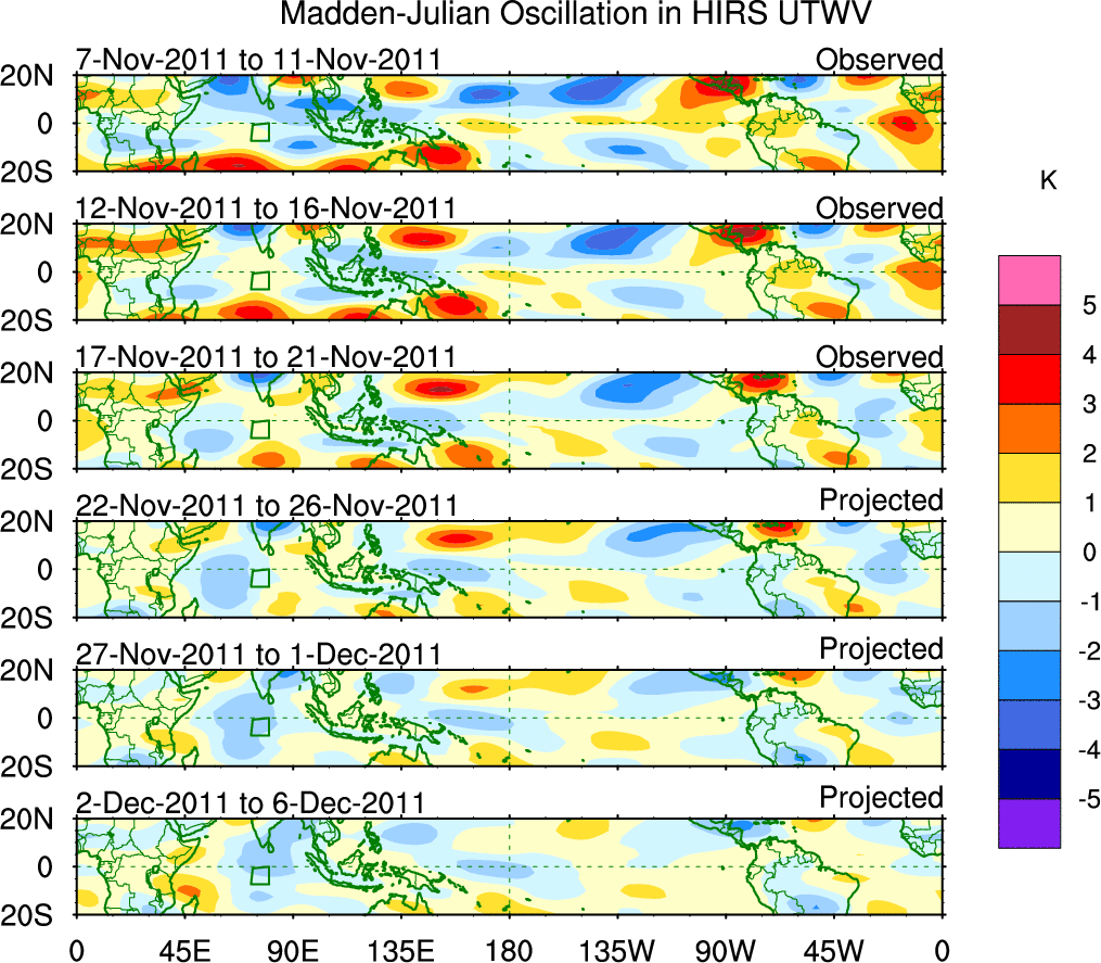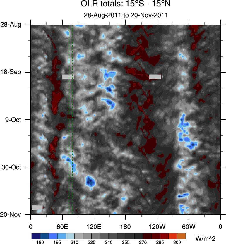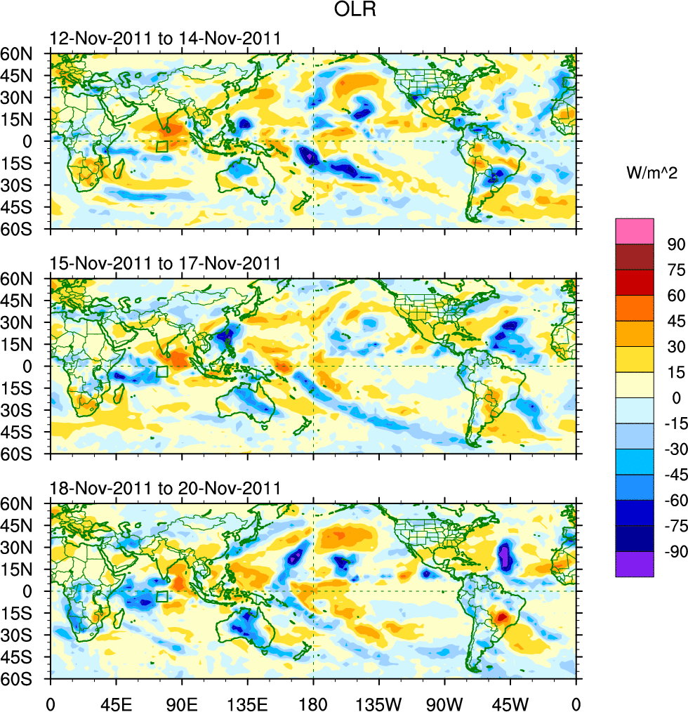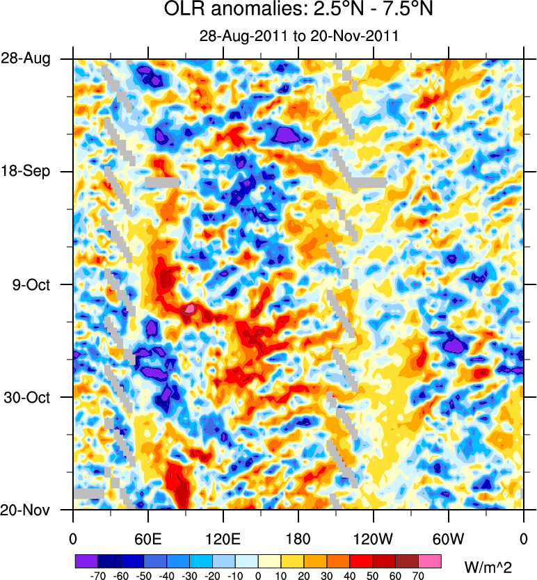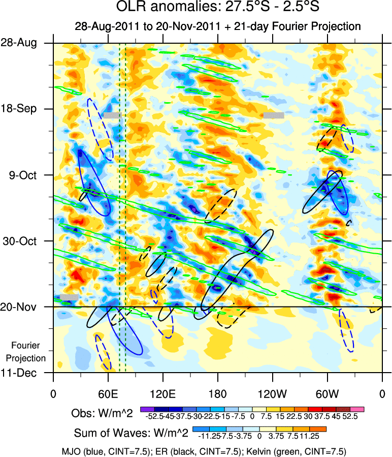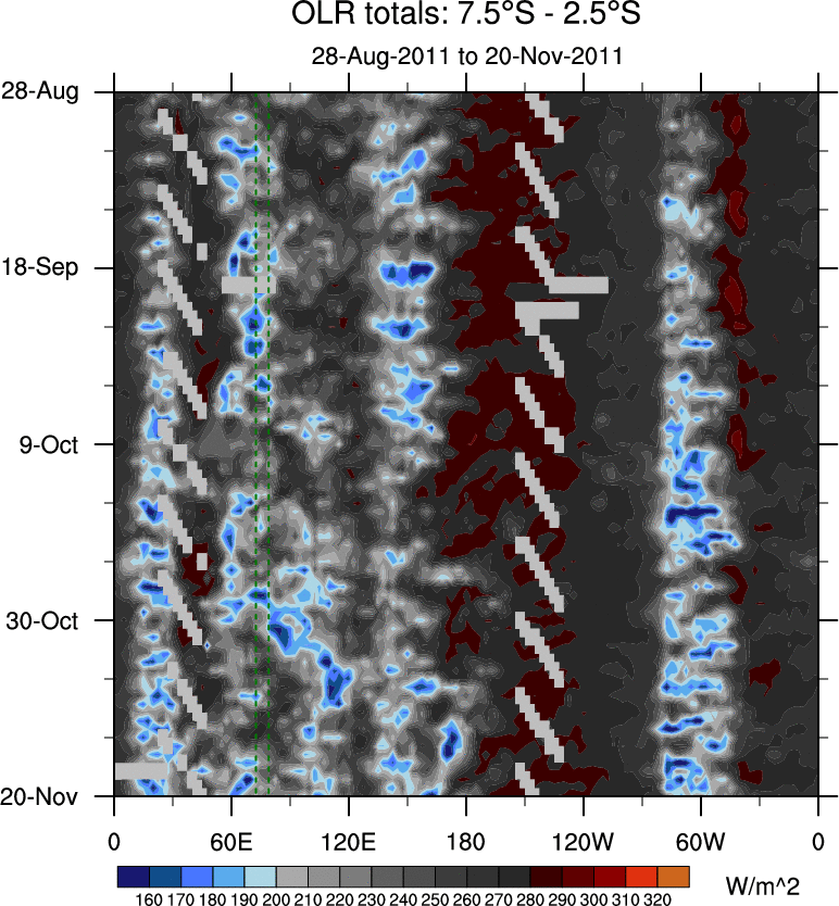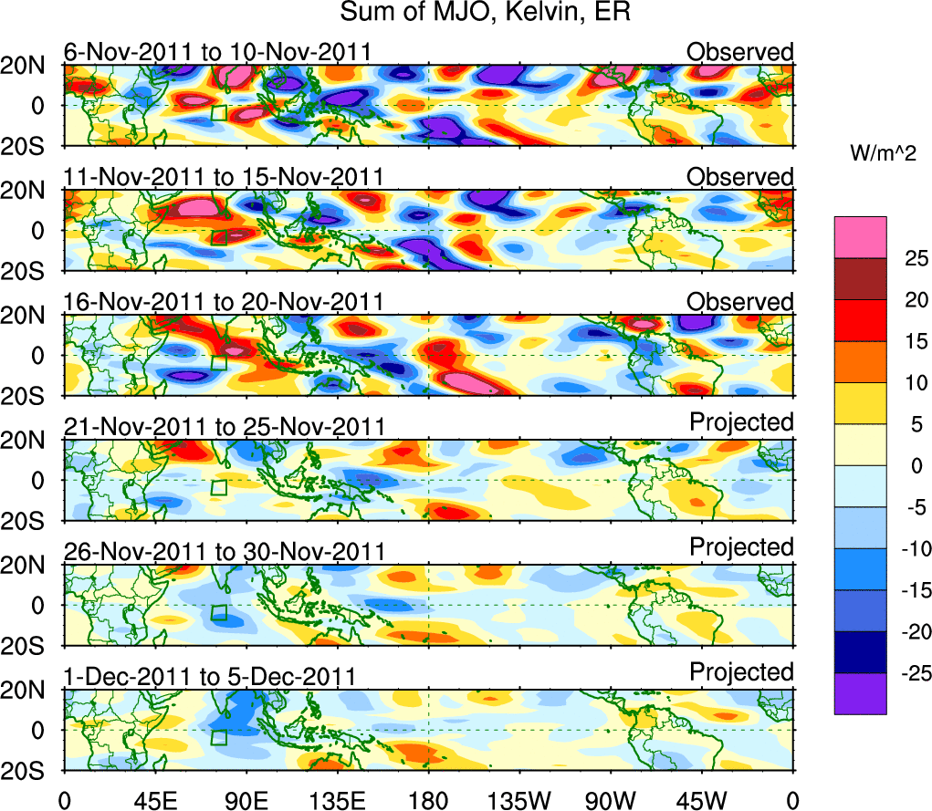 To identify tropical waves in near real-time, the OLR and UTWV data are filtered following Wheeler & Weickmann (2001 MWR). The daily anomalies are calculated using the first 3 harmonics of the seasonal cycle for 1979–2009. Missing values are then filled using linear interpolation in space and time. The most recent 365 days of anomalies are padded with 659 days of zeroes, and the result is filtered for each wave type.