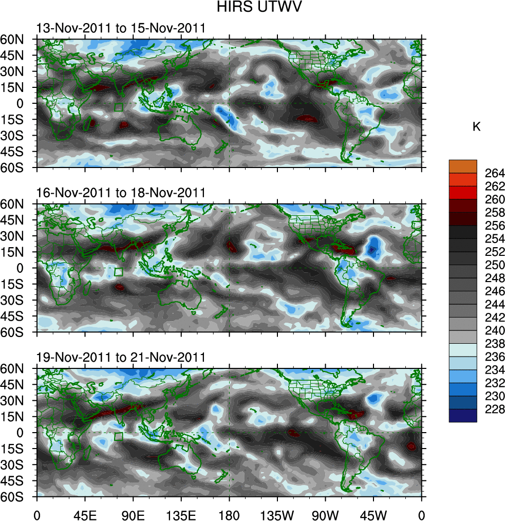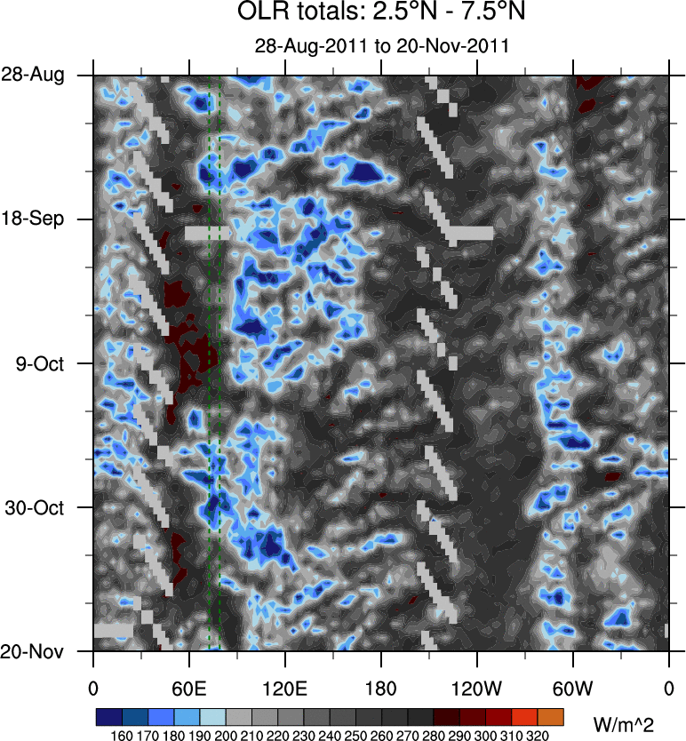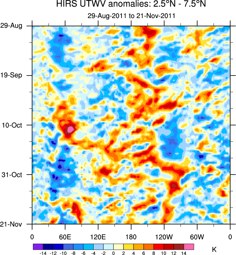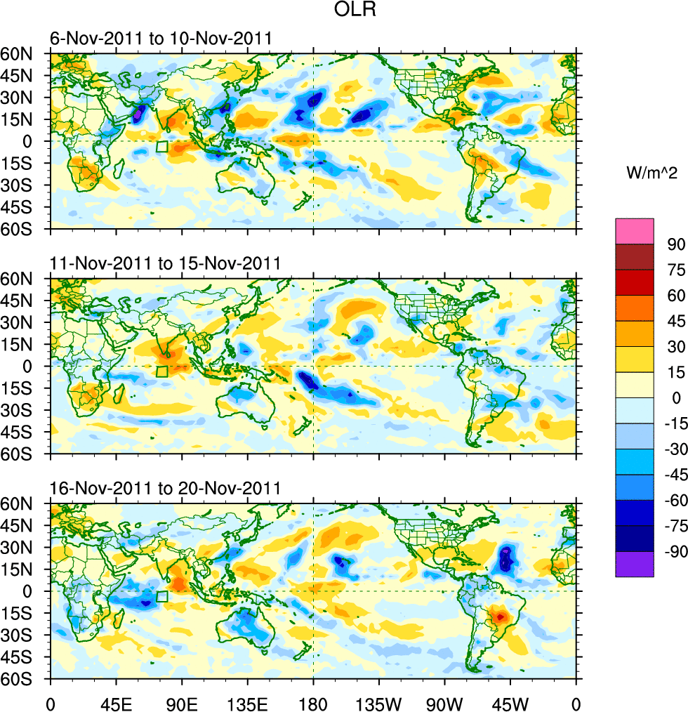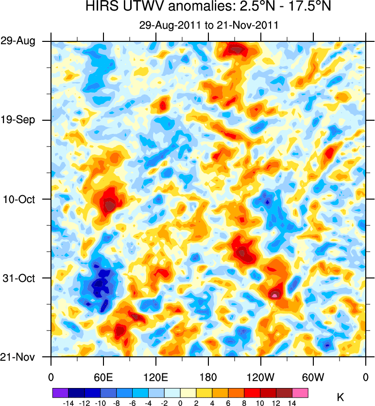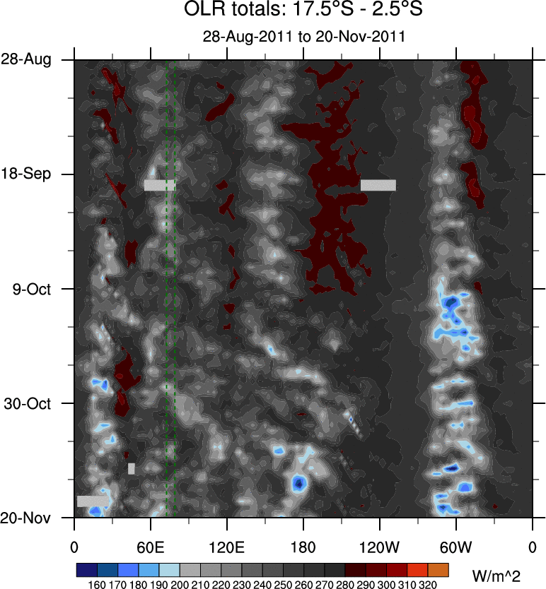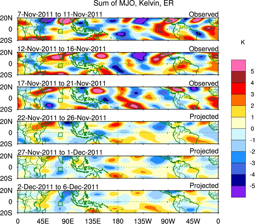 To identify tropical waves in near real-time, the OLR and UTWV data are filtered following Wheeler & Weickmann (2001 MWR). The daily anomalies are calculated using the first 3 harmonics of the seasonal cycle for 1979–2009. Missing values are then filled using linear interpolation in space and time. The most recent 365 days of anomalies are padded with 659 days of zeroes, and the result is filtered for each wave type.