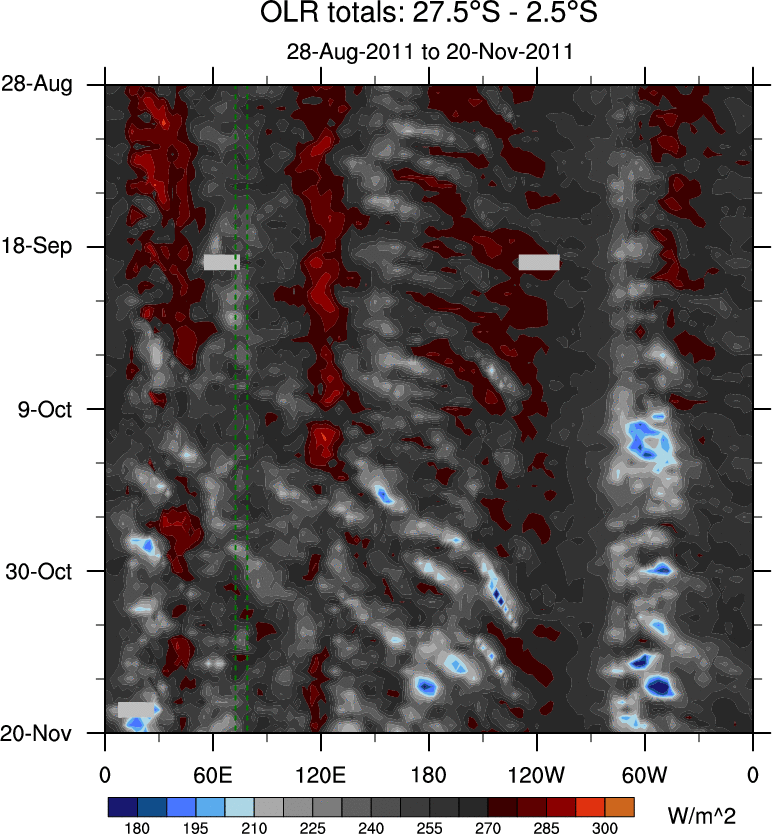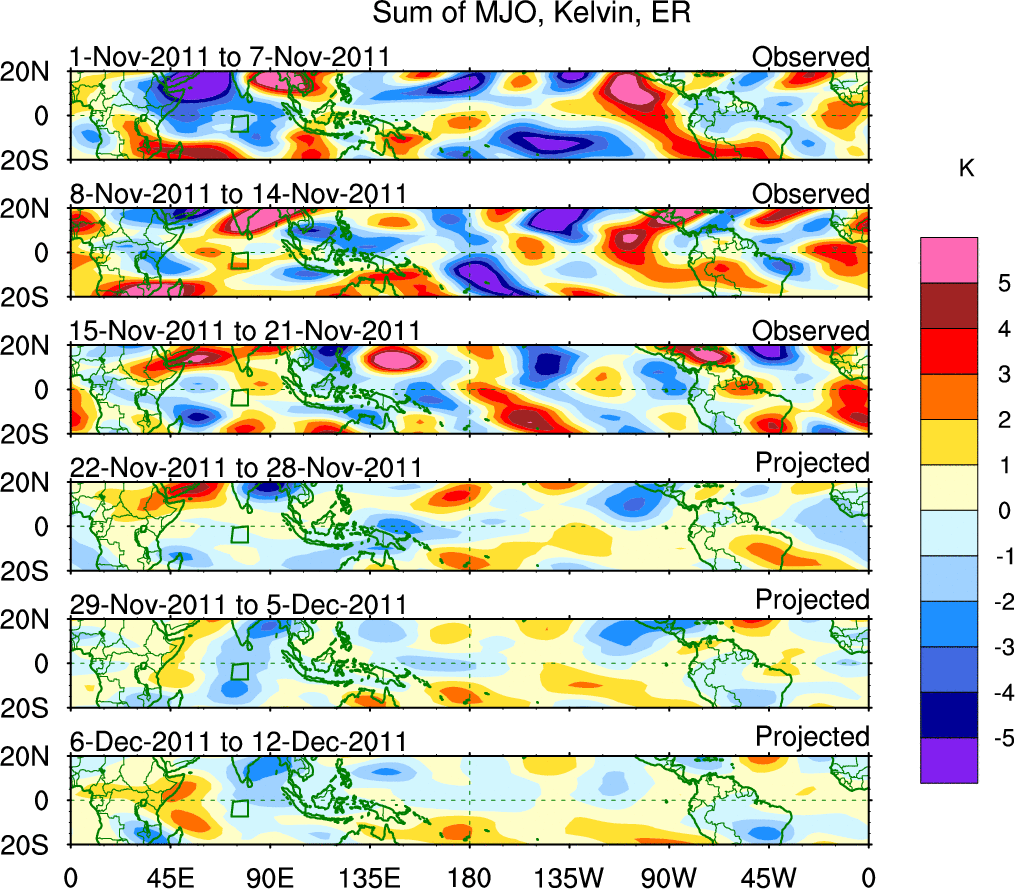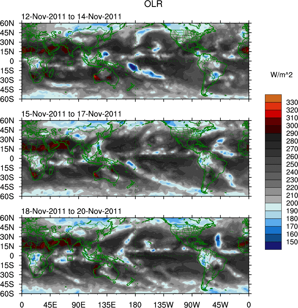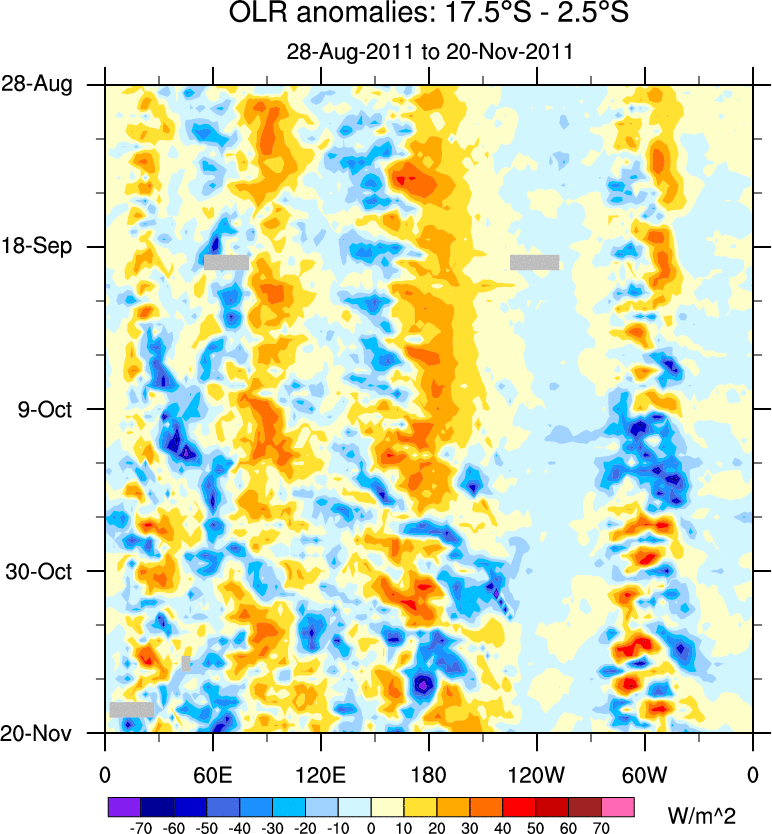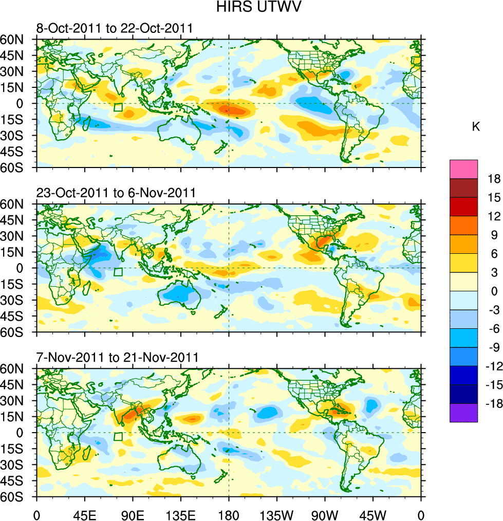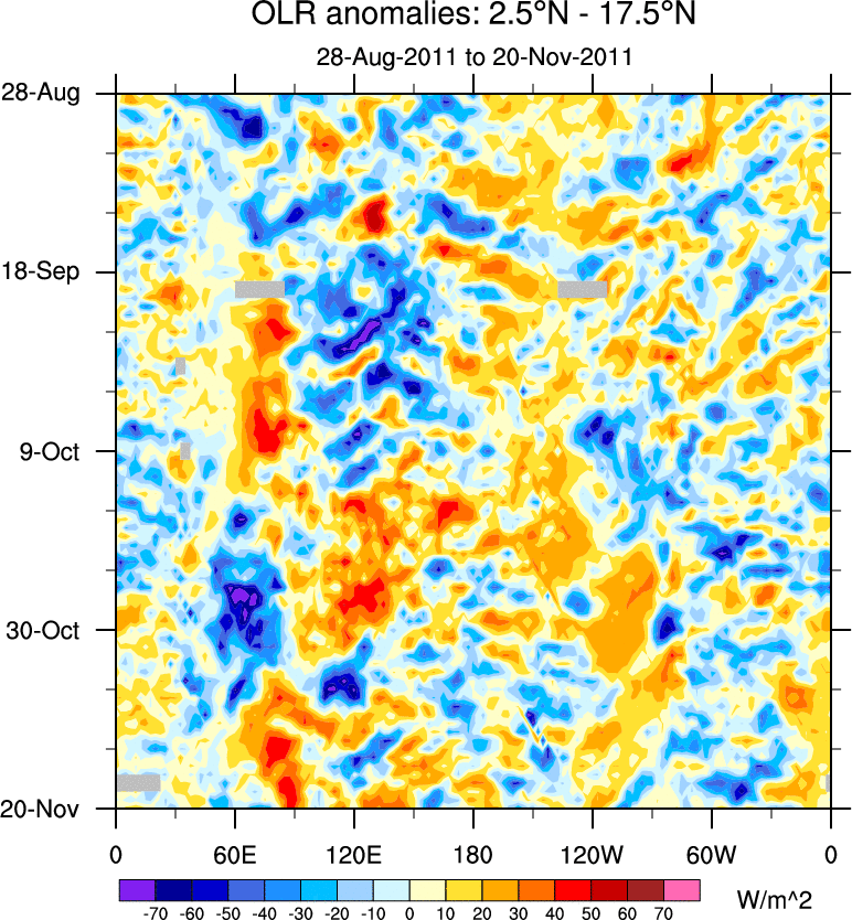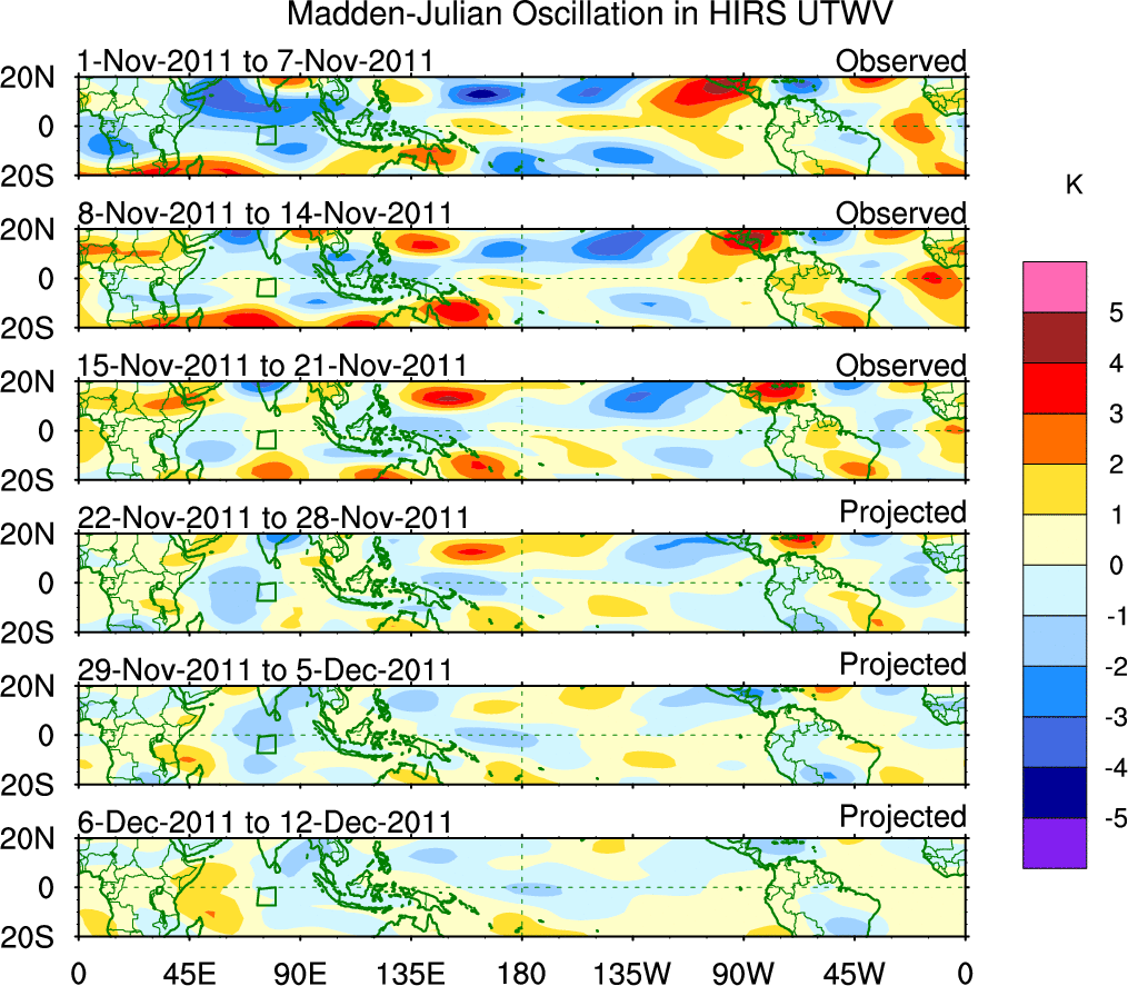 To identify tropical waves in near real-time, the OLR and UTWV data are filtered following Wheeler & Weickmann (2001 MWR). The daily anomalies are calculated using the first 3 harmonics of the seasonal cycle for 1979–2009. Missing values are then filled using linear interpolation in space and time. The most recent 365 days of anomalies are padded with 659 days of zeroes, and the result is filtered for each wave type.