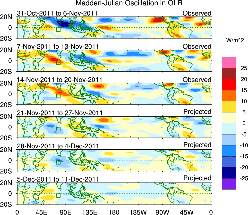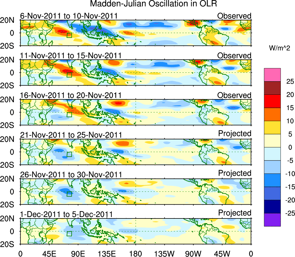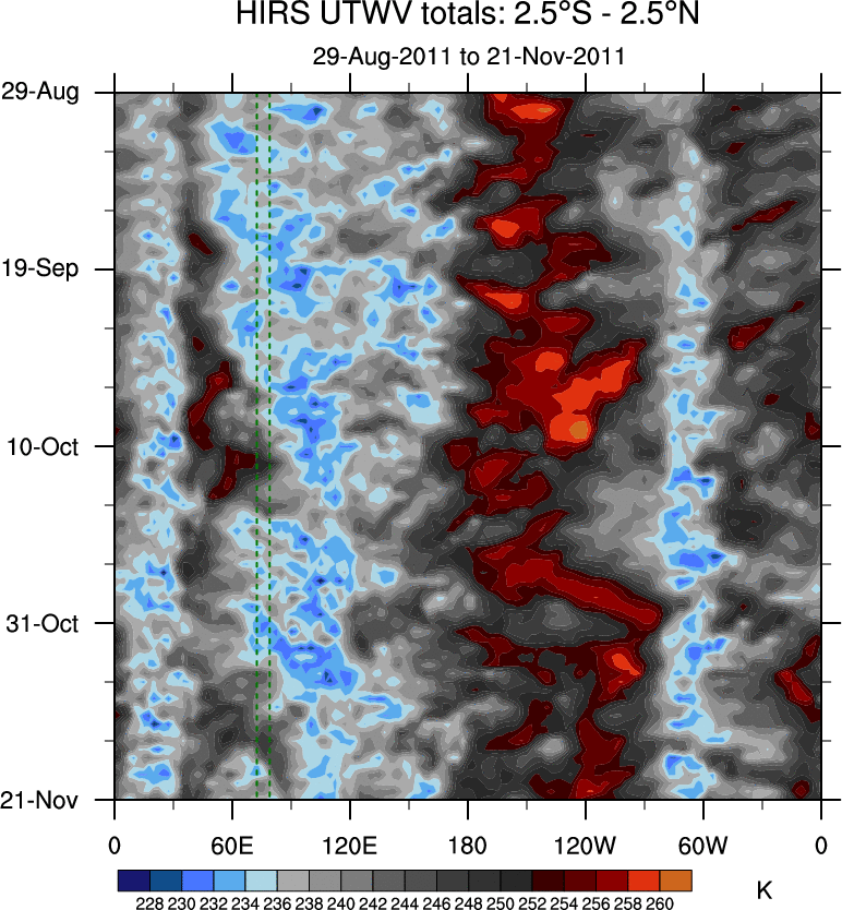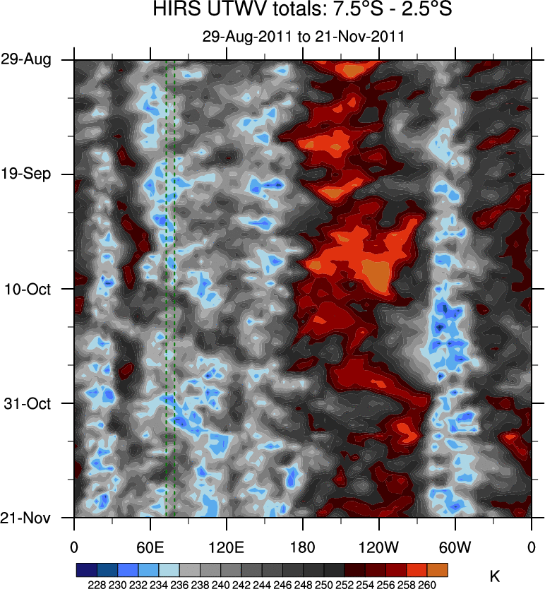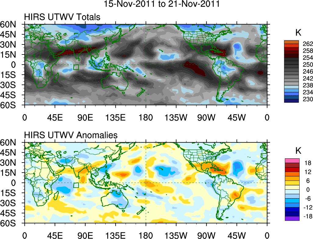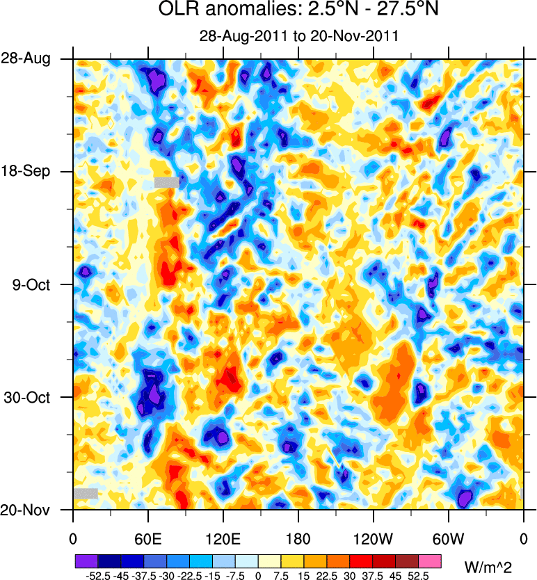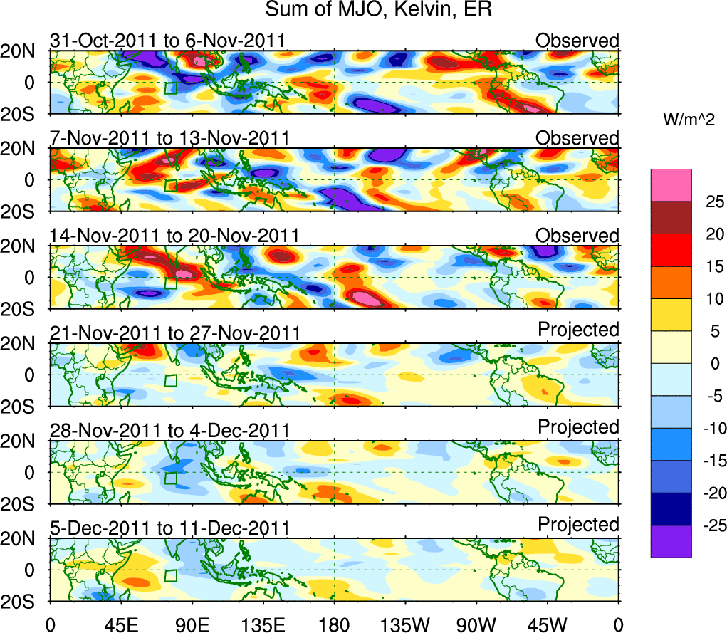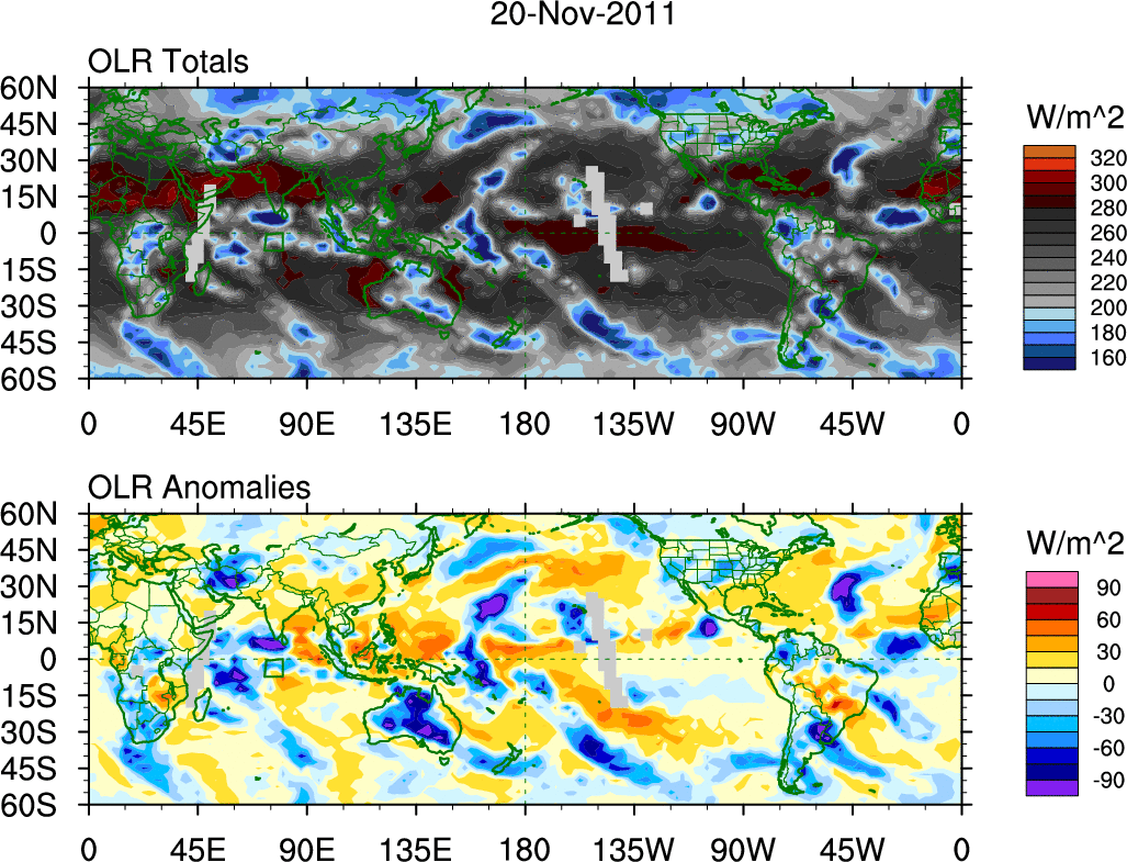 To identify tropical waves in near real-time, the OLR and UTWV data are filtered following Wheeler & Weickmann (2001 MWR). The daily anomalies are calculated using the first 3 harmonics of the seasonal cycle for 1979–2009. Missing values are then filled using linear interpolation in space and time. The most recent 365 days of anomalies are padded with 659 days of zeroes, and the result is filtered for each wave type.
