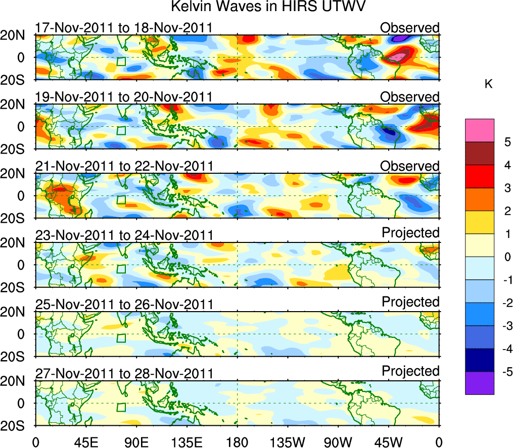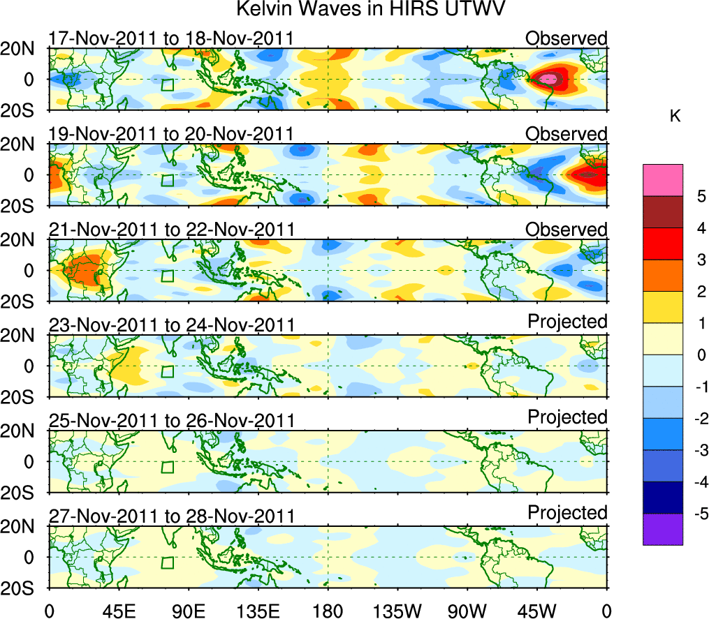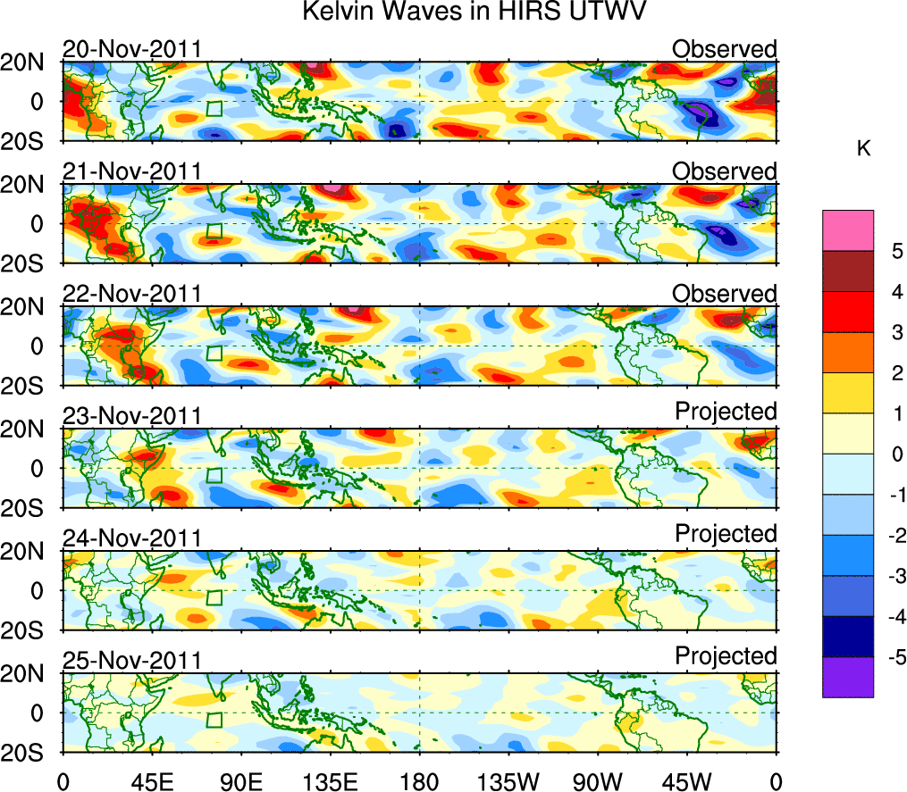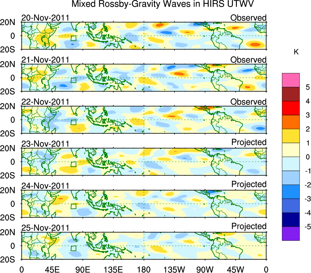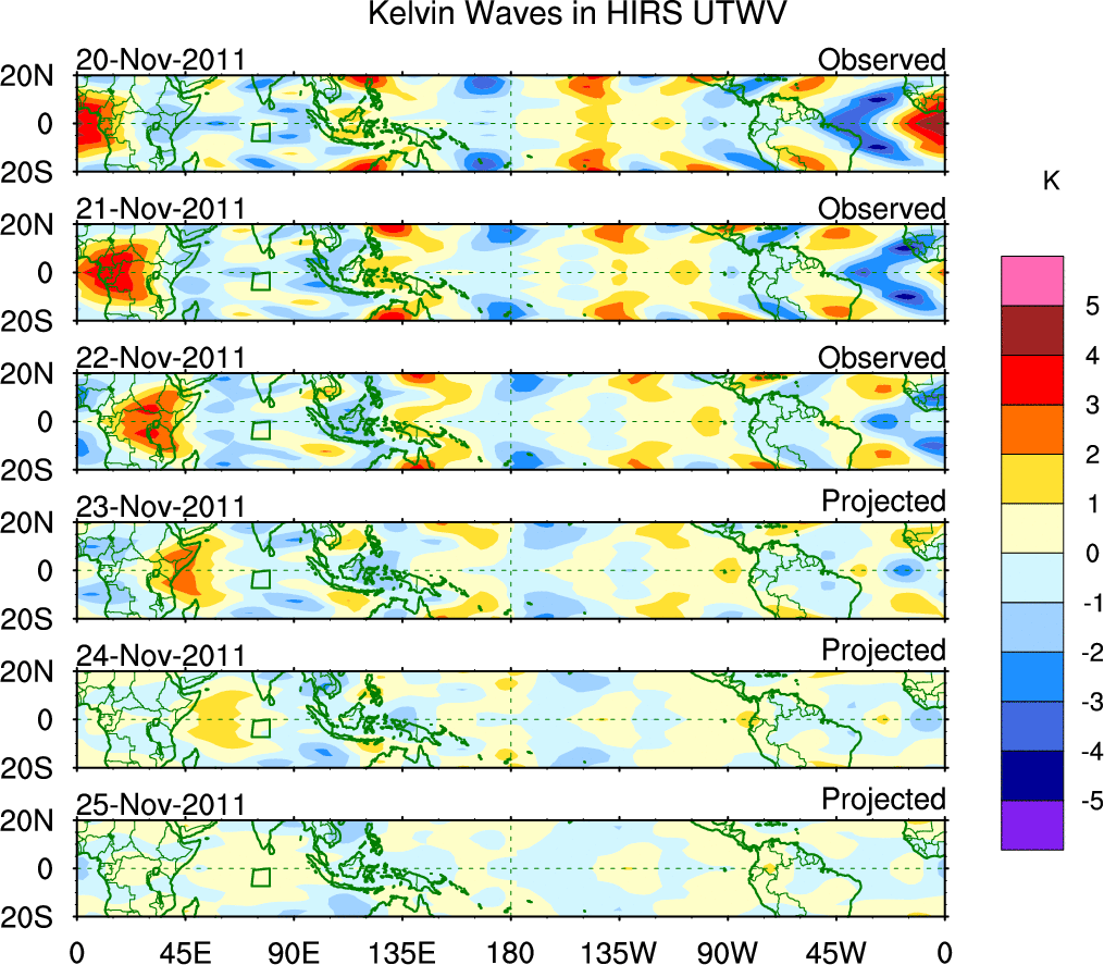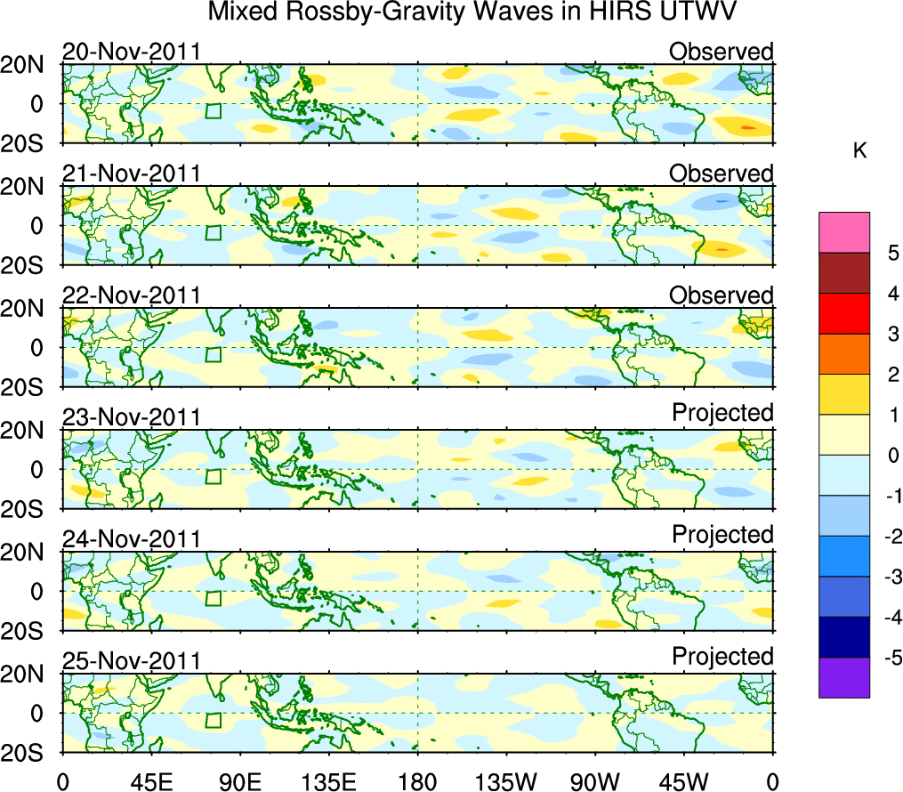 To identify tropical waves in near real-time, the OLR and UTWV data are filtered following Wheeler & Weickmann (2001 MWR). The daily anomalies are calculated using the first 3 harmonics of the seasonal cycle for 1979–2009. Missing values are then filled using linear interpolation in space and time. The most recent 365 days of anomalies are padded with 659 days of zeroes, and the result is filtered for each wave type.