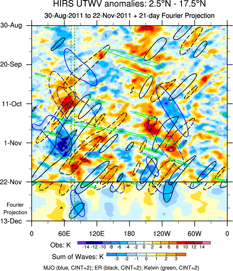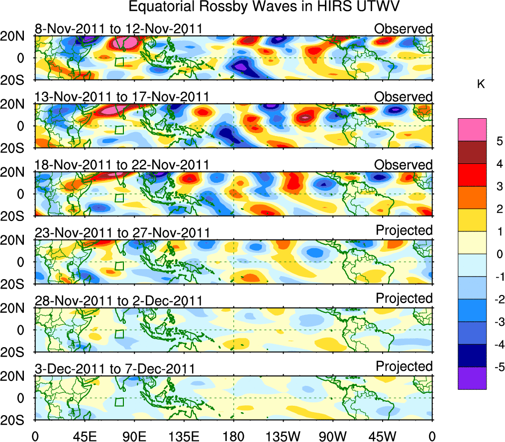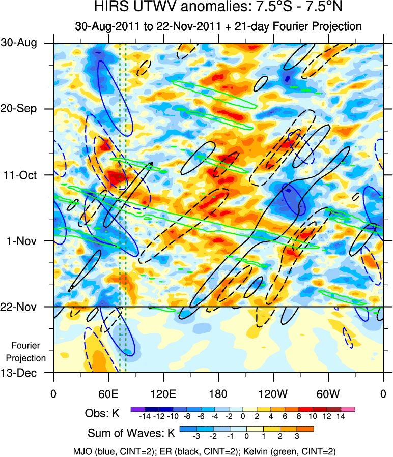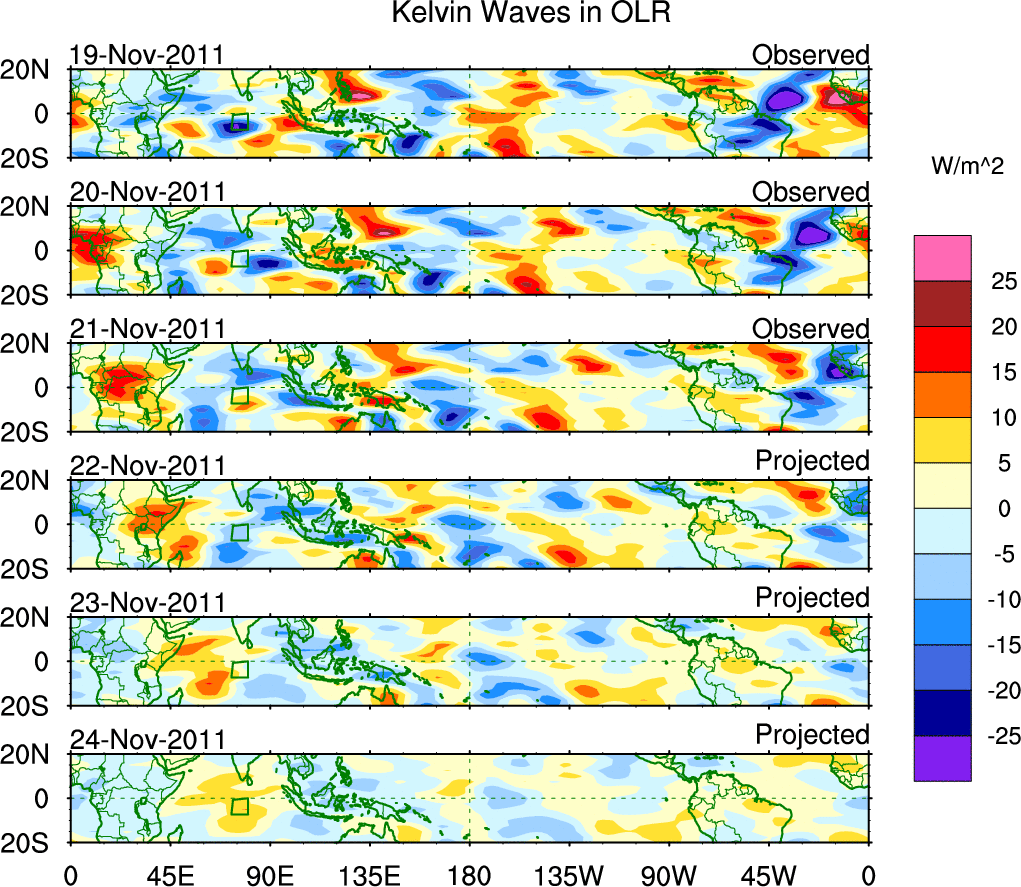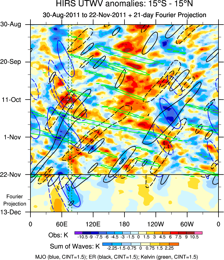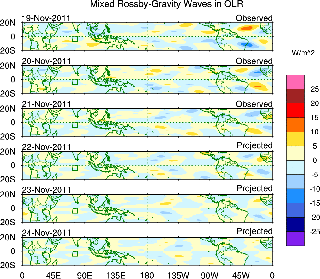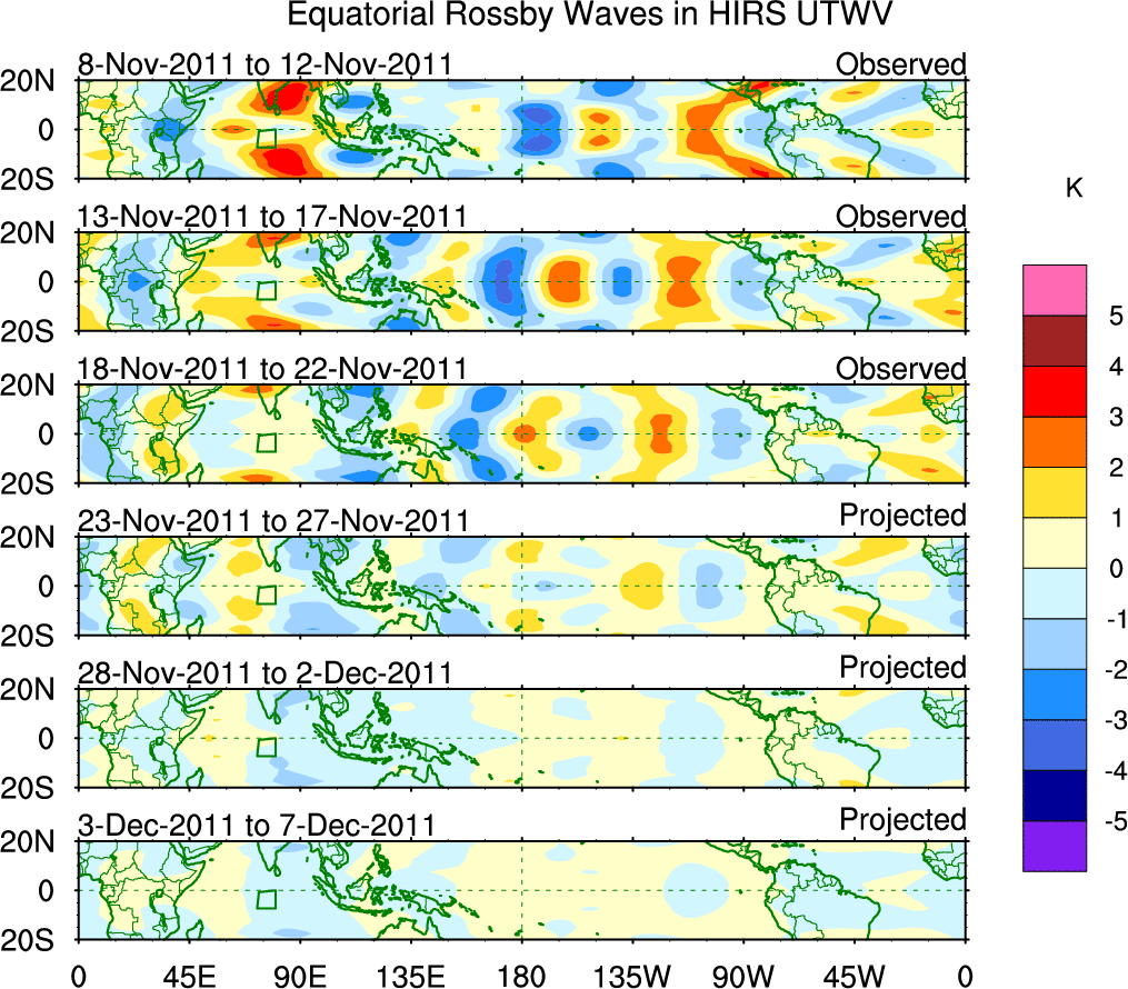 To identify tropical waves in near real-time, the OLR and UTWV data are filtered following Wheeler & Weickmann (2001 MWR). The daily anomalies are calculated using the first 3 harmonics of the seasonal cycle for 1979–2009. Missing values are then filled using linear interpolation in space and time. The most recent 365 days of anomalies are padded with 659 days of zeroes, and the result is filtered for each wave type.