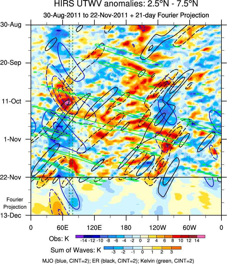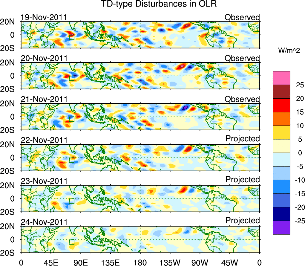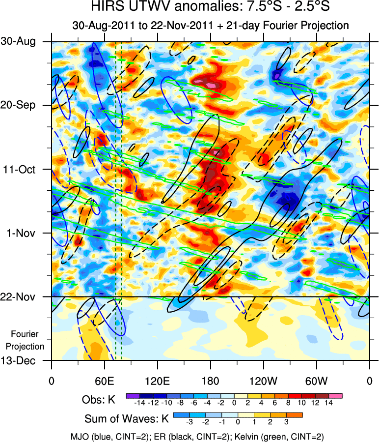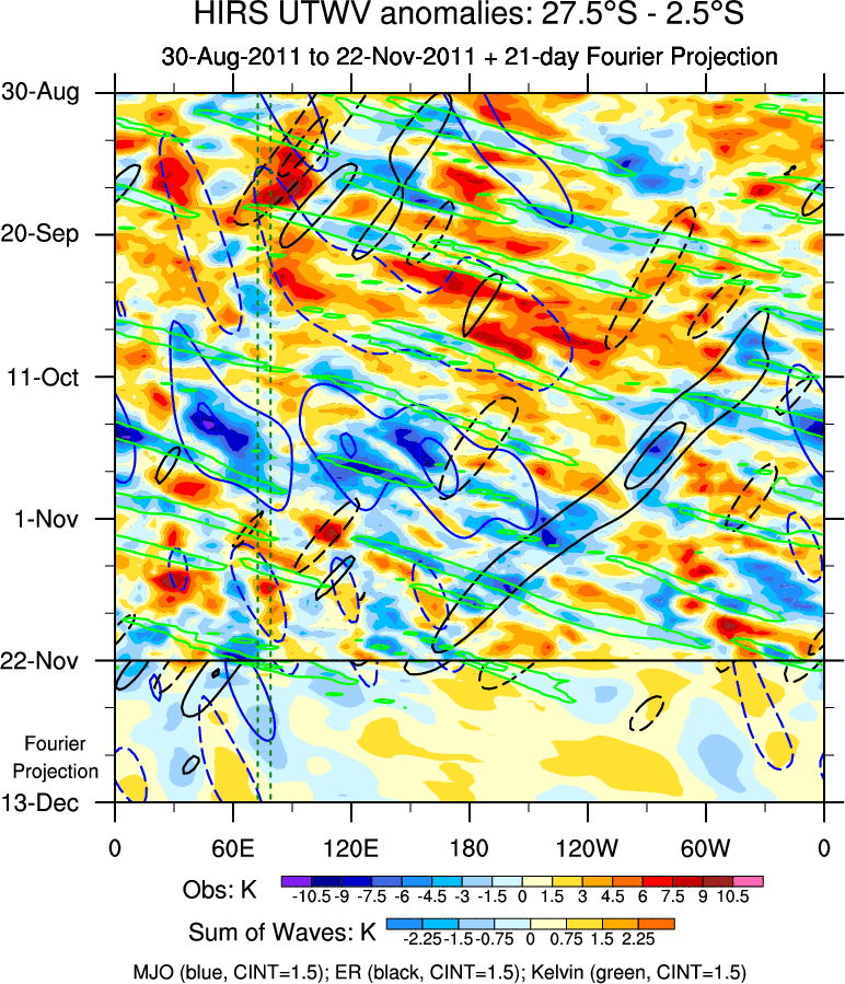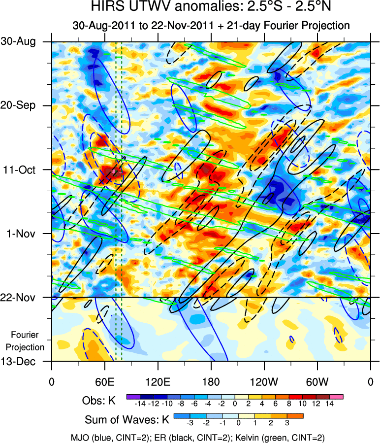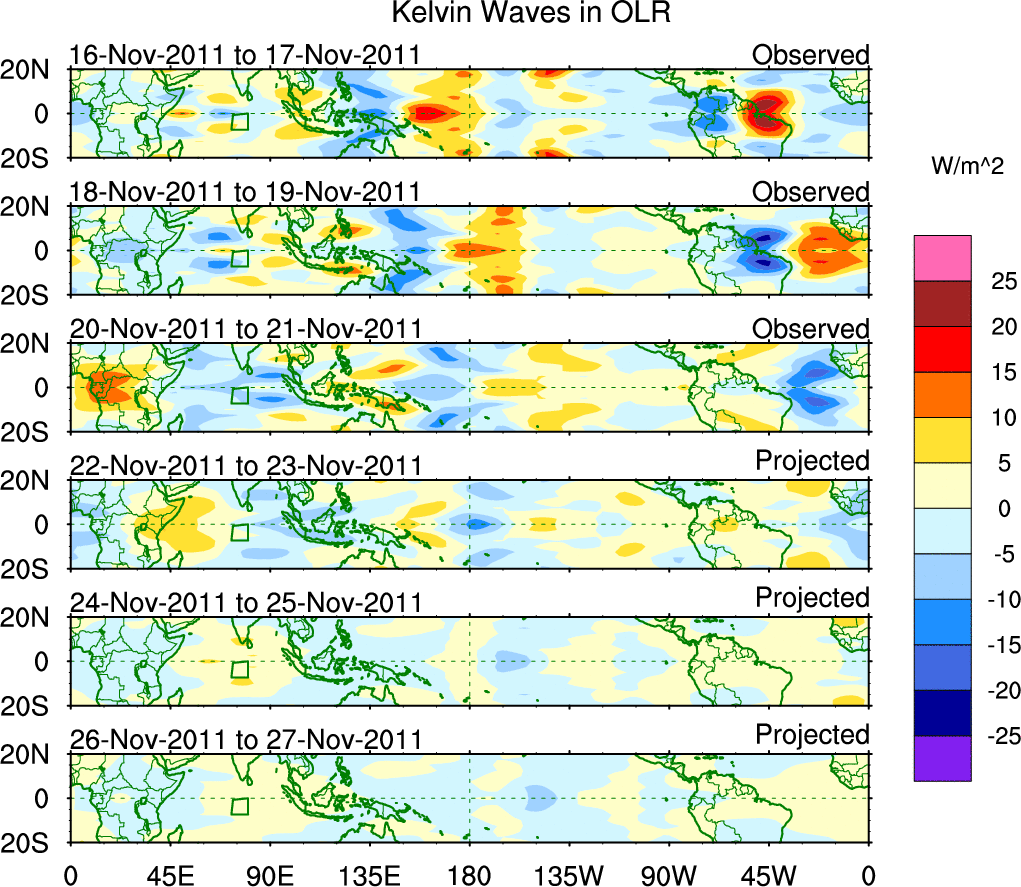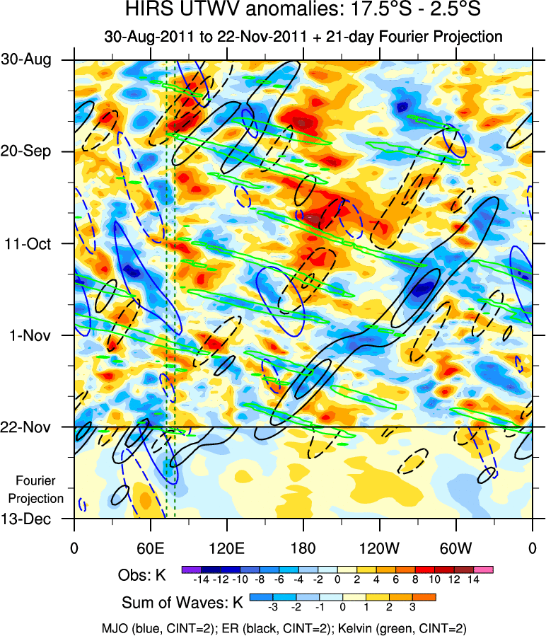 To identify tropical waves in near real-time, the OLR and UTWV data are filtered following Wheeler & Weickmann (2001 MWR). The daily anomalies are calculated using the first 3 harmonics of the seasonal cycle for 1979–2009. Missing values are then filled using linear interpolation in space and time. The most recent 365 days of anomalies are padded with 659 days of zeroes, and the result is filtered for each wave type.