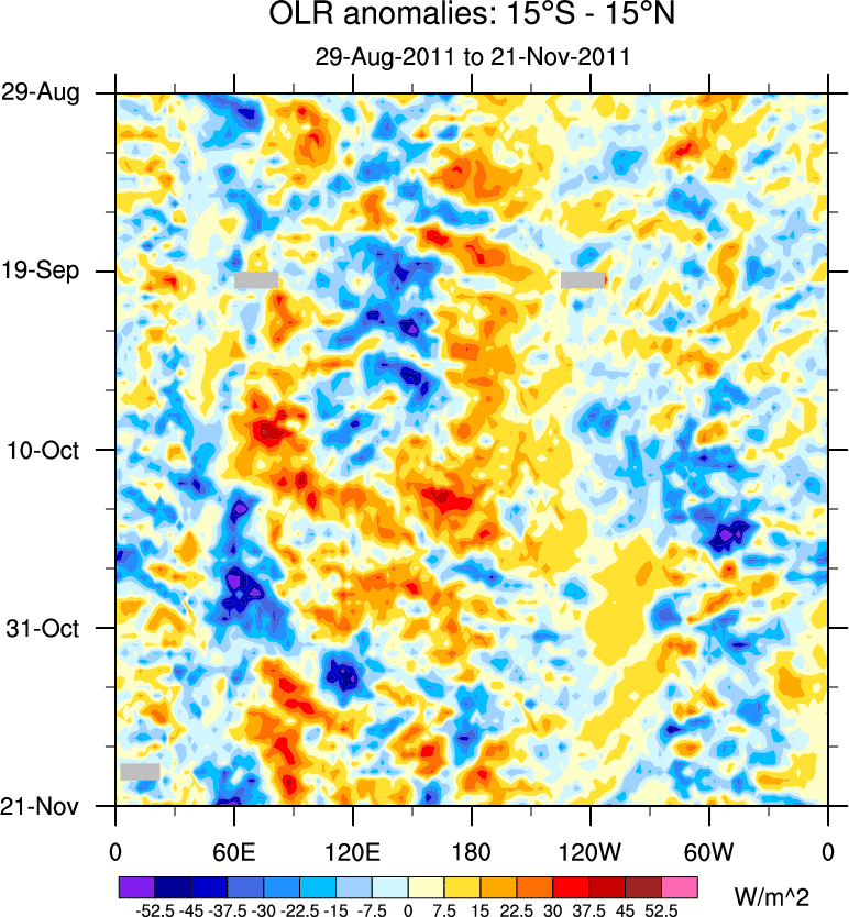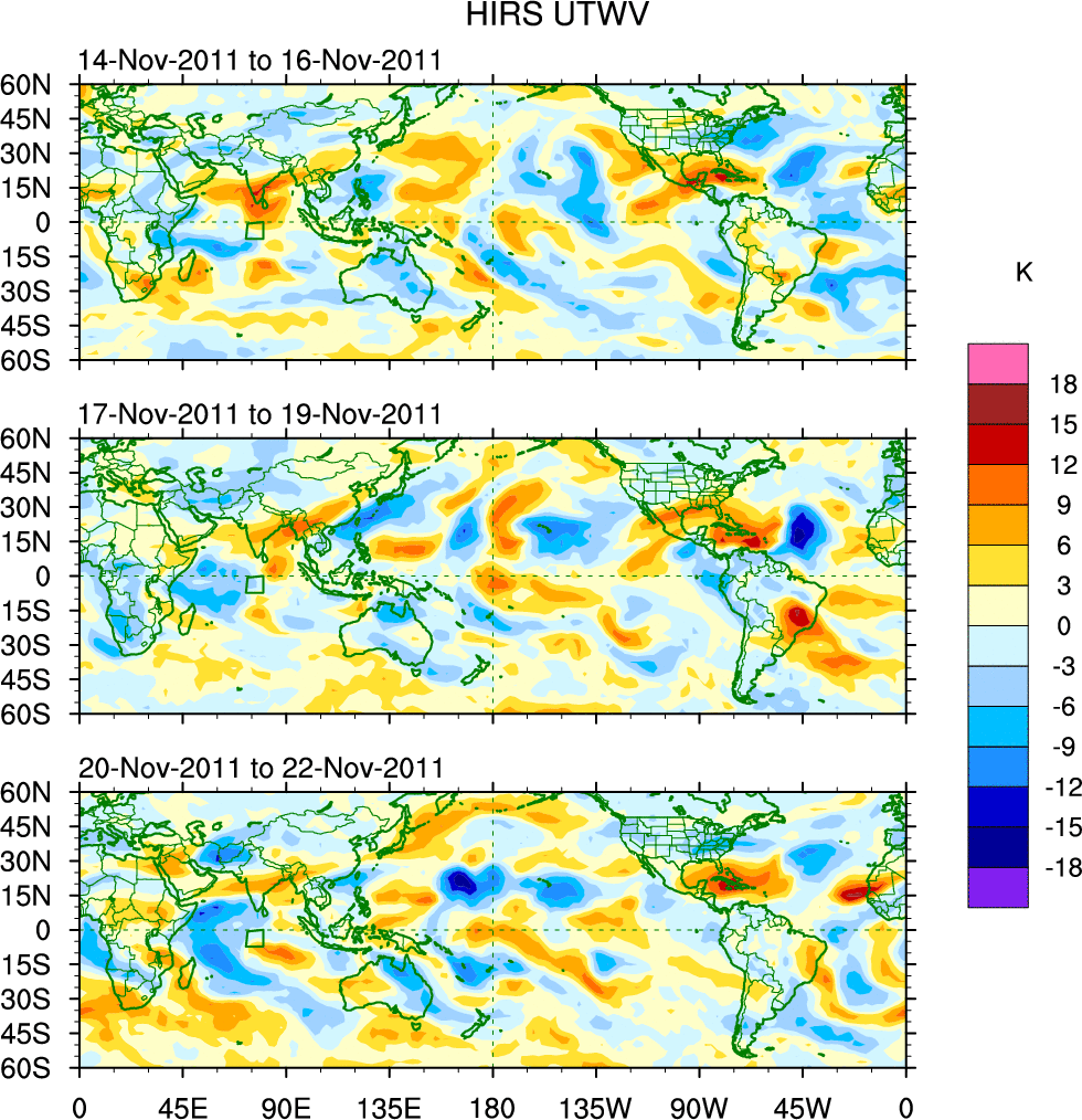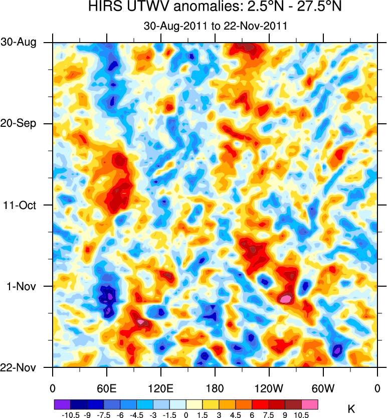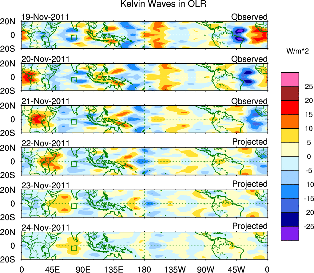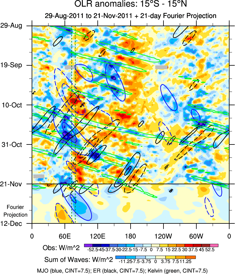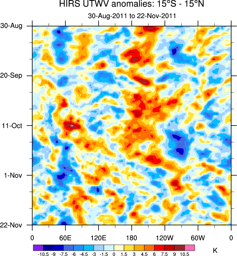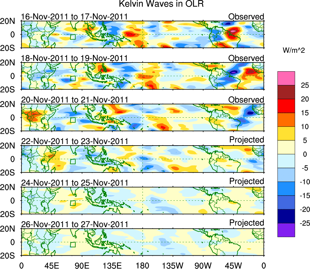 To identify tropical waves in near real-time, the OLR and UTWV data are filtered following Wheeler & Weickmann (2001 MWR). The daily anomalies are calculated using the first 3 harmonics of the seasonal cycle for 1979–2009. Missing values are then filled using linear interpolation in space and time. The most recent 365 days of anomalies are padded with 659 days of zeroes, and the result is filtered for each wave type.