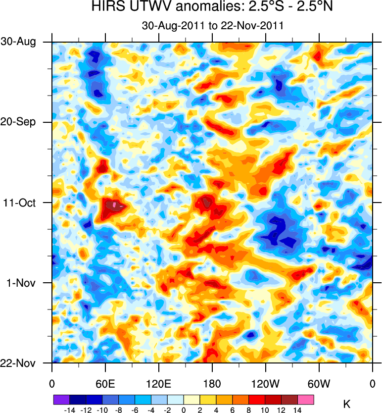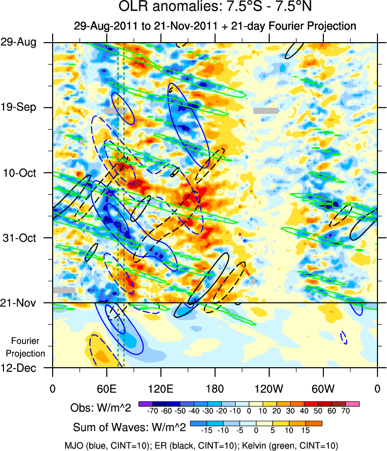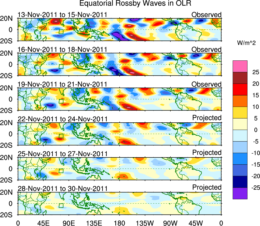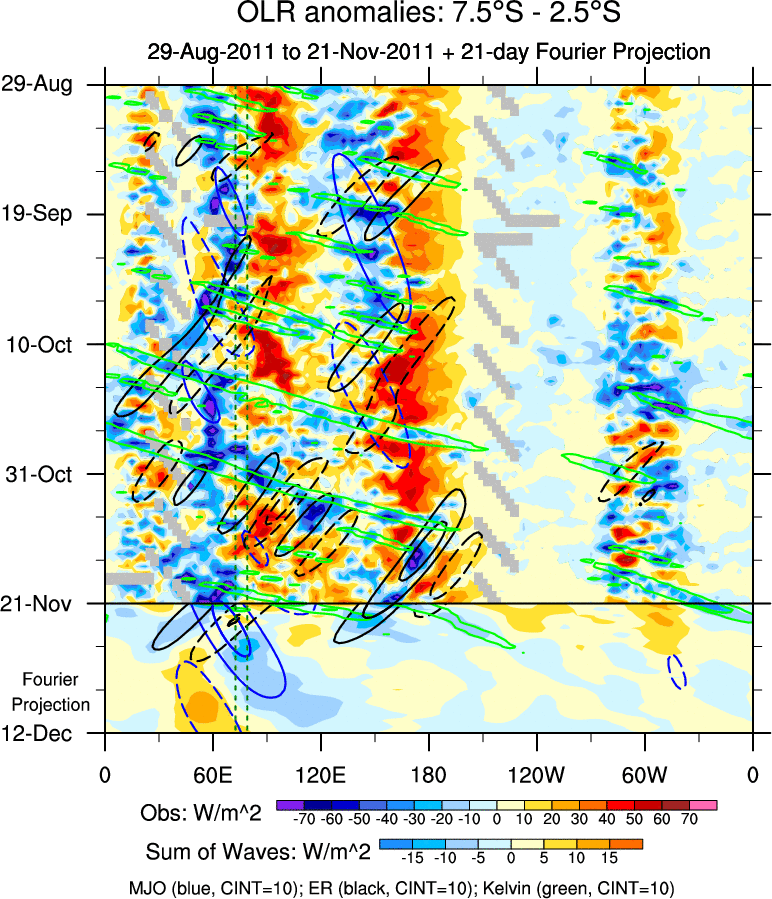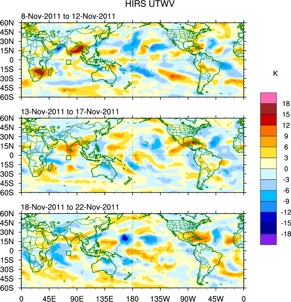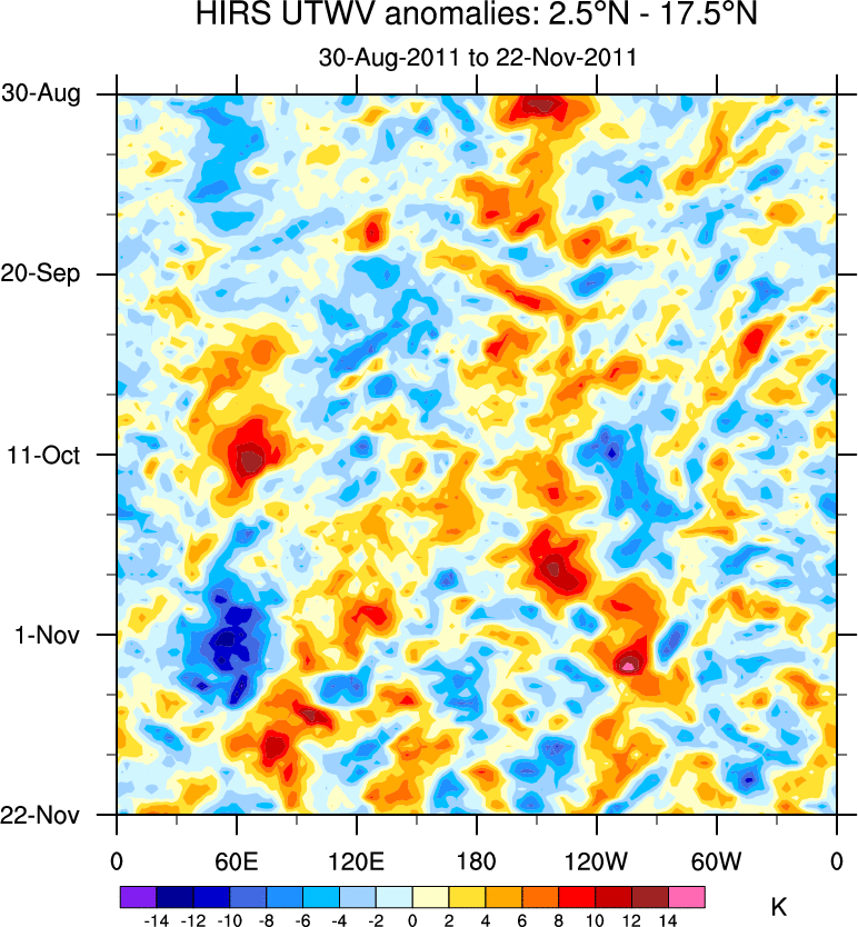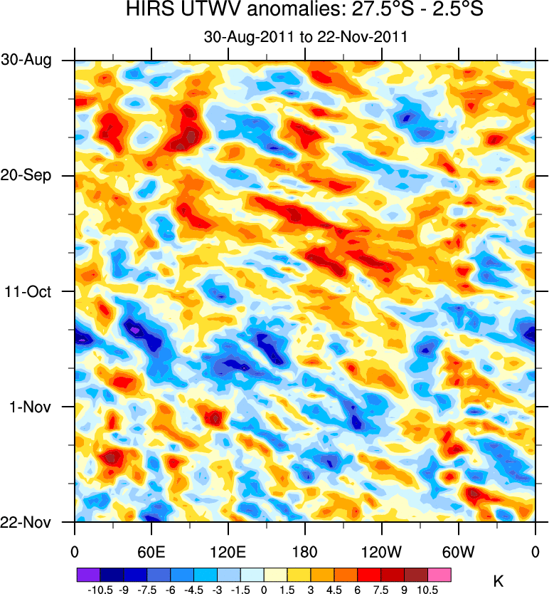 To identify tropical waves in near real-time, the OLR and UTWV data are filtered following Wheeler & Weickmann (2001 MWR). The daily anomalies are calculated using the first 3 harmonics of the seasonal cycle for 1979–2009. Missing values are then filled using linear interpolation in space and time. The most recent 365 days of anomalies are padded with 659 days of zeroes, and the result is filtered for each wave type.