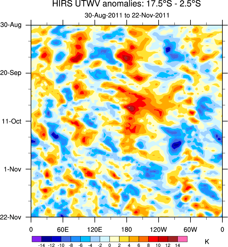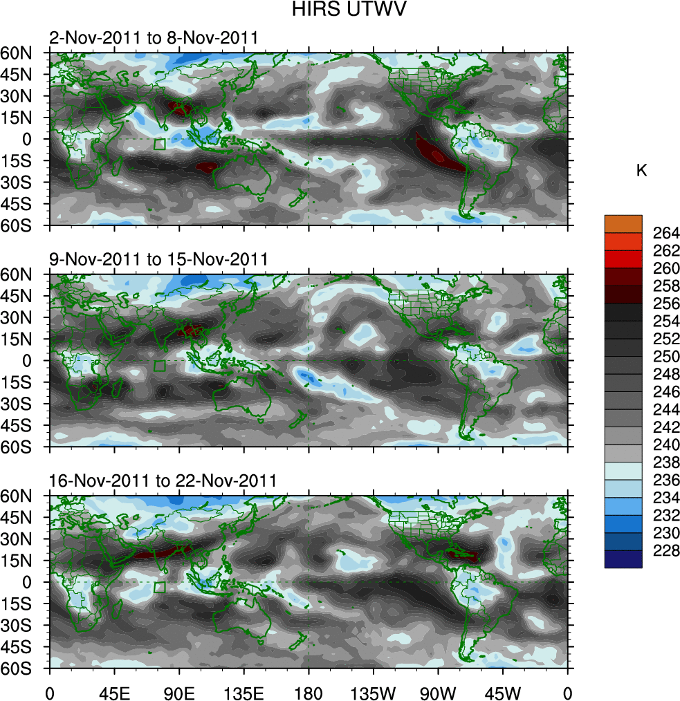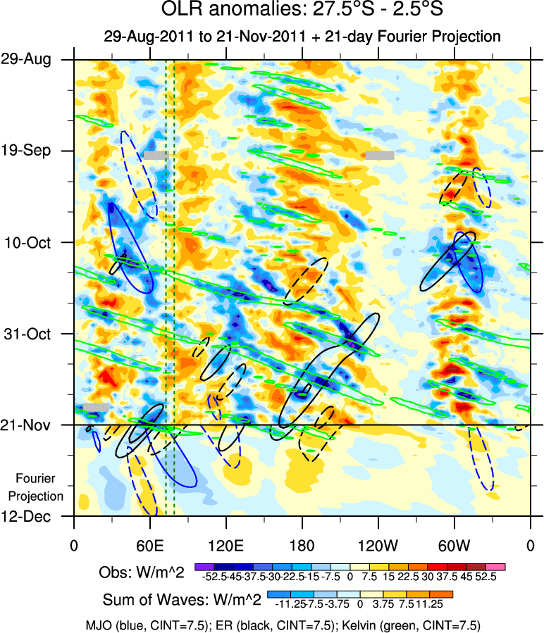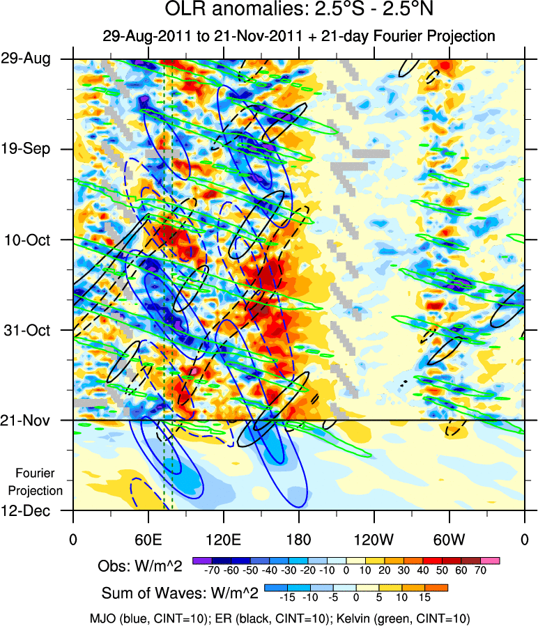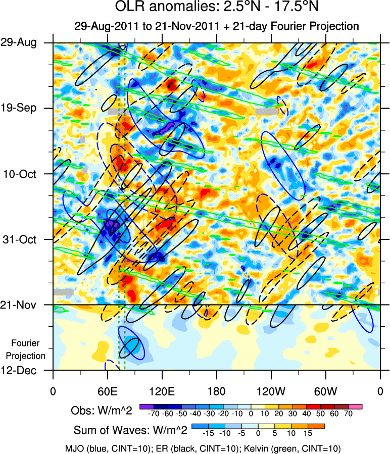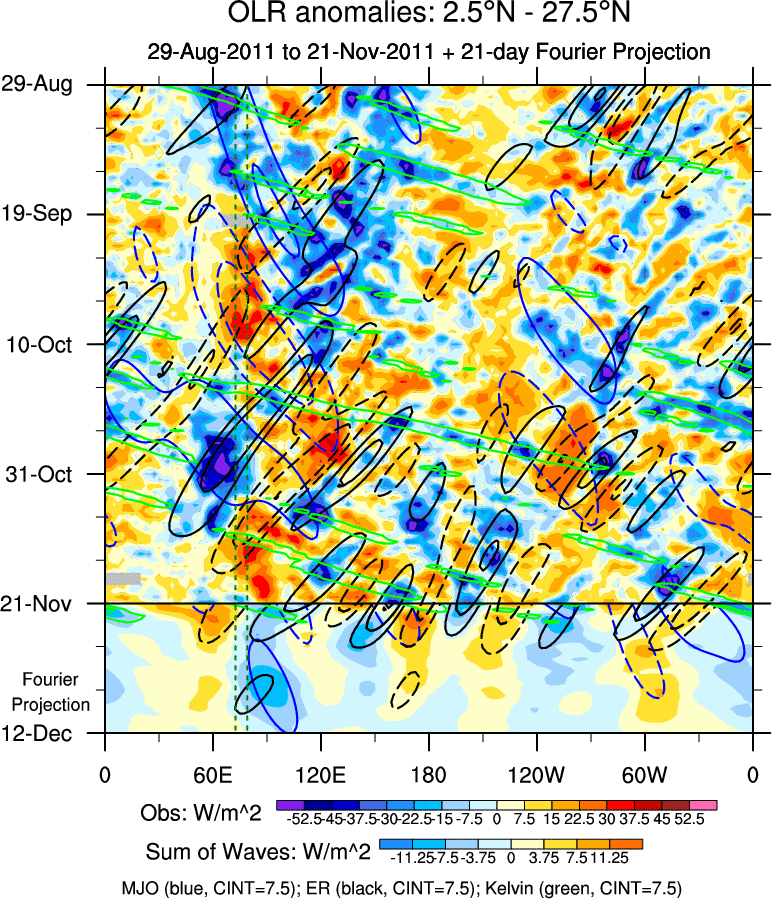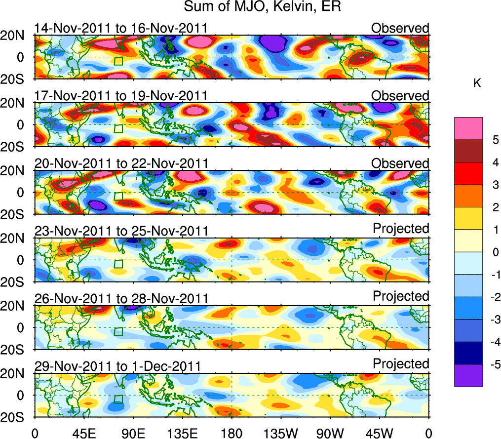 To identify tropical waves in near real-time, the OLR and UTWV data are filtered following Wheeler & Weickmann (2001 MWR). The daily anomalies are calculated using the first 3 harmonics of the seasonal cycle for 1979–2009. Missing values are then filled using linear interpolation in space and time. The most recent 365 days of anomalies are padded with 659 days of zeroes, and the result is filtered for each wave type.