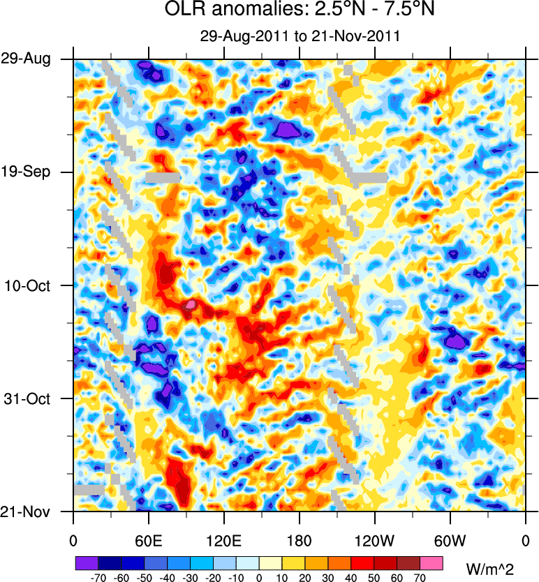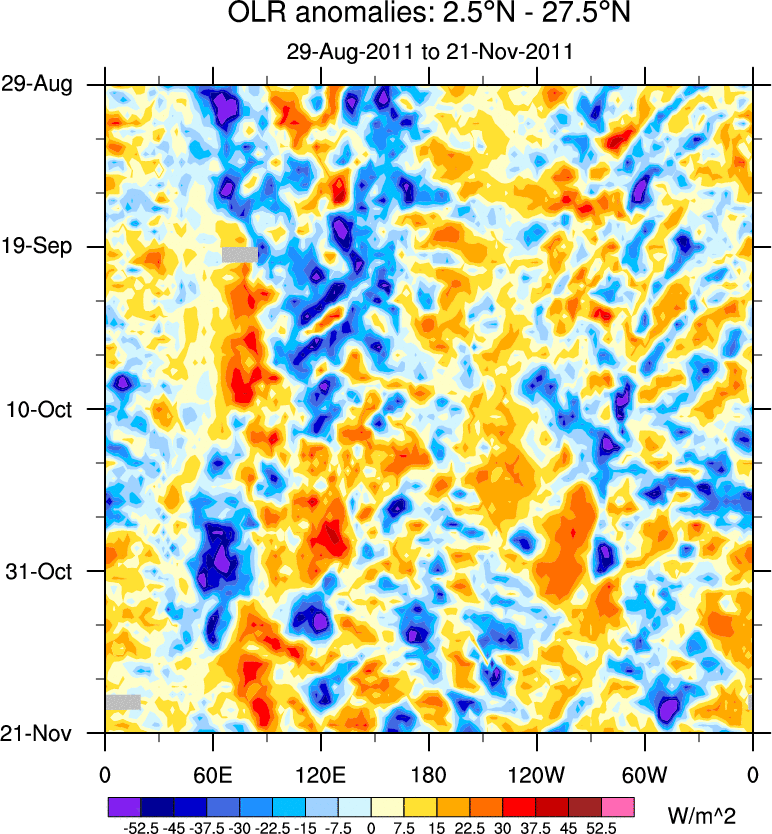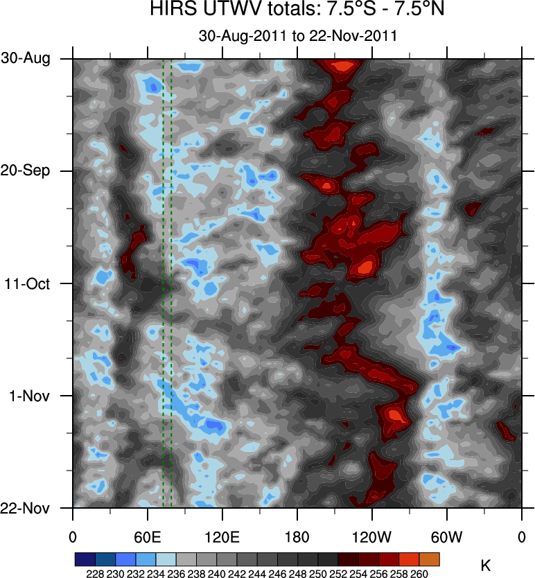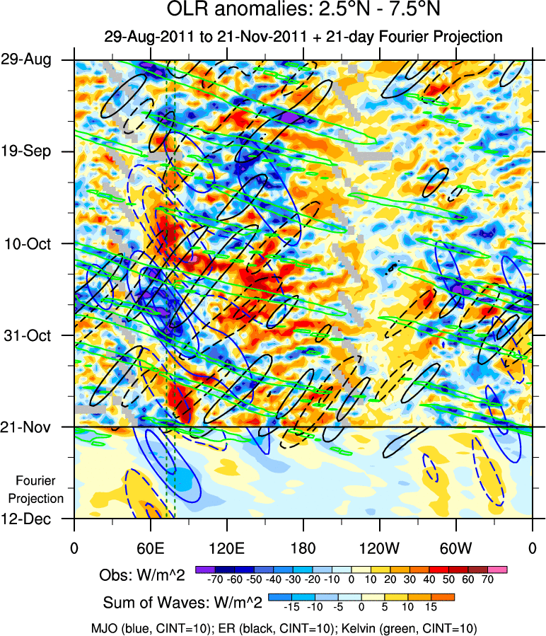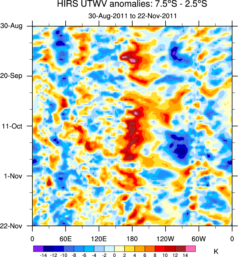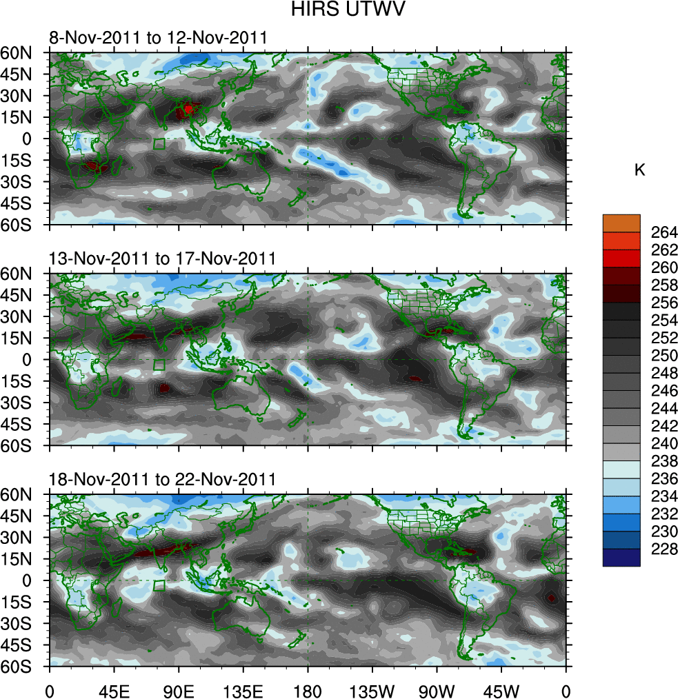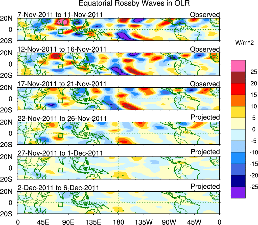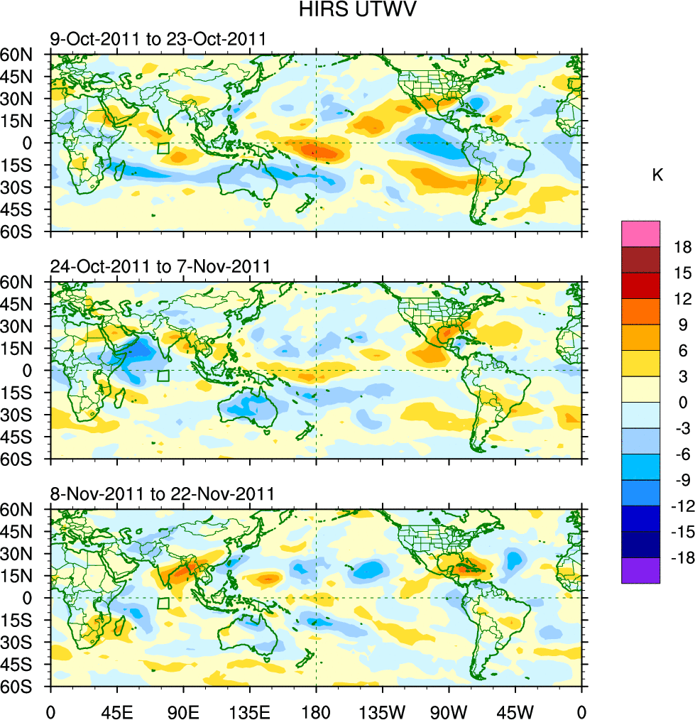 To identify tropical waves in near real-time, the OLR and UTWV data are filtered following Wheeler & Weickmann (2001 MWR). The daily anomalies are calculated using the first 3 harmonics of the seasonal cycle for 1979–2009. Missing values are then filled using linear interpolation in space and time. The most recent 365 days of anomalies are padded with 659 days of zeroes, and the result is filtered for each wave type.