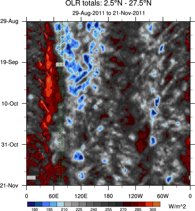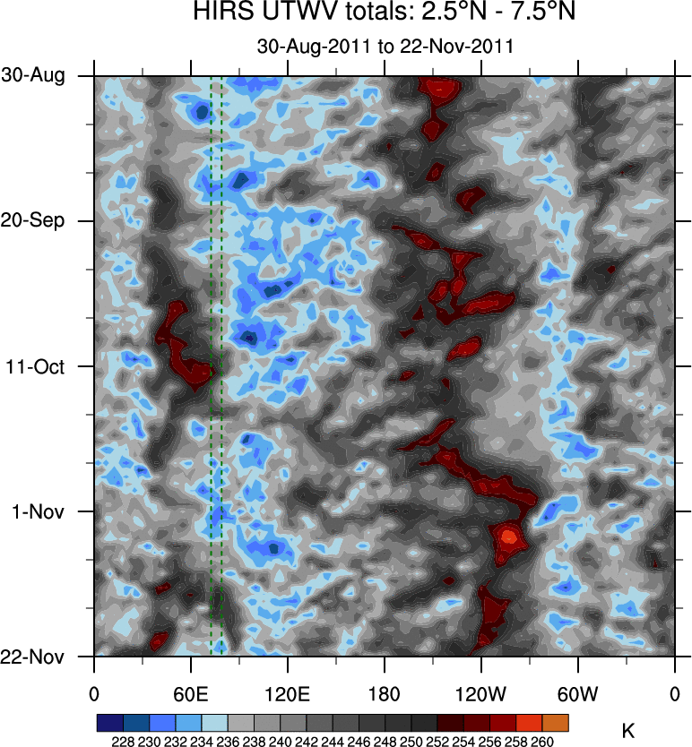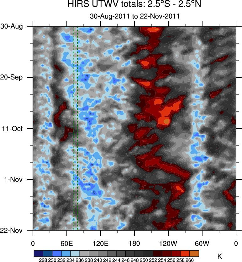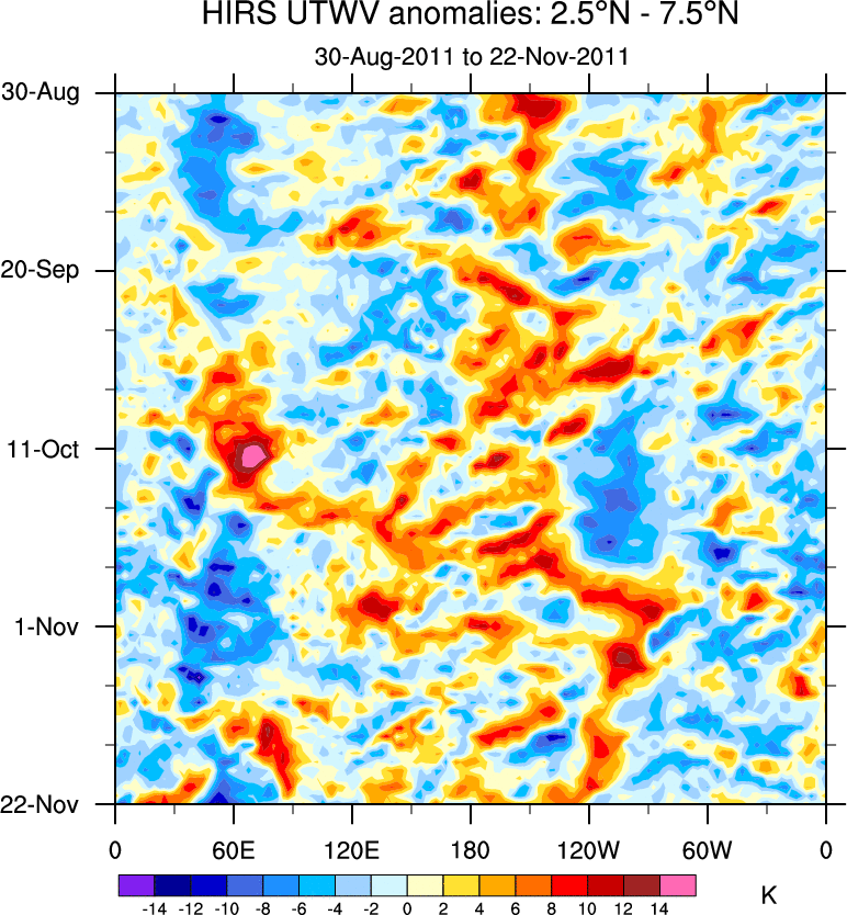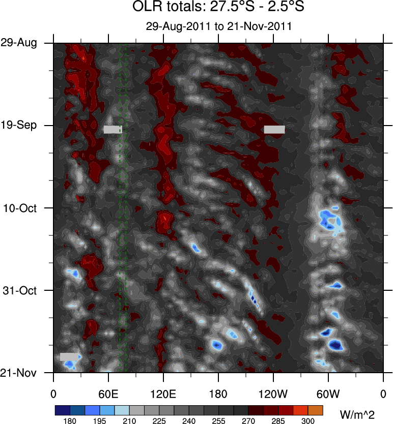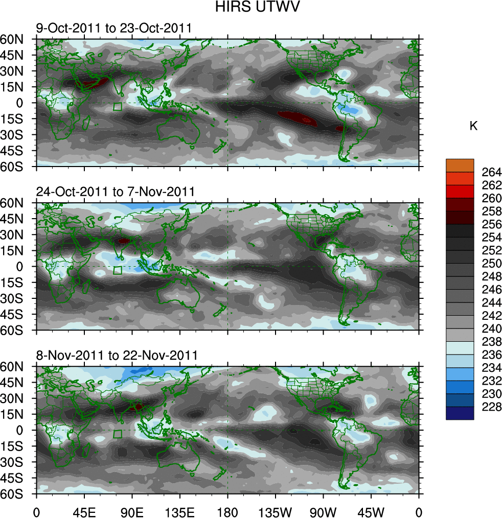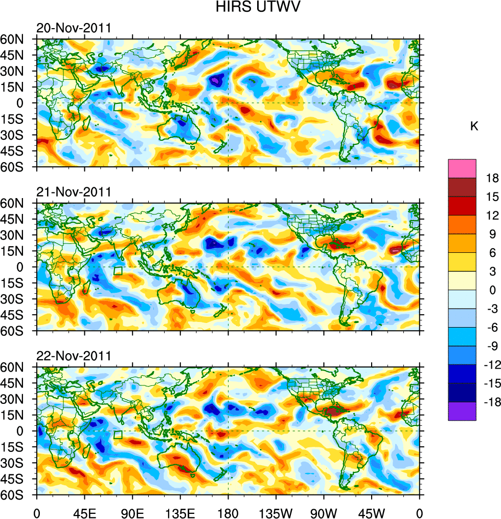 To identify tropical waves in near real-time, the OLR and UTWV data are filtered following Wheeler & Weickmann (2001 MWR). The daily anomalies are calculated using the first 3 harmonics of the seasonal cycle for 1979–2009. Missing values are then filled using linear interpolation in space and time. The most recent 365 days of anomalies are padded with 659 days of zeroes, and the result is filtered for each wave type.