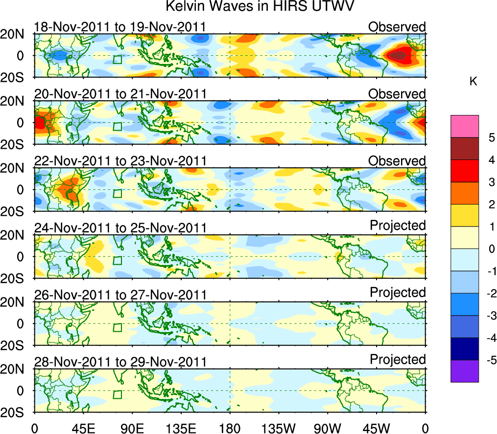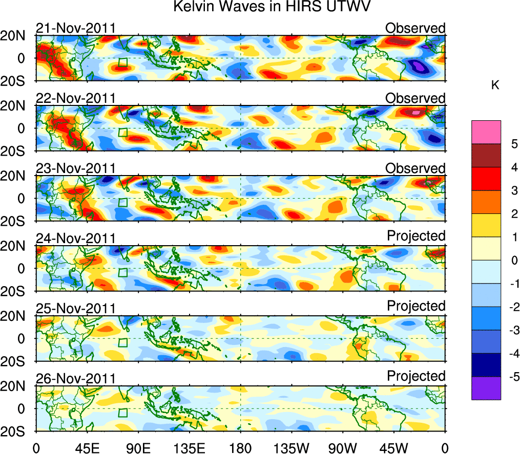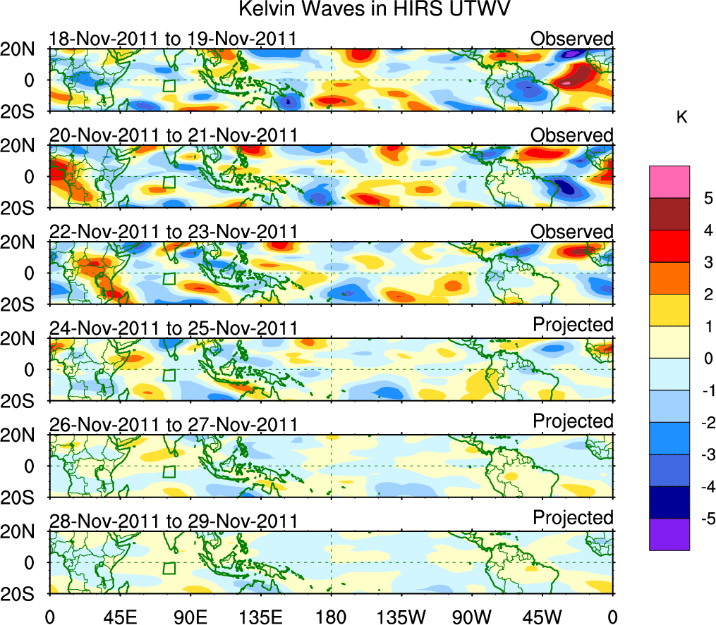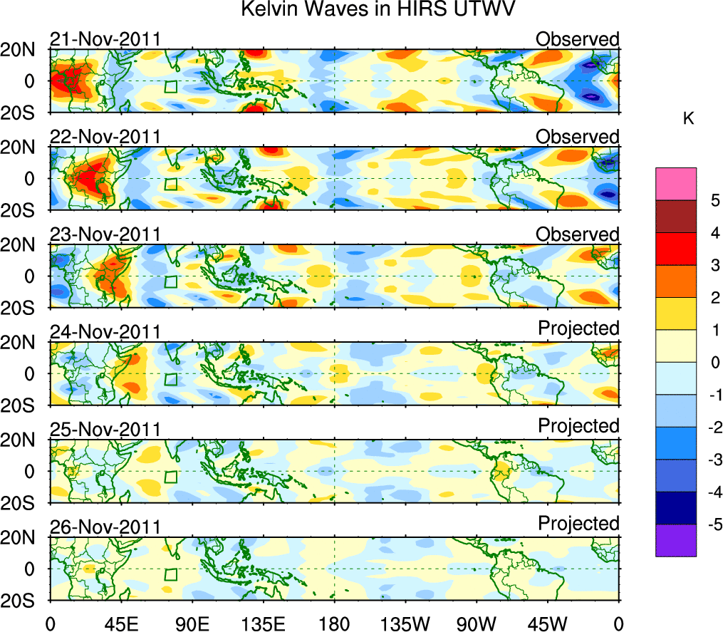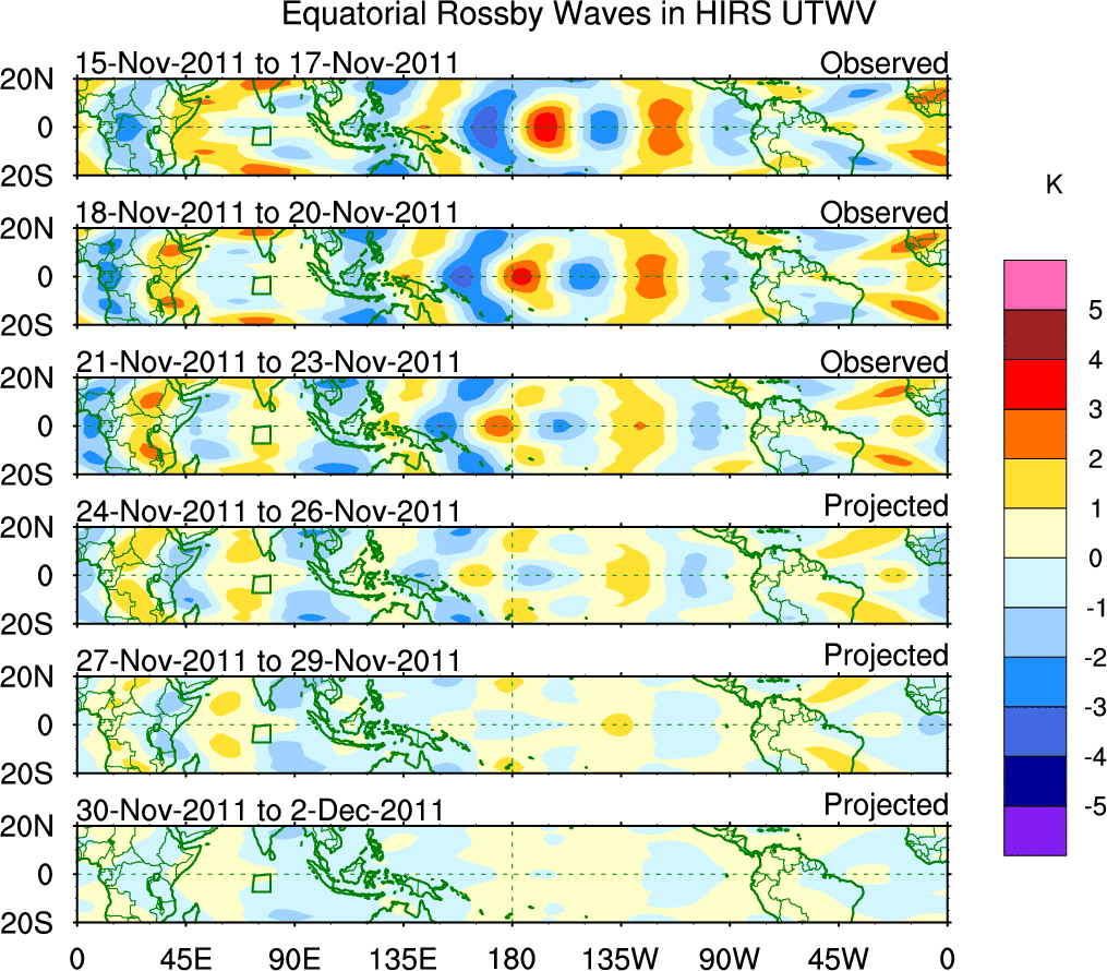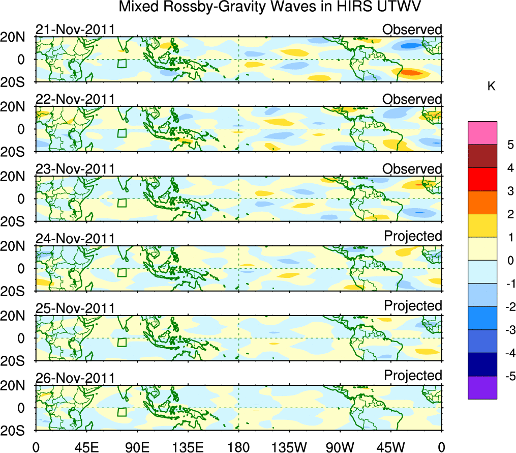 To identify tropical waves in near real-time, the OLR and UTWV data are filtered following Wheeler & Weickmann (2001 MWR). The daily anomalies are calculated using the first 3 harmonics of the seasonal cycle for 1979–2009. Missing values are then filled using linear interpolation in space and time. The most recent 365 days of anomalies are padded with 659 days of zeroes, and the result is filtered for each wave type.