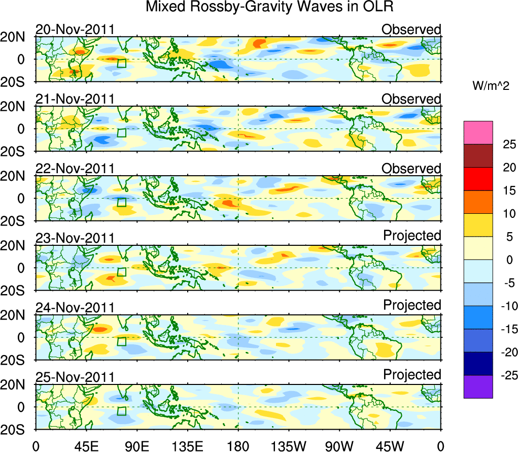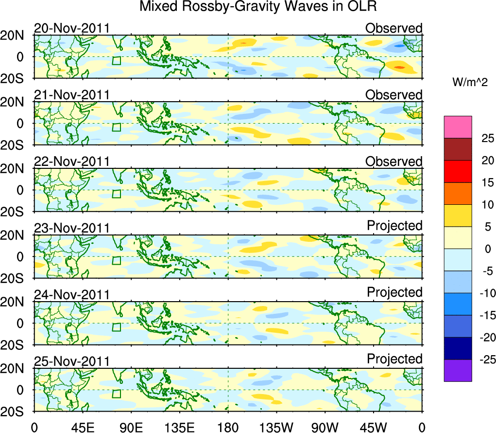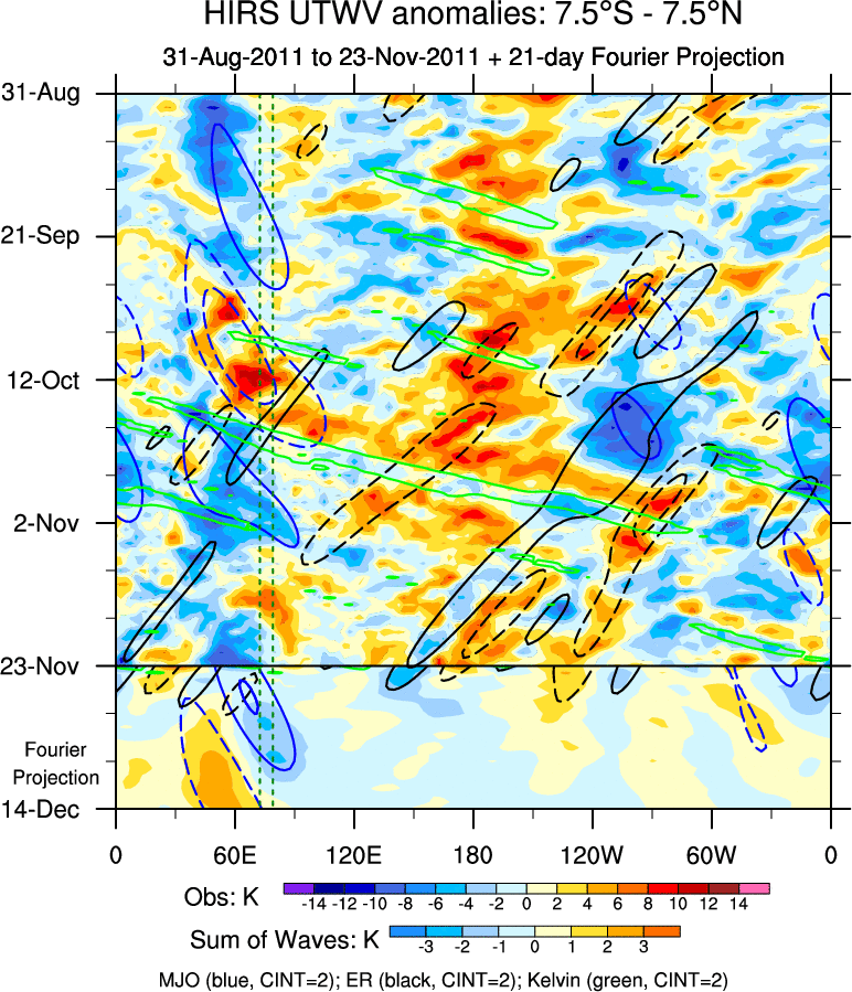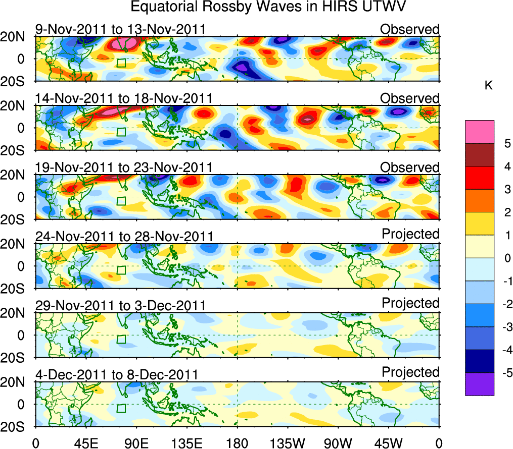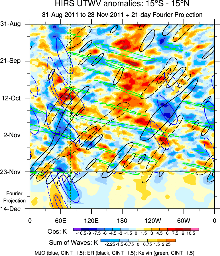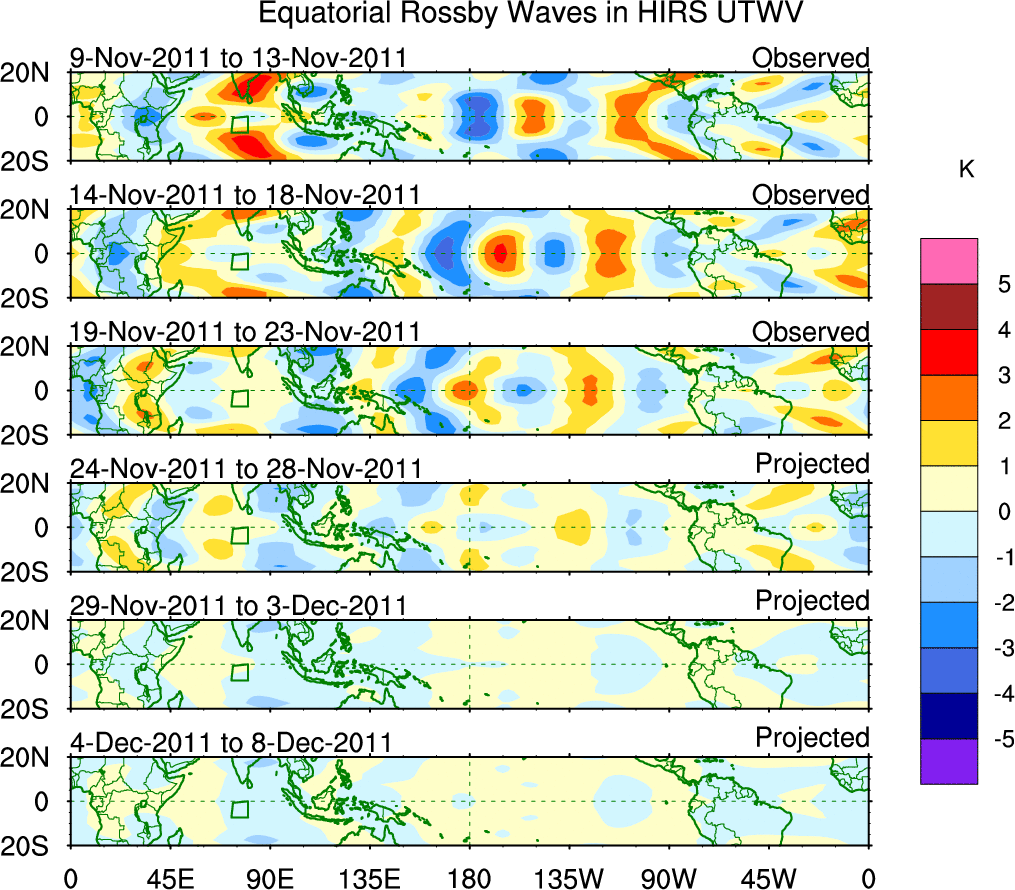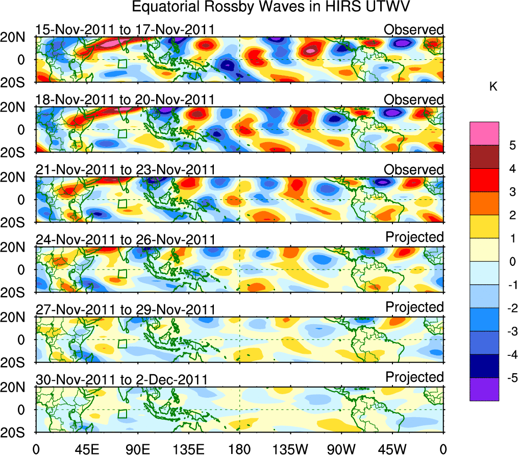To identify tropical waves in near real-time, the OLR and UTWV data are filtered following Wheeler & Weickmann (2001 MWR). The daily anomalies are calculated using the first 3 harmonics of the seasonal cycle for 1979–2009. Missing values are then filled using linear interpolation in space and time. The most recent 365 days of anomalies are padded with 659 days of zeroes, and the result is filtered for each wave type.