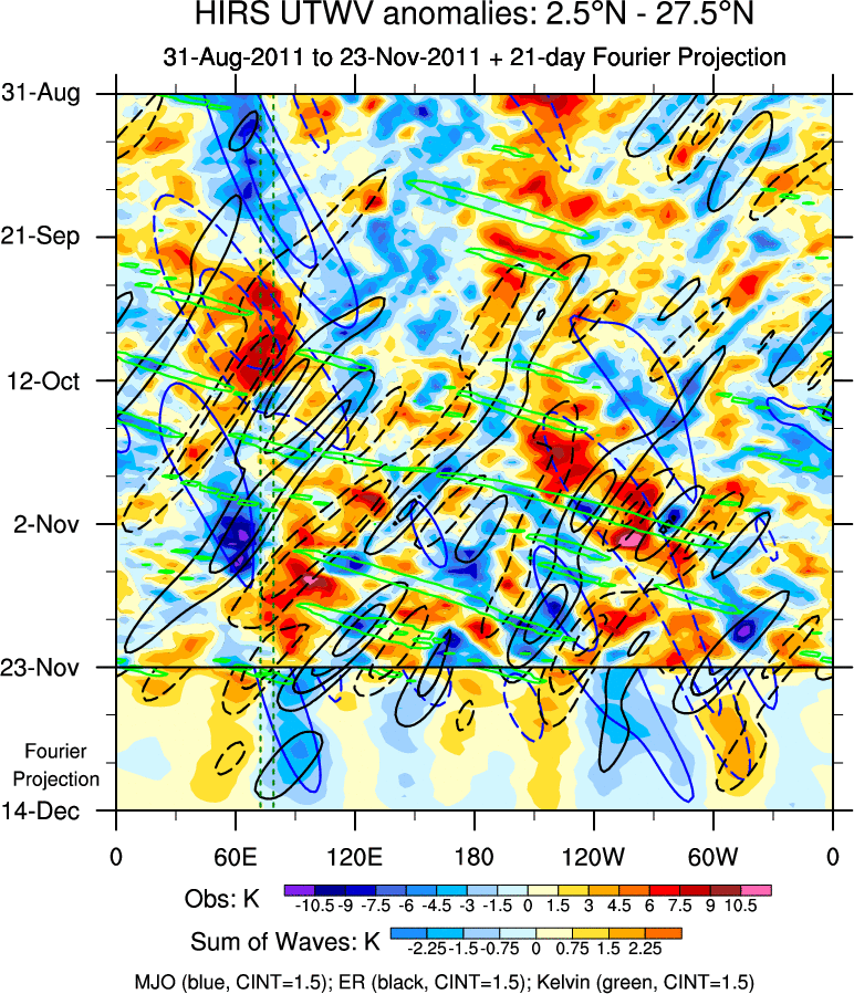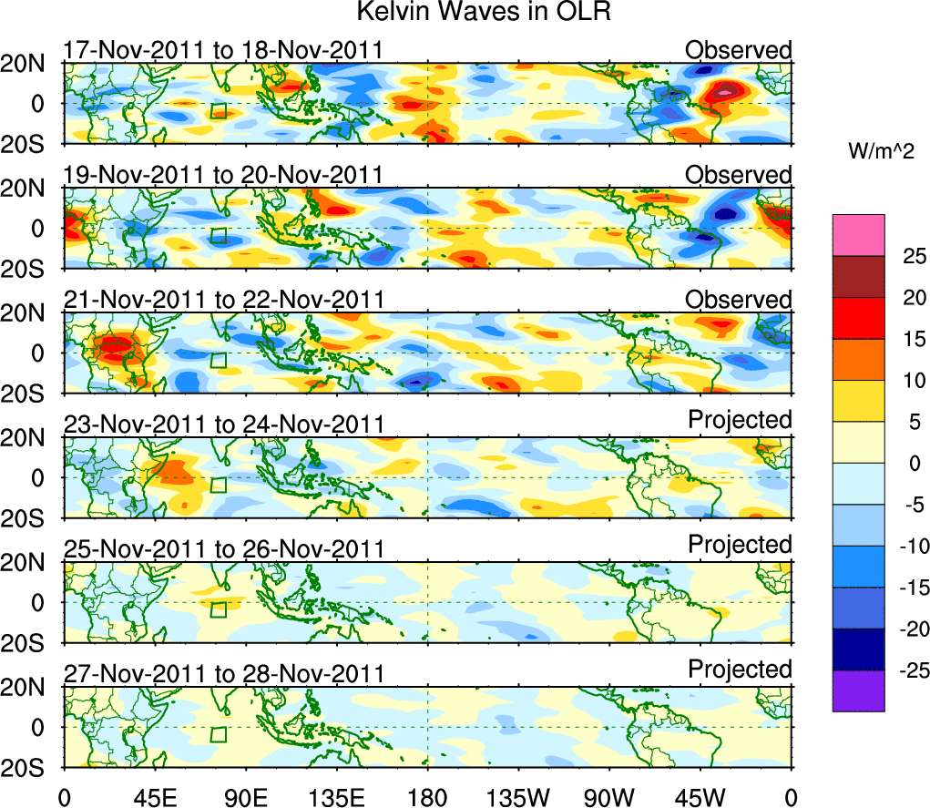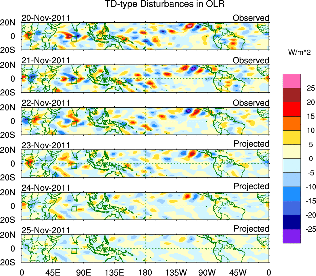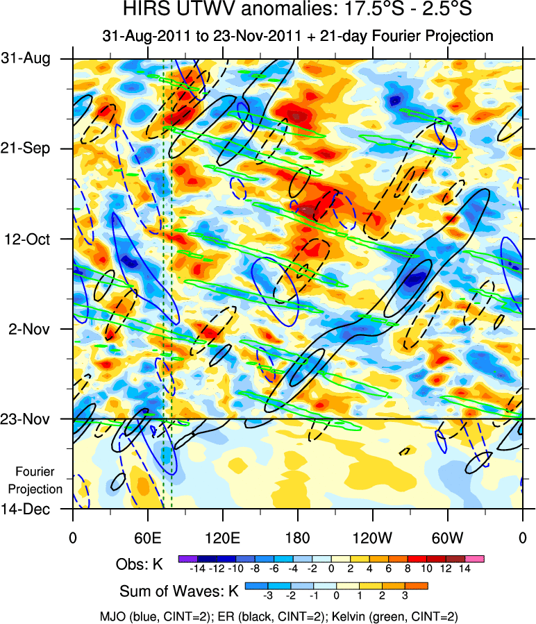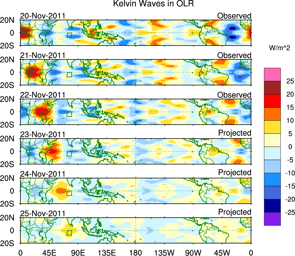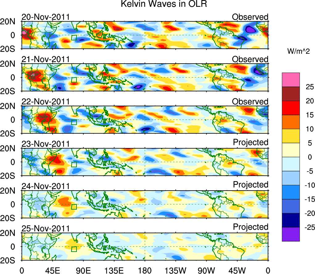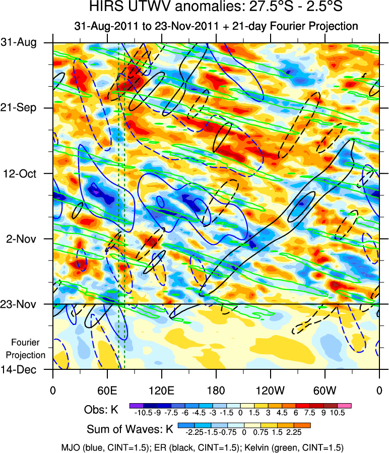 To identify tropical waves in near real-time, the OLR and UTWV data are filtered following Wheeler & Weickmann (2001 MWR). The daily anomalies are calculated using the first 3 harmonics of the seasonal cycle for 1979–2009. Missing values are then filled using linear interpolation in space and time. The most recent 365 days of anomalies are padded with 659 days of zeroes, and the result is filtered for each wave type.