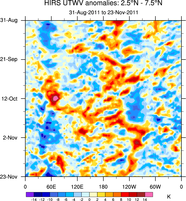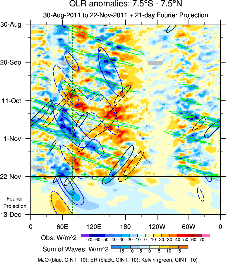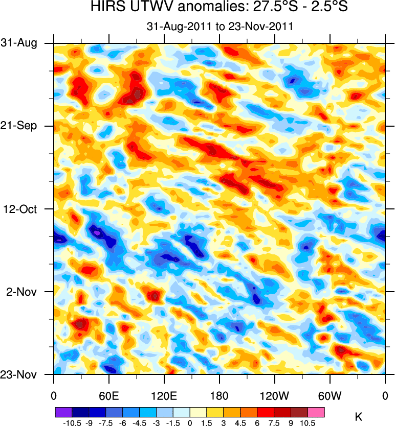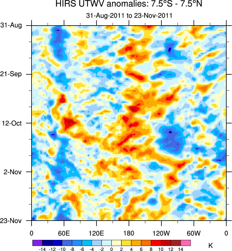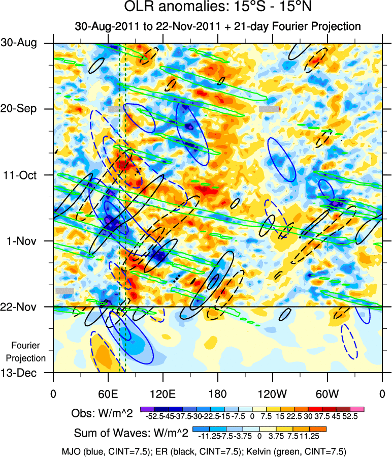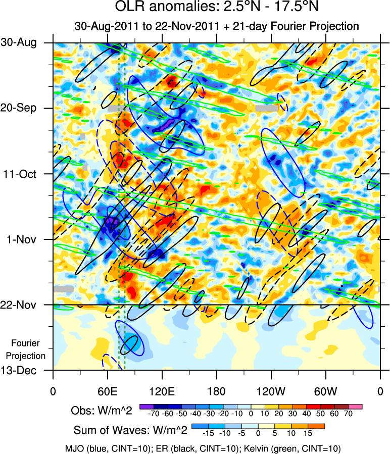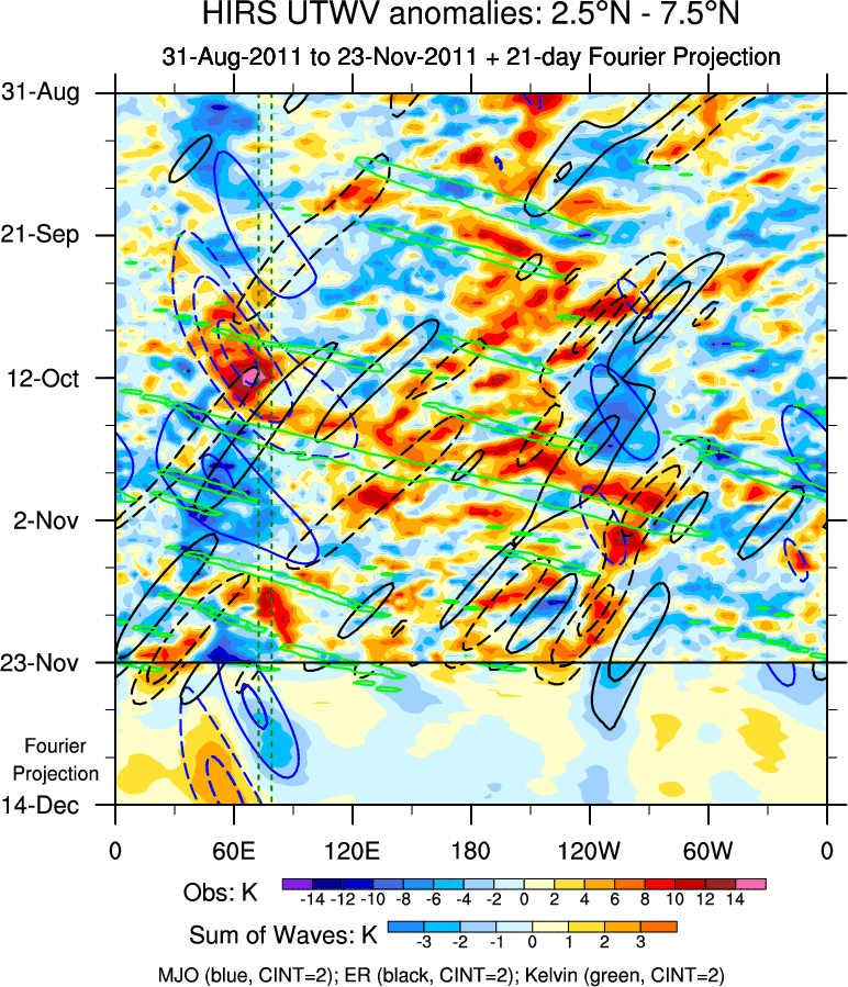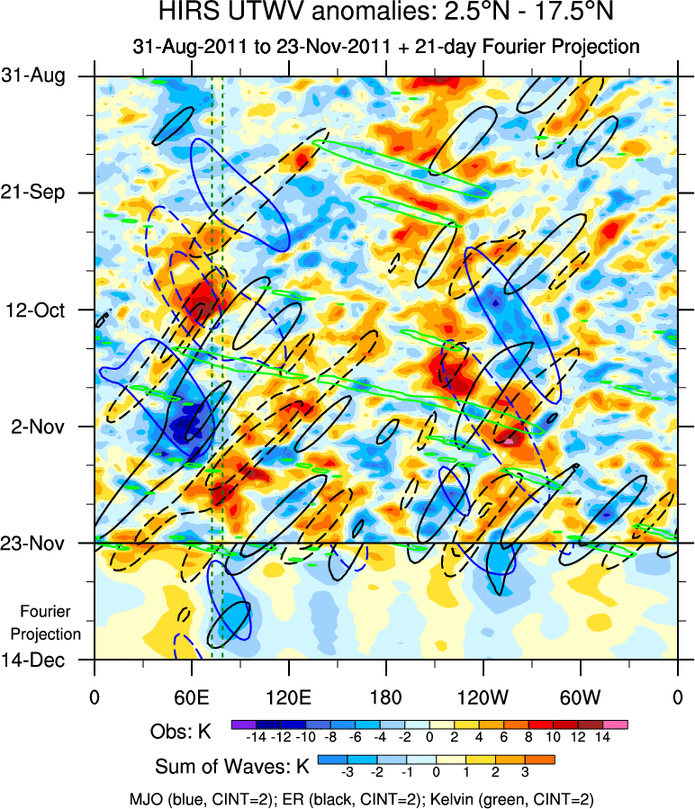 To identify tropical waves in near real-time, the OLR and UTWV data are filtered following Wheeler & Weickmann (2001 MWR). The daily anomalies are calculated using the first 3 harmonics of the seasonal cycle for 1979–2009. Missing values are then filled using linear interpolation in space and time. The most recent 365 days of anomalies are padded with 659 days of zeroes, and the result is filtered for each wave type.
