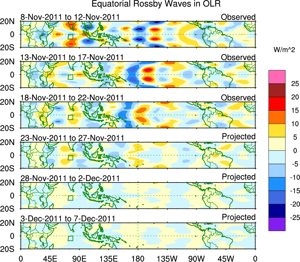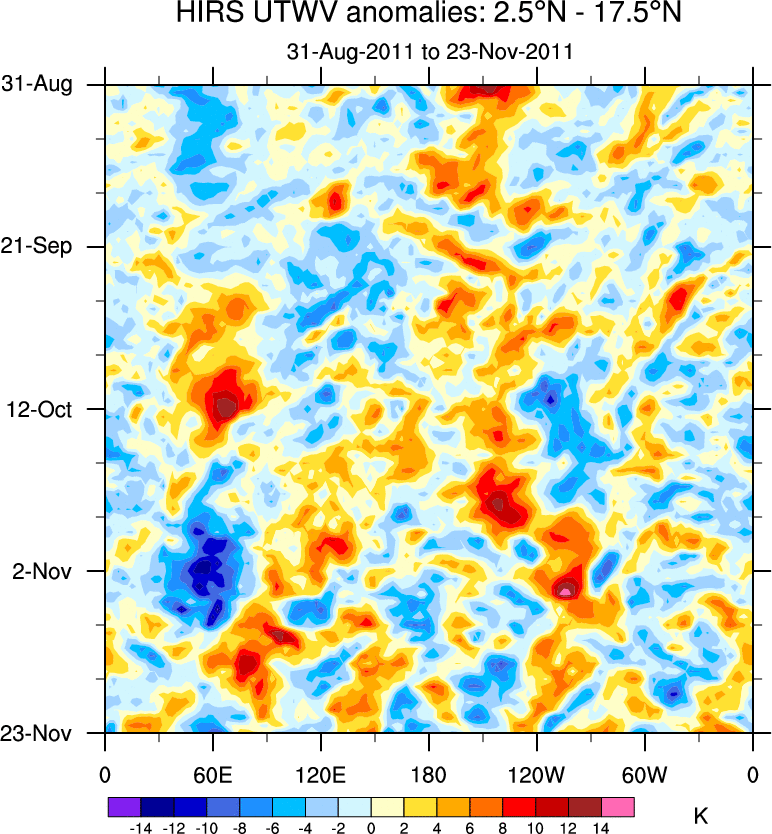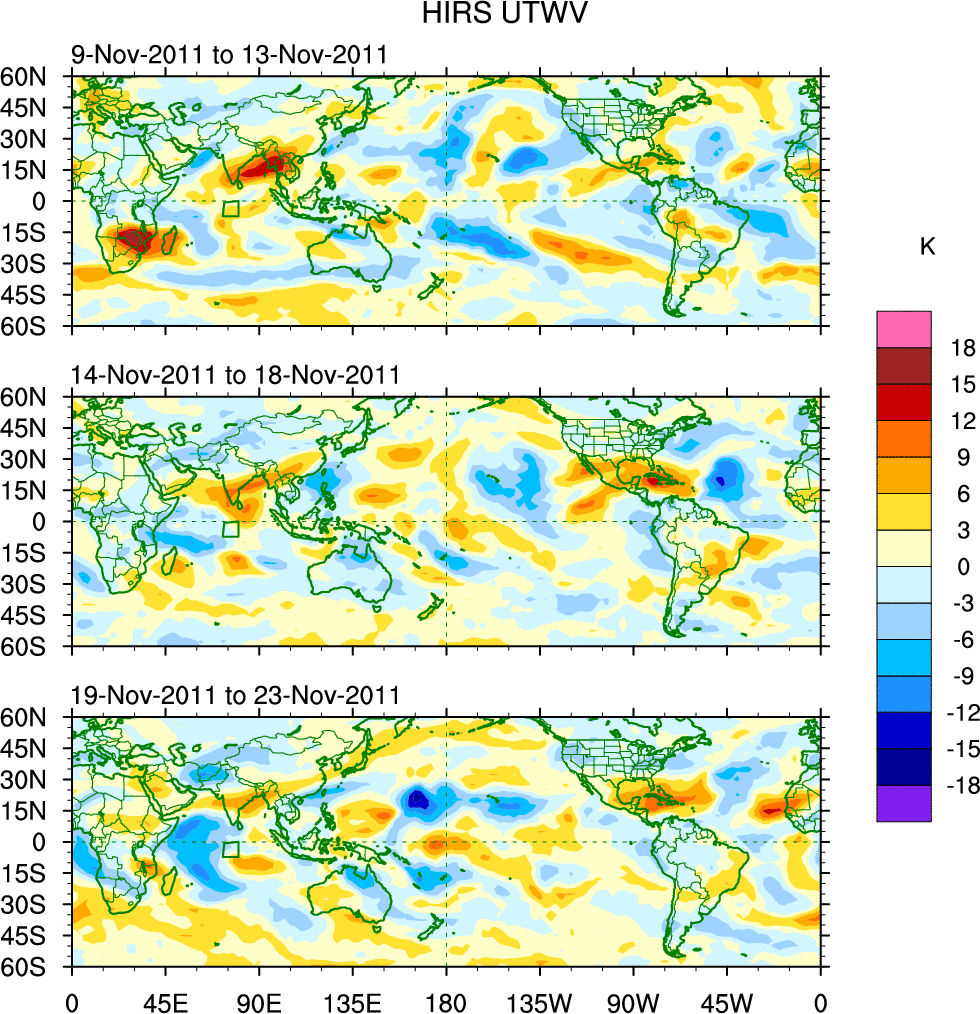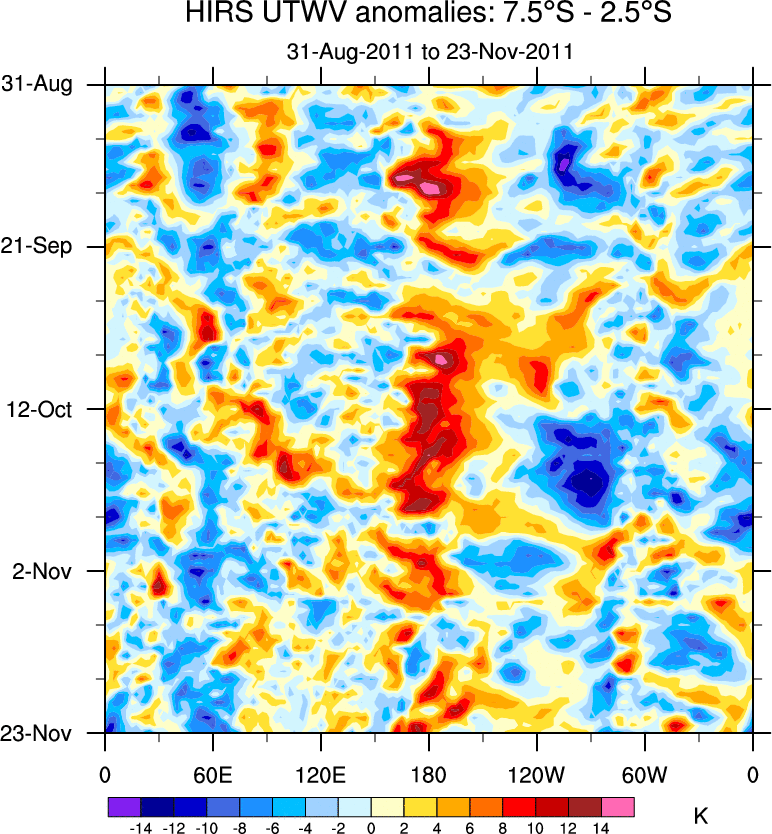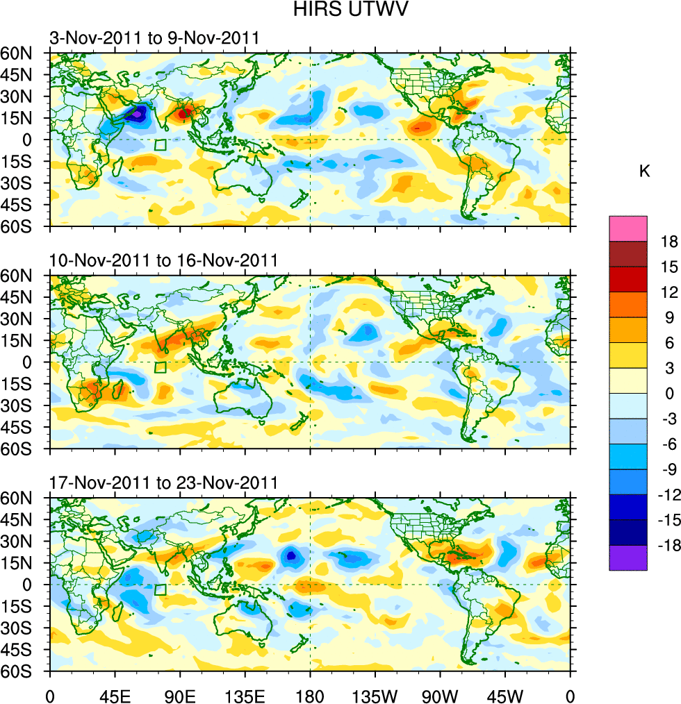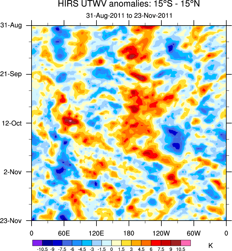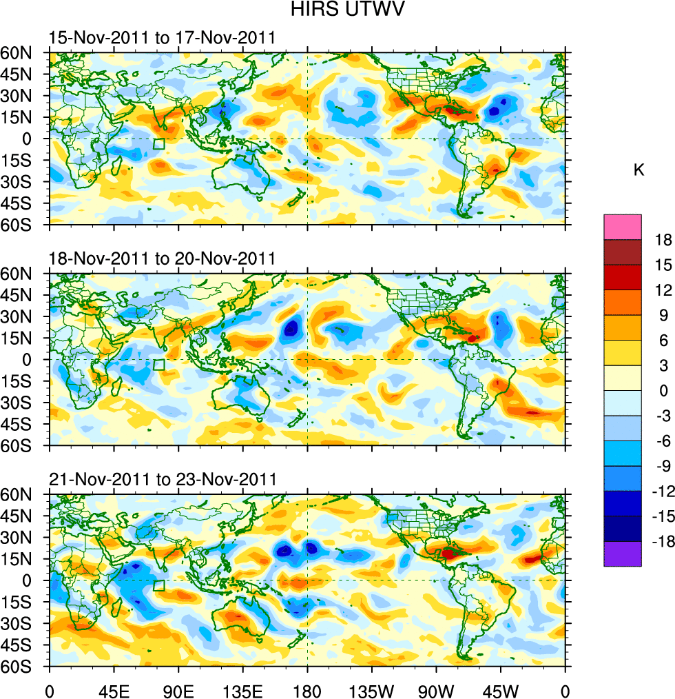 To identify tropical waves in near real-time, the OLR and UTWV data are filtered following Wheeler & Weickmann (2001 MWR). The daily anomalies are calculated using the first 3 harmonics of the seasonal cycle for 1979–2009. Missing values are then filled using linear interpolation in space and time. The most recent 365 days of anomalies are padded with 659 days of zeroes, and the result is filtered for each wave type.