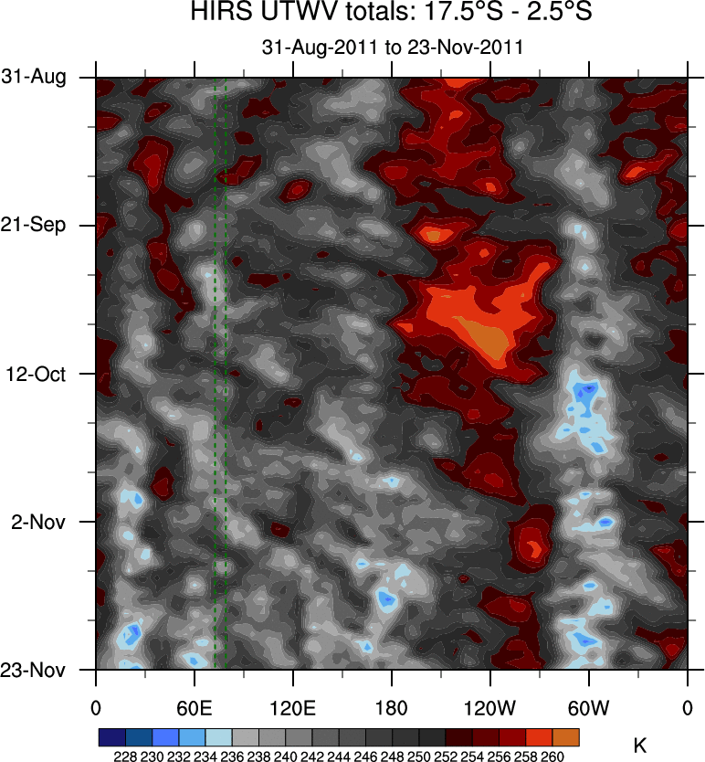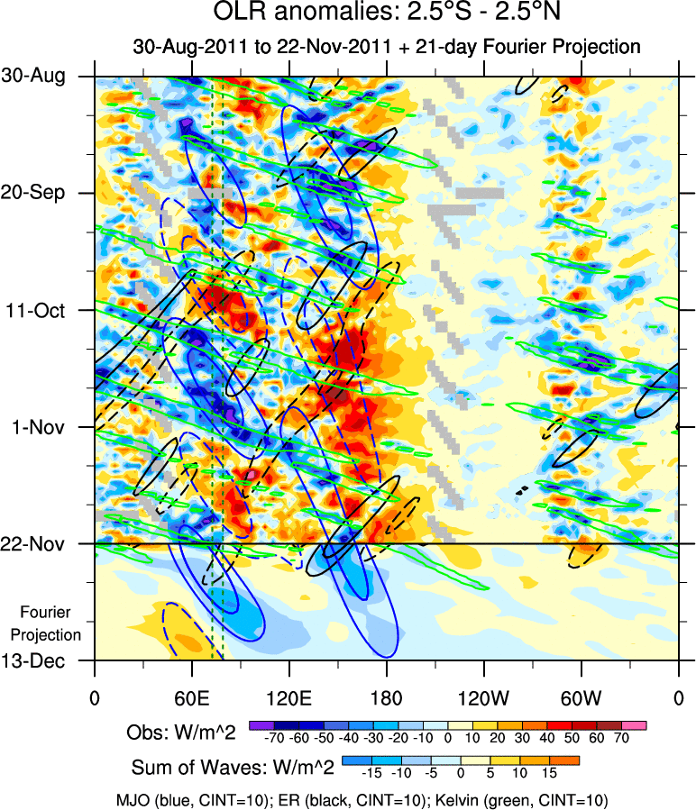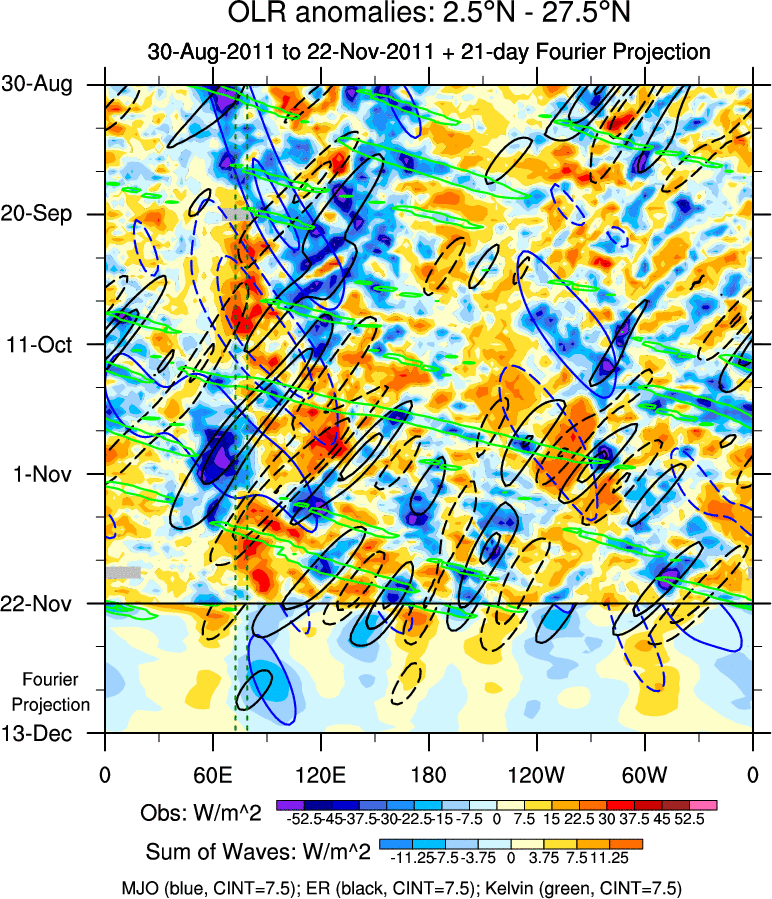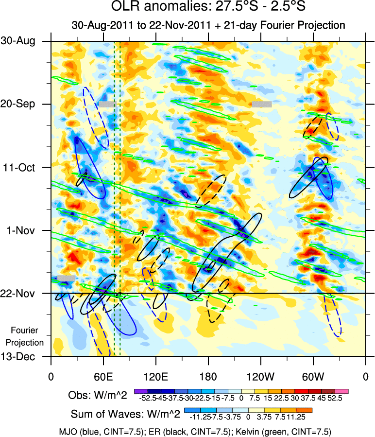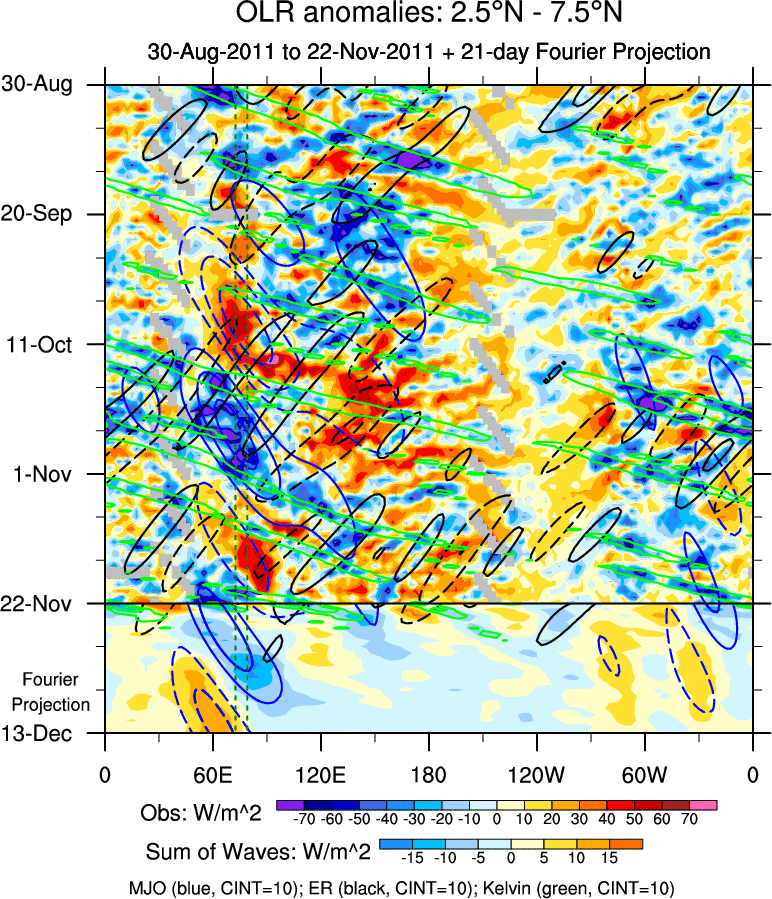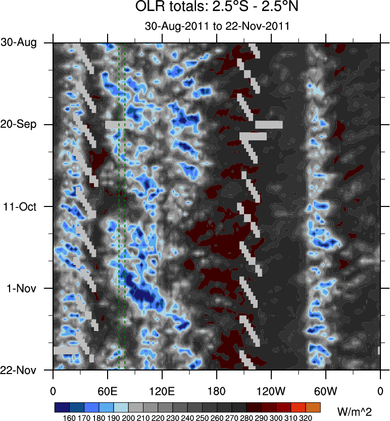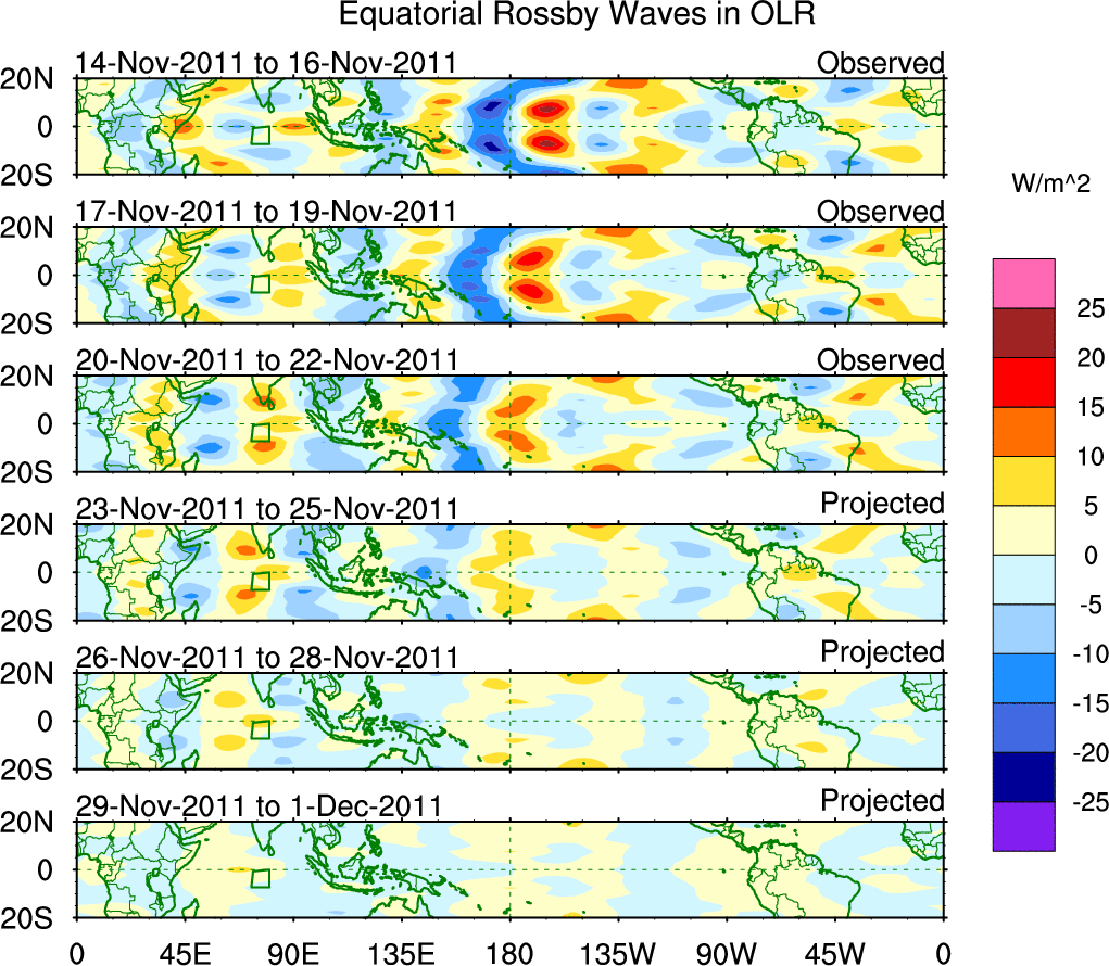 To identify tropical waves in near real-time, the OLR and UTWV data are filtered following Wheeler & Weickmann (2001 MWR). The daily anomalies are calculated using the first 3 harmonics of the seasonal cycle for 1979–2009. Missing values are then filled using linear interpolation in space and time. The most recent 365 days of anomalies are padded with 659 days of zeroes, and the result is filtered for each wave type.