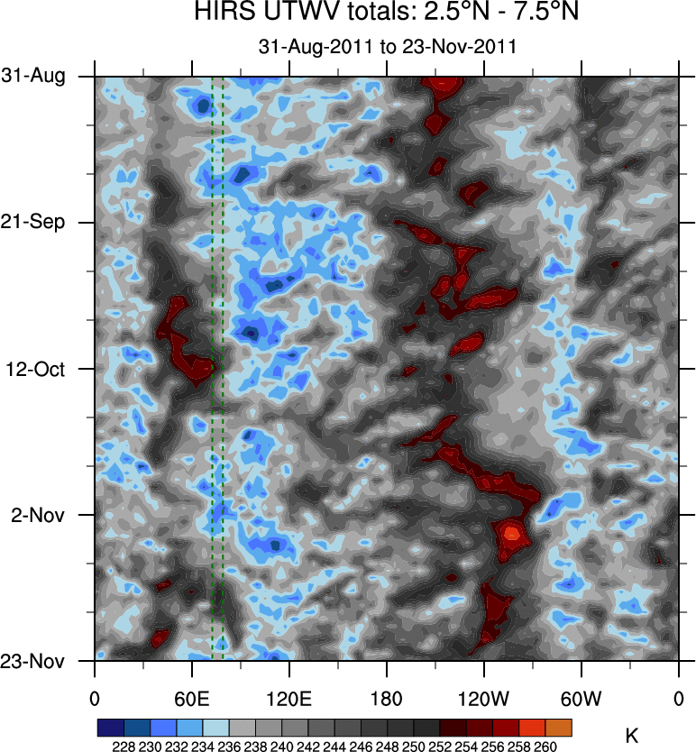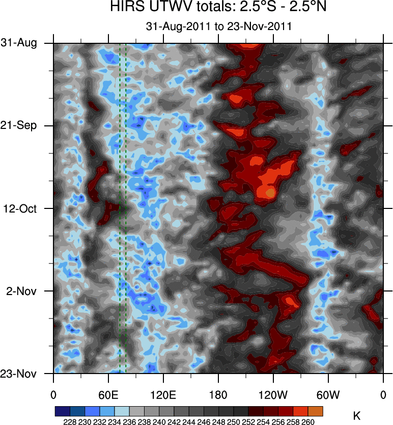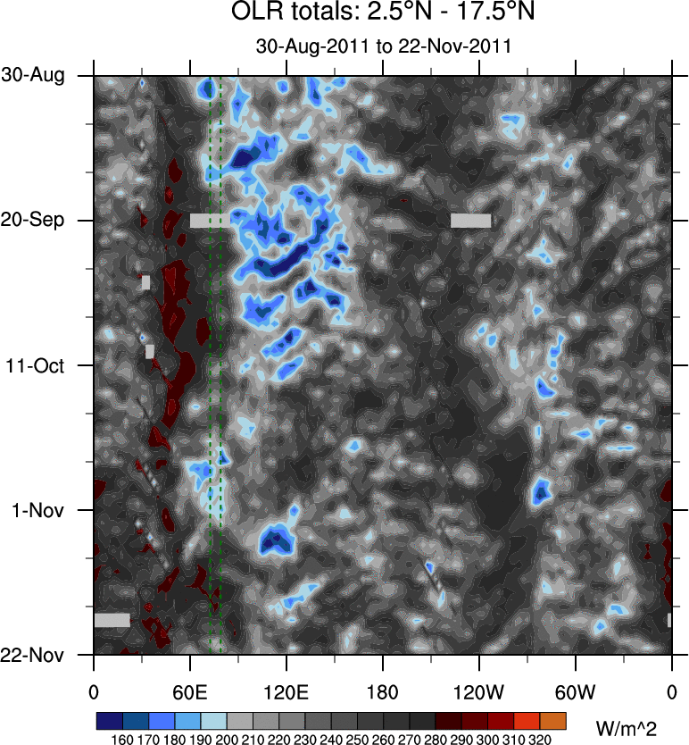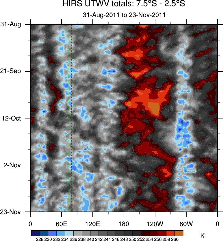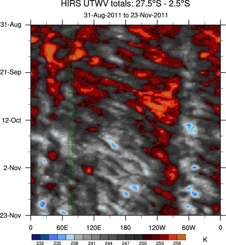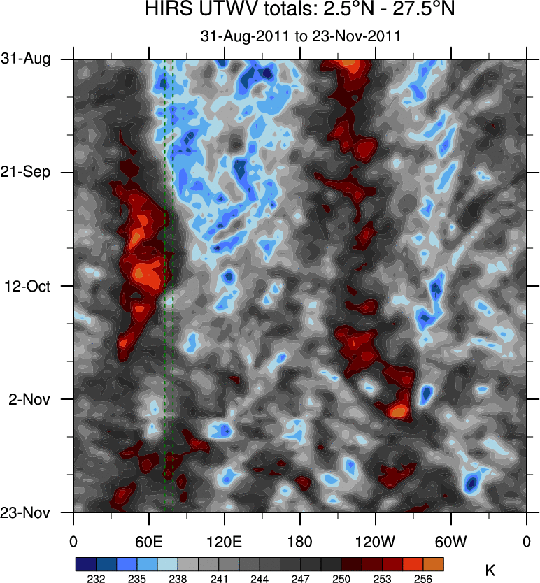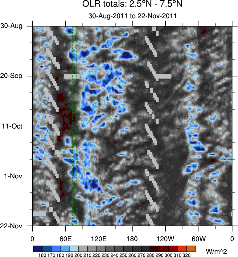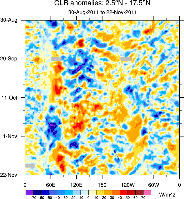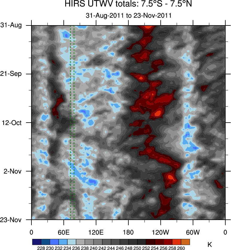 To identify tropical waves in near real-time, the OLR and UTWV data are filtered following Wheeler & Weickmann (2001 MWR). The daily anomalies are calculated using the first 3 harmonics of the seasonal cycle for 1979–2009. Missing values are then filled using linear interpolation in space and time. The most recent 365 days of anomalies are padded with 659 days of zeroes, and the result is filtered for each wave type.