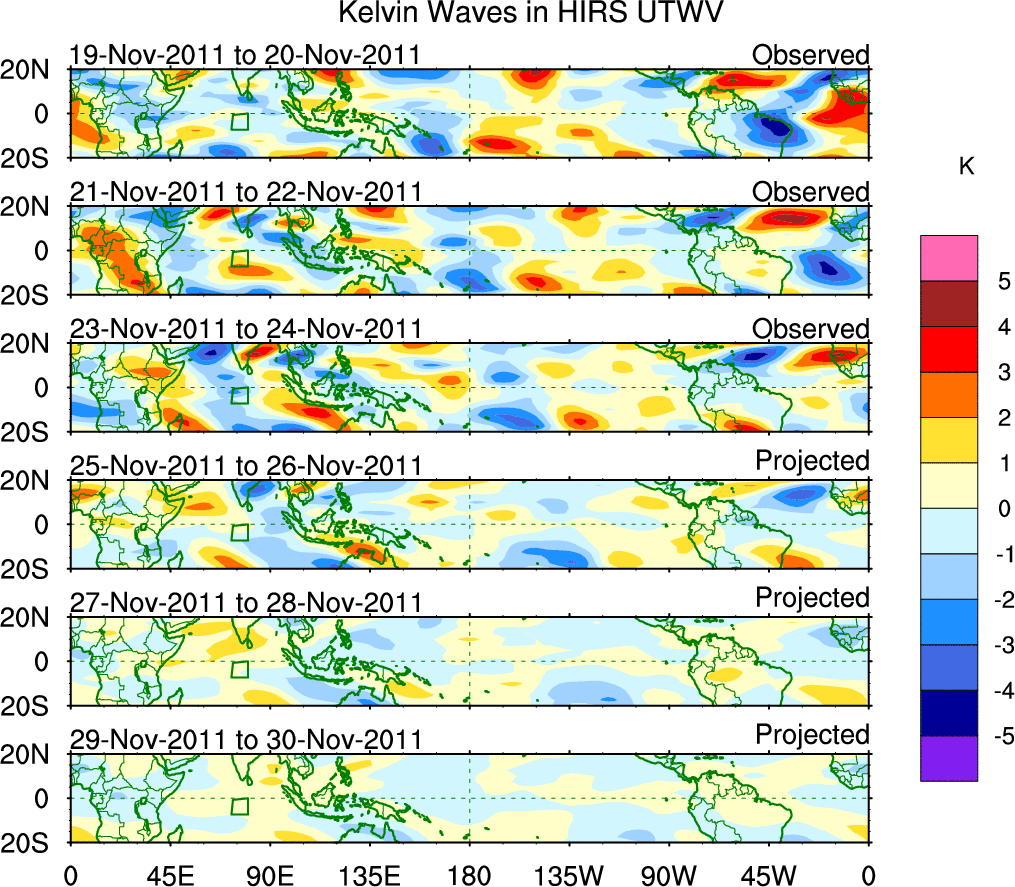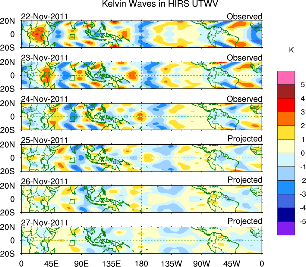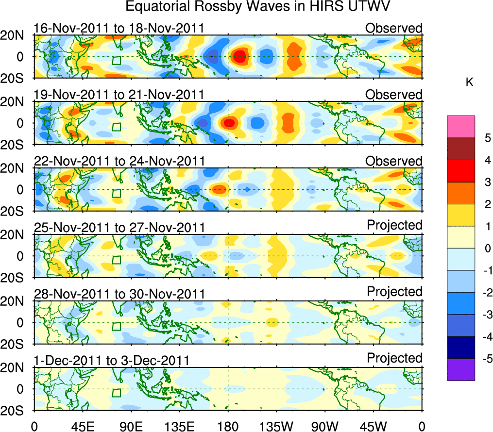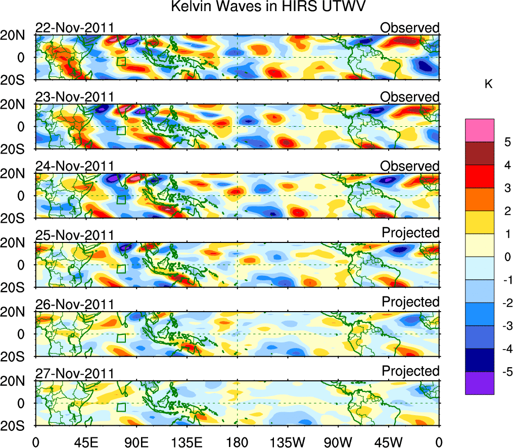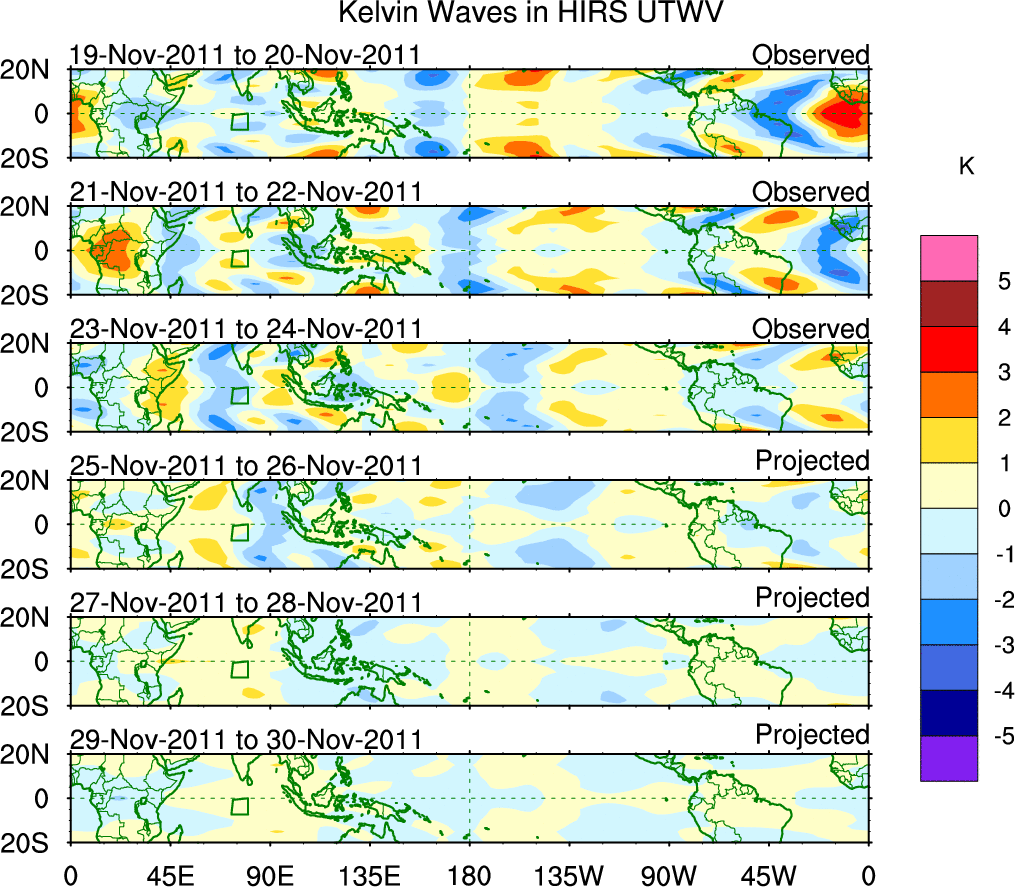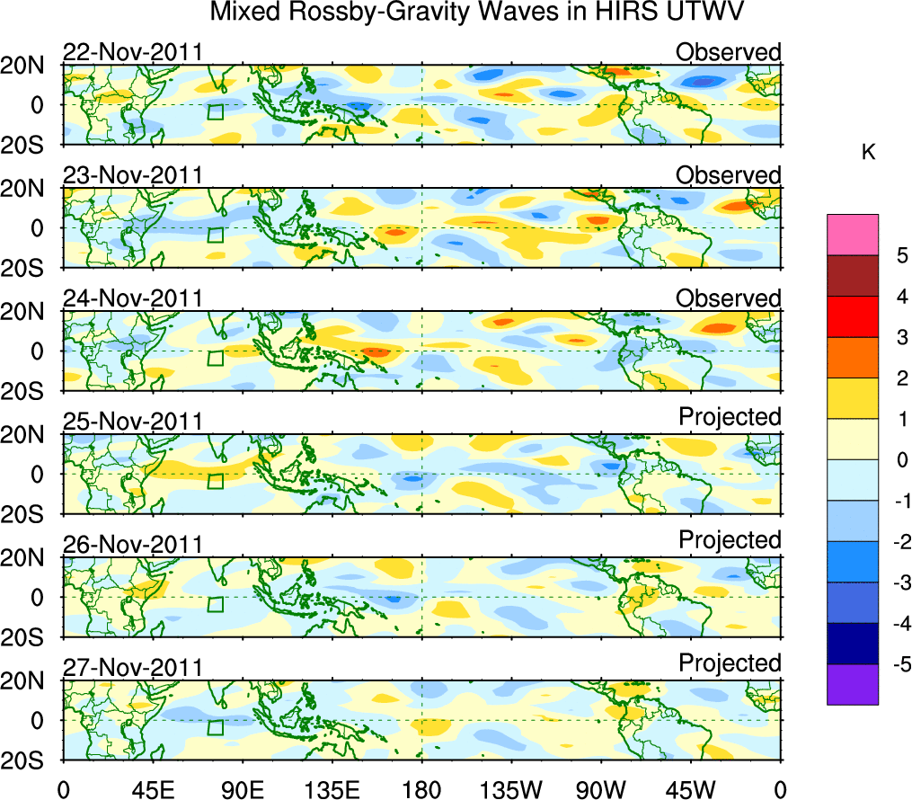 To identify tropical waves in near real-time, the OLR and UTWV data are filtered following Wheeler & Weickmann (2001 MWR). The daily anomalies are calculated using the first 3 harmonics of the seasonal cycle for 1979–2009. Missing values are then filled using linear interpolation in space and time. The most recent 365 days of anomalies are padded with 659 days of zeroes, and the result is filtered for each wave type.