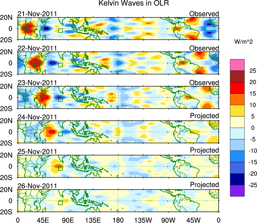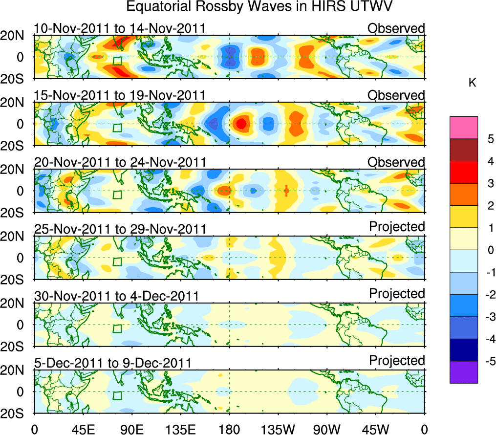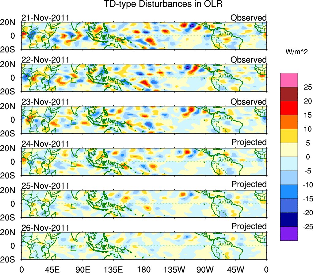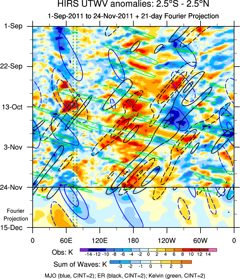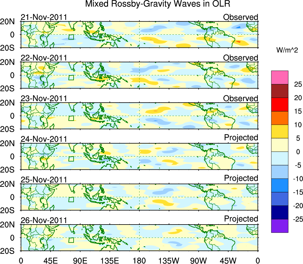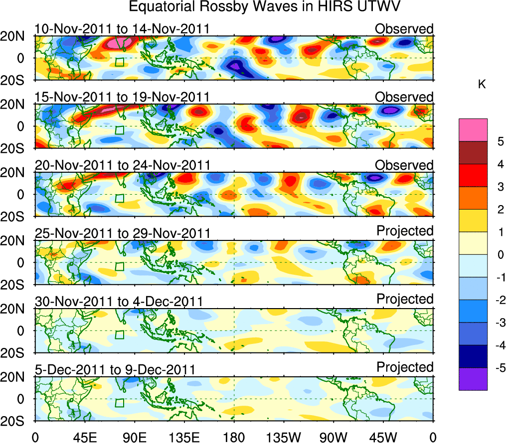 To identify tropical waves in near real-time, the OLR and UTWV data are filtered following Wheeler & Weickmann (2001 MWR). The daily anomalies are calculated using the first 3 harmonics of the seasonal cycle for 1979–2009. Missing values are then filled using linear interpolation in space and time. The most recent 365 days of anomalies are padded with 659 days of zeroes, and the result is filtered for each wave type.