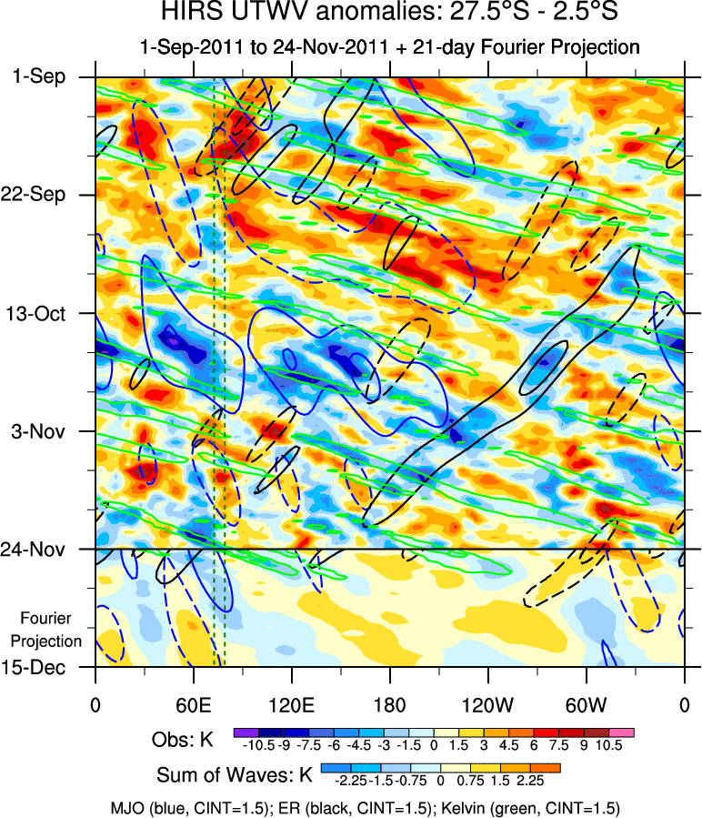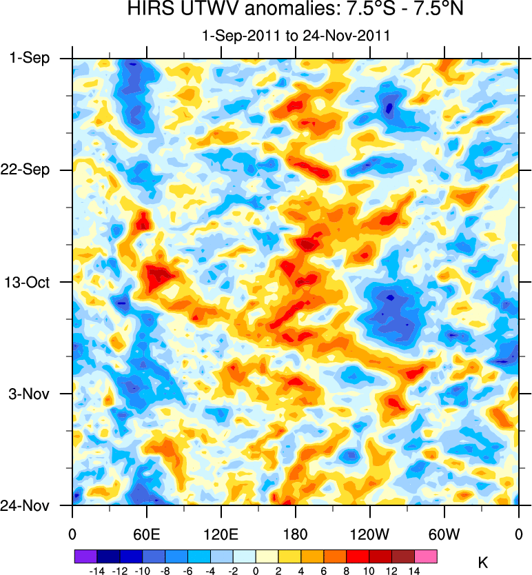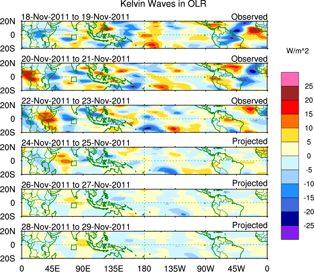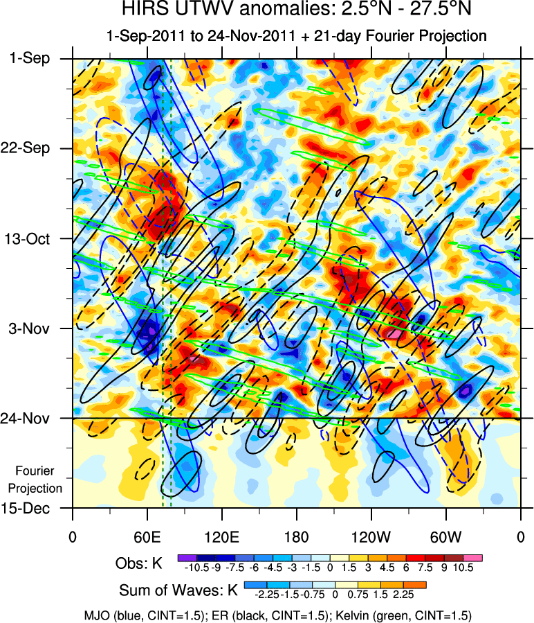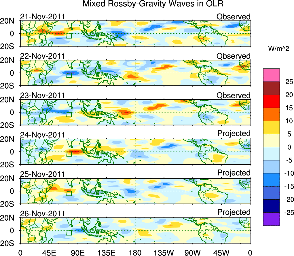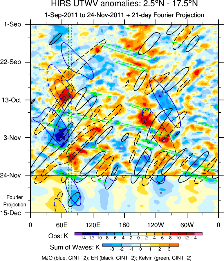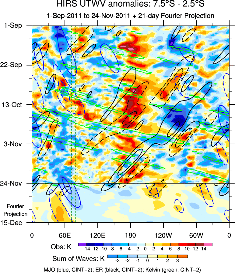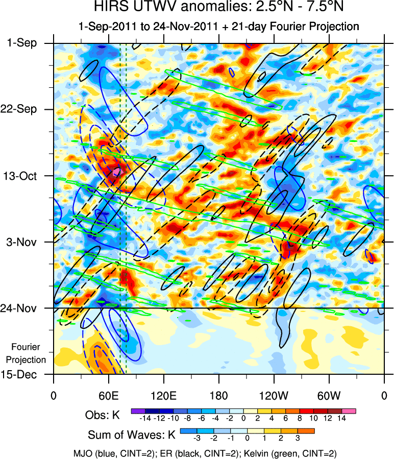 To identify tropical waves in near real-time, the OLR and UTWV data are filtered following Wheeler & Weickmann (2001 MWR). The daily anomalies are calculated using the first 3 harmonics of the seasonal cycle for 1979–2009. Missing values are then filled using linear interpolation in space and time. The most recent 365 days of anomalies are padded with 659 days of zeroes, and the result is filtered for each wave type.