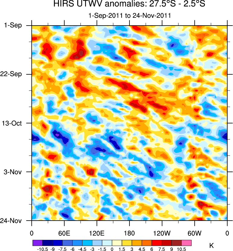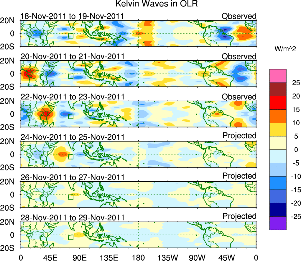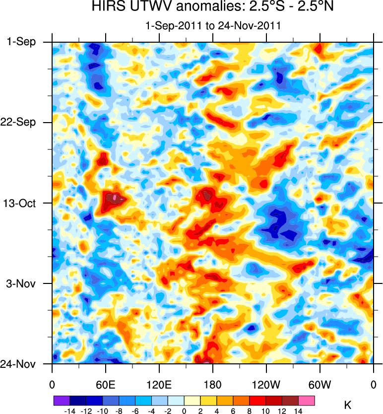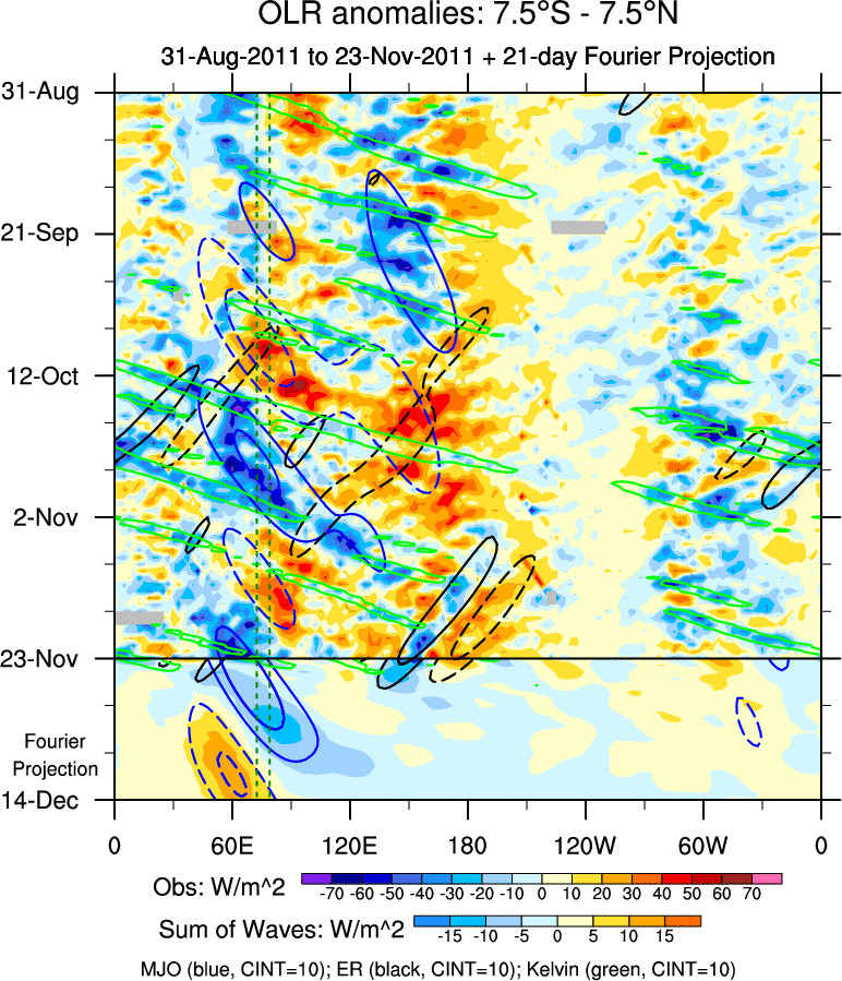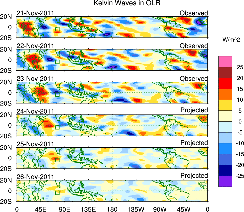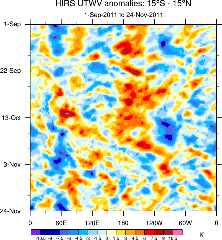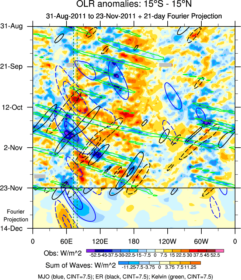To identify tropical waves in near real-time, the OLR and UTWV data are filtered following Wheeler & Weickmann (2001 MWR). The daily anomalies are calculated using the first 3 harmonics of the seasonal cycle for 1979–2009. Missing values are then filled using linear interpolation in space and time. The most recent 365 days of anomalies are padded with 659 days of zeroes, and the result is filtered for each wave type.