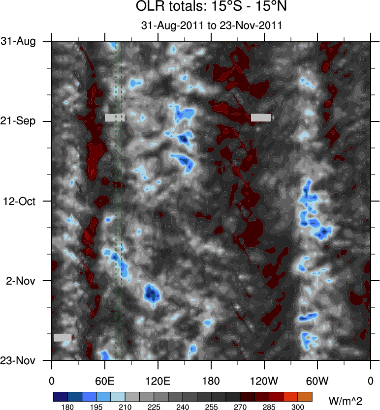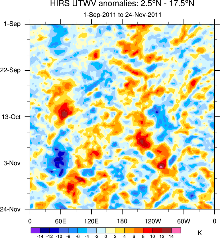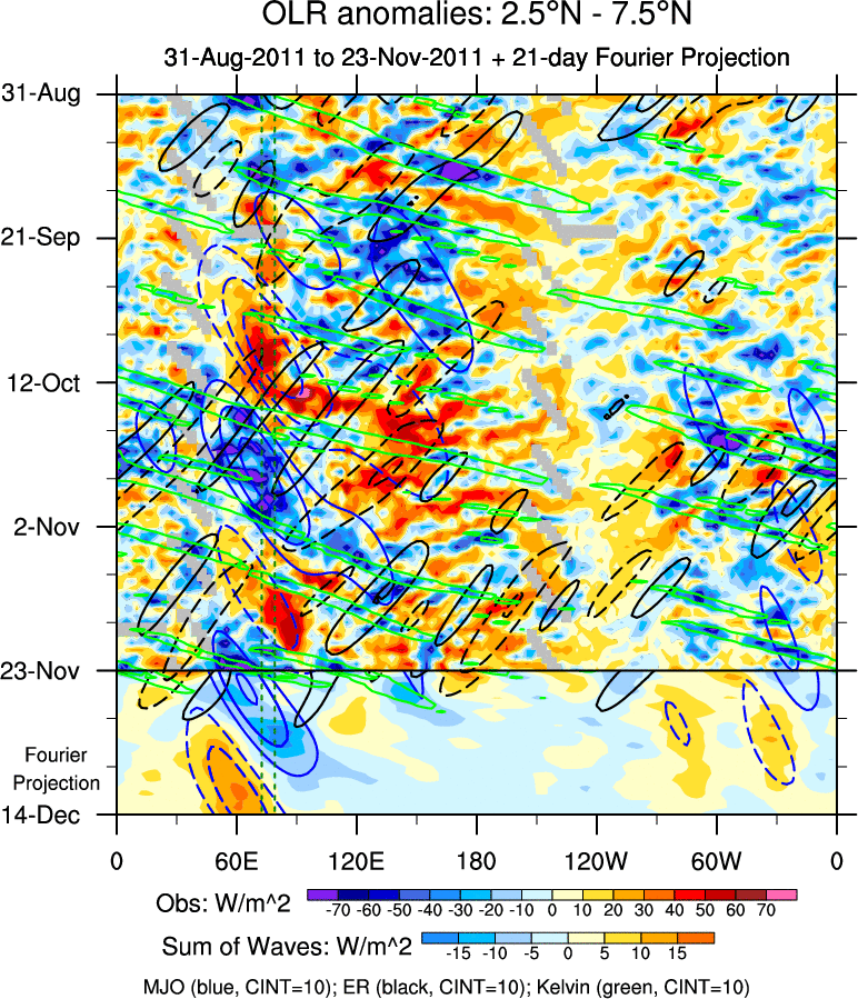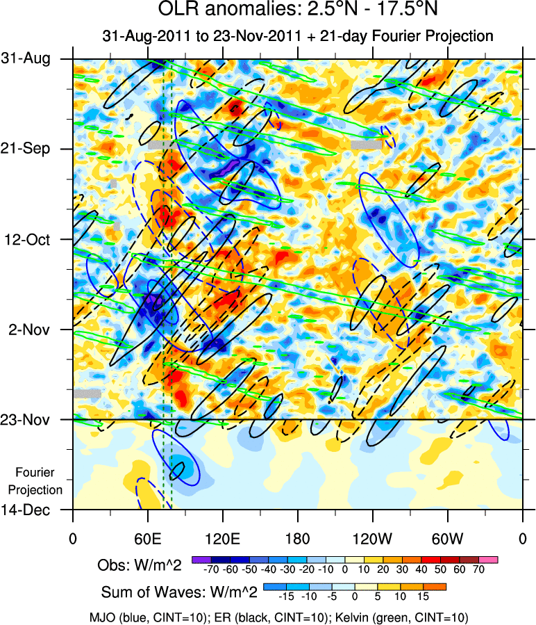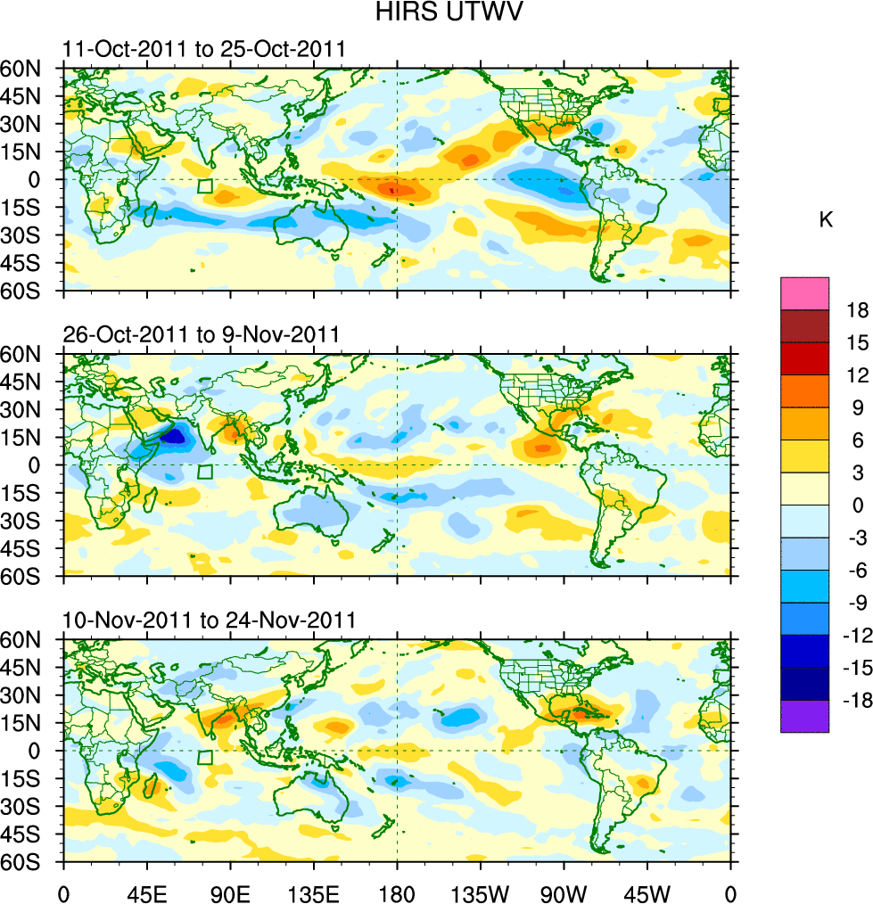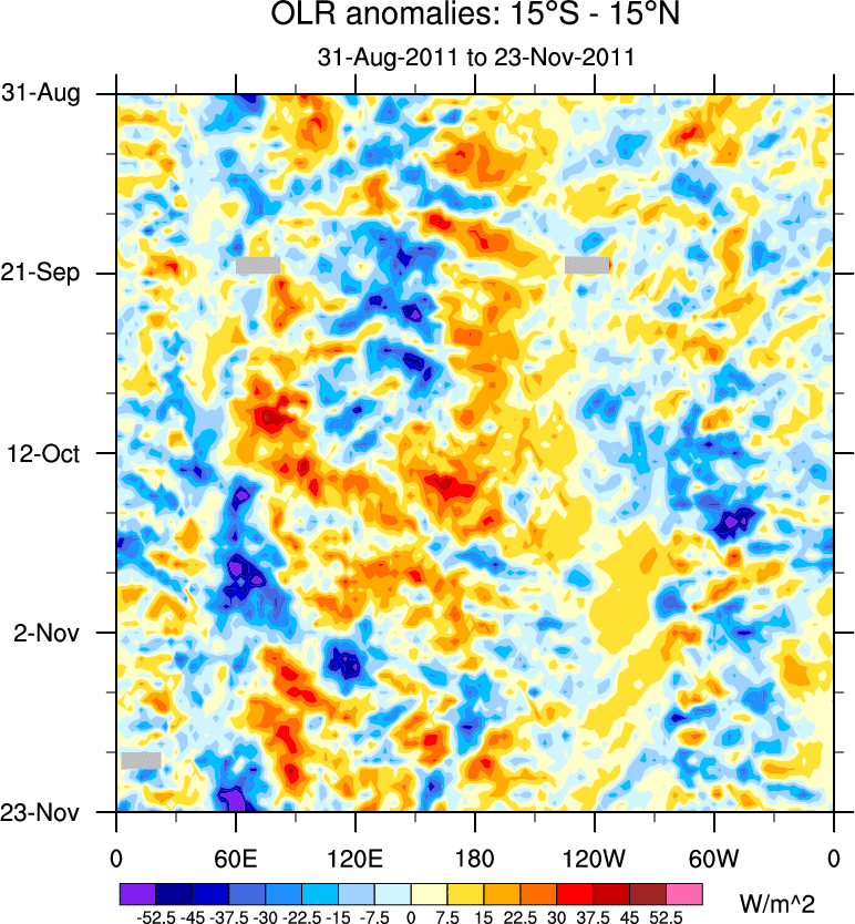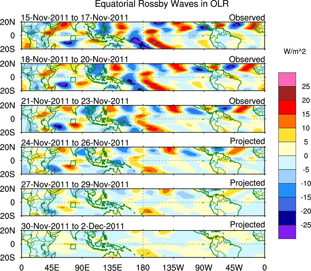 To identify tropical waves in near real-time, the OLR and UTWV data are filtered following Wheeler & Weickmann (2001 MWR). The daily anomalies are calculated using the first 3 harmonics of the seasonal cycle for 1979–2009. Missing values are then filled using linear interpolation in space and time. The most recent 365 days of anomalies are padded with 659 days of zeroes, and the result is filtered for each wave type.