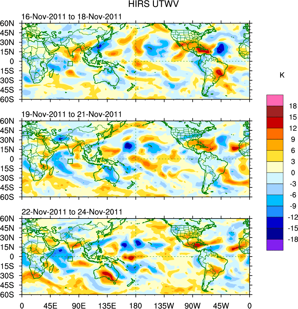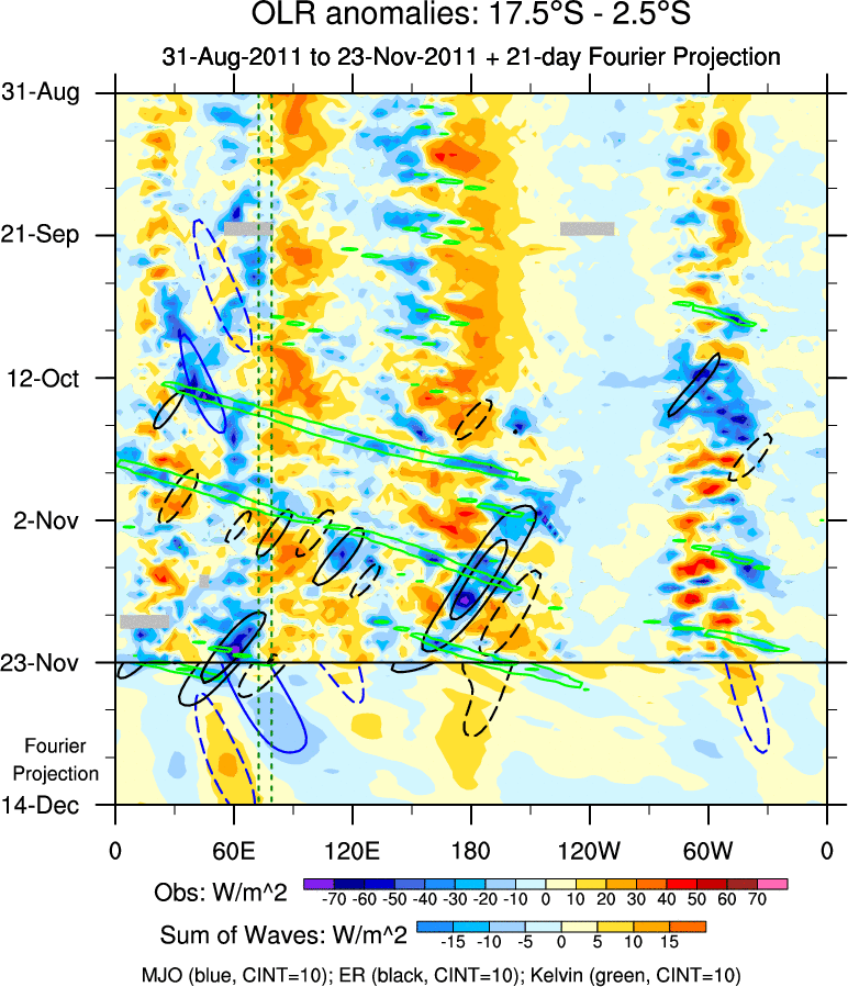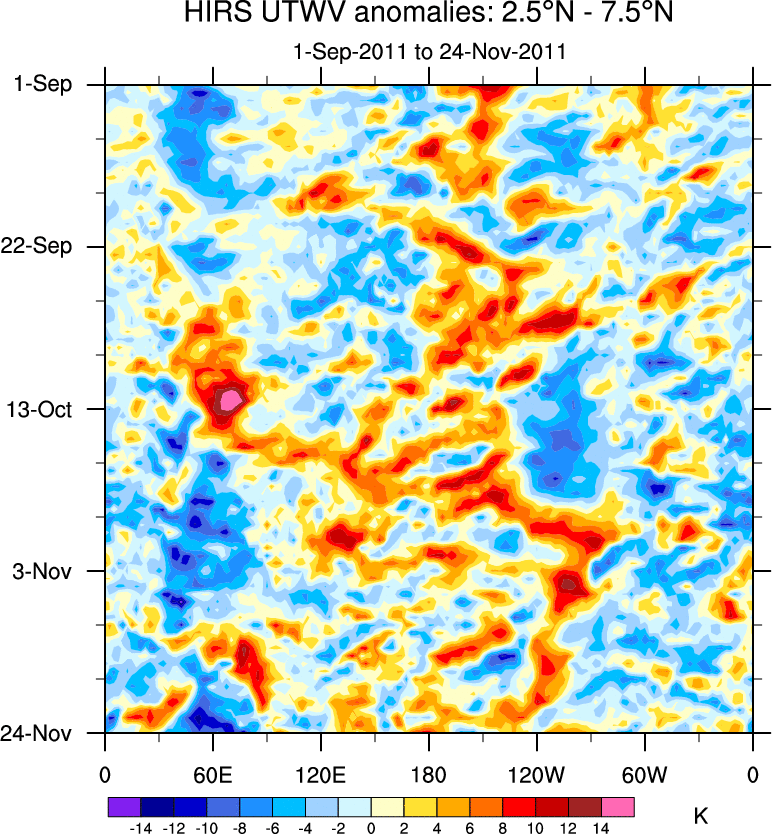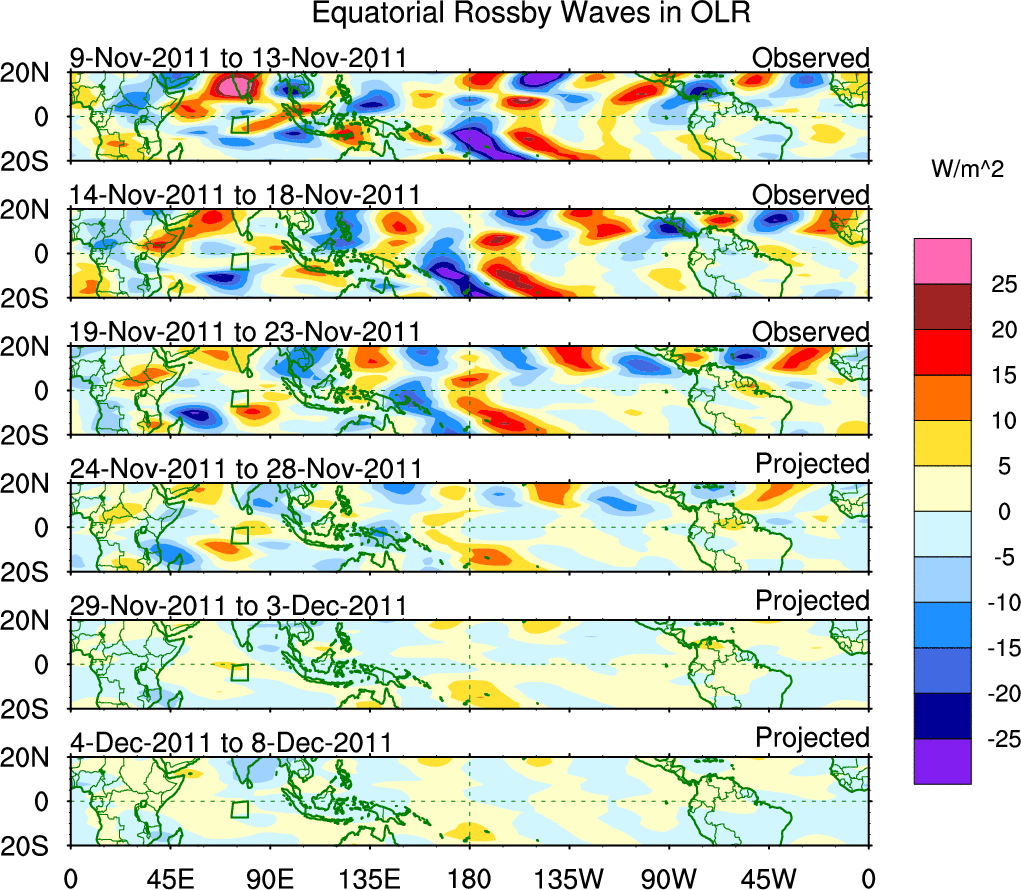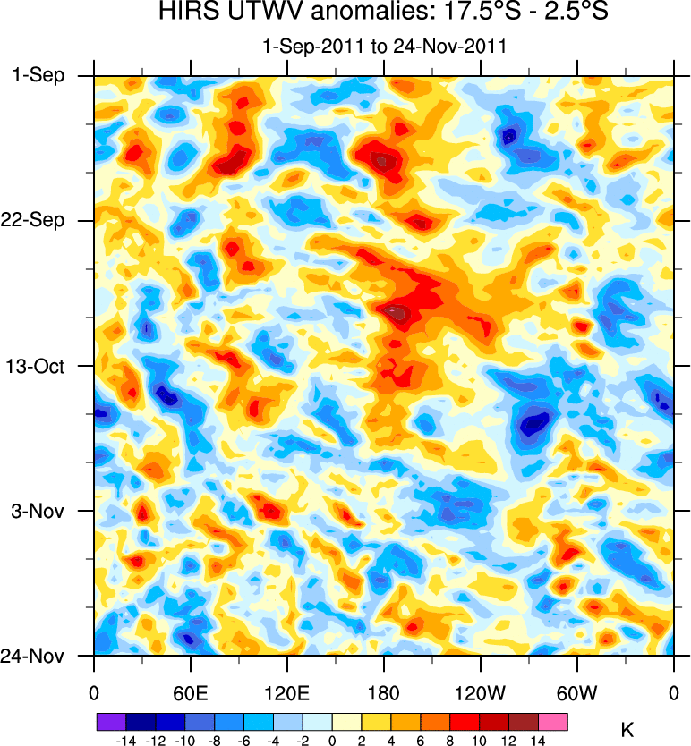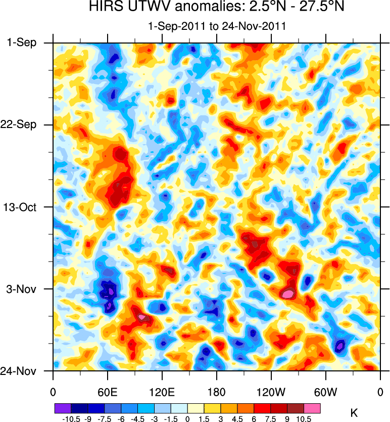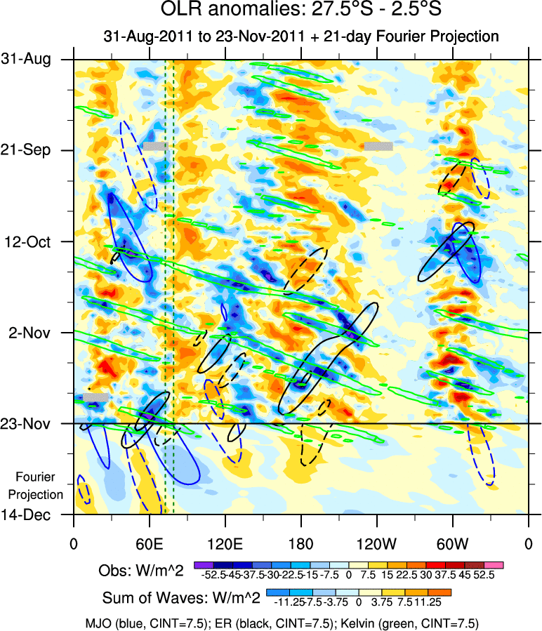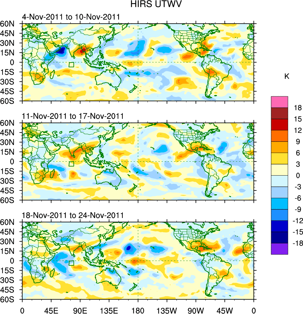 To identify tropical waves in near real-time, the OLR and UTWV data are filtered following Wheeler & Weickmann (2001 MWR). The daily anomalies are calculated using the first 3 harmonics of the seasonal cycle for 1979–2009. Missing values are then filled using linear interpolation in space and time. The most recent 365 days of anomalies are padded with 659 days of zeroes, and the result is filtered for each wave type.