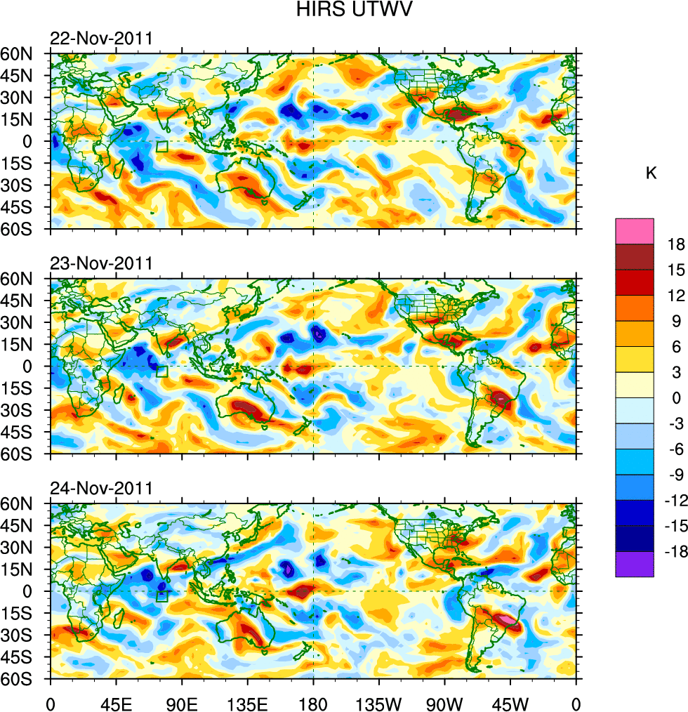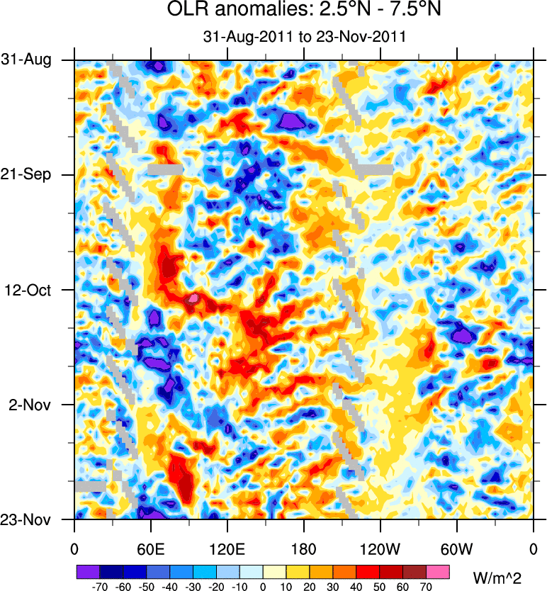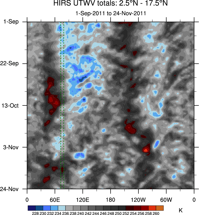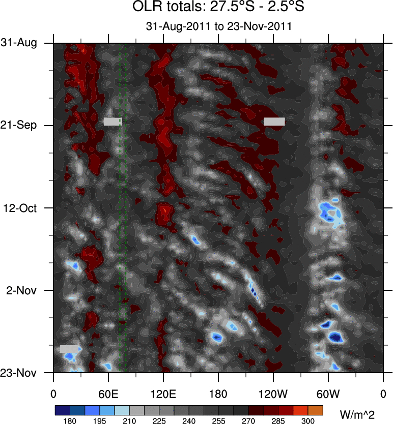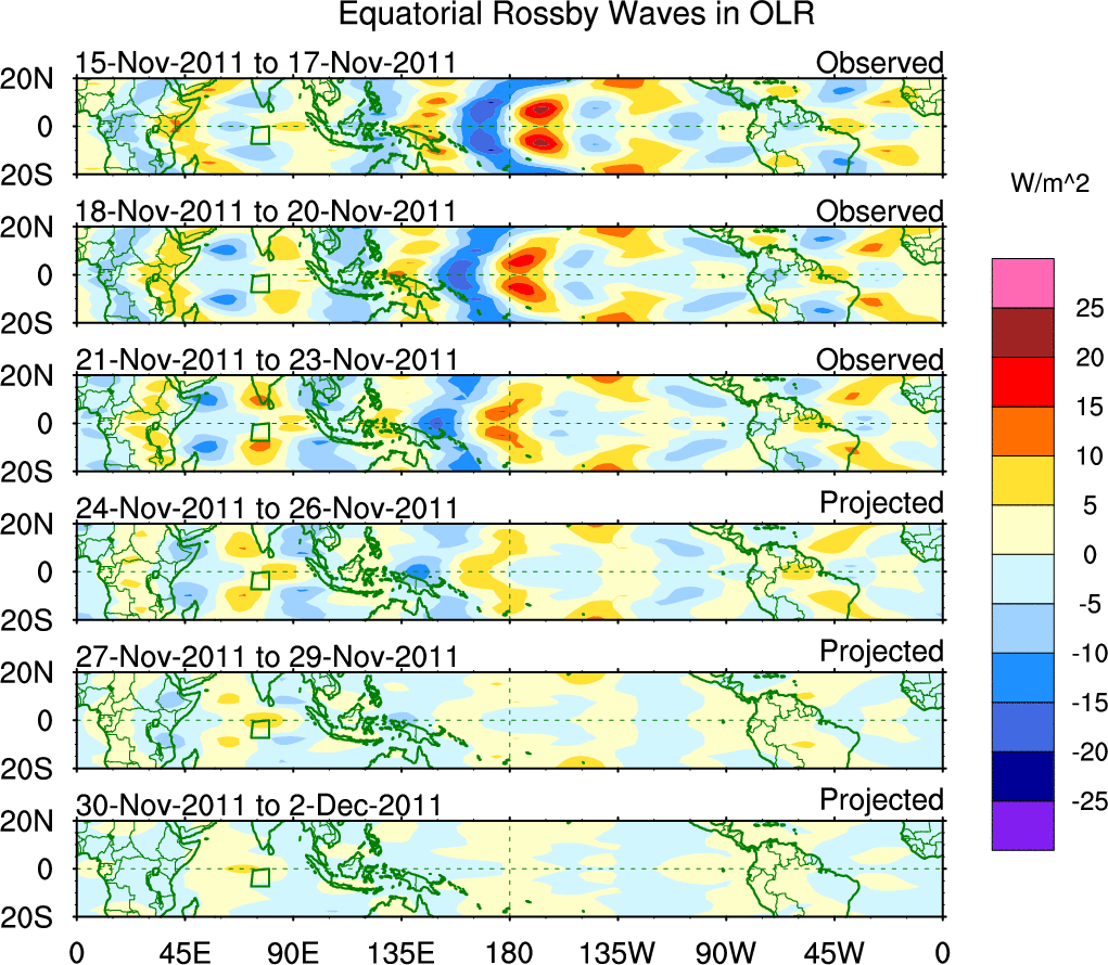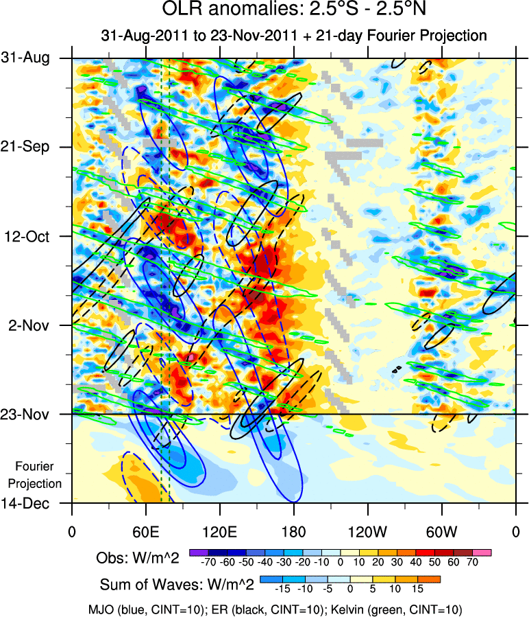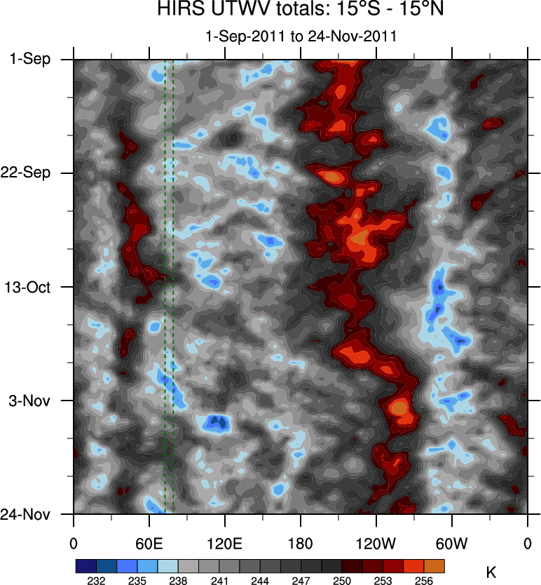 To identify tropical waves in near real-time, the OLR and UTWV data are filtered following Wheeler & Weickmann (2001 MWR). The daily anomalies are calculated using the first 3 harmonics of the seasonal cycle for 1979–2009. Missing values are then filled using linear interpolation in space and time. The most recent 365 days of anomalies are padded with 659 days of zeroes, and the result is filtered for each wave type.