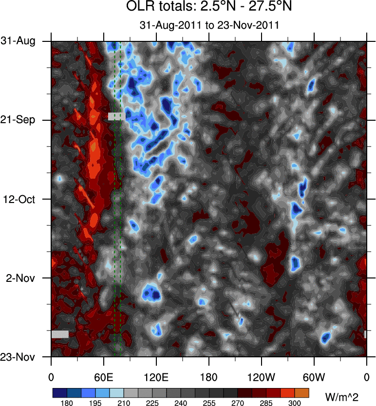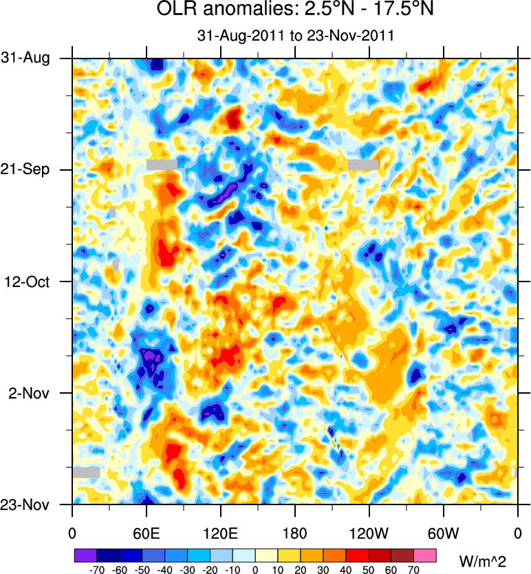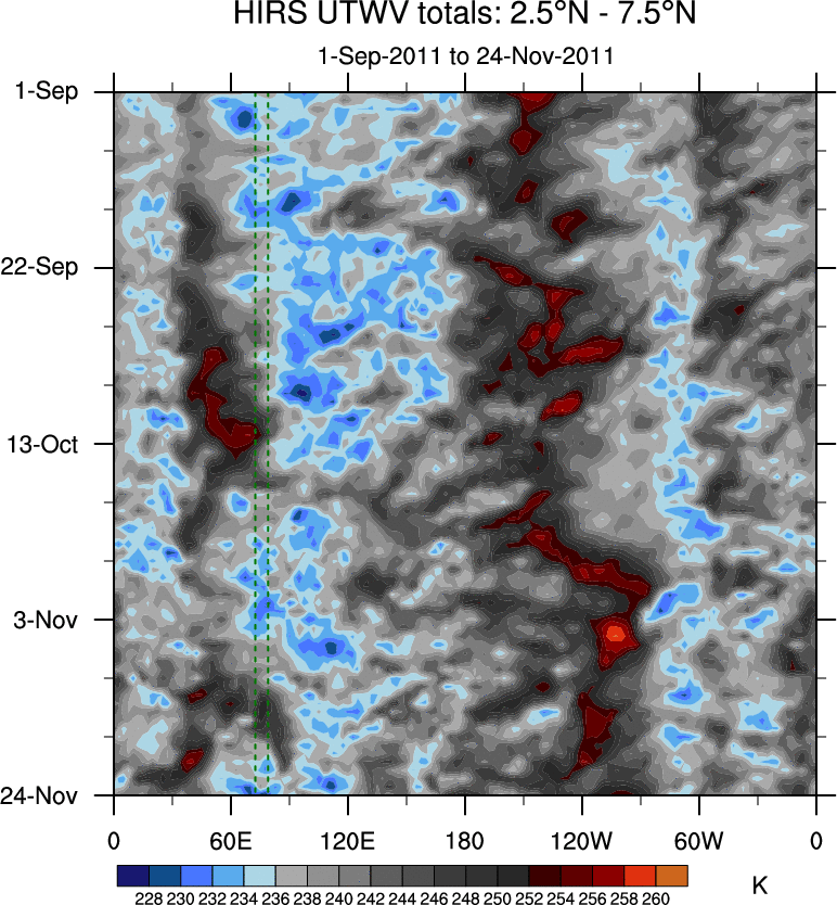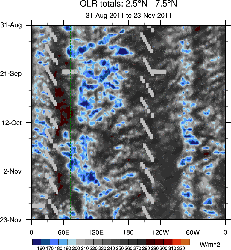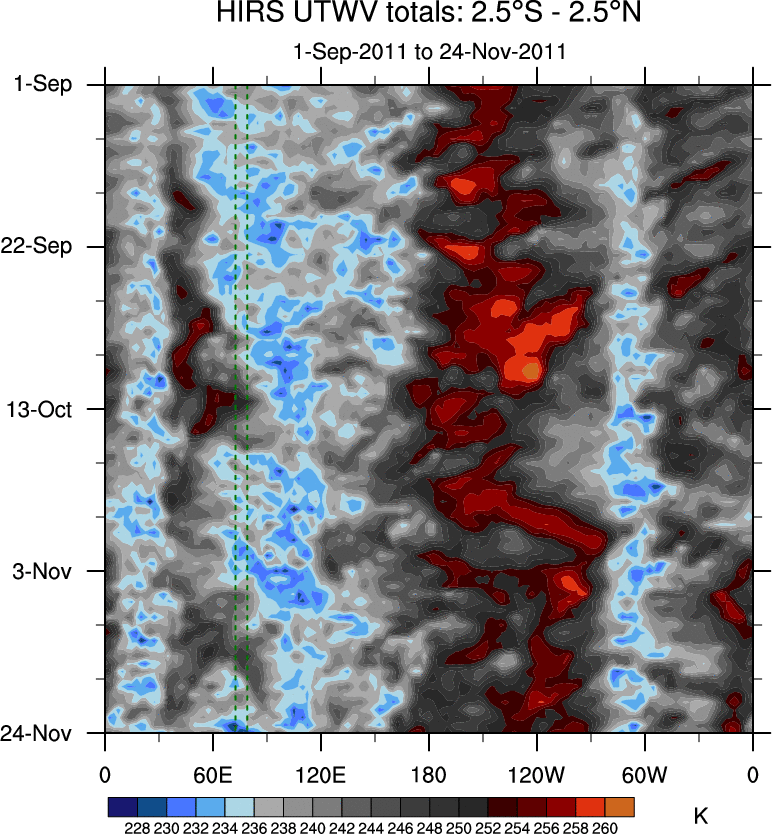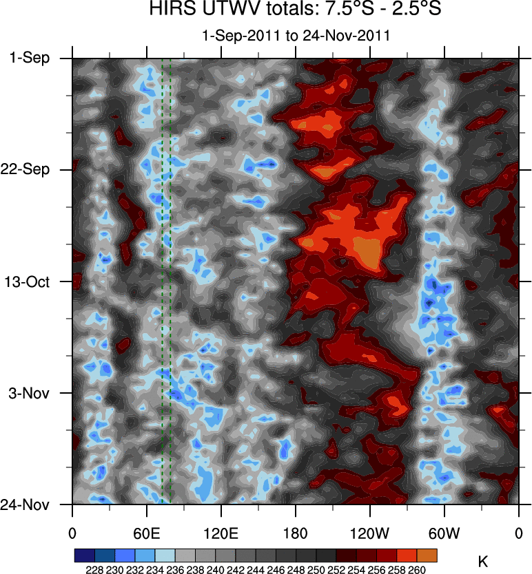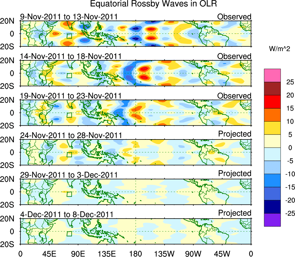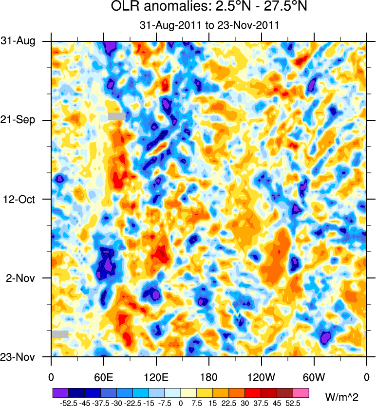 To identify tropical waves in near real-time, the OLR and UTWV data are filtered following Wheeler & Weickmann (2001 MWR). The daily anomalies are calculated using the first 3 harmonics of the seasonal cycle for 1979–2009. Missing values are then filled using linear interpolation in space and time. The most recent 365 days of anomalies are padded with 659 days of zeroes, and the result is filtered for each wave type.