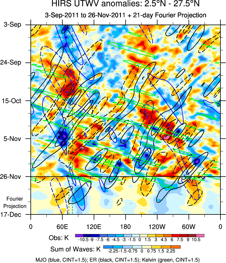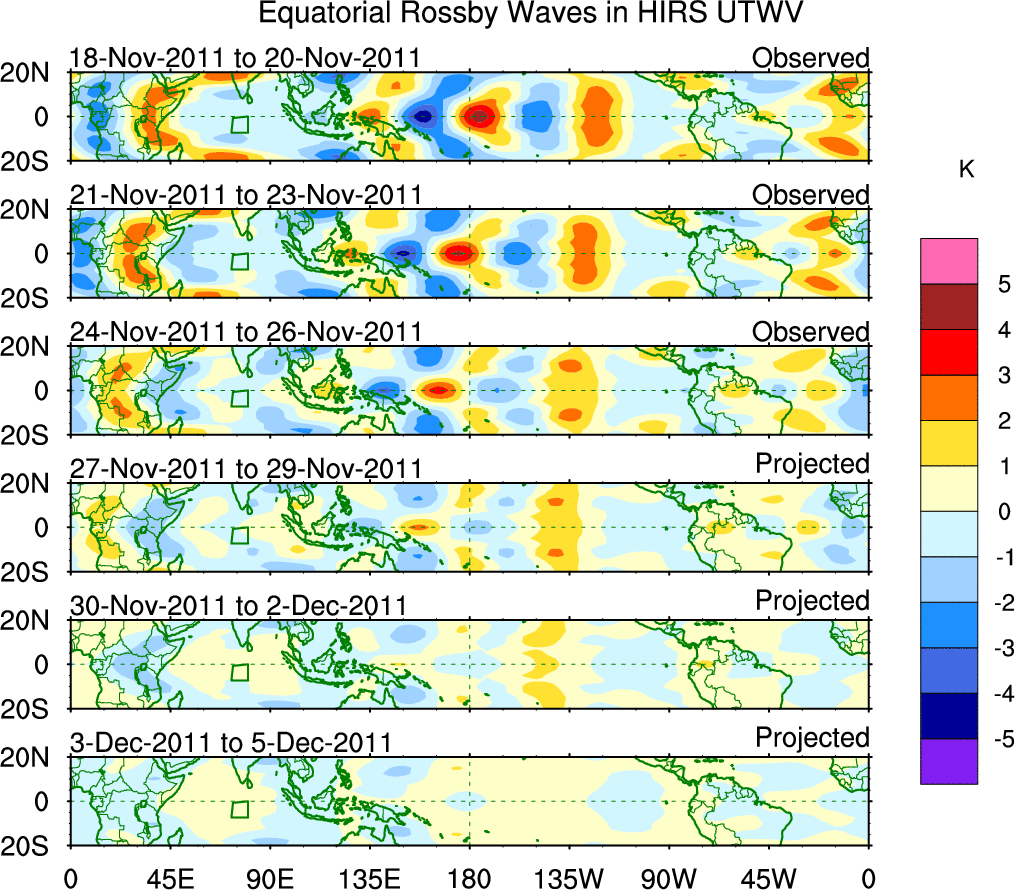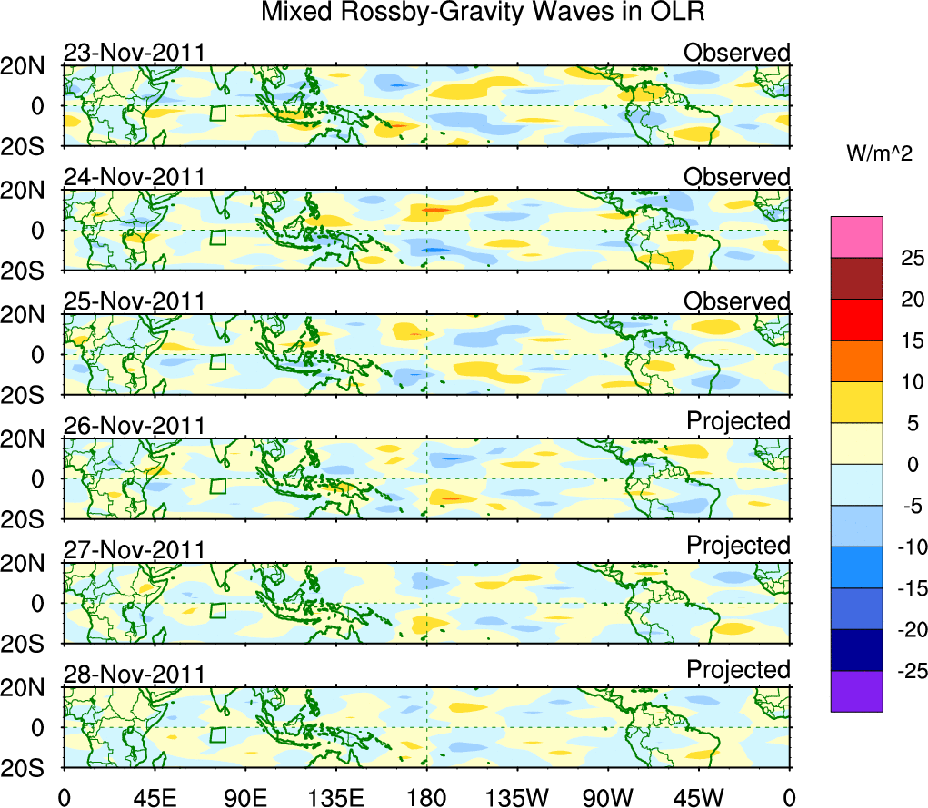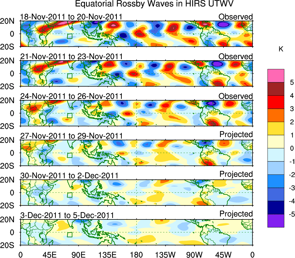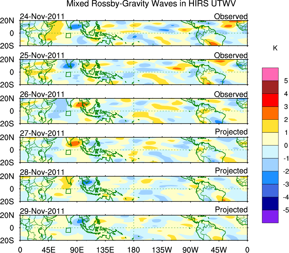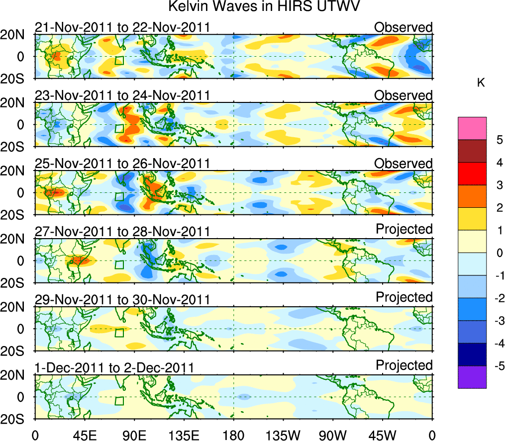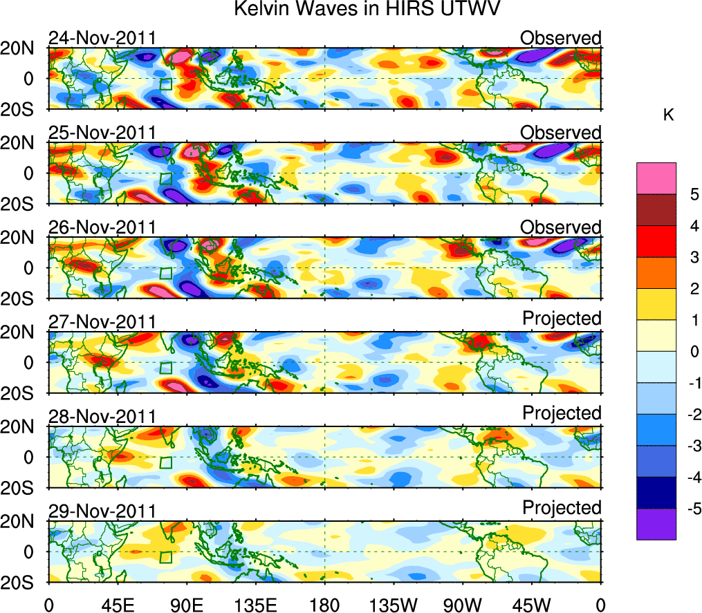 To identify tropical waves in near real-time, the OLR and UTWV data are filtered following Wheeler & Weickmann (2001 MWR). The daily anomalies are calculated using the first 3 harmonics of the seasonal cycle for 1979–2009. Missing values are then filled using linear interpolation in space and time. The most recent 365 days of anomalies are padded with 659 days of zeroes, and the result is filtered for each wave type.