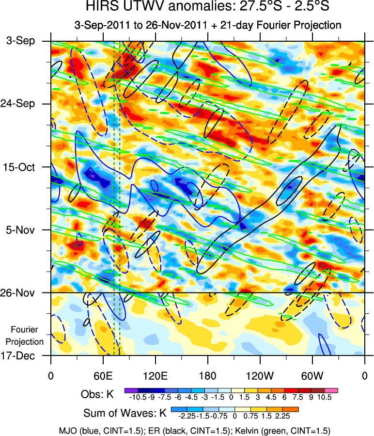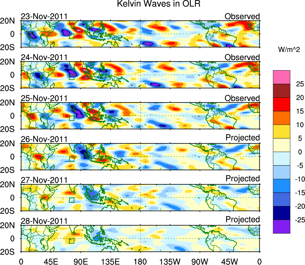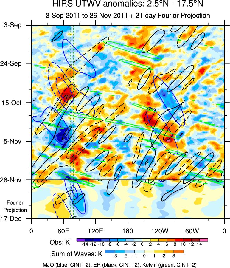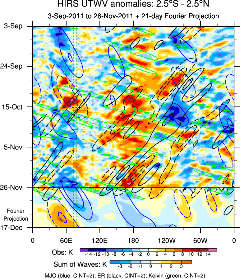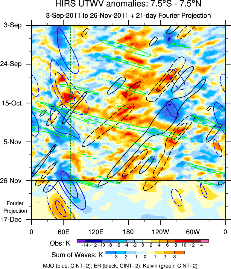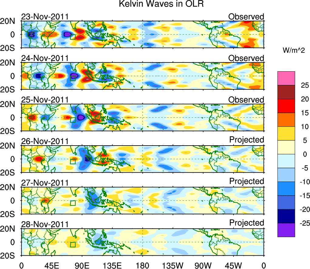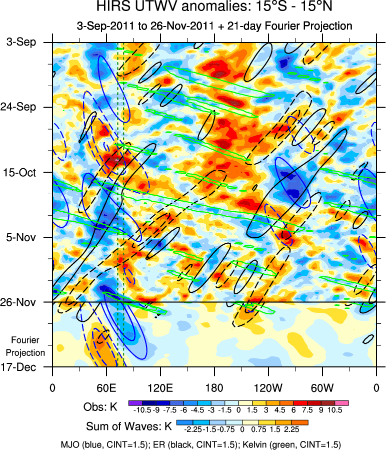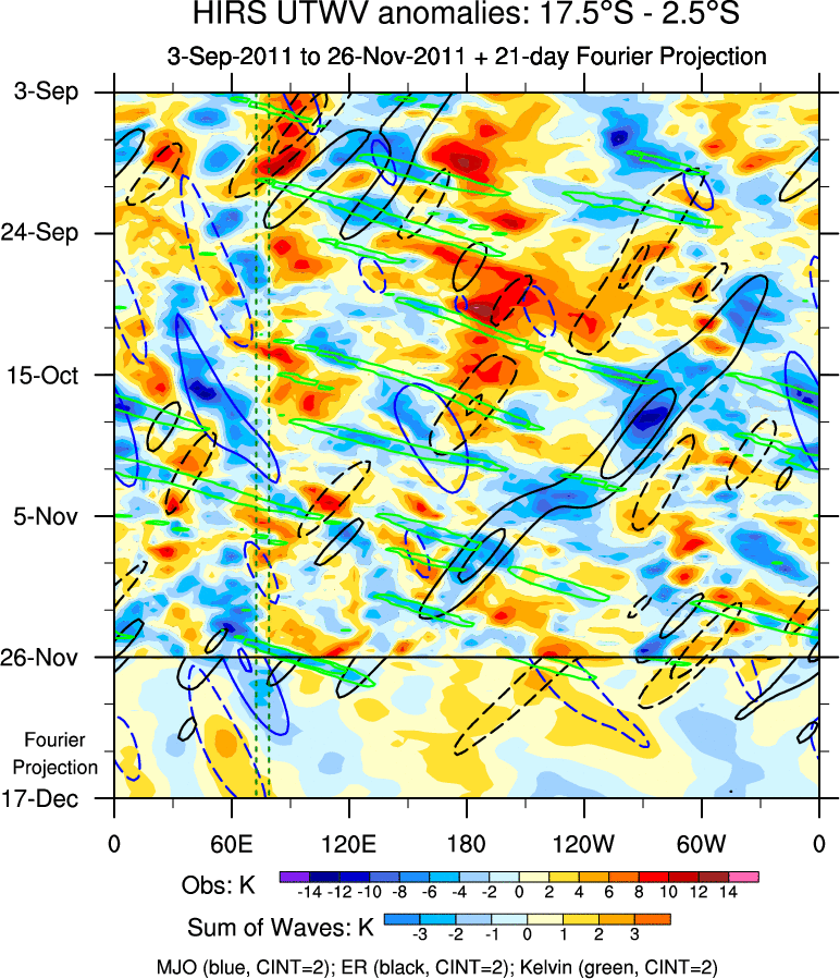 To identify tropical waves in near real-time, the OLR and UTWV data are filtered following Wheeler & Weickmann (2001 MWR). The daily anomalies are calculated using the first 3 harmonics of the seasonal cycle for 1979–2009. Missing values are then filled using linear interpolation in space and time. The most recent 365 days of anomalies are padded with 659 days of zeroes, and the result is filtered for each wave type.