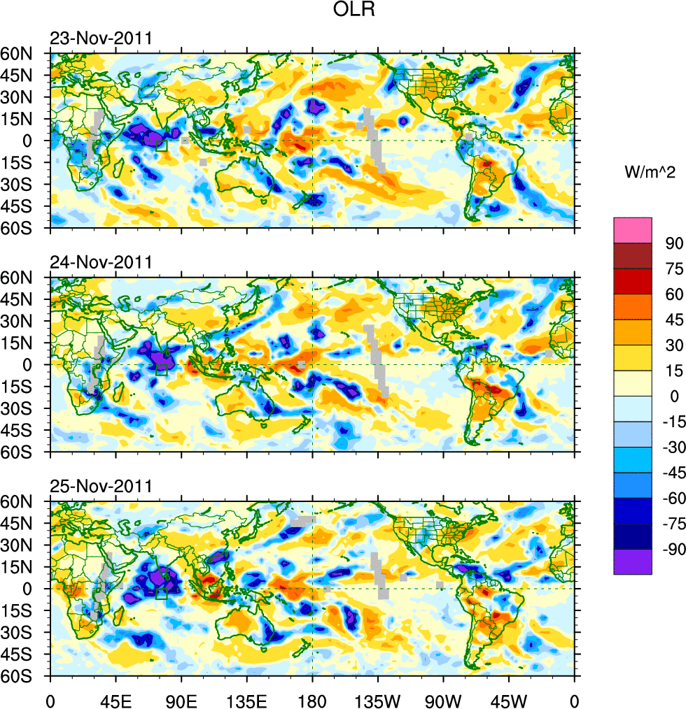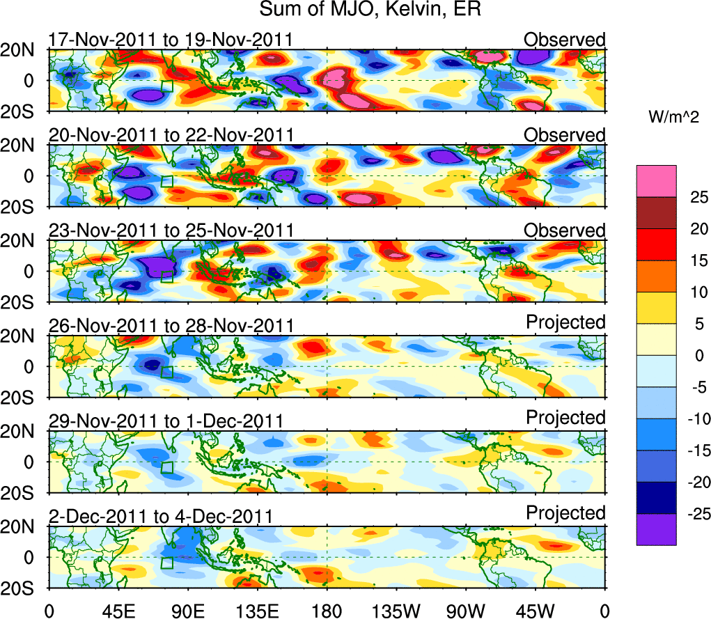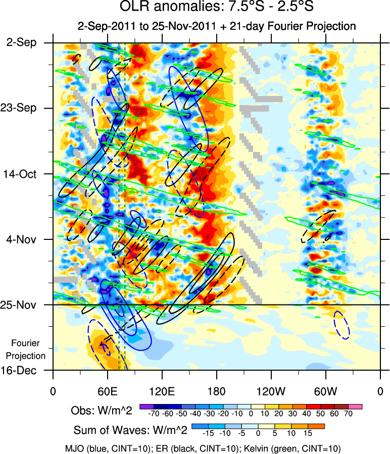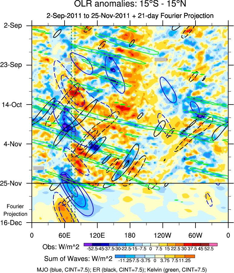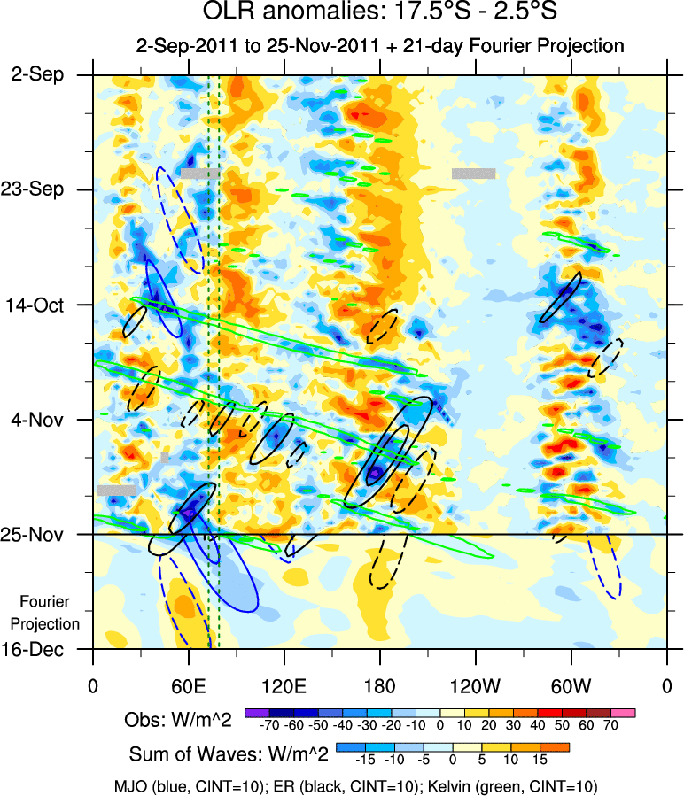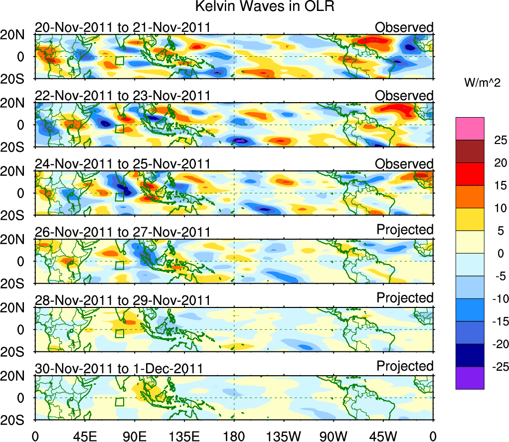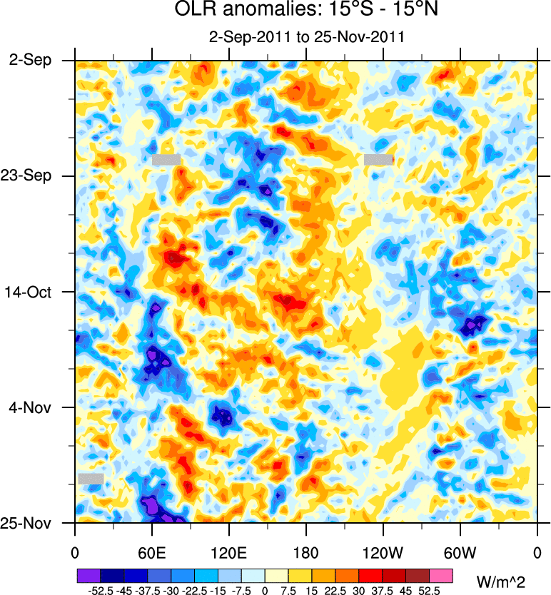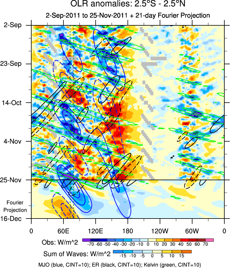 To identify tropical waves in near real-time, the OLR and UTWV data are filtered following Wheeler & Weickmann (2001 MWR). The daily anomalies are calculated using the first 3 harmonics of the seasonal cycle for 1979–2009. Missing values are then filled using linear interpolation in space and time. The most recent 365 days of anomalies are padded with 659 days of zeroes, and the result is filtered for each wave type.