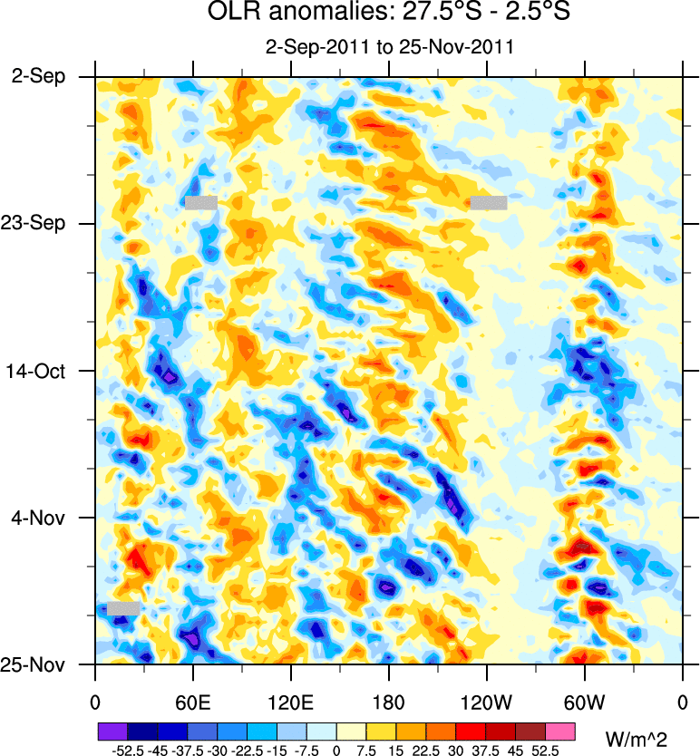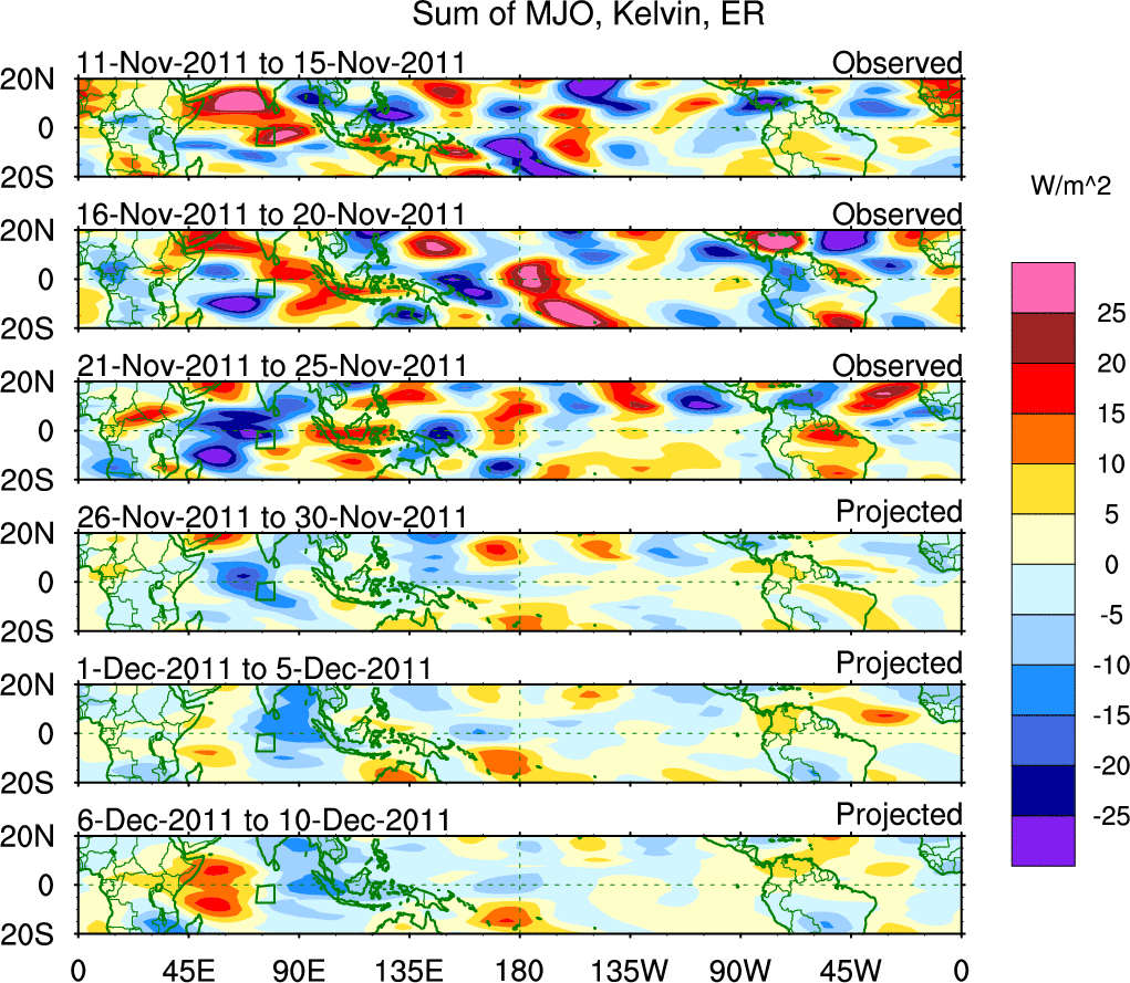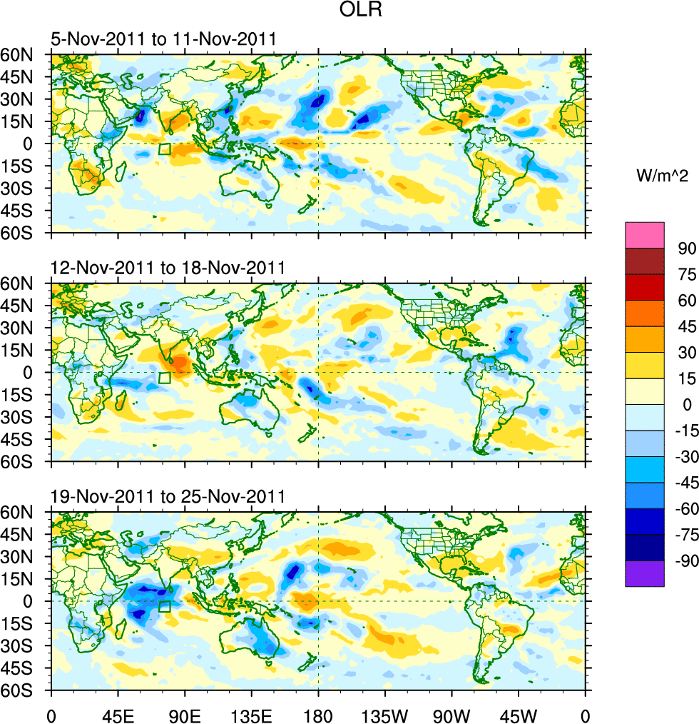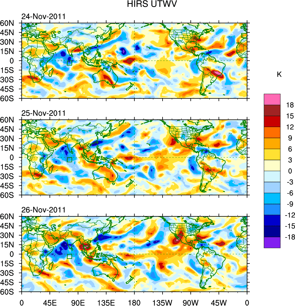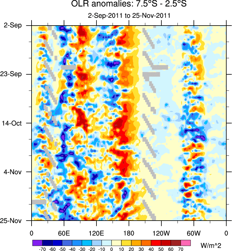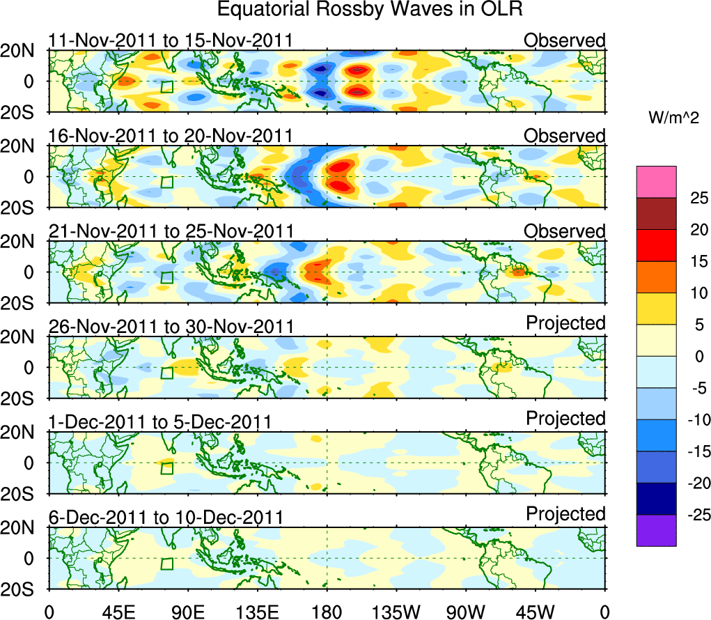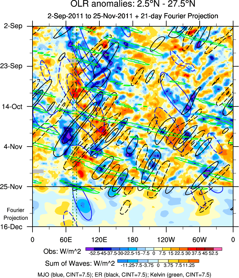 To identify tropical waves in near real-time, the OLR and UTWV data are filtered following Wheeler & Weickmann (2001 MWR). The daily anomalies are calculated using the first 3 harmonics of the seasonal cycle for 1979–2009. Missing values are then filled using linear interpolation in space and time. The most recent 365 days of anomalies are padded with 659 days of zeroes, and the result is filtered for each wave type.