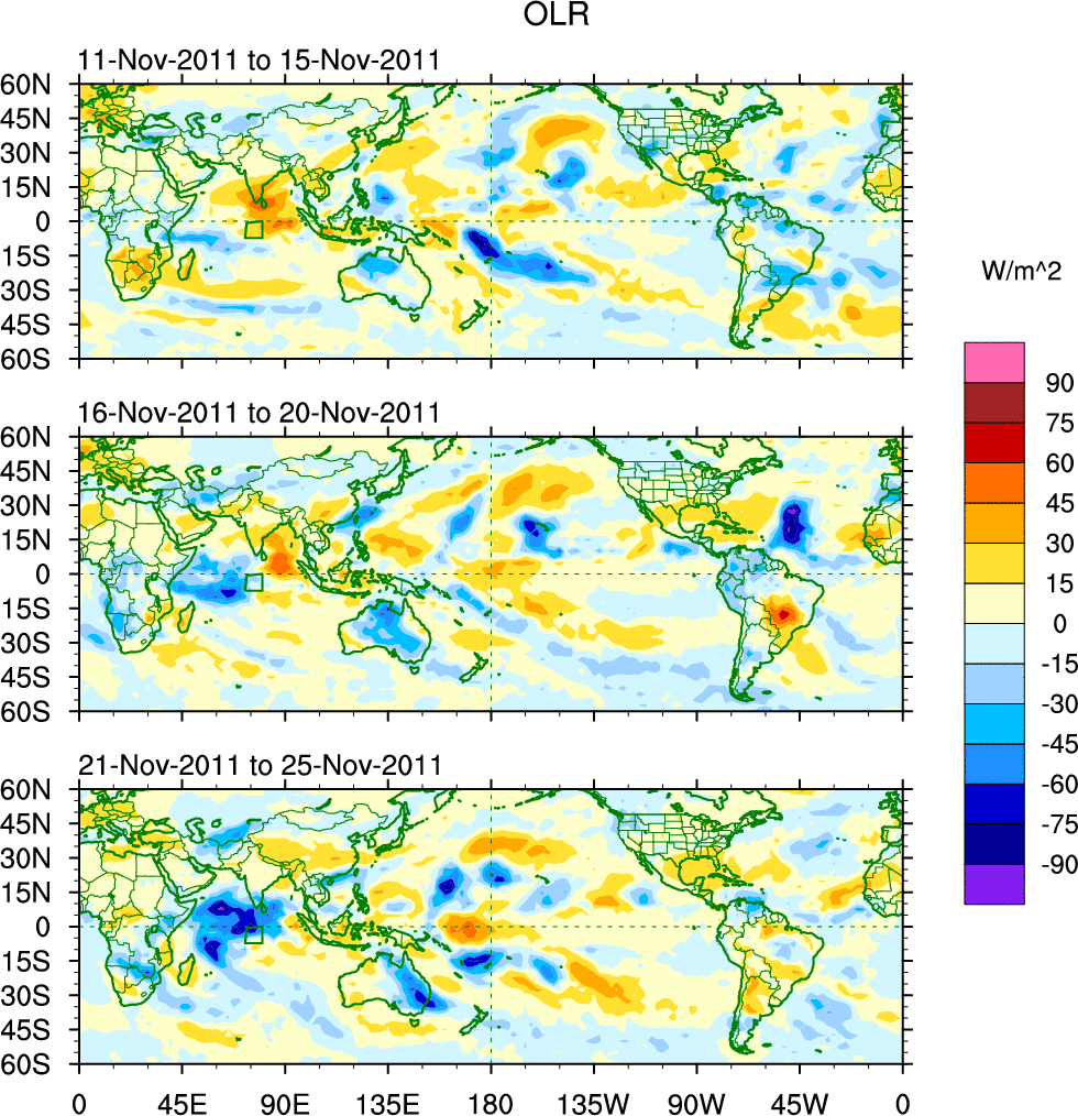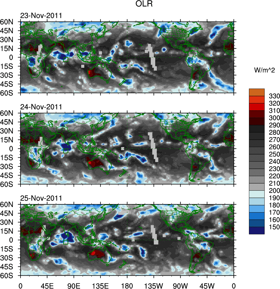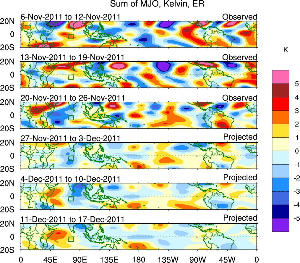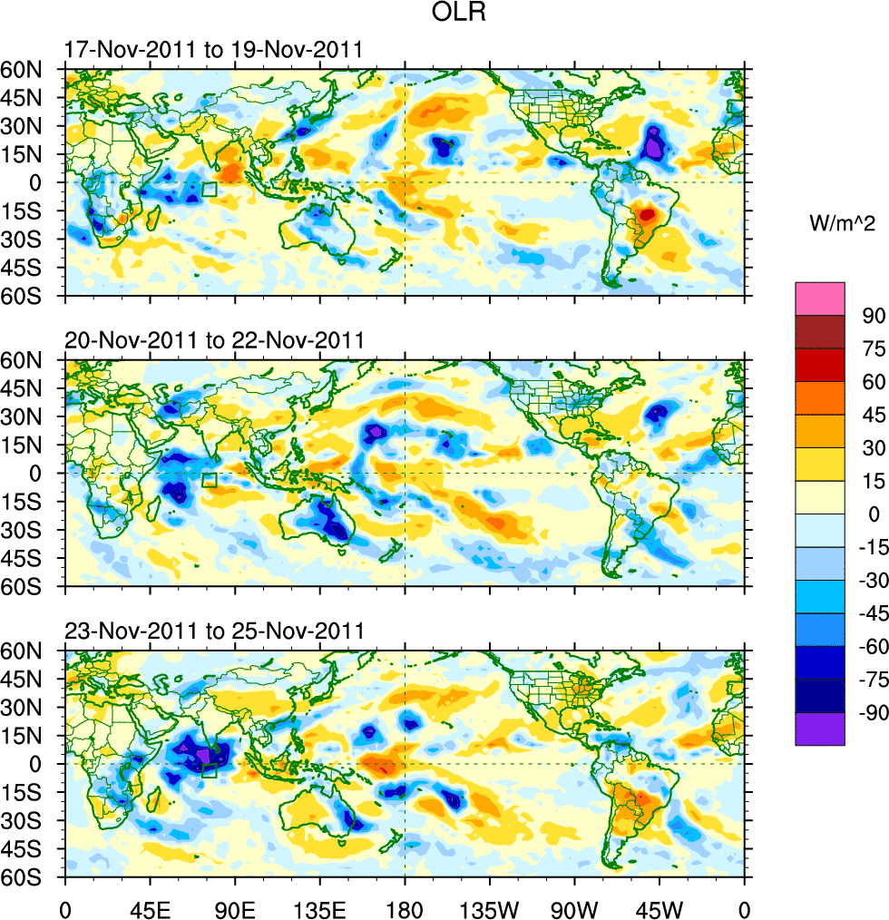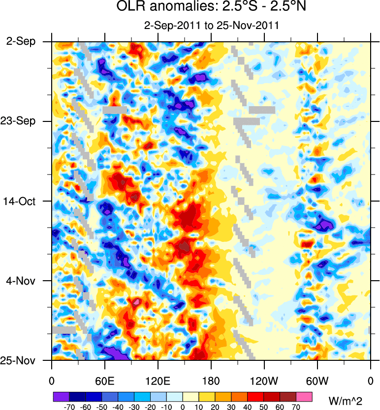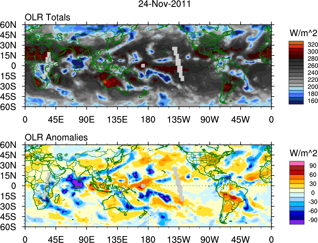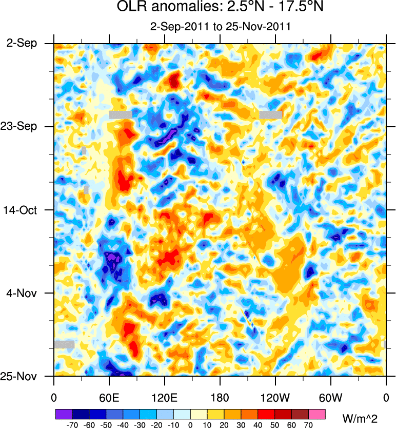 To identify tropical waves in near real-time, the OLR and UTWV data are filtered following Wheeler & Weickmann (2001 MWR). The daily anomalies are calculated using the first 3 harmonics of the seasonal cycle for 1979–2009. Missing values are then filled using linear interpolation in space and time. The most recent 365 days of anomalies are padded with 659 days of zeroes, and the result is filtered for each wave type.