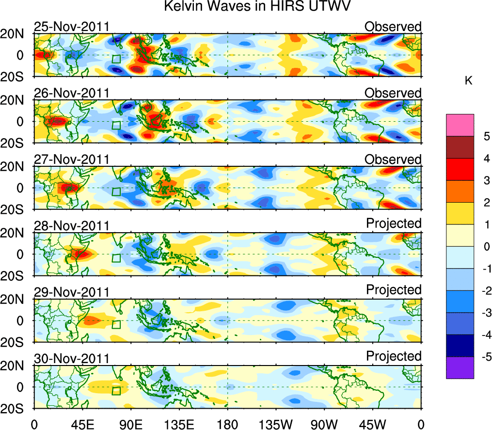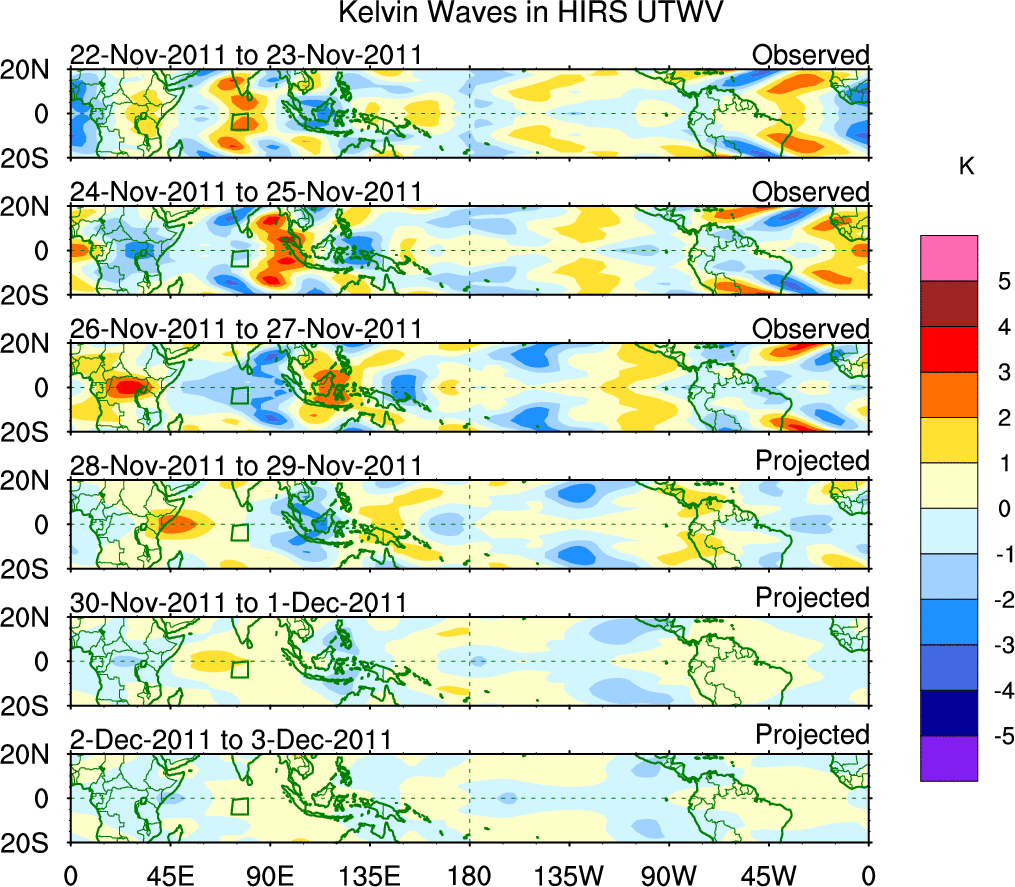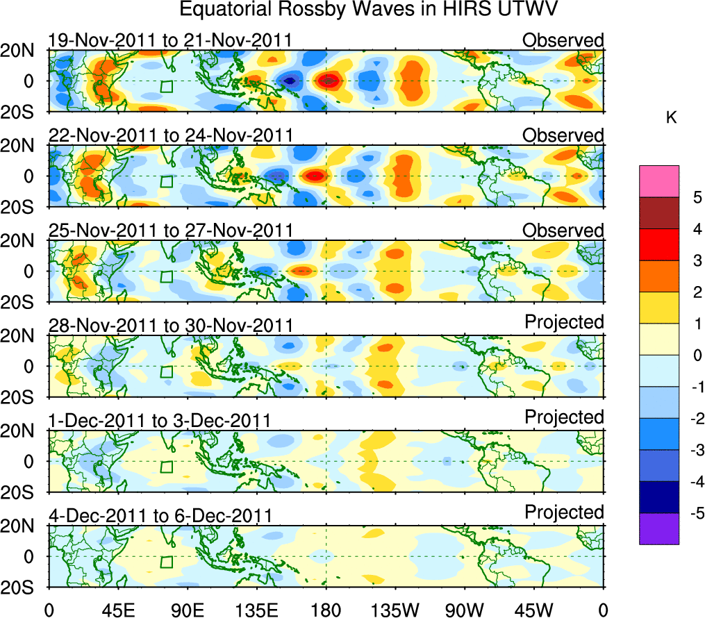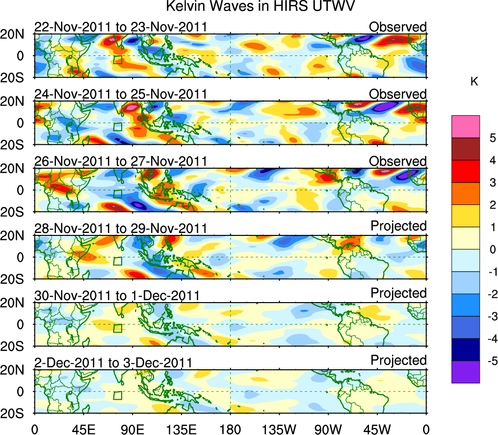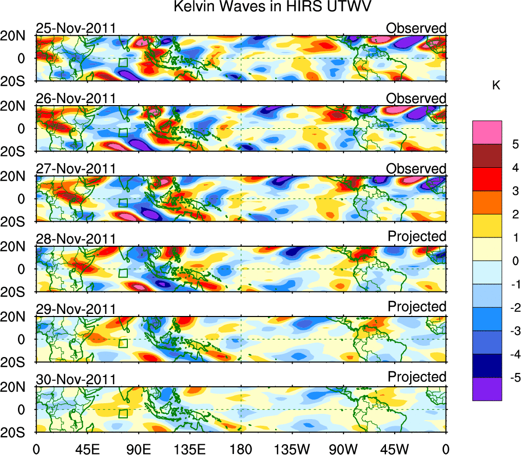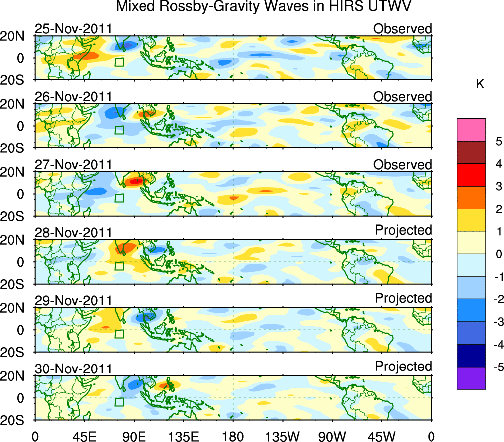 To identify tropical waves in near real-time, the OLR and UTWV data are filtered following Wheeler & Weickmann (2001 MWR). The daily anomalies are calculated using the first 3 harmonics of the seasonal cycle for 1979–2009. Missing values are then filled using linear interpolation in space and time. The most recent 365 days of anomalies are padded with 659 days of zeroes, and the result is filtered for each wave type.