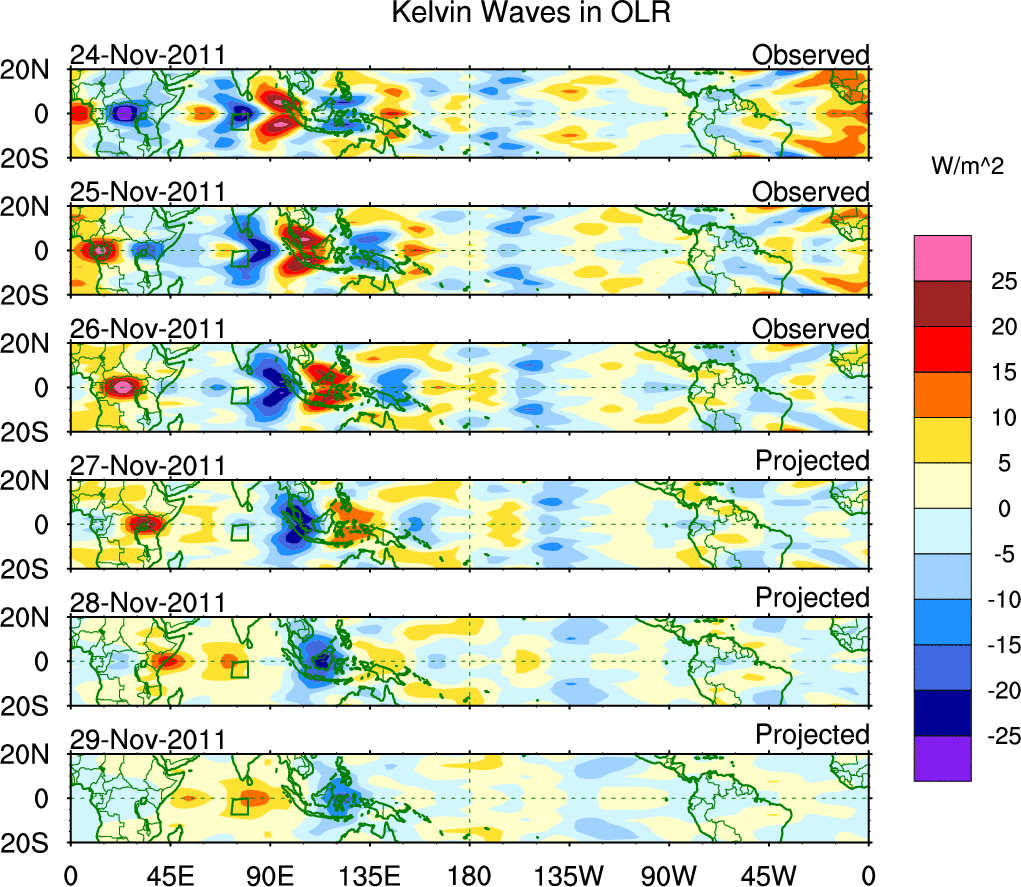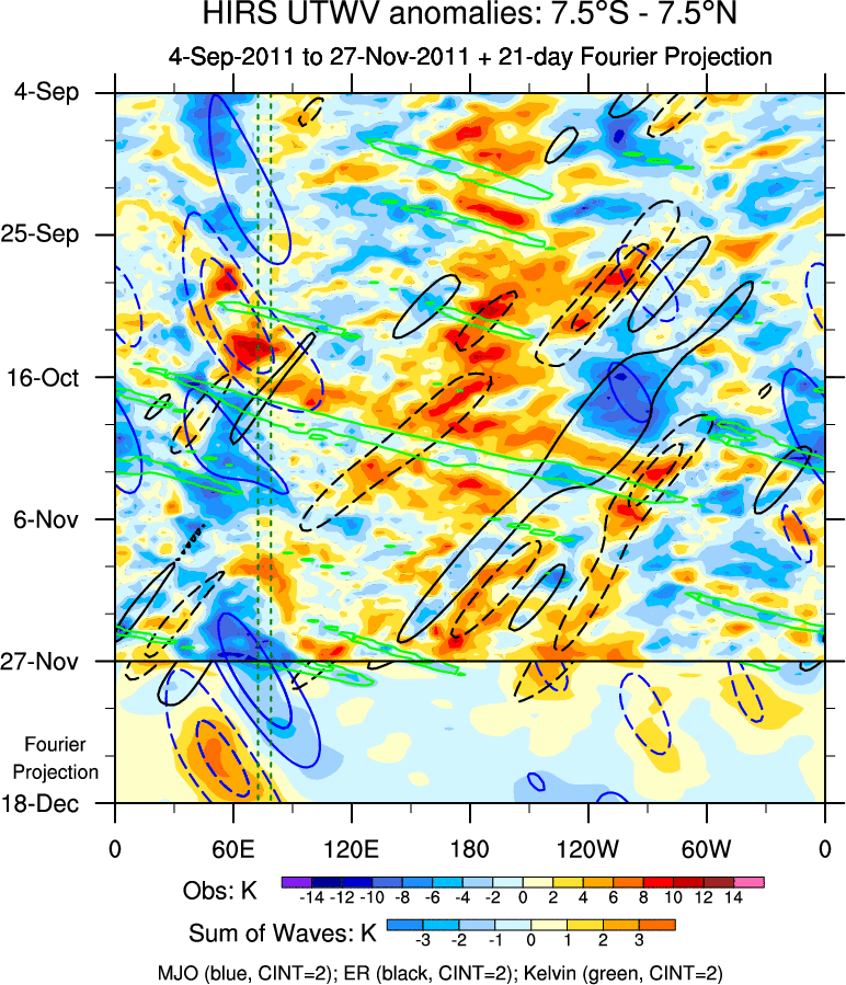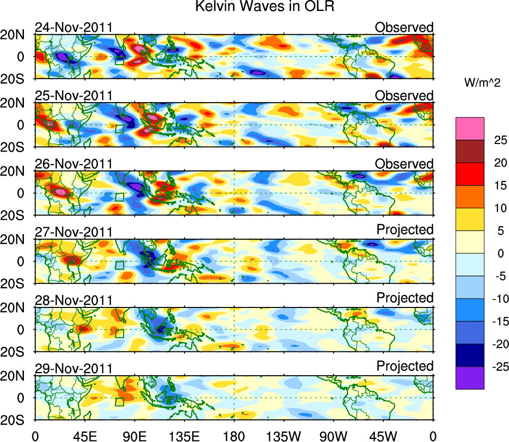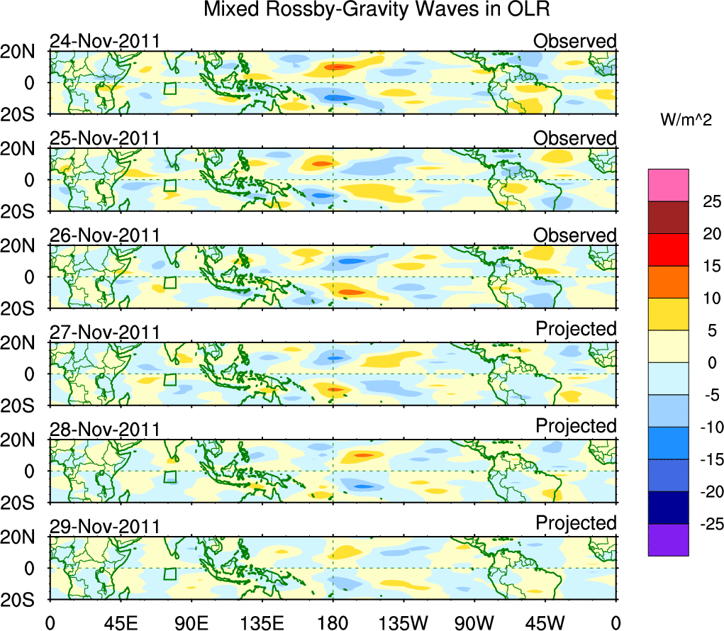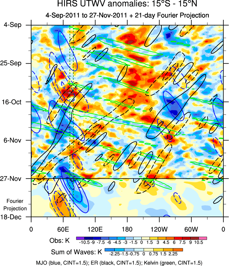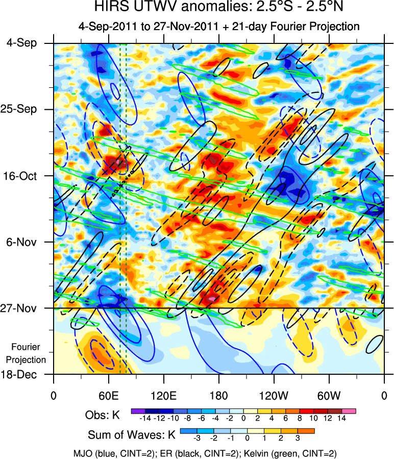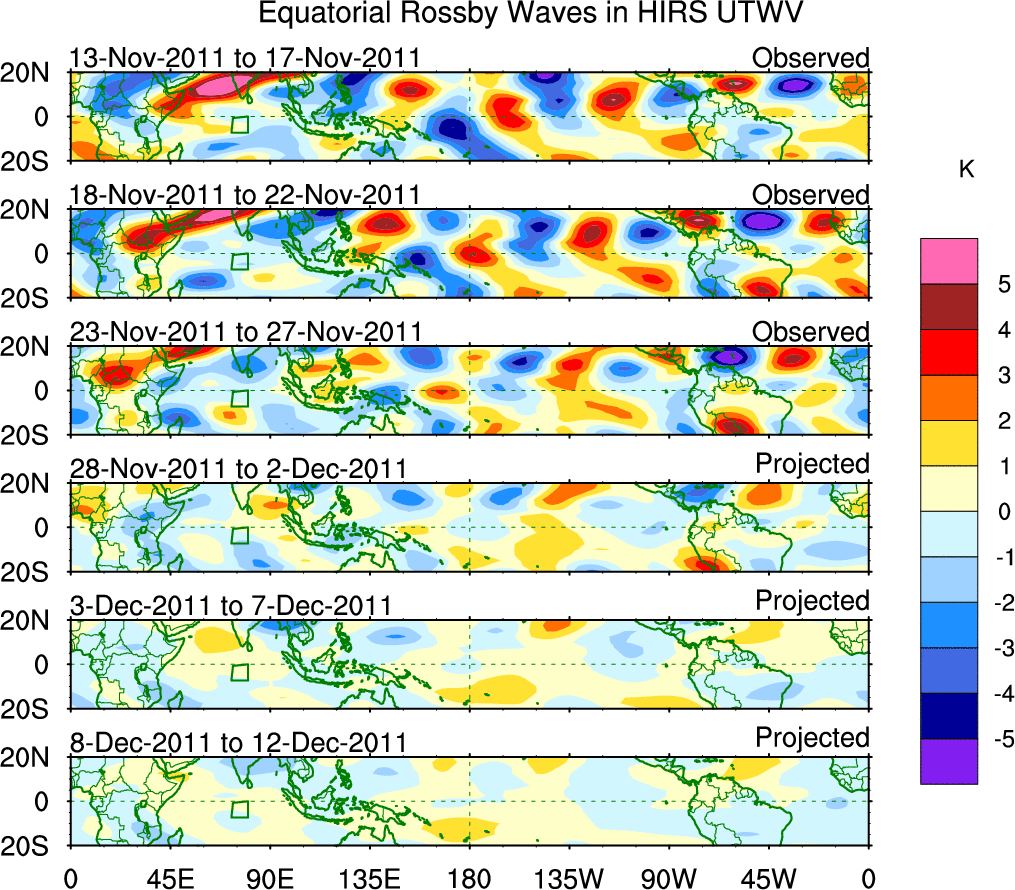 To identify tropical waves in near real-time, the OLR and UTWV data are filtered following Wheeler & Weickmann (2001 MWR). The daily anomalies are calculated using the first 3 harmonics of the seasonal cycle for 1979–2009. Missing values are then filled using linear interpolation in space and time. The most recent 365 days of anomalies are padded with 659 days of zeroes, and the result is filtered for each wave type.