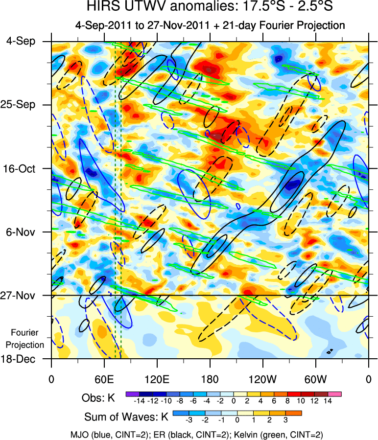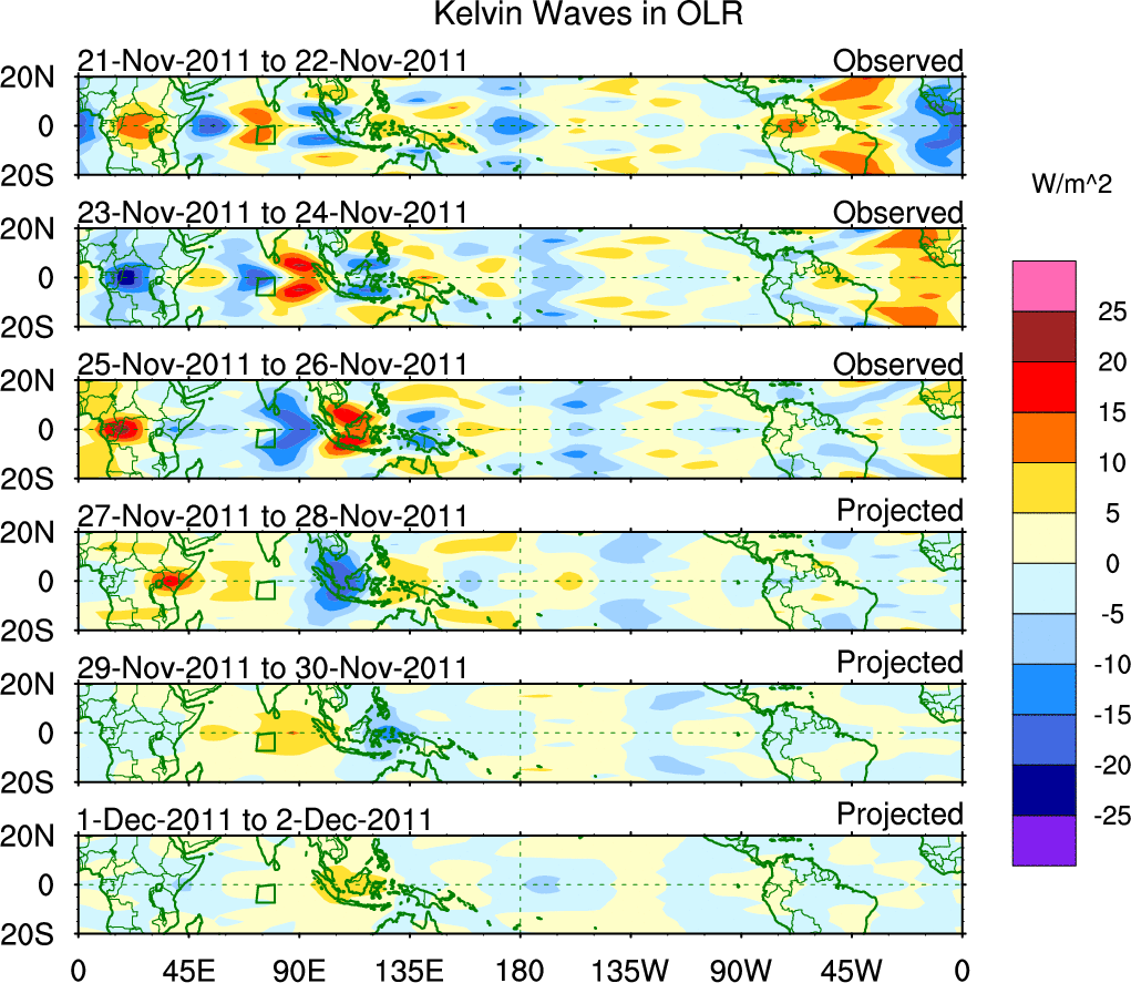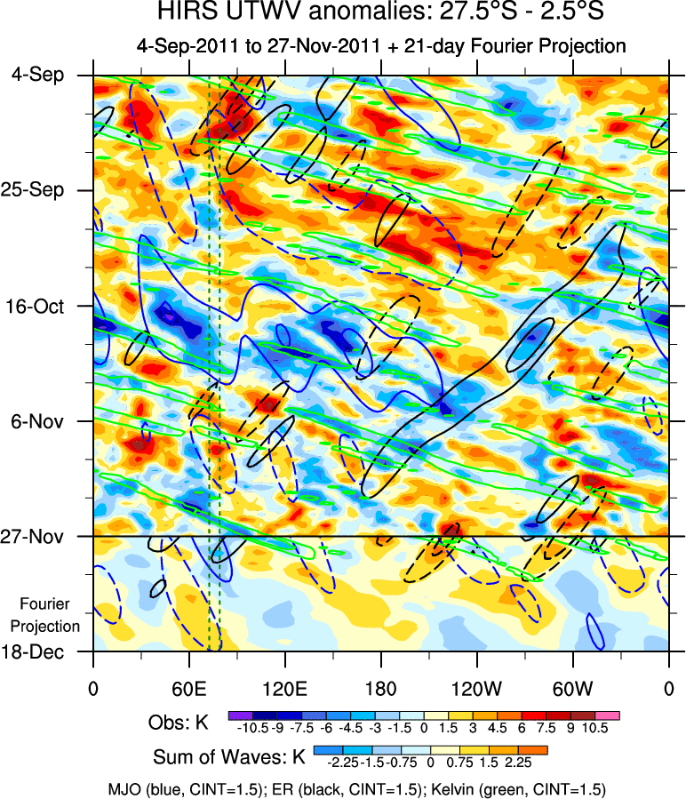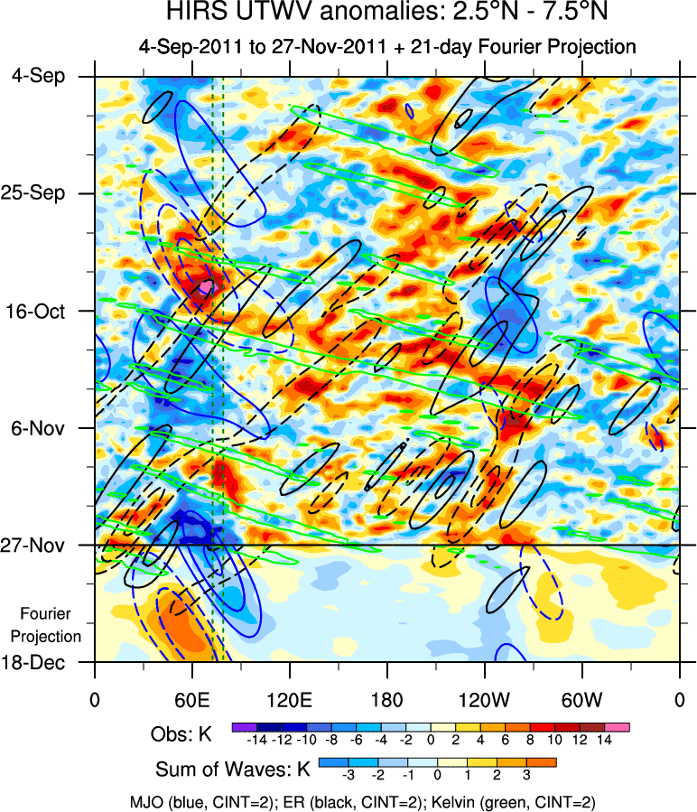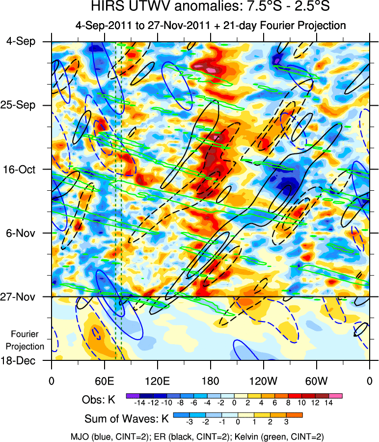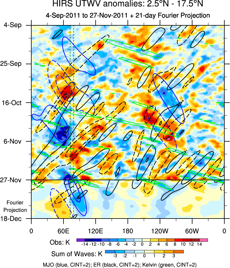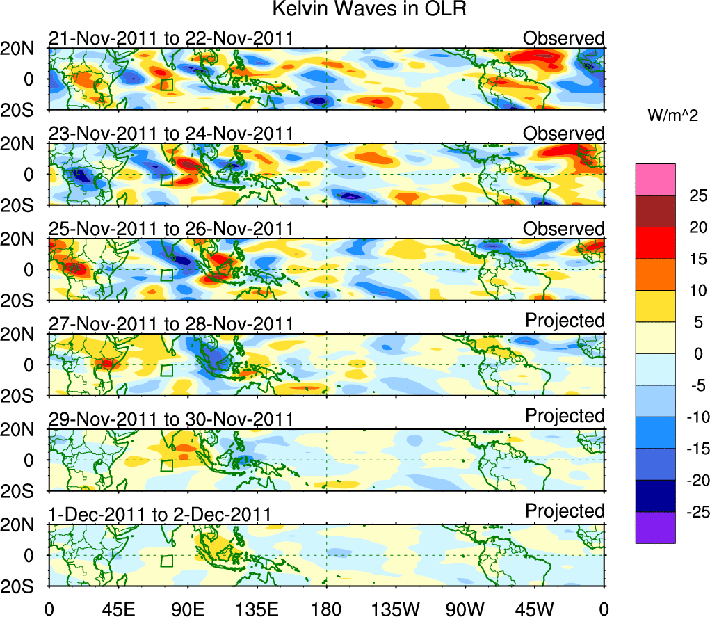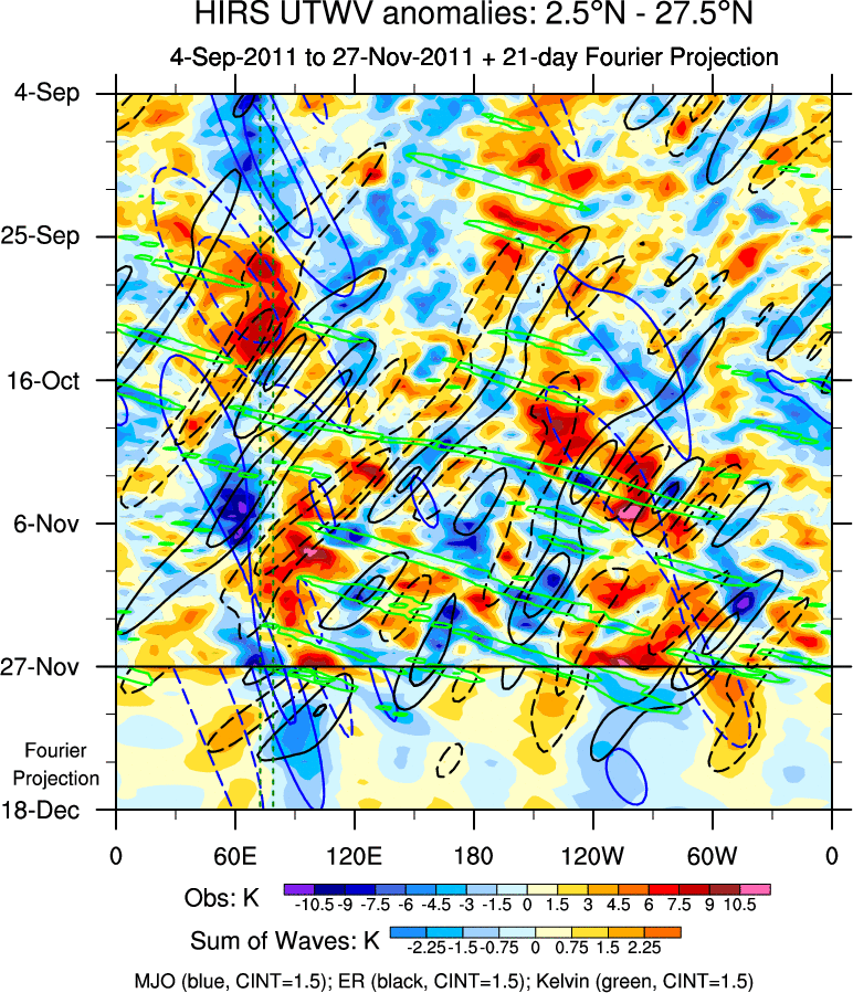 To identify tropical waves in near real-time, the OLR and UTWV data are filtered following Wheeler & Weickmann (2001 MWR). The daily anomalies are calculated using the first 3 harmonics of the seasonal cycle for 1979–2009. Missing values are then filled using linear interpolation in space and time. The most recent 365 days of anomalies are padded with 659 days of zeroes, and the result is filtered for each wave type.