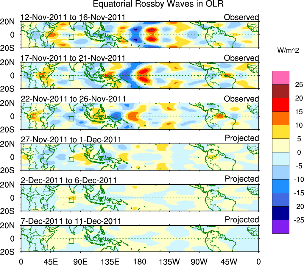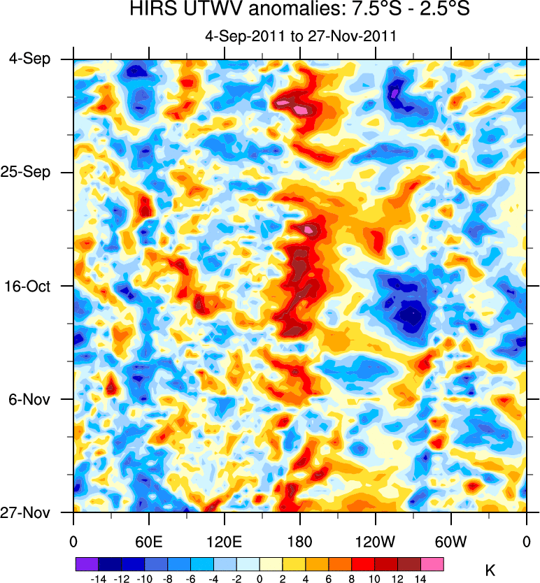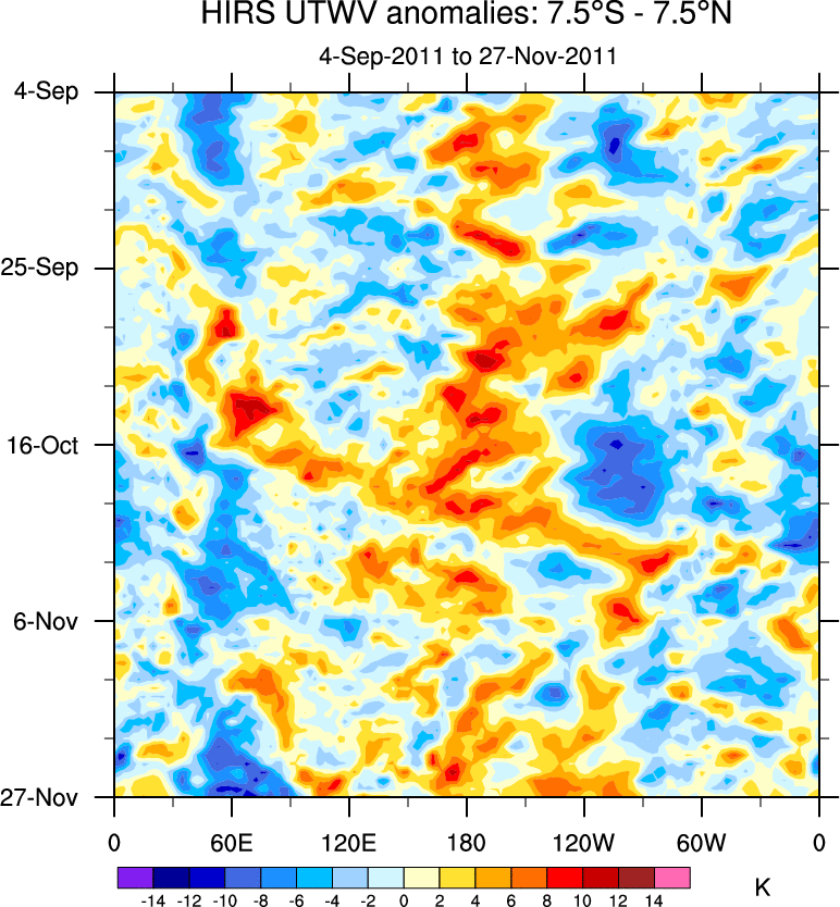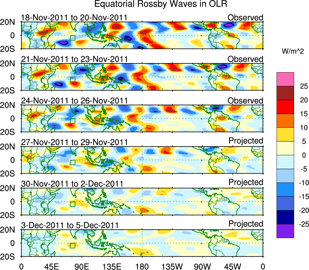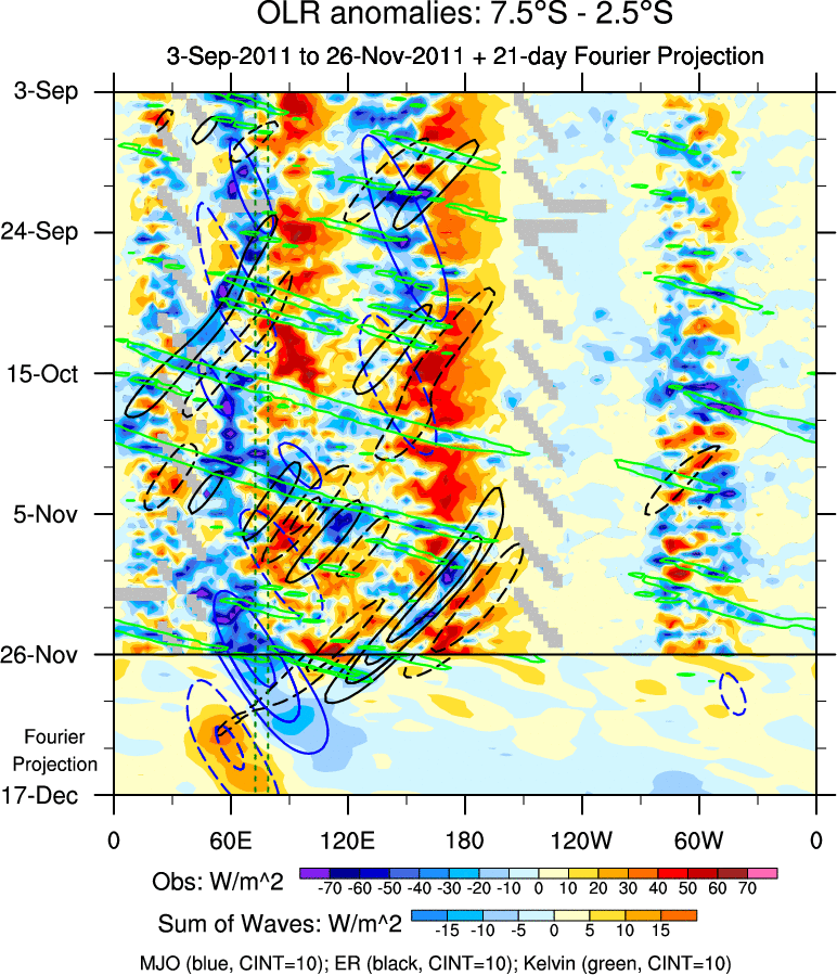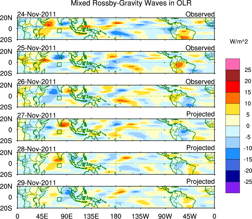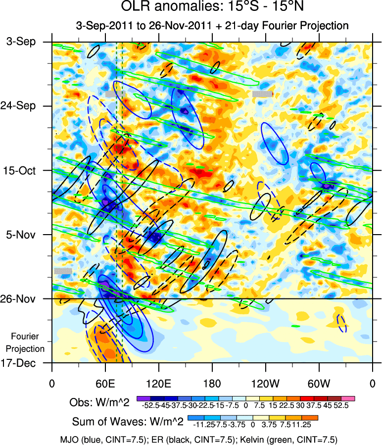 To identify tropical waves in near real-time, the OLR and UTWV data are filtered following Wheeler & Weickmann (2001 MWR). The daily anomalies are calculated using the first 3 harmonics of the seasonal cycle for 1979–2009. Missing values are then filled using linear interpolation in space and time. The most recent 365 days of anomalies are padded with 659 days of zeroes, and the result is filtered for each wave type.