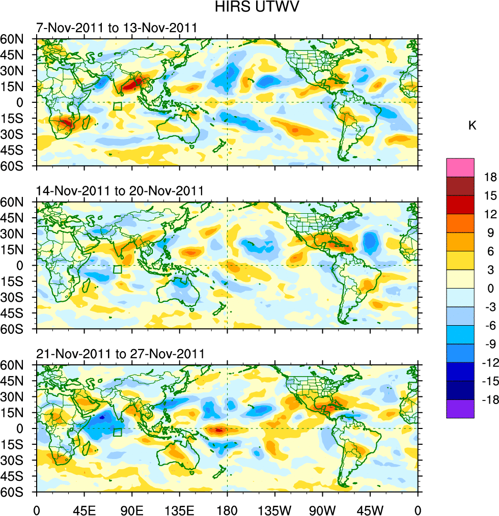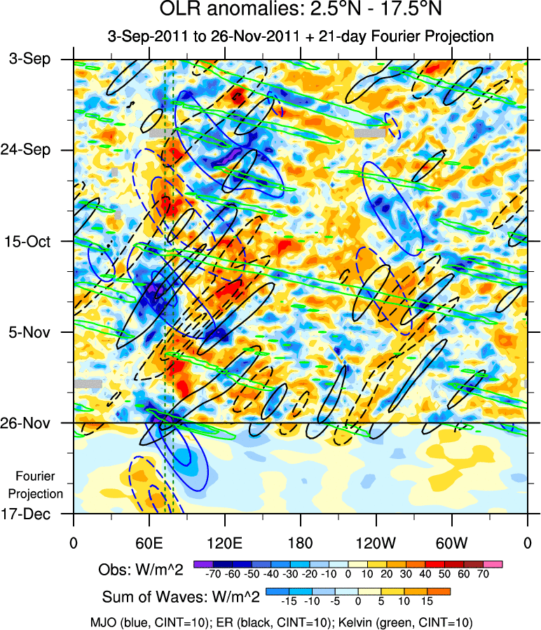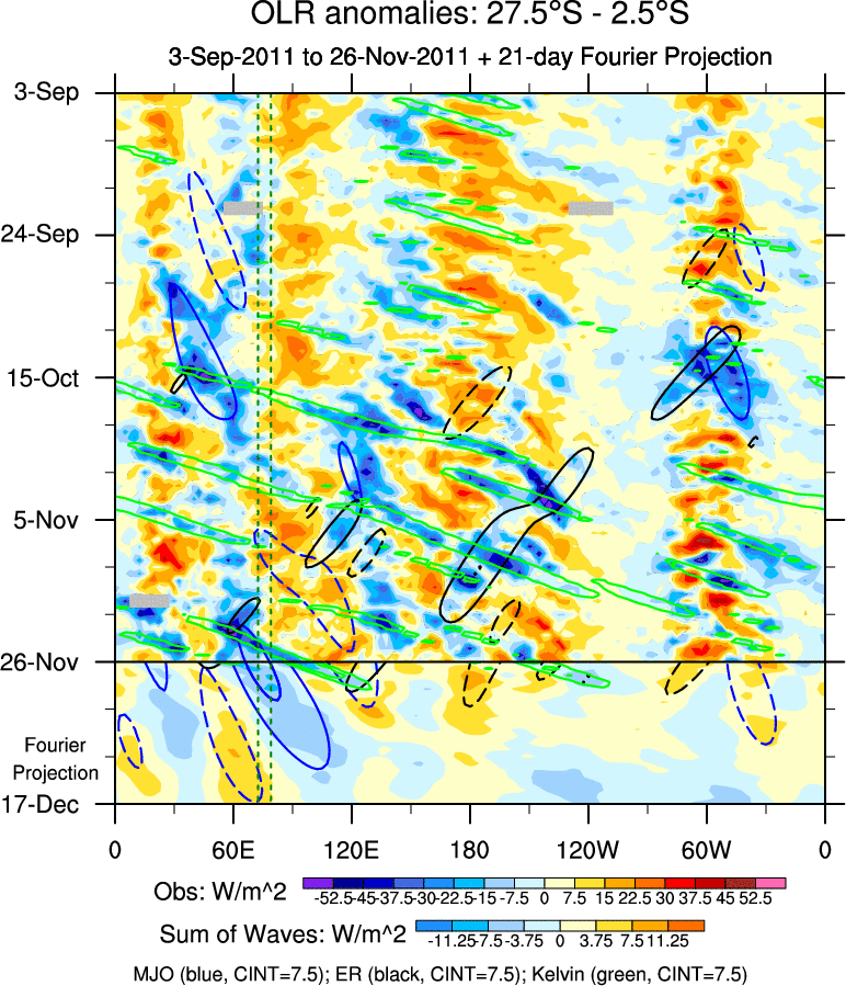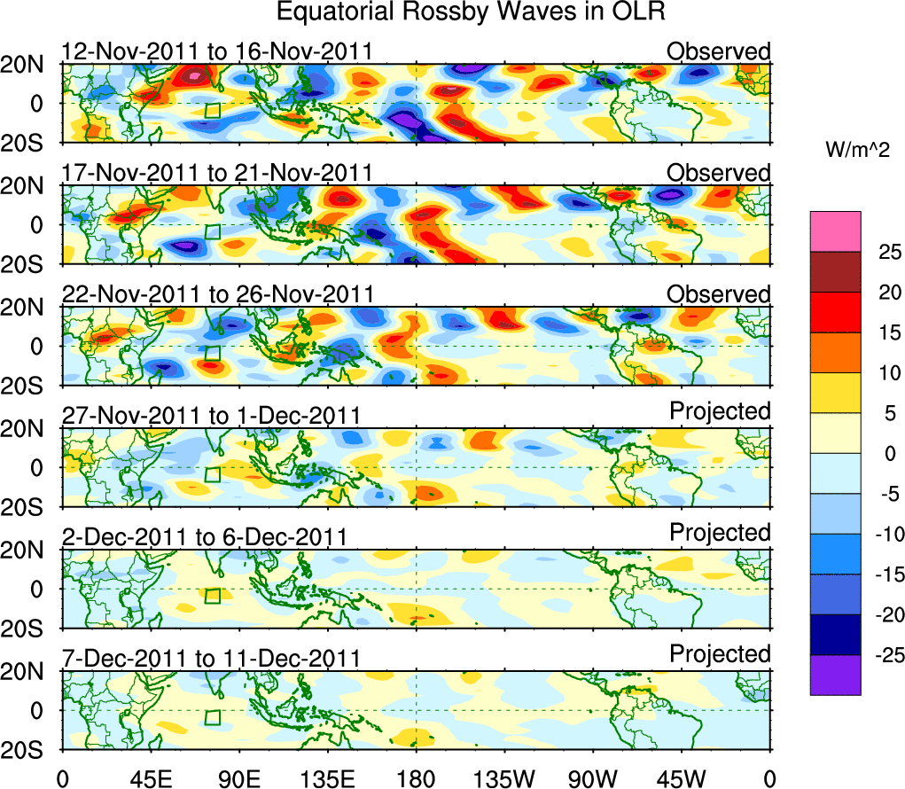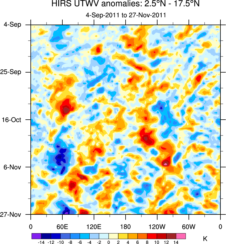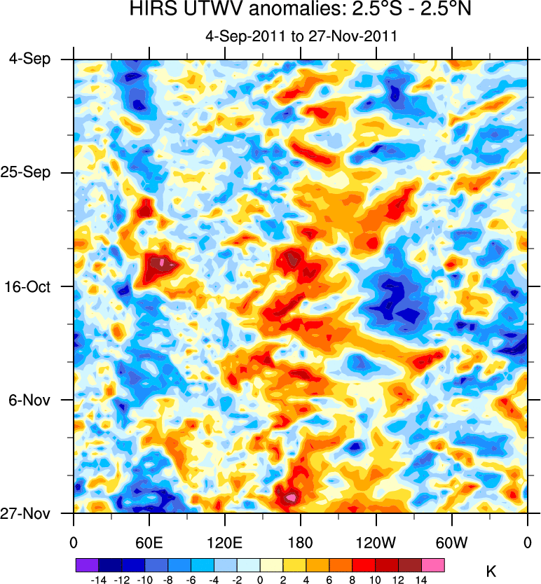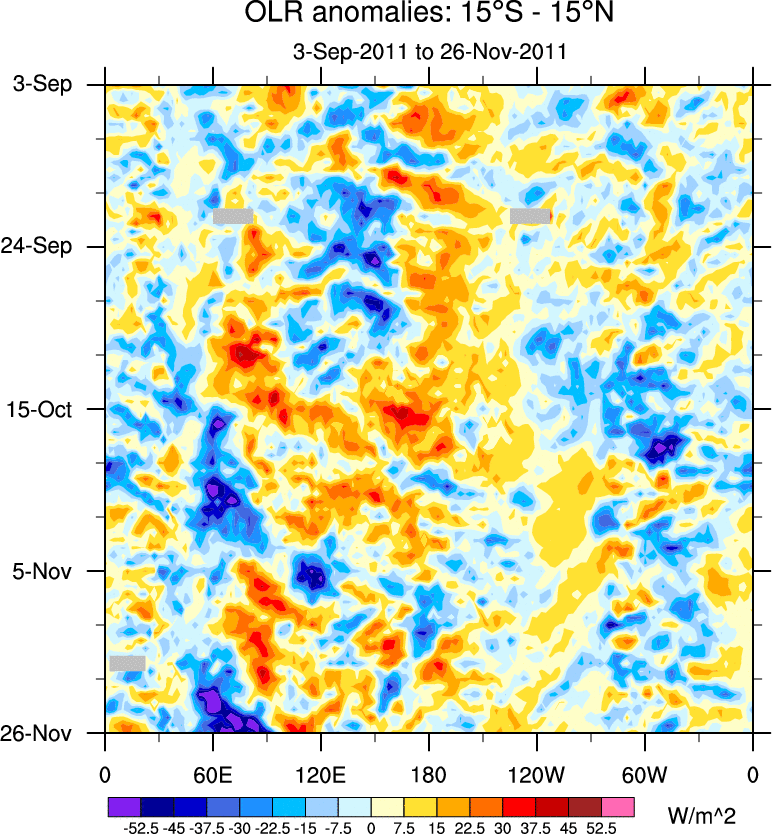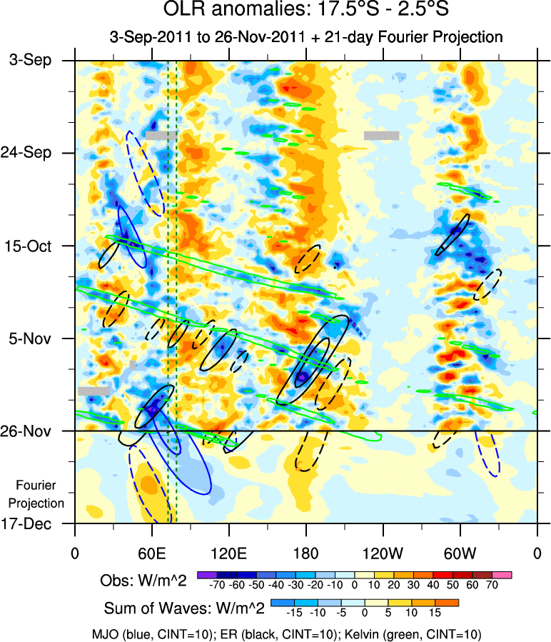 To identify tropical waves in near real-time, the OLR and UTWV data are filtered following Wheeler & Weickmann (2001 MWR). The daily anomalies are calculated using the first 3 harmonics of the seasonal cycle for 1979–2009. Missing values are then filled using linear interpolation in space and time. The most recent 365 days of anomalies are padded with 659 days of zeroes, and the result is filtered for each wave type.