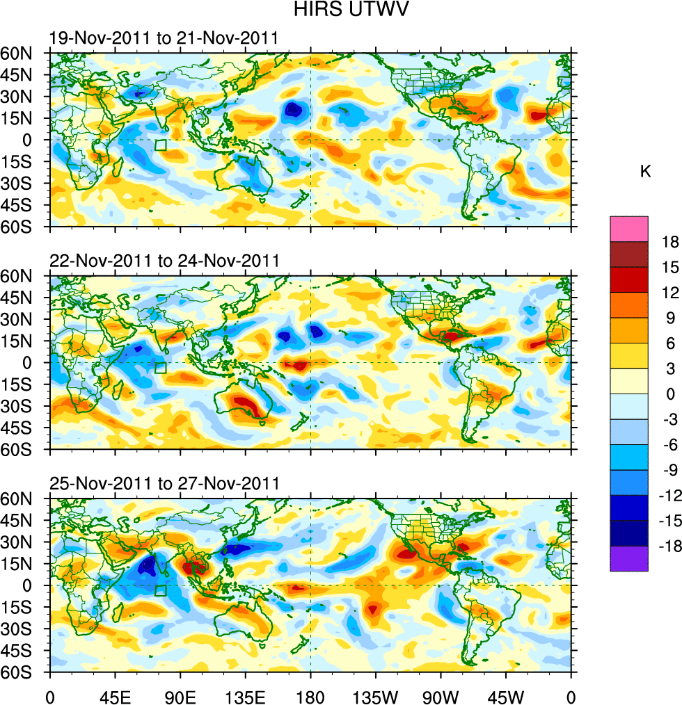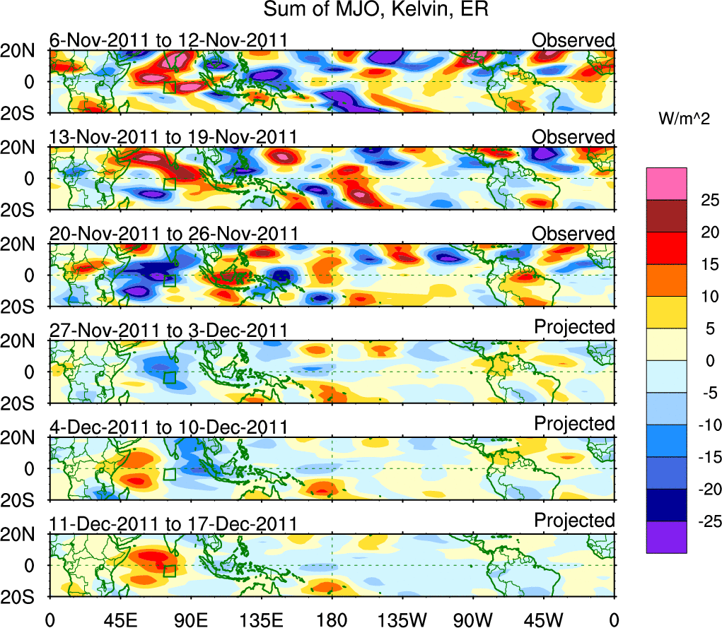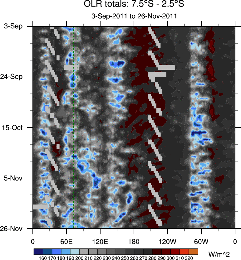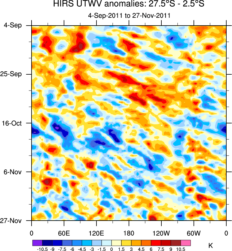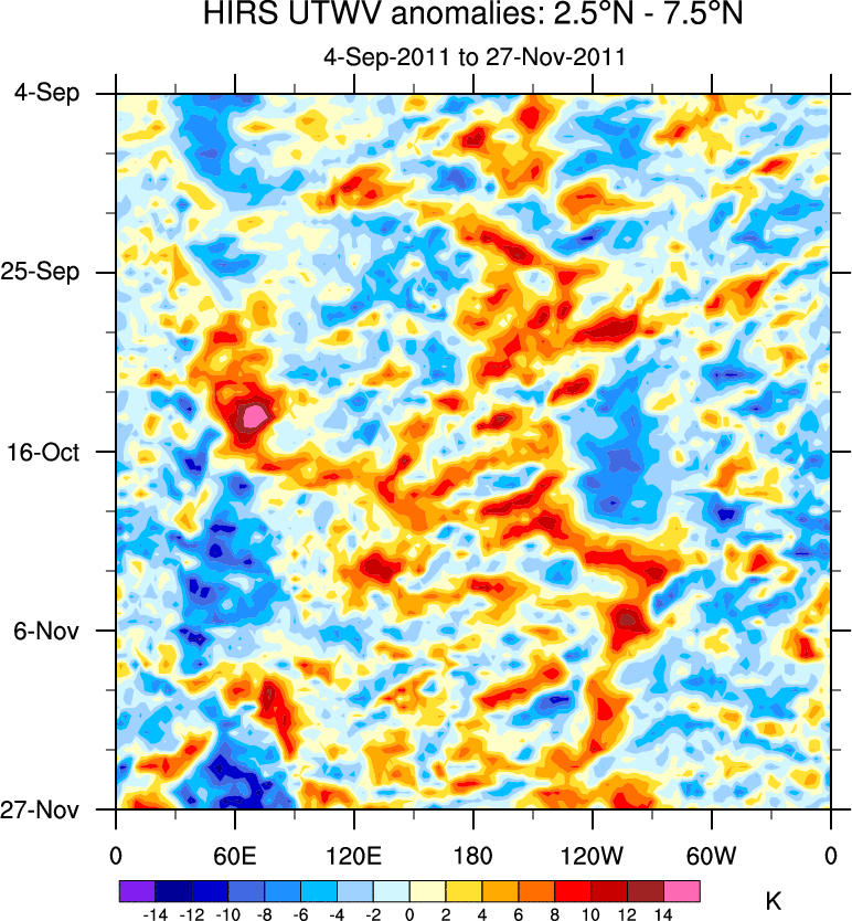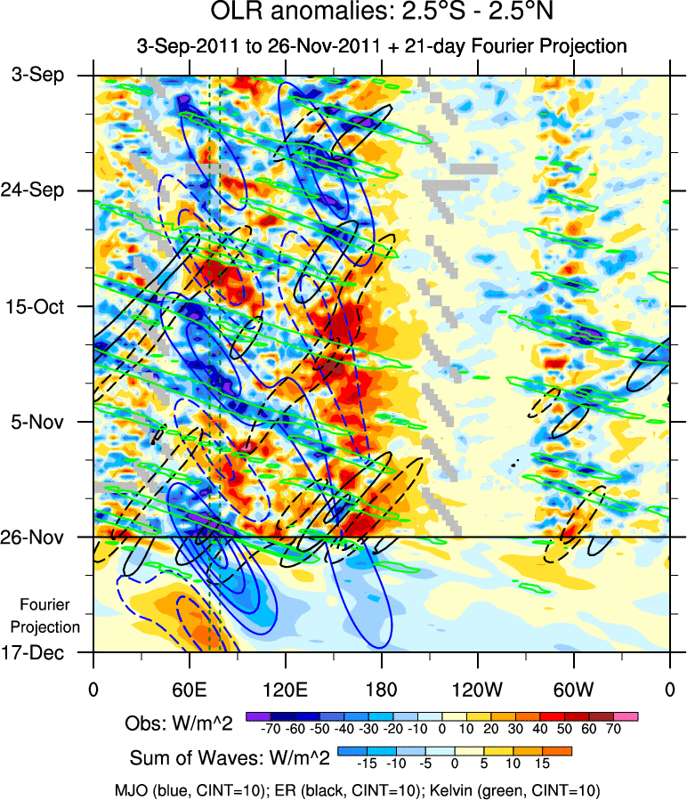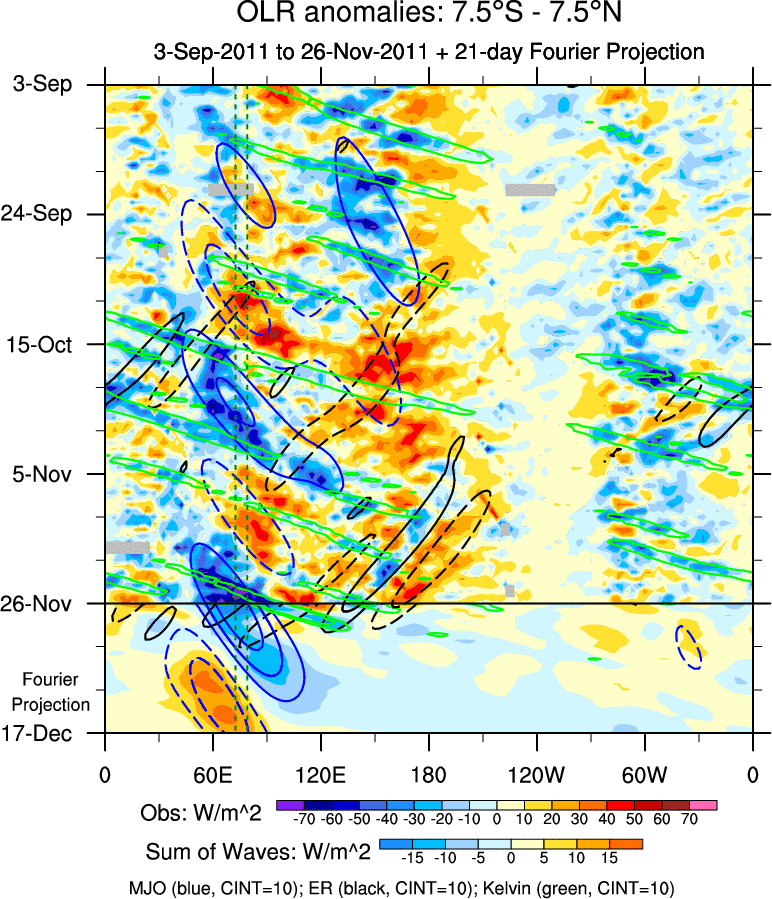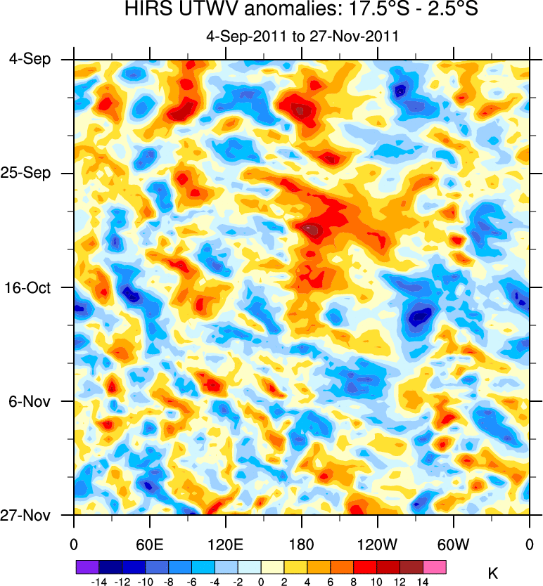 To identify tropical waves in near real-time, the OLR and UTWV data are filtered following Wheeler & Weickmann (2001 MWR). The daily anomalies are calculated using the first 3 harmonics of the seasonal cycle for 1979–2009. Missing values are then filled using linear interpolation in space and time. The most recent 365 days of anomalies are padded with 659 days of zeroes, and the result is filtered for each wave type.