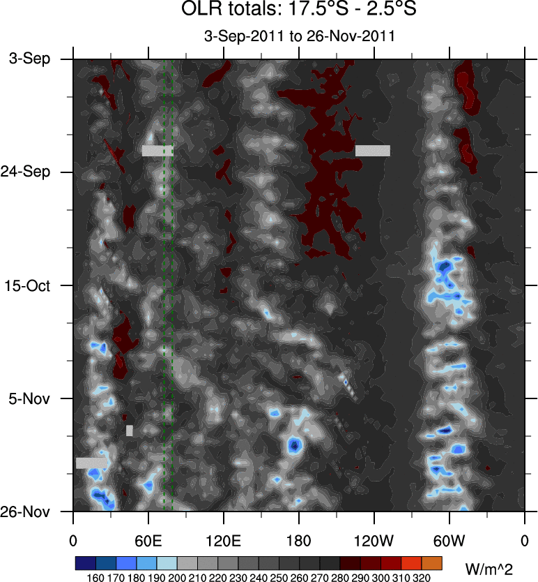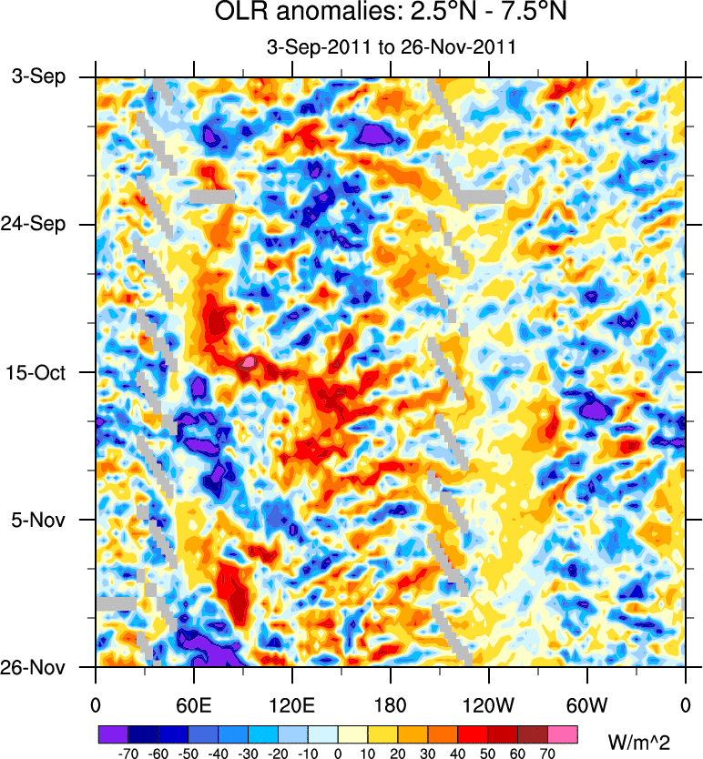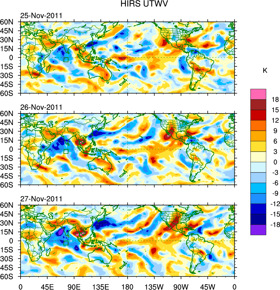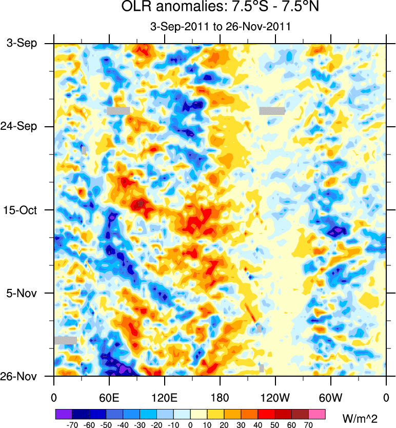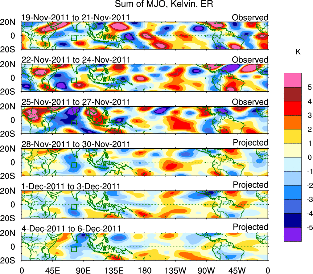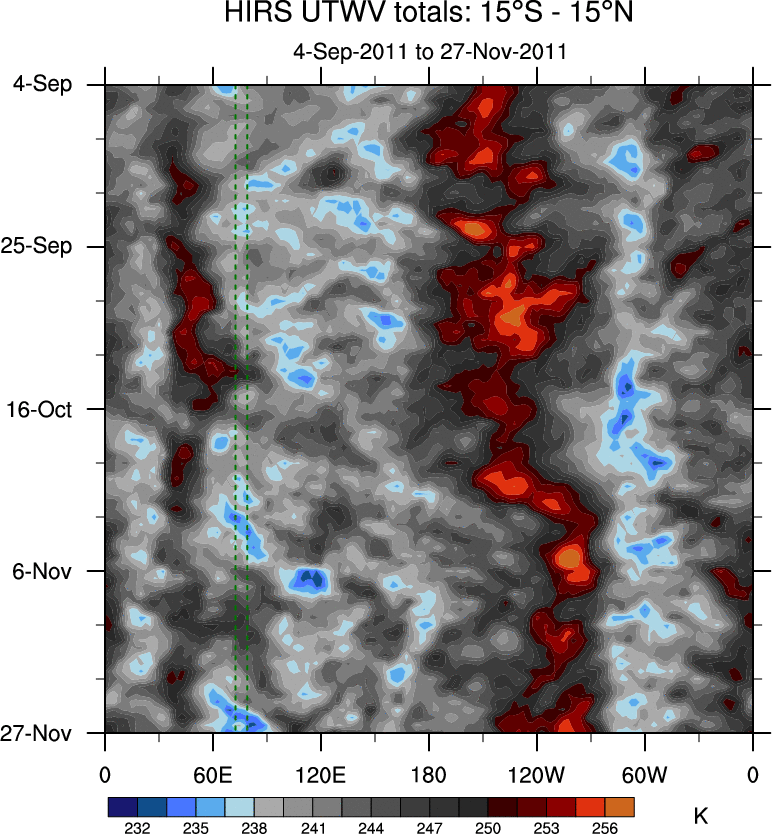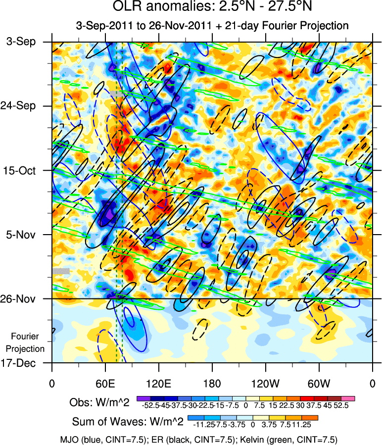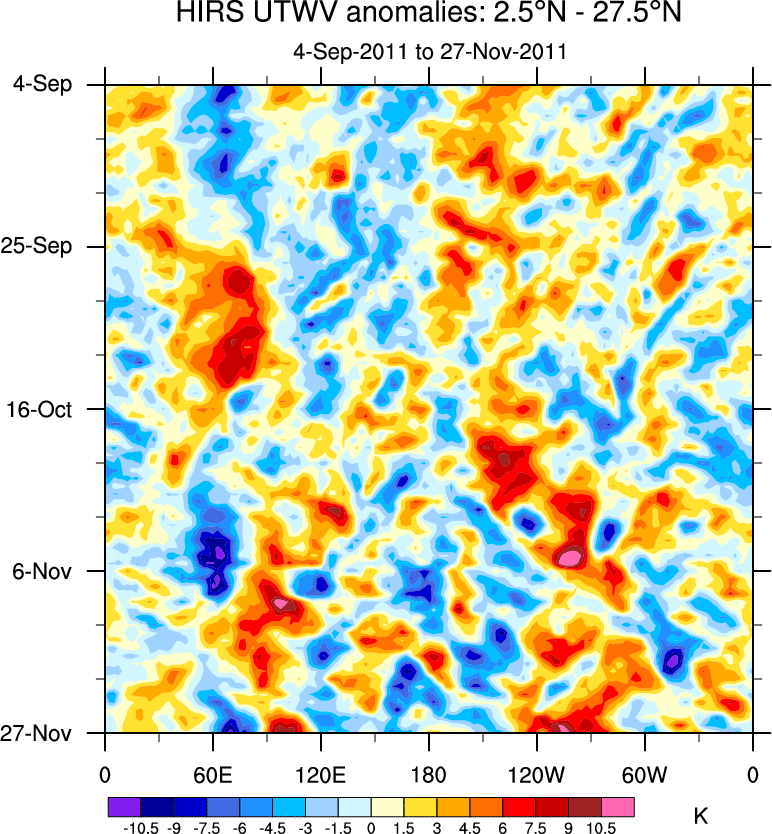 To identify tropical waves in near real-time, the OLR and UTWV data are filtered following Wheeler & Weickmann (2001 MWR). The daily anomalies are calculated using the first 3 harmonics of the seasonal cycle for 1979–2009. Missing values are then filled using linear interpolation in space and time. The most recent 365 days of anomalies are padded with 659 days of zeroes, and the result is filtered for each wave type.