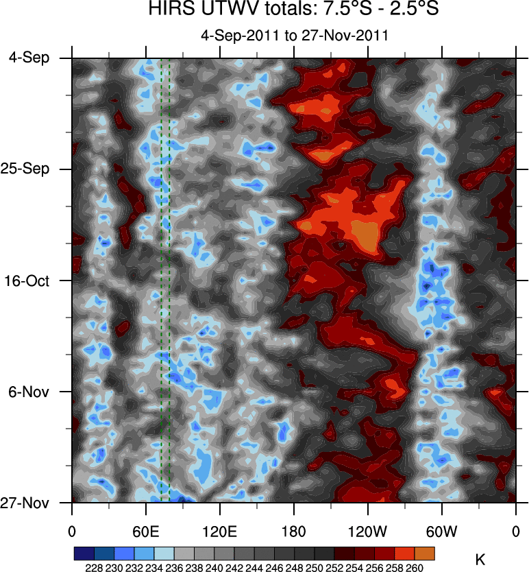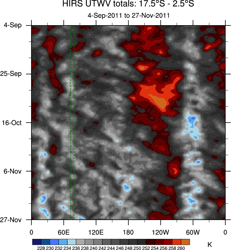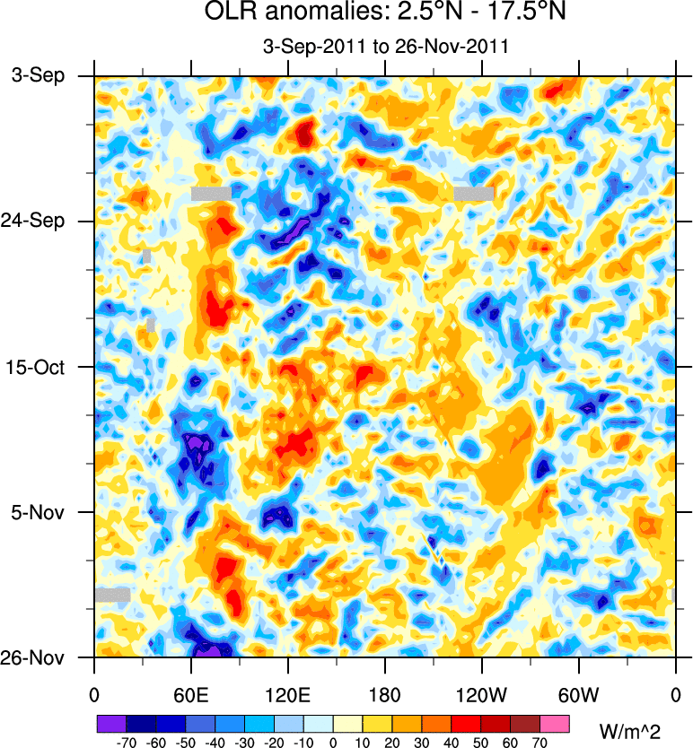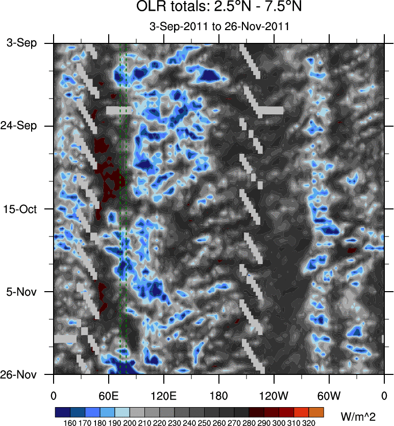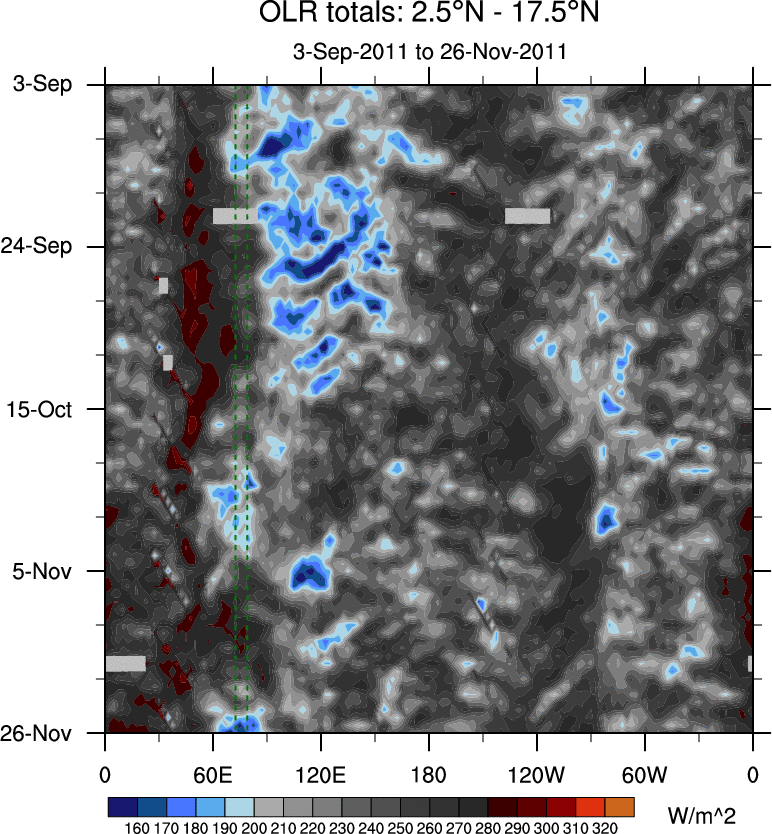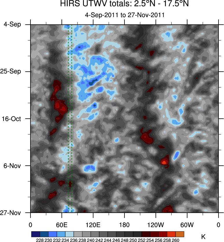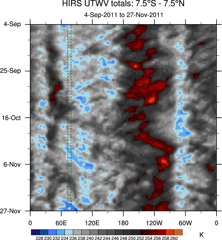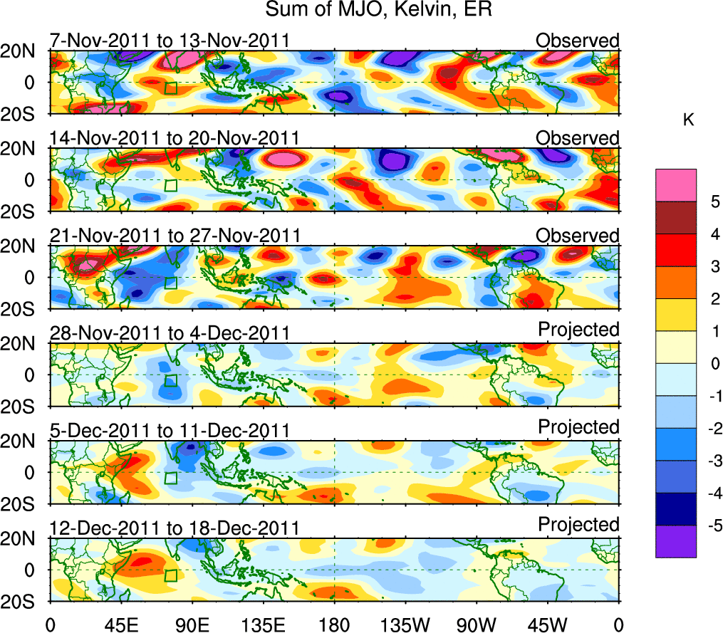To identify tropical waves in near real-time, the OLR and UTWV data are filtered following Wheeler & Weickmann (2001 MWR). The daily anomalies are calculated using the first 3 harmonics of the seasonal cycle for 1979–2009. Missing values are then filled using linear interpolation in space and time. The most recent 365 days of anomalies are padded with 659 days of zeroes, and the result is filtered for each wave type.