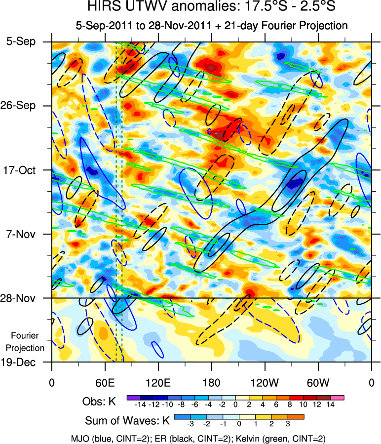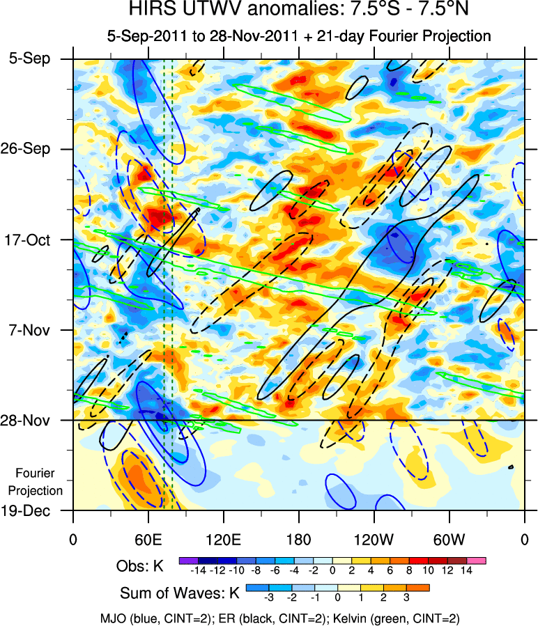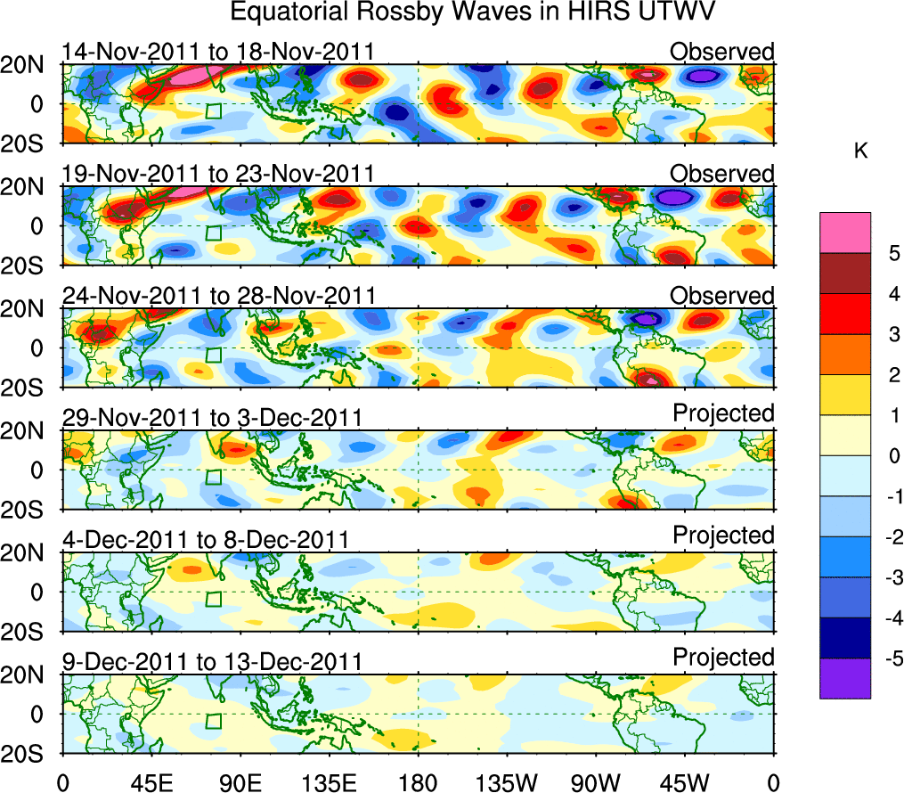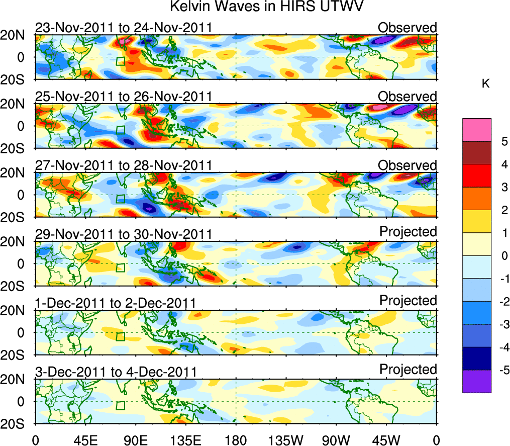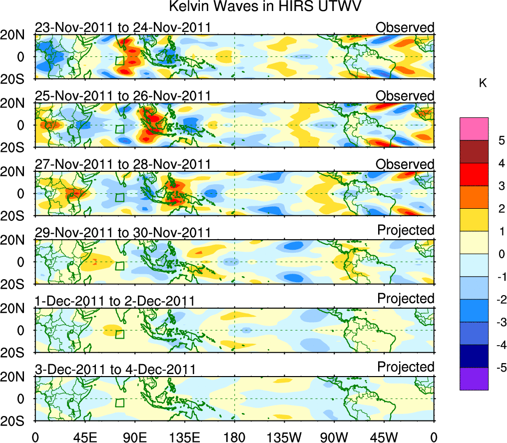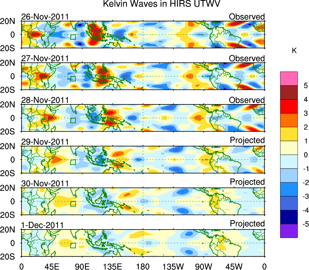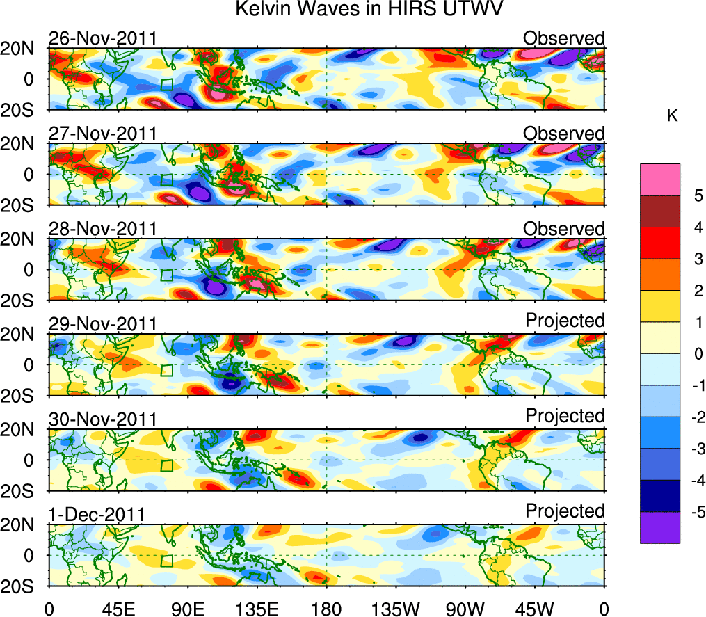 To identify tropical waves in near real-time, the OLR and UTWV data are filtered following Wheeler & Weickmann (2001 MWR). The daily anomalies are calculated using the first 3 harmonics of the seasonal cycle for 1979–2009. Missing values are then filled using linear interpolation in space and time. The most recent 365 days of anomalies are padded with 659 days of zeroes, and the result is filtered for each wave type.