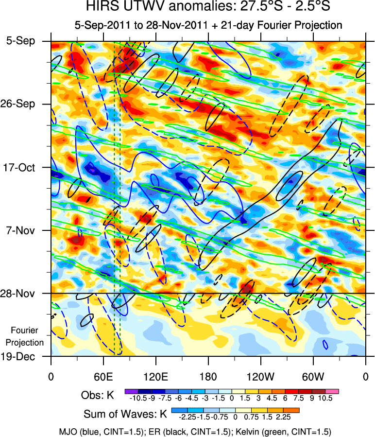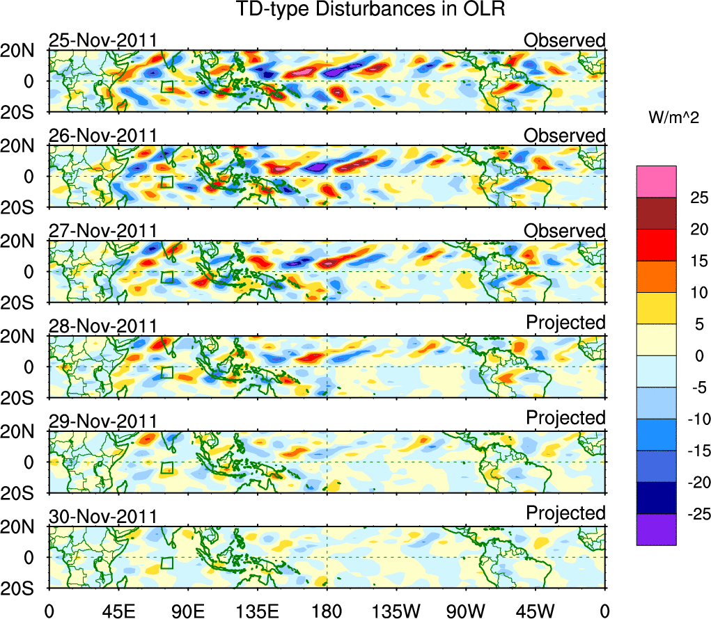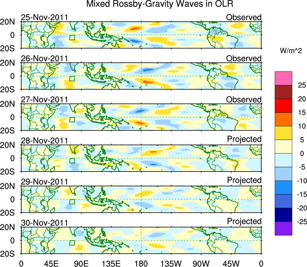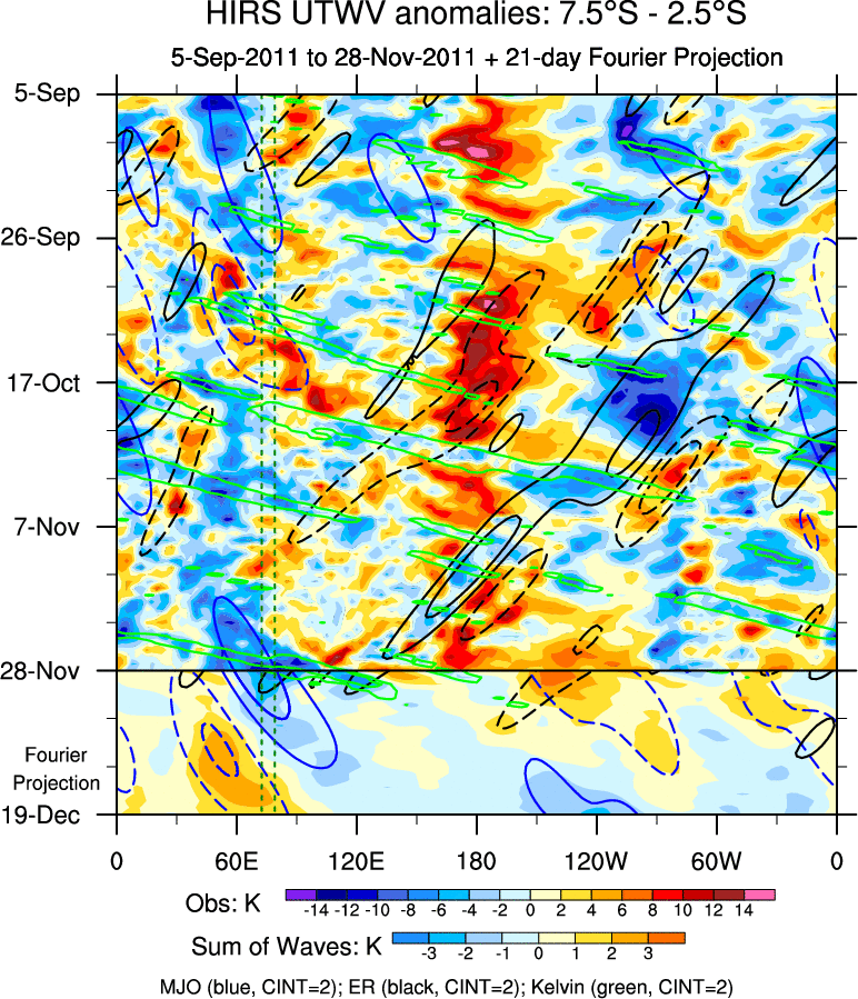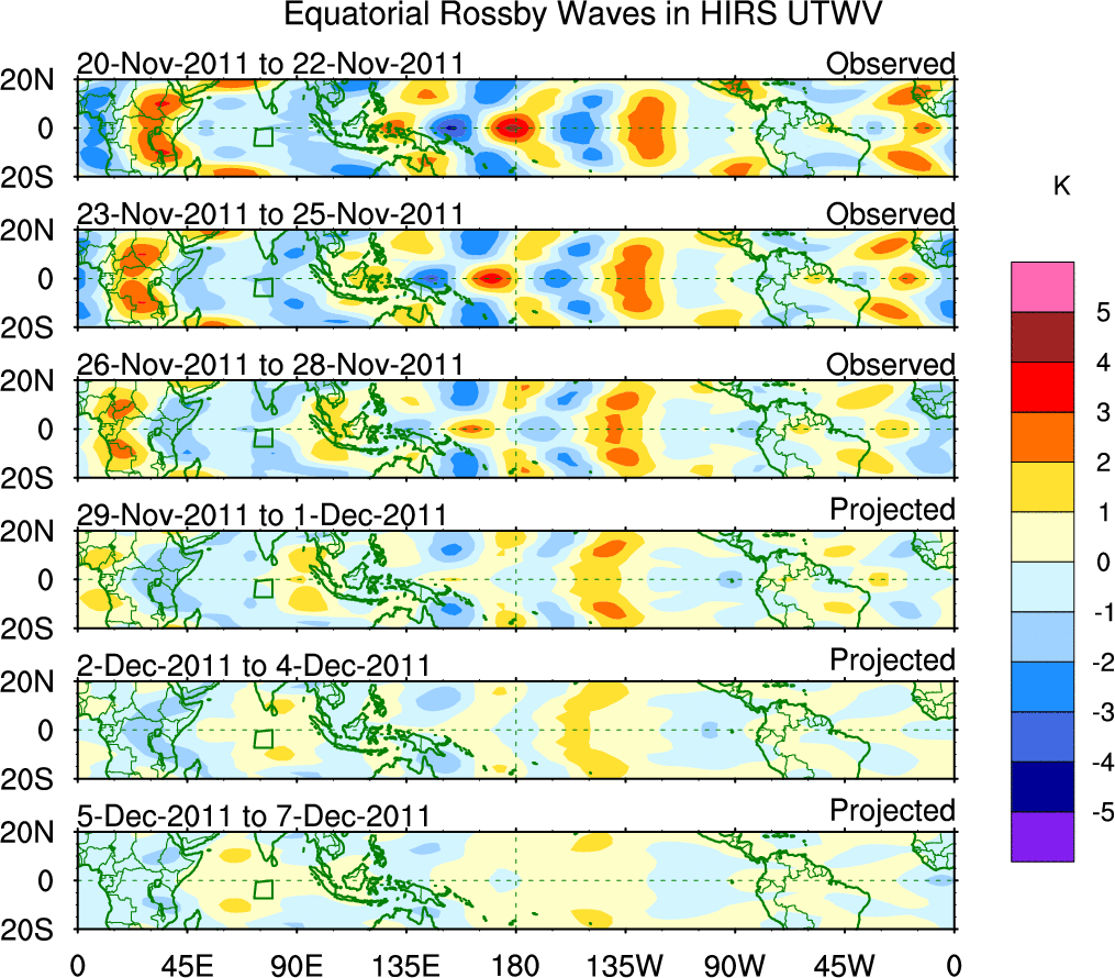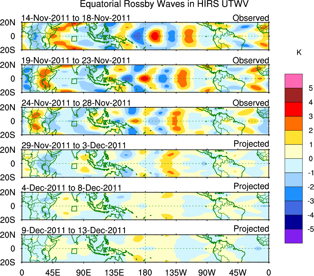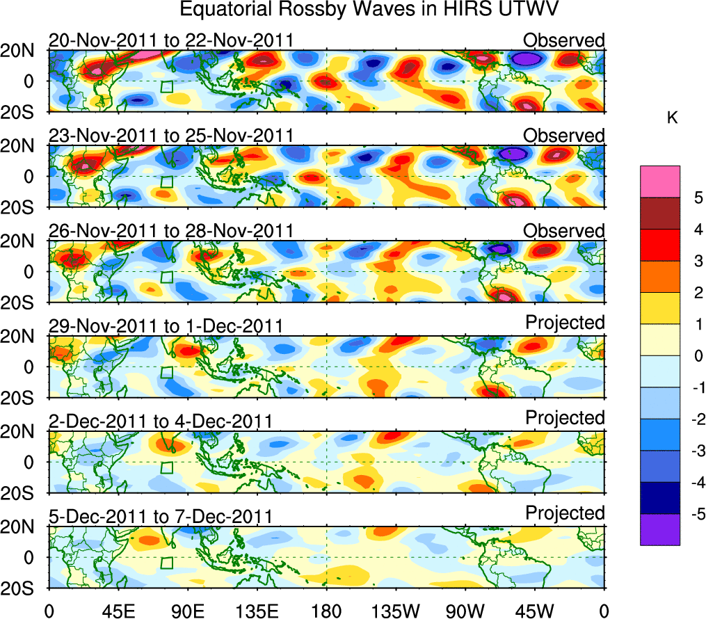 To identify tropical waves in near real-time, the OLR and UTWV data are filtered following Wheeler & Weickmann (2001 MWR). The daily anomalies are calculated using the first 3 harmonics of the seasonal cycle for 1979–2009. Missing values are then filled using linear interpolation in space and time. The most recent 365 days of anomalies are padded with 659 days of zeroes, and the result is filtered for each wave type.