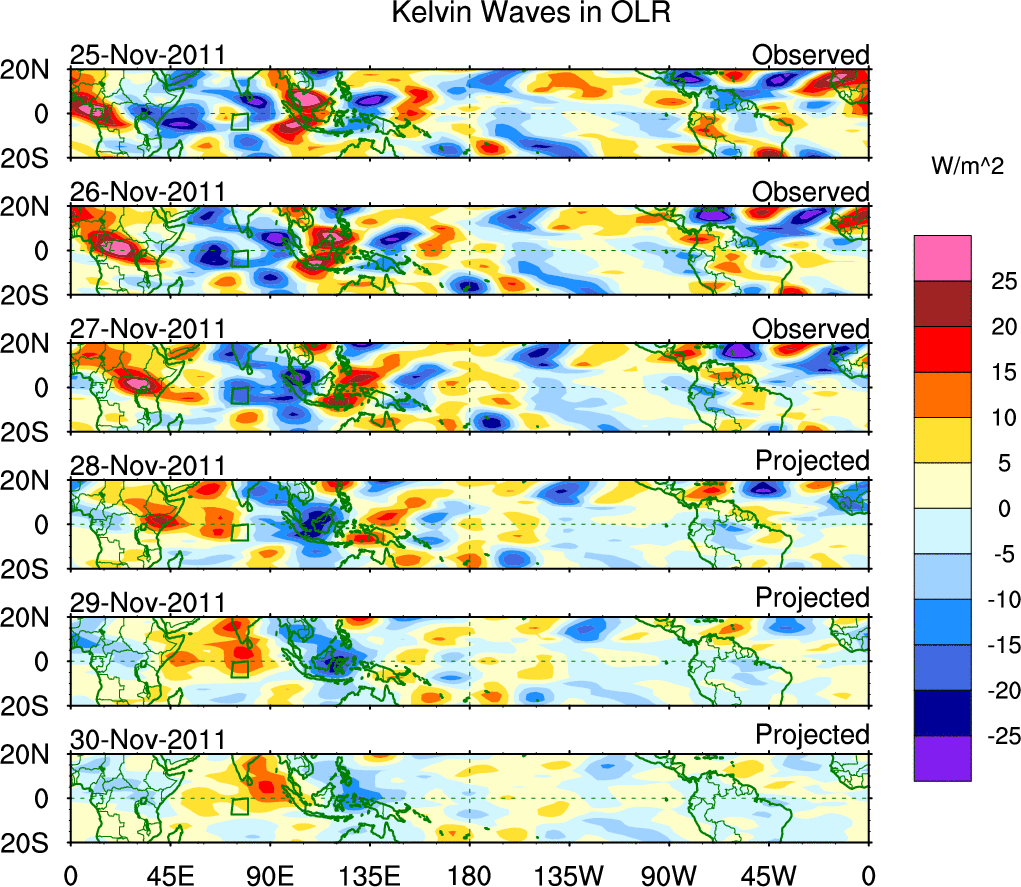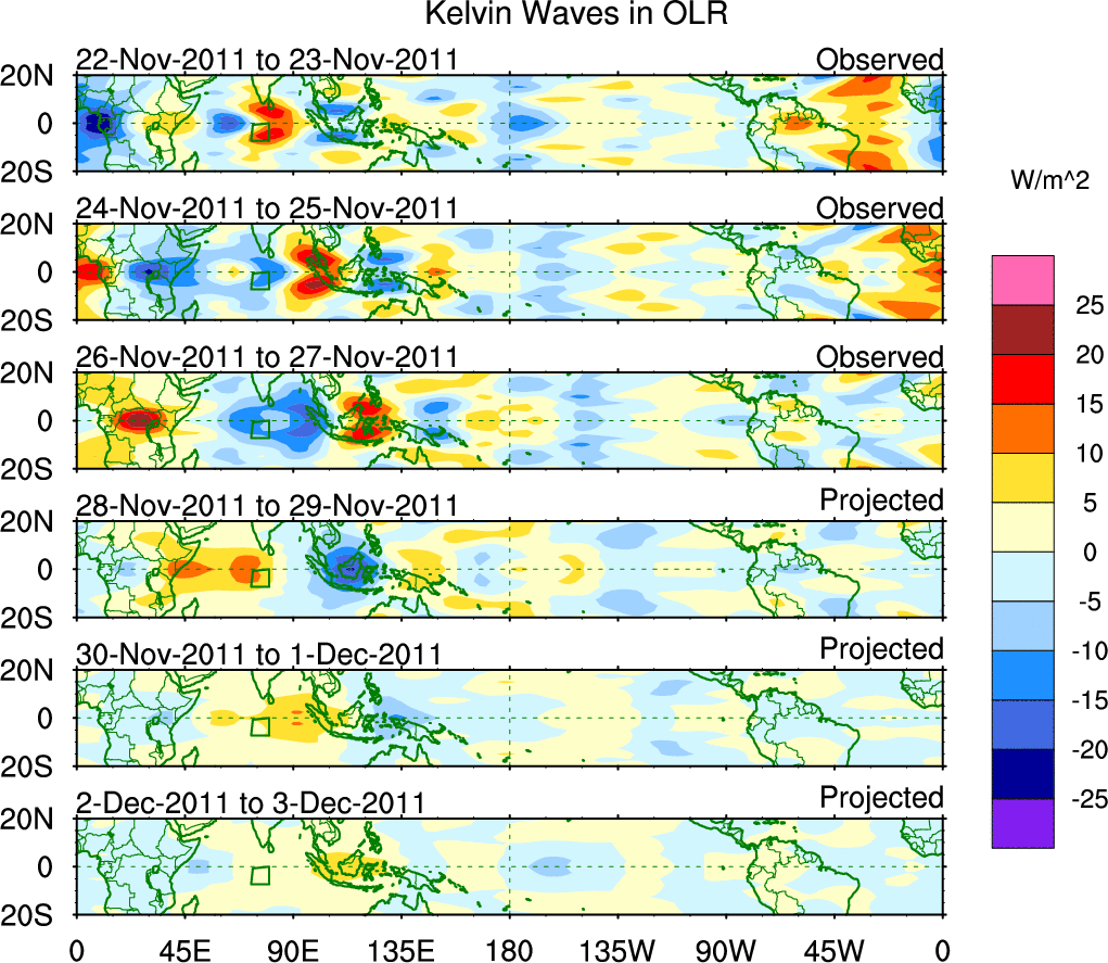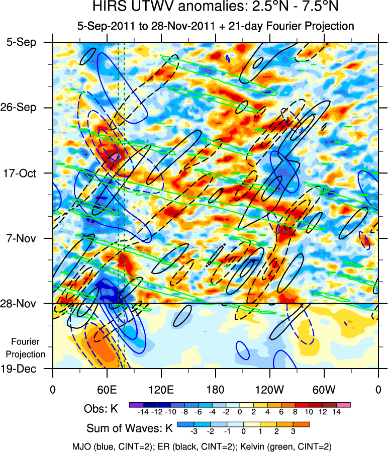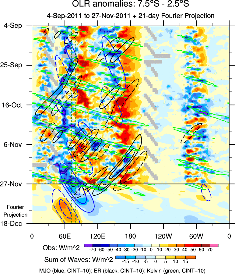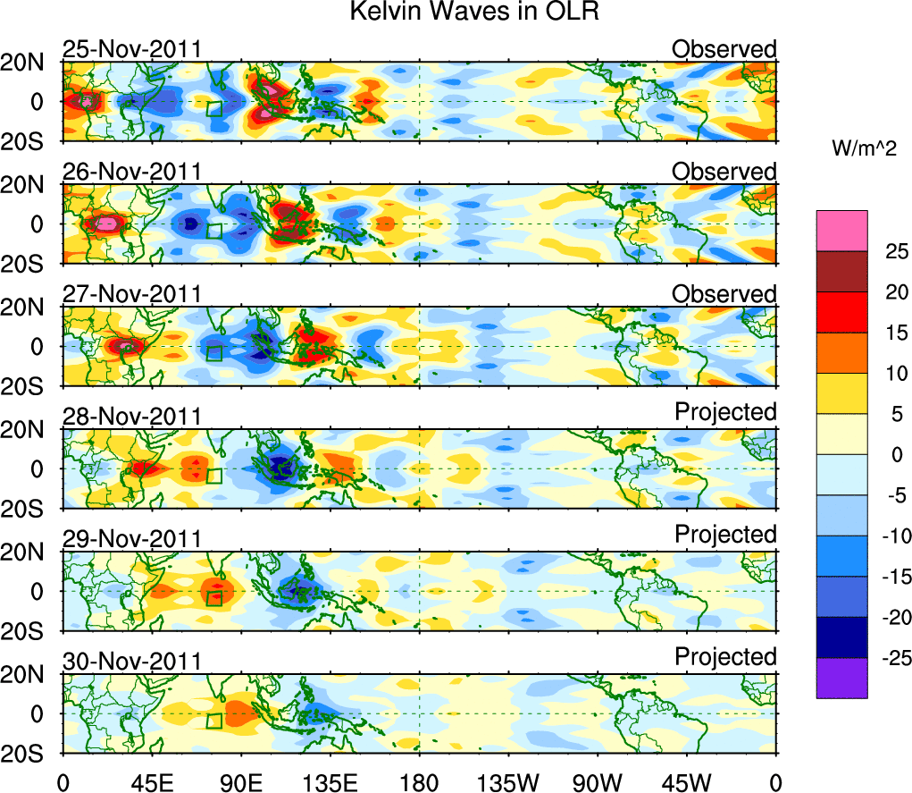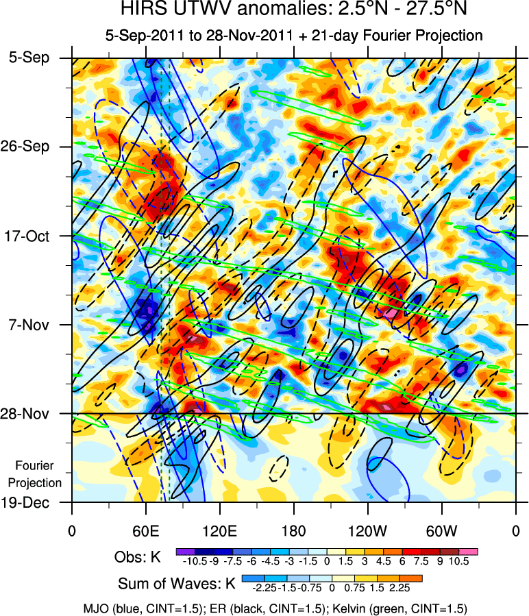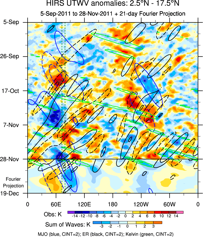 To identify tropical waves in near real-time, the OLR and UTWV data are filtered following Wheeler & Weickmann (2001 MWR). The daily anomalies are calculated using the first 3 harmonics of the seasonal cycle for 1979–2009. Missing values are then filled using linear interpolation in space and time. The most recent 365 days of anomalies are padded with 659 days of zeroes, and the result is filtered for each wave type.