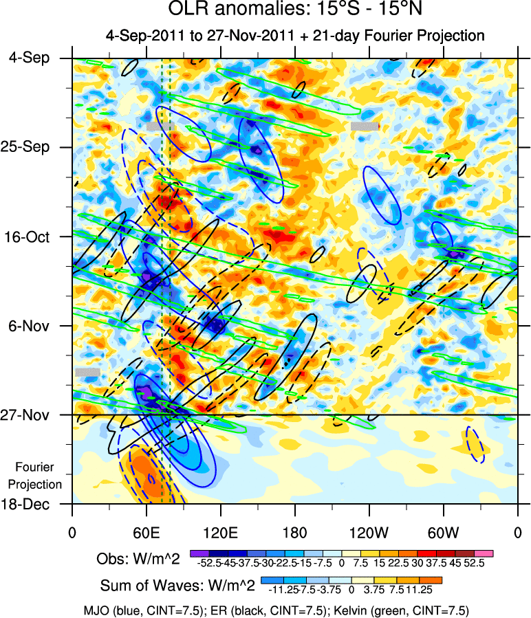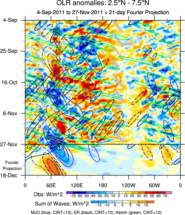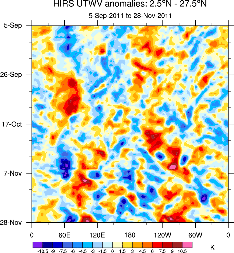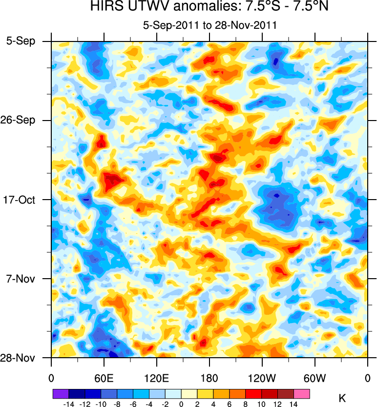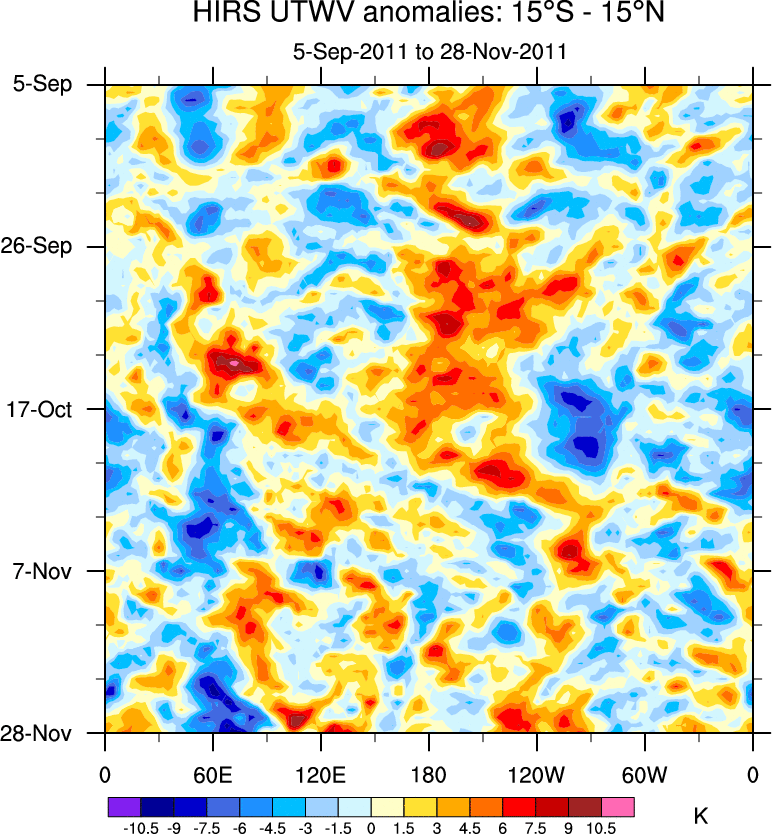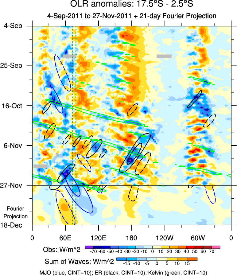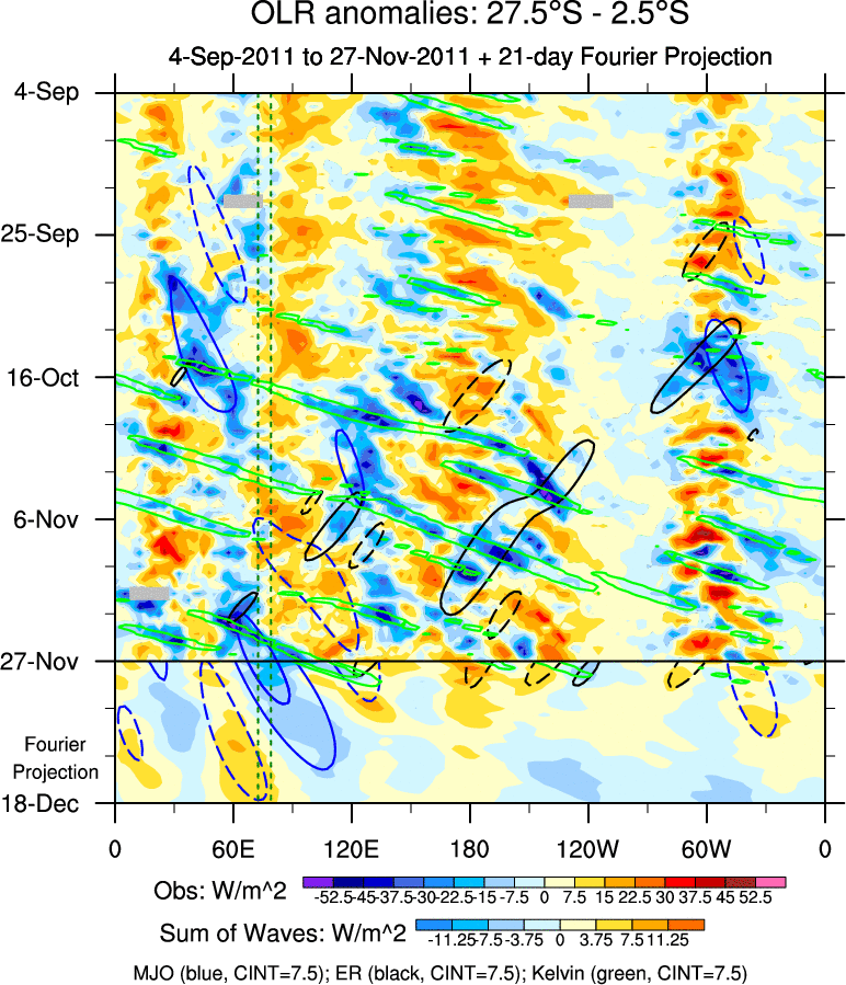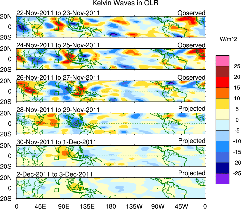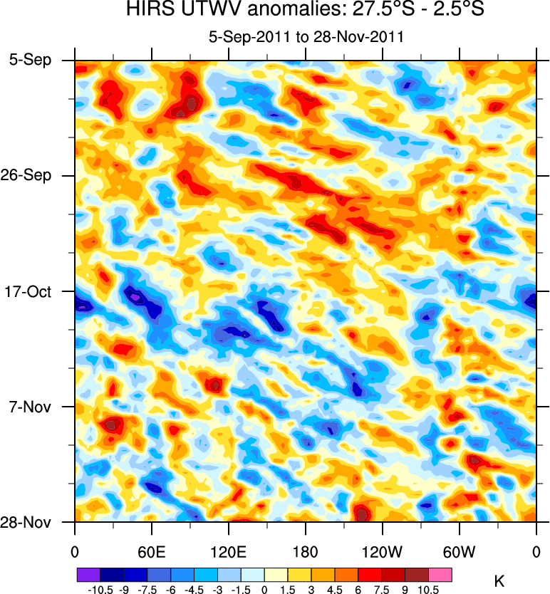 To identify tropical waves in near real-time, the OLR and UTWV data are filtered following Wheeler & Weickmann (2001 MWR). The daily anomalies are calculated using the first 3 harmonics of the seasonal cycle for 1979–2009. Missing values are then filled using linear interpolation in space and time. The most recent 365 days of anomalies are padded with 659 days of zeroes, and the result is filtered for each wave type.