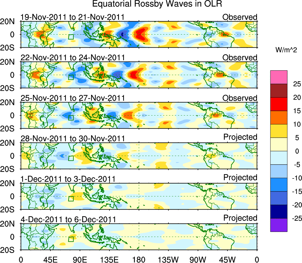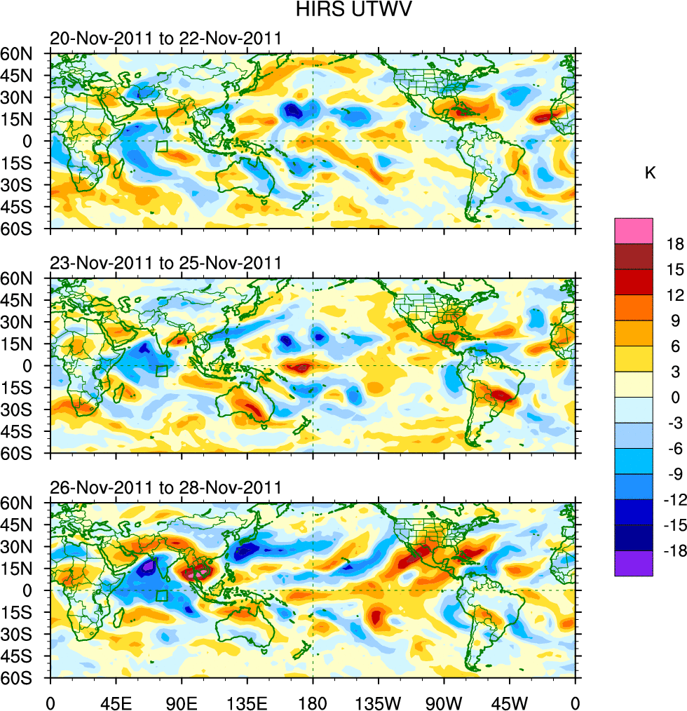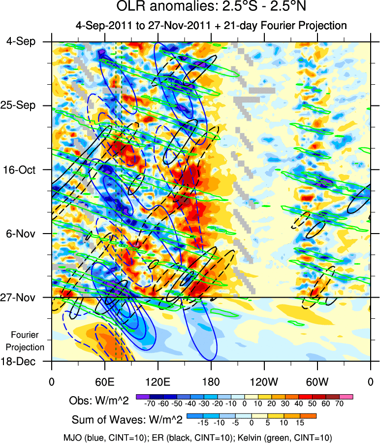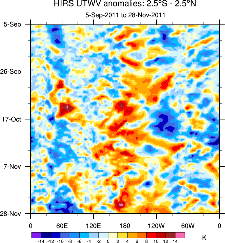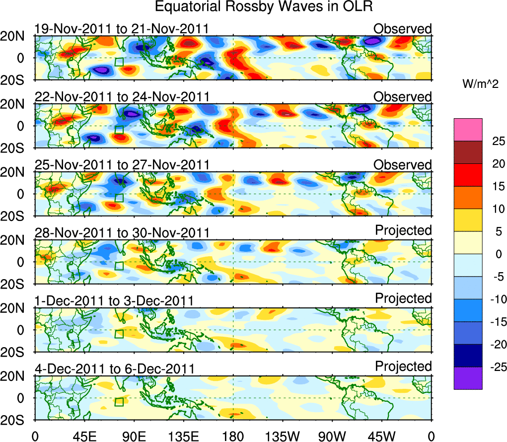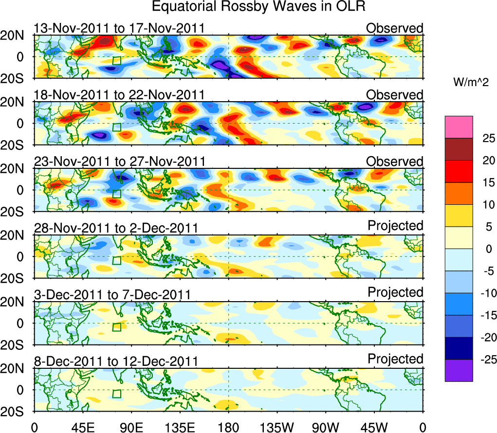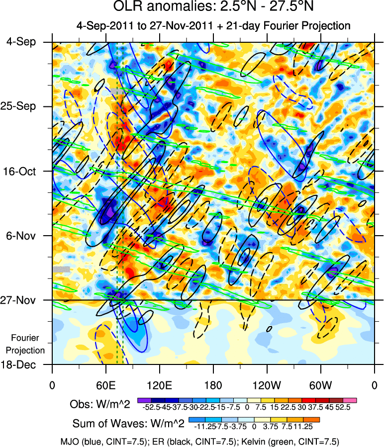 To identify tropical waves in near real-time, the OLR and UTWV data are filtered following Wheeler & Weickmann (2001 MWR). The daily anomalies are calculated using the first 3 harmonics of the seasonal cycle for 1979–2009. Missing values are then filled using linear interpolation in space and time. The most recent 365 days of anomalies are padded with 659 days of zeroes, and the result is filtered for each wave type.