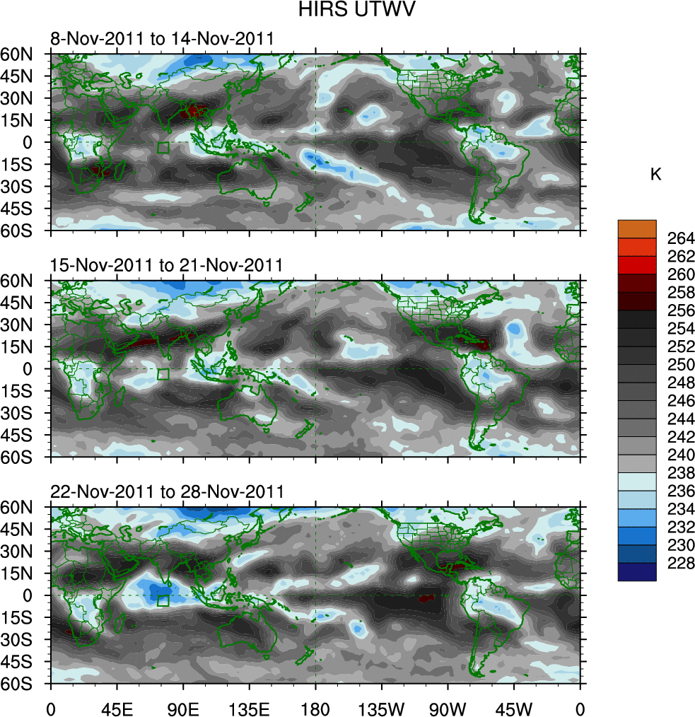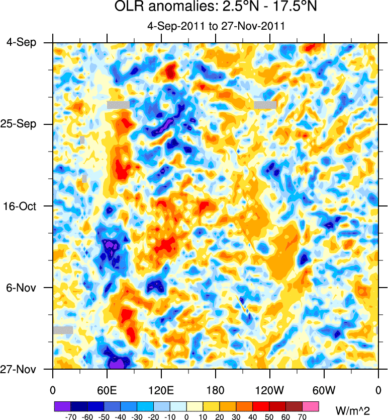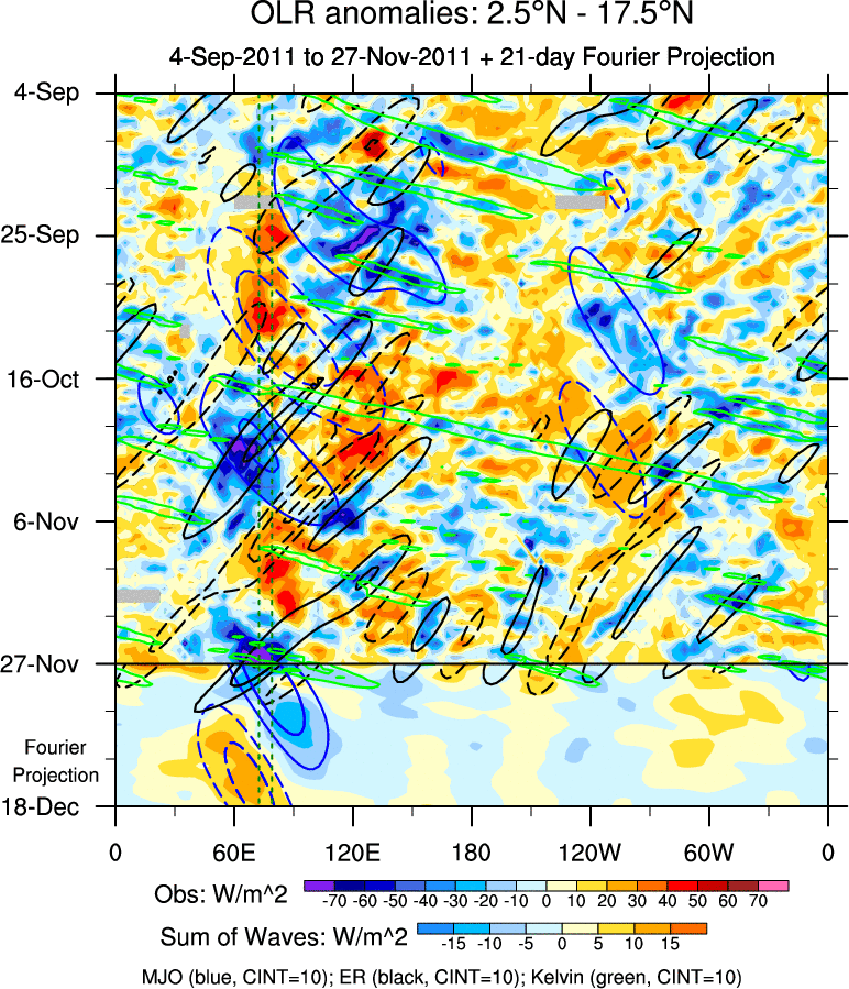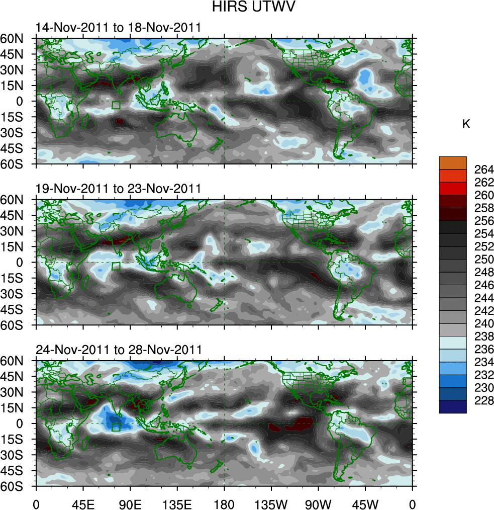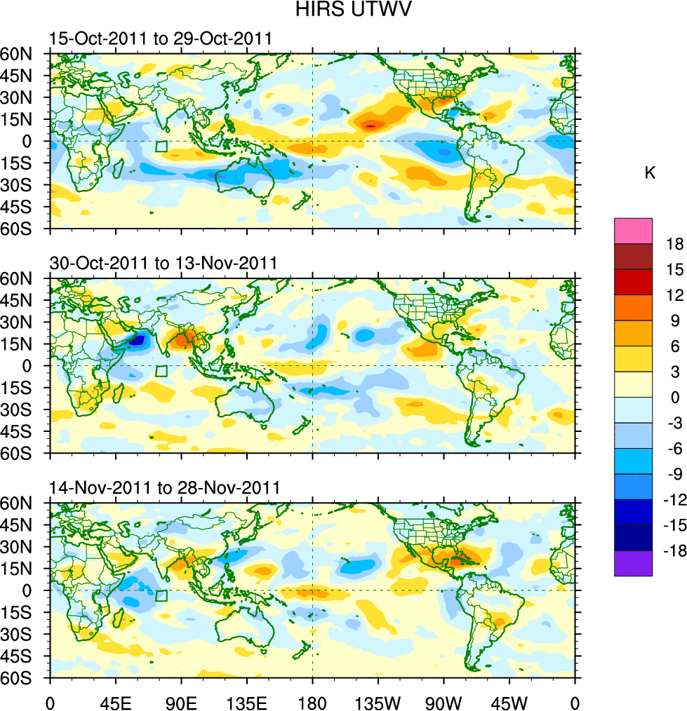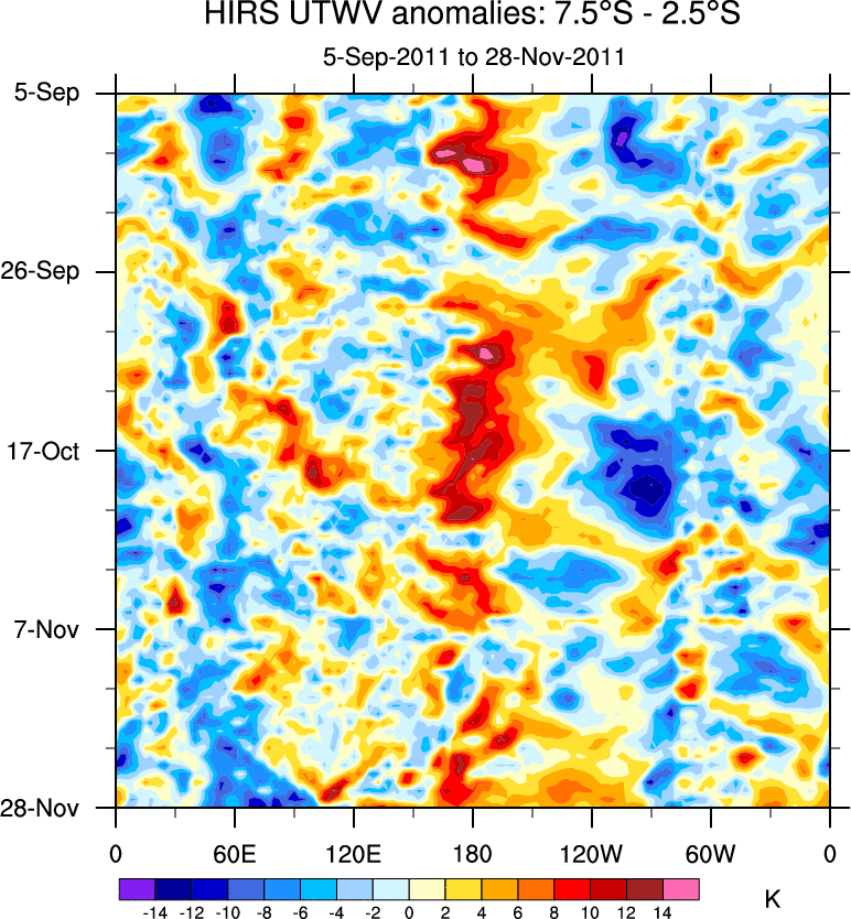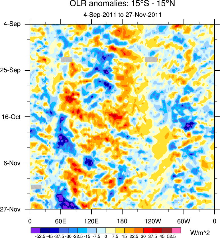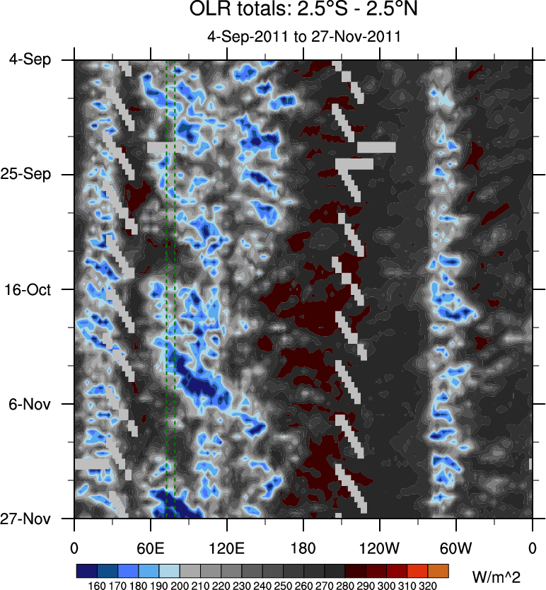 To identify tropical waves in near real-time, the OLR and UTWV data are filtered following Wheeler & Weickmann (2001 MWR). The daily anomalies are calculated using the first 3 harmonics of the seasonal cycle for 1979–2009. Missing values are then filled using linear interpolation in space and time. The most recent 365 days of anomalies are padded with 659 days of zeroes, and the result is filtered for each wave type.