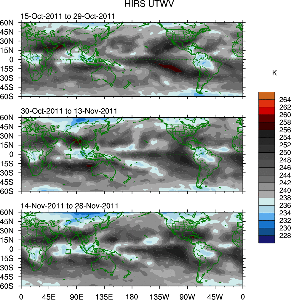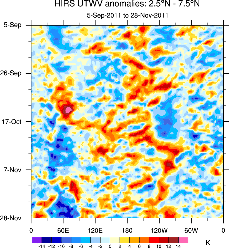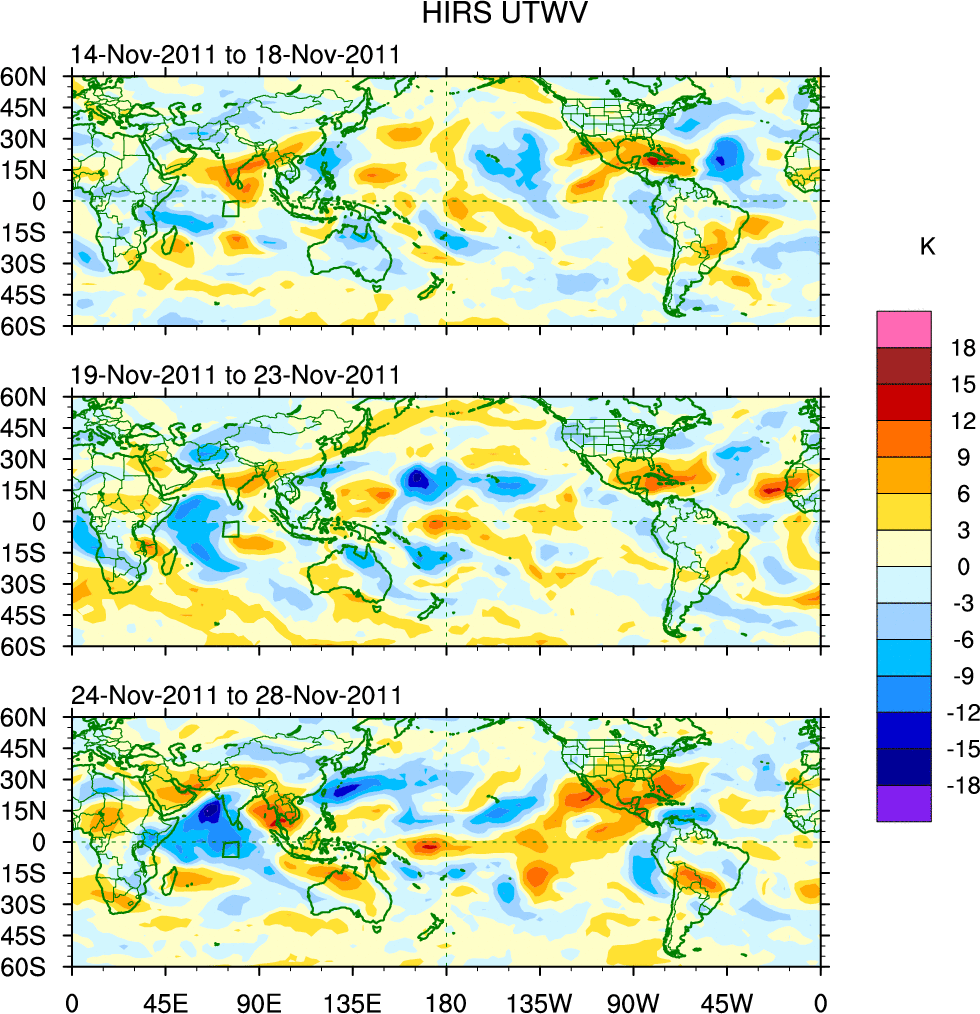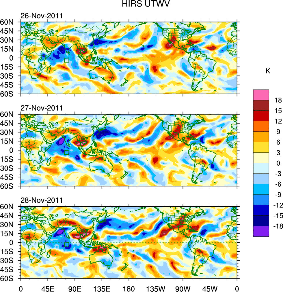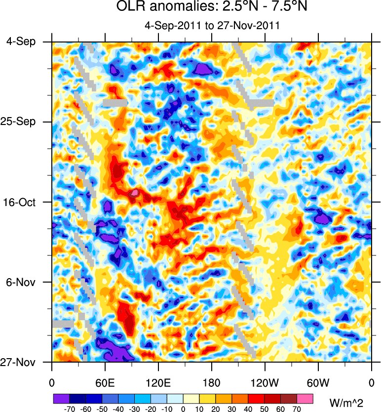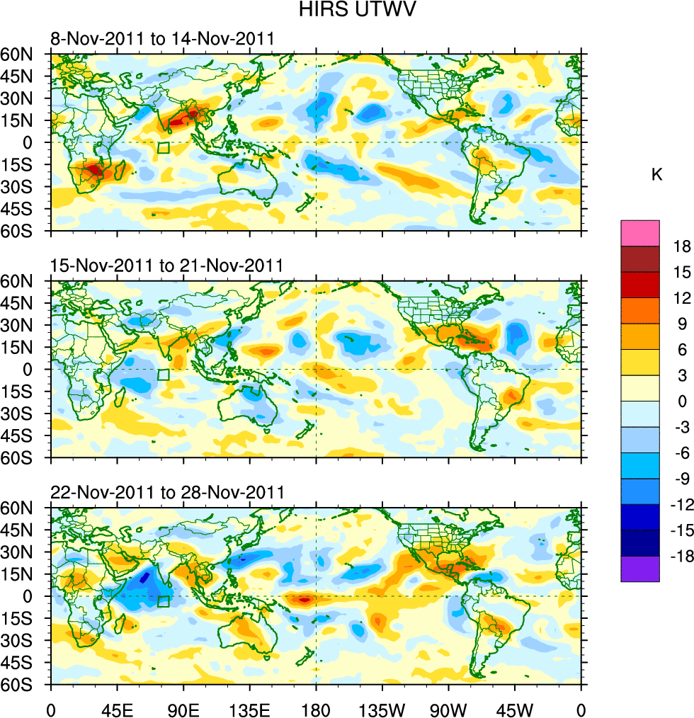 To identify tropical waves in near real-time, the OLR and UTWV data are filtered following Wheeler & Weickmann (2001 MWR). The daily anomalies are calculated using the first 3 harmonics of the seasonal cycle for 1979–2009. Missing values are then filled using linear interpolation in space and time. The most recent 365 days of anomalies are padded with 659 days of zeroes, and the result is filtered for each wave type.